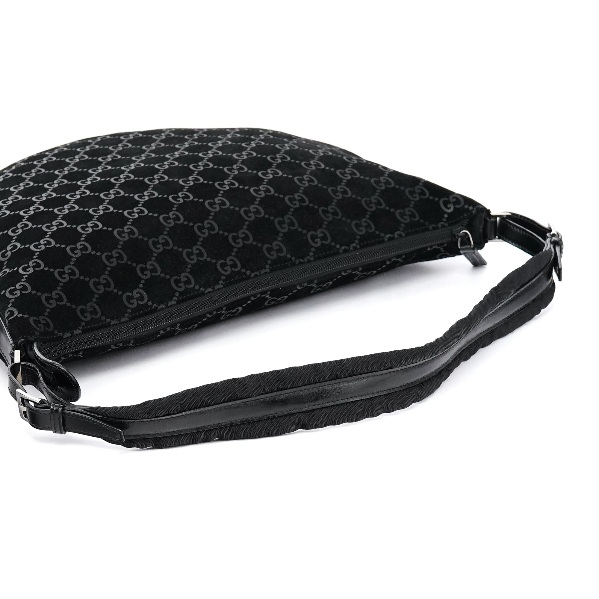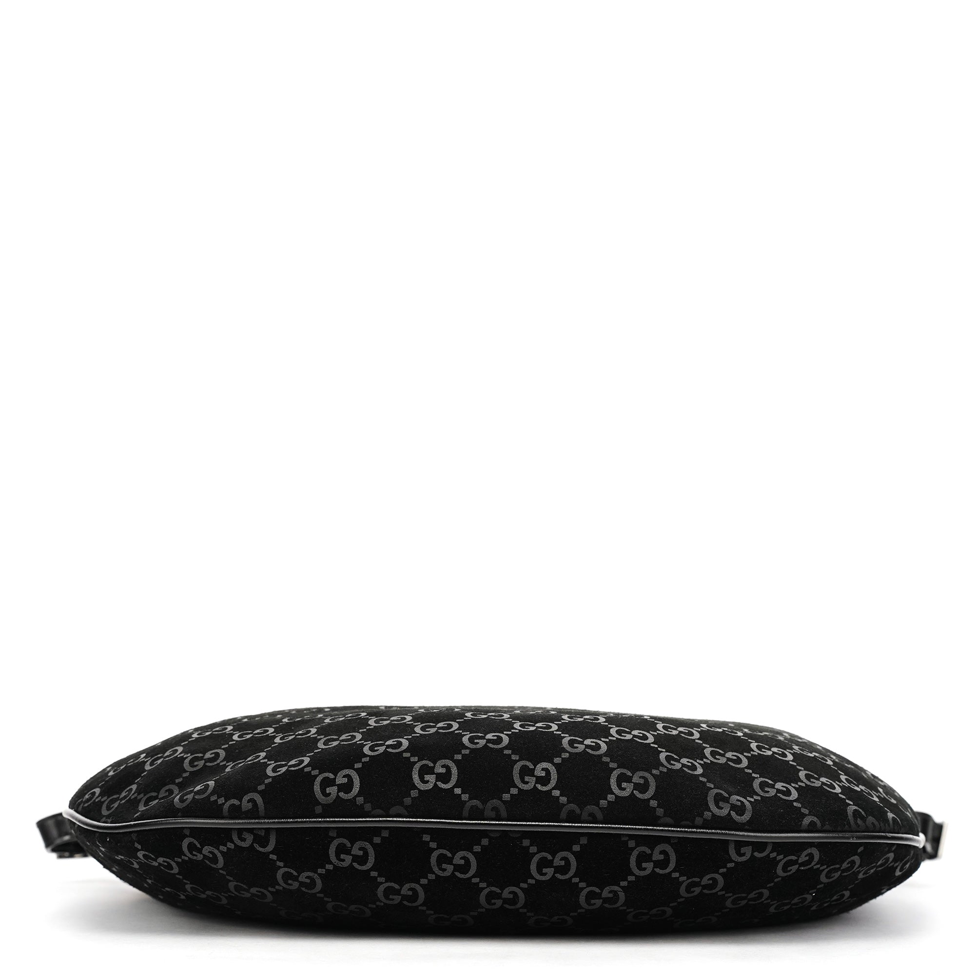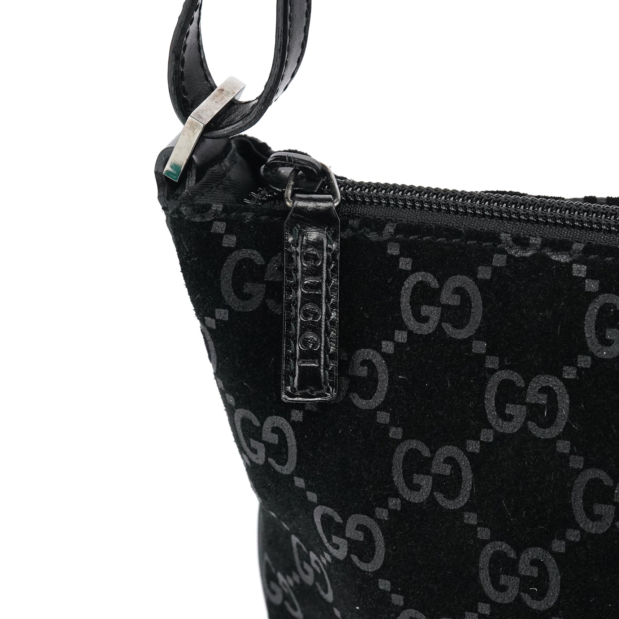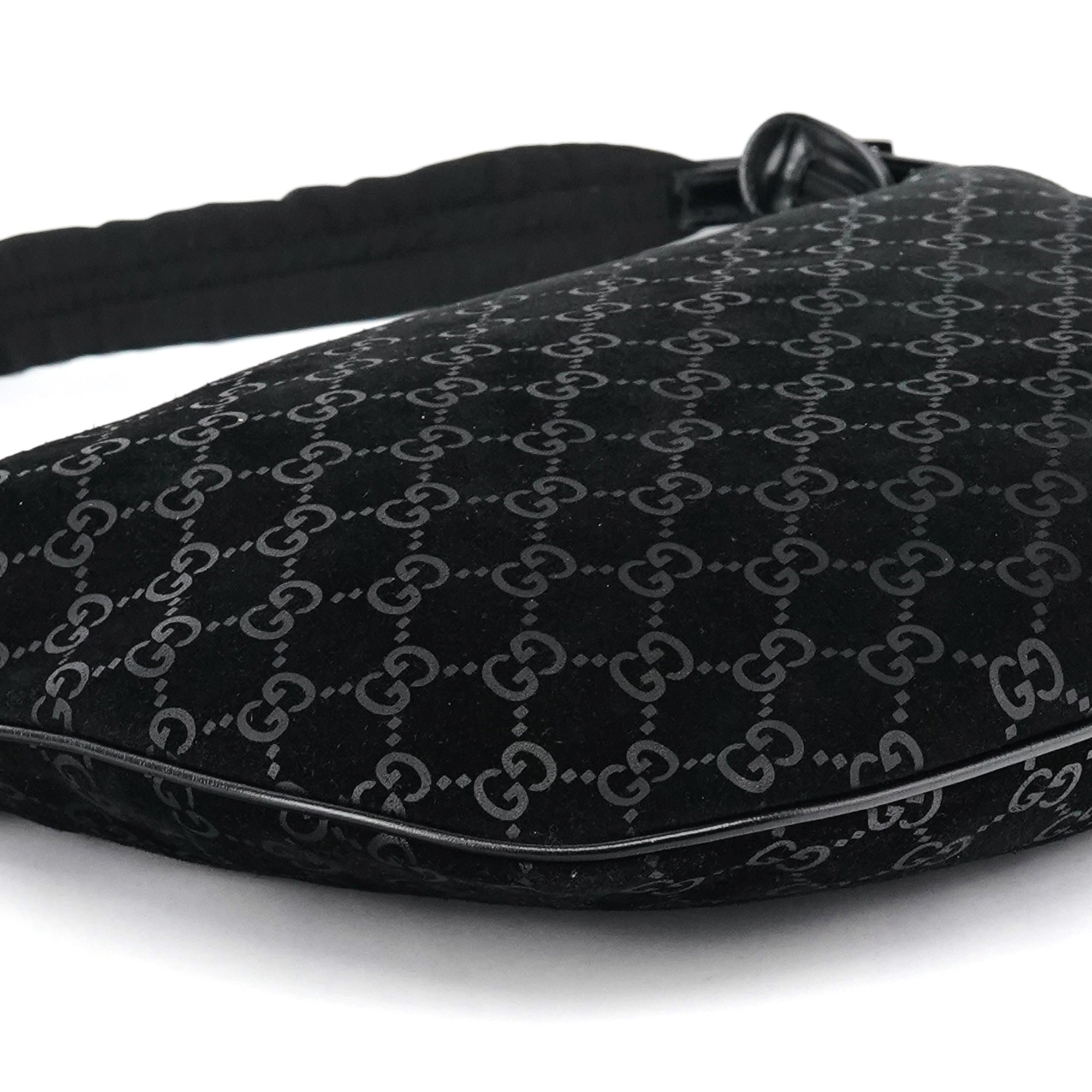 Designed for the 1997 collection by Tom Ford, this Gucci shoulder bag is crafted in black GG suede with smooth black leather trim. The curved silhouette features a top zipper closure and a padded shoulder strap with buckle hardware, while the black fabric-lined interior includes a zipped pocket for daily essentials.