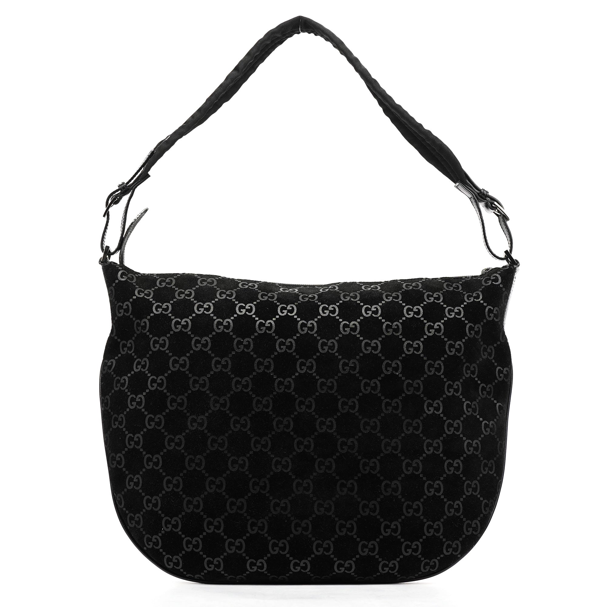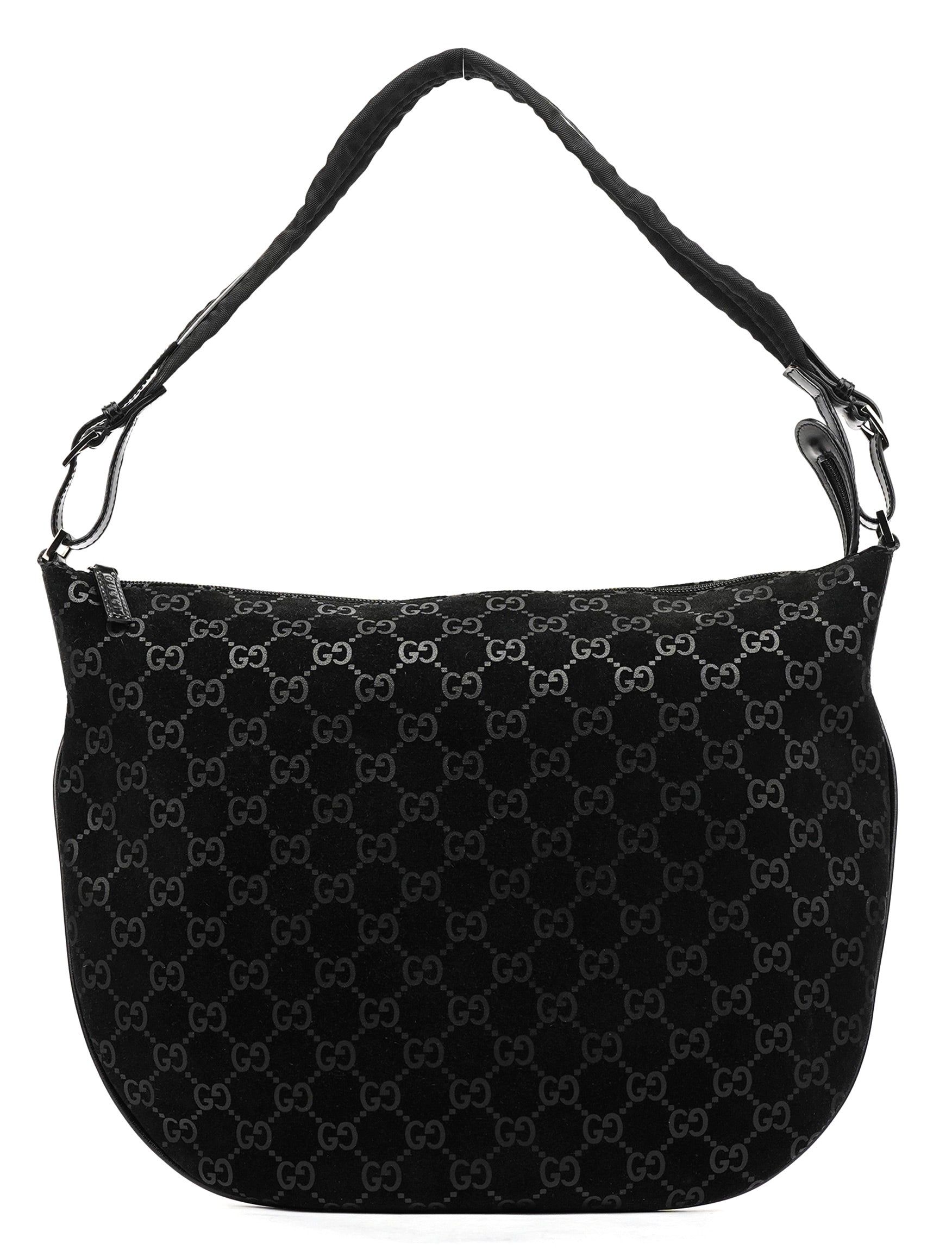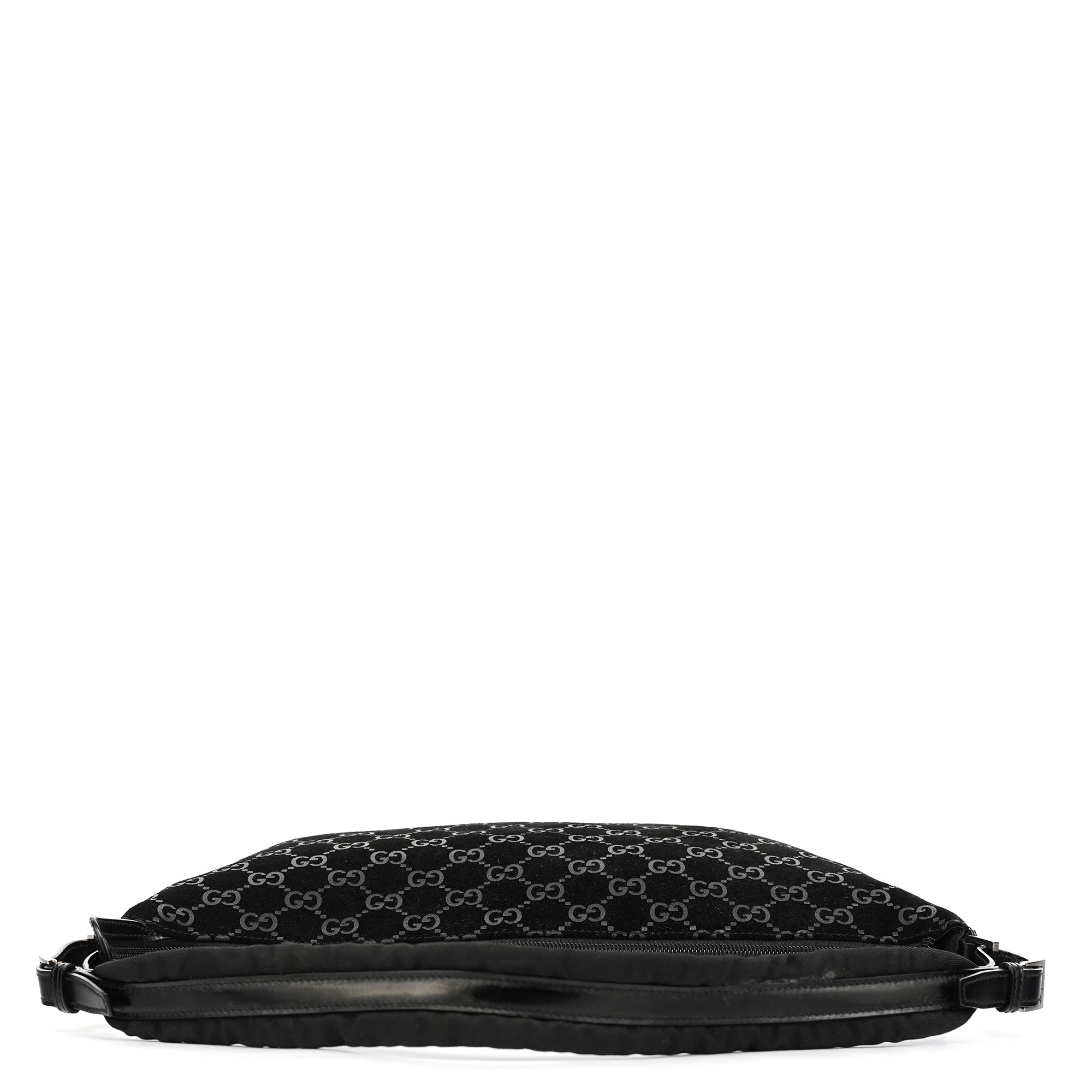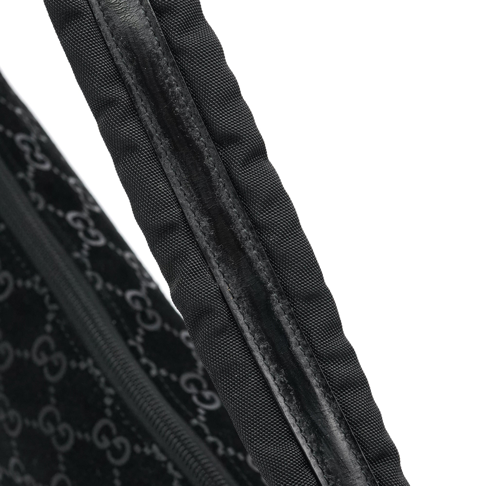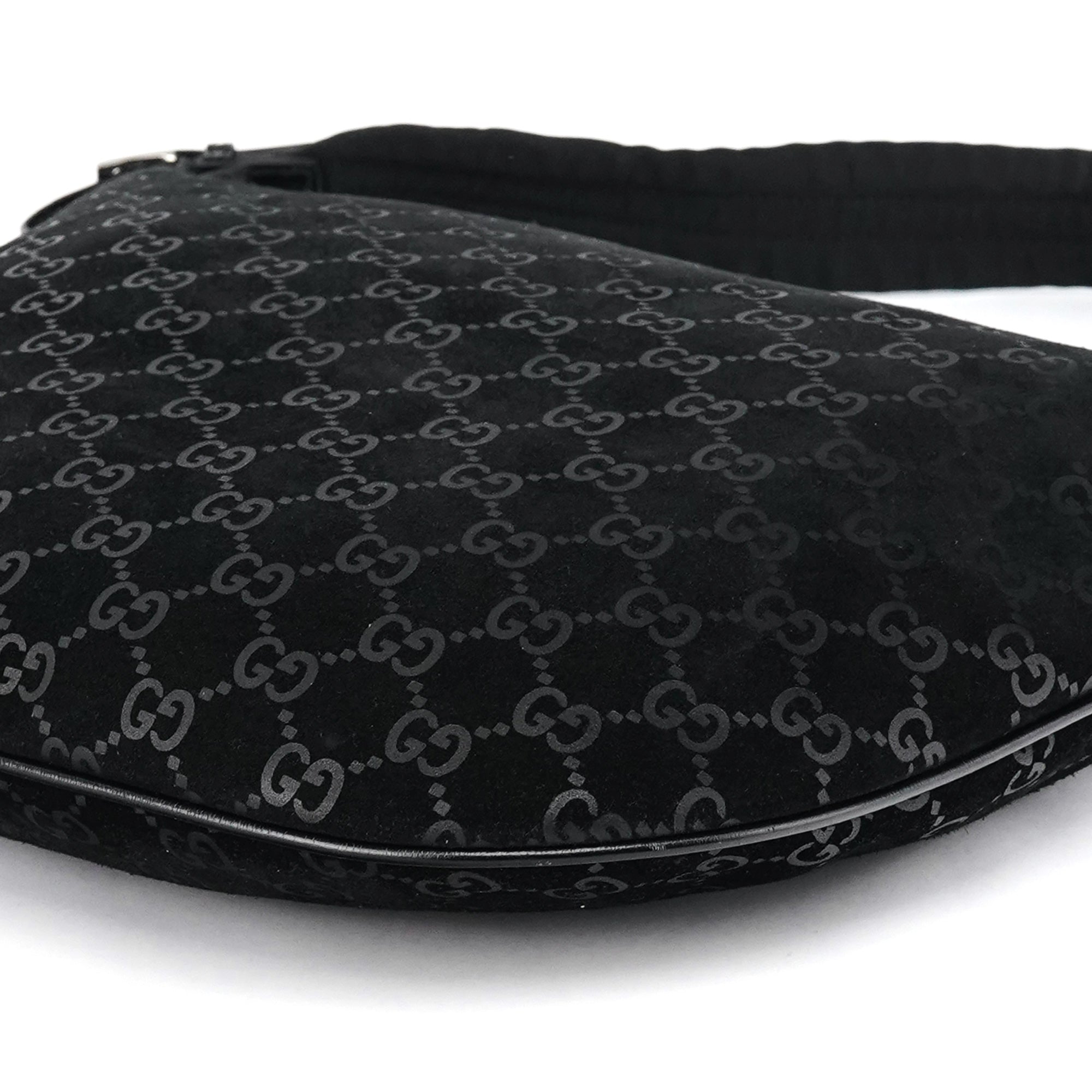 Designed for the 1997 collection by Tom Ford, this Gucci shoulder bag is crafted in black GG suede with smooth black leather trim. The curved silhouette features a top zipper closure and a padded shoulder strap with buckle hardware, while the black fabric-lined interior includes a zipped pocket for daily essentials.