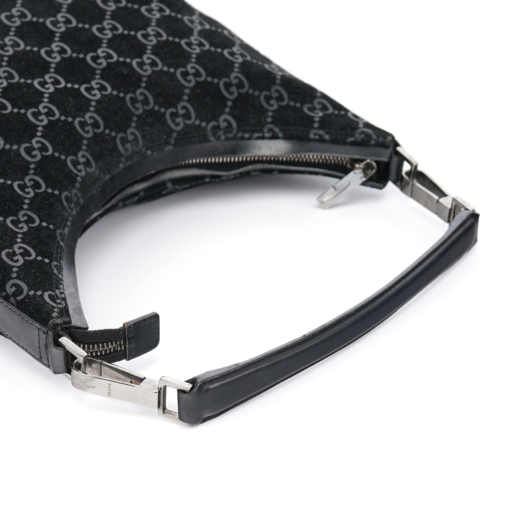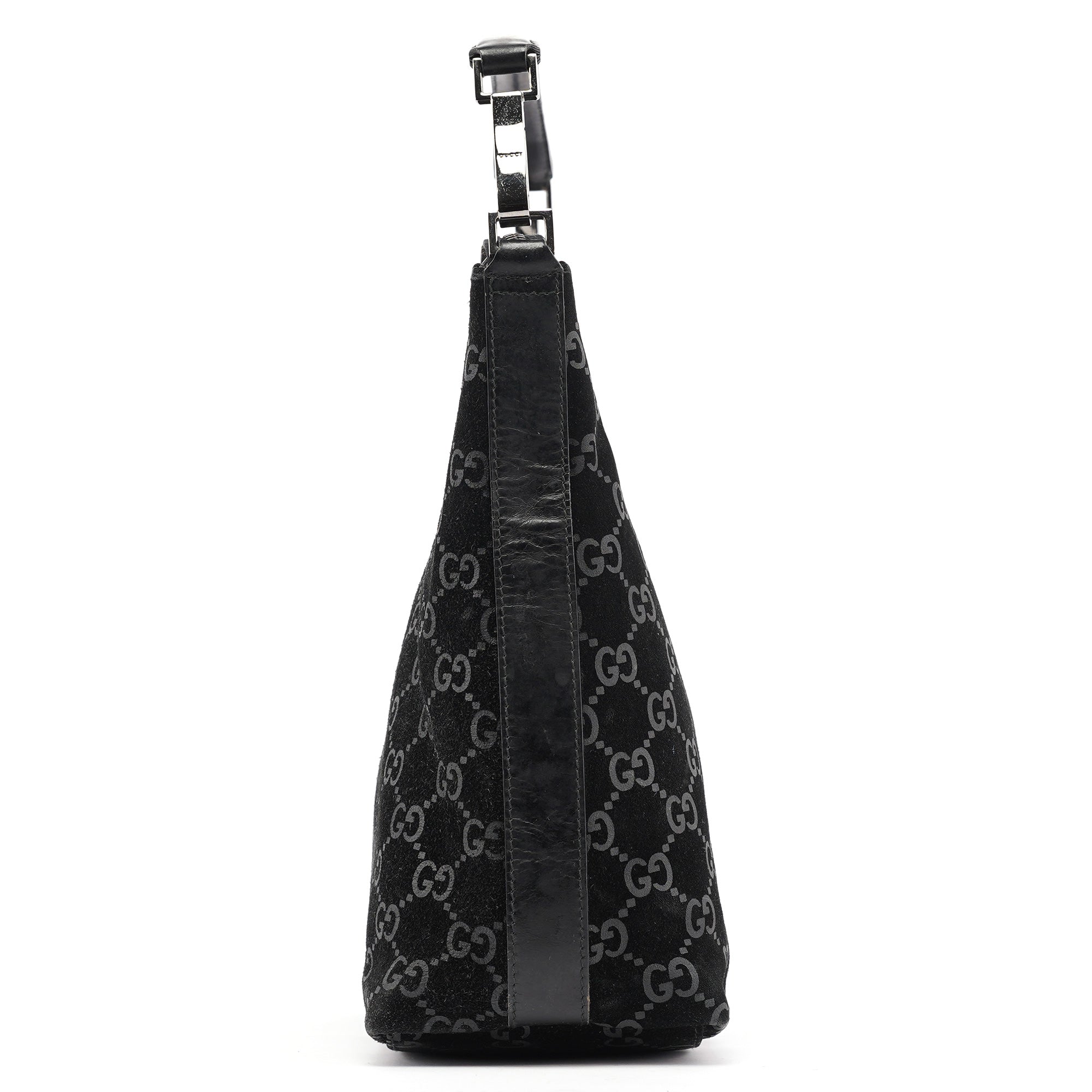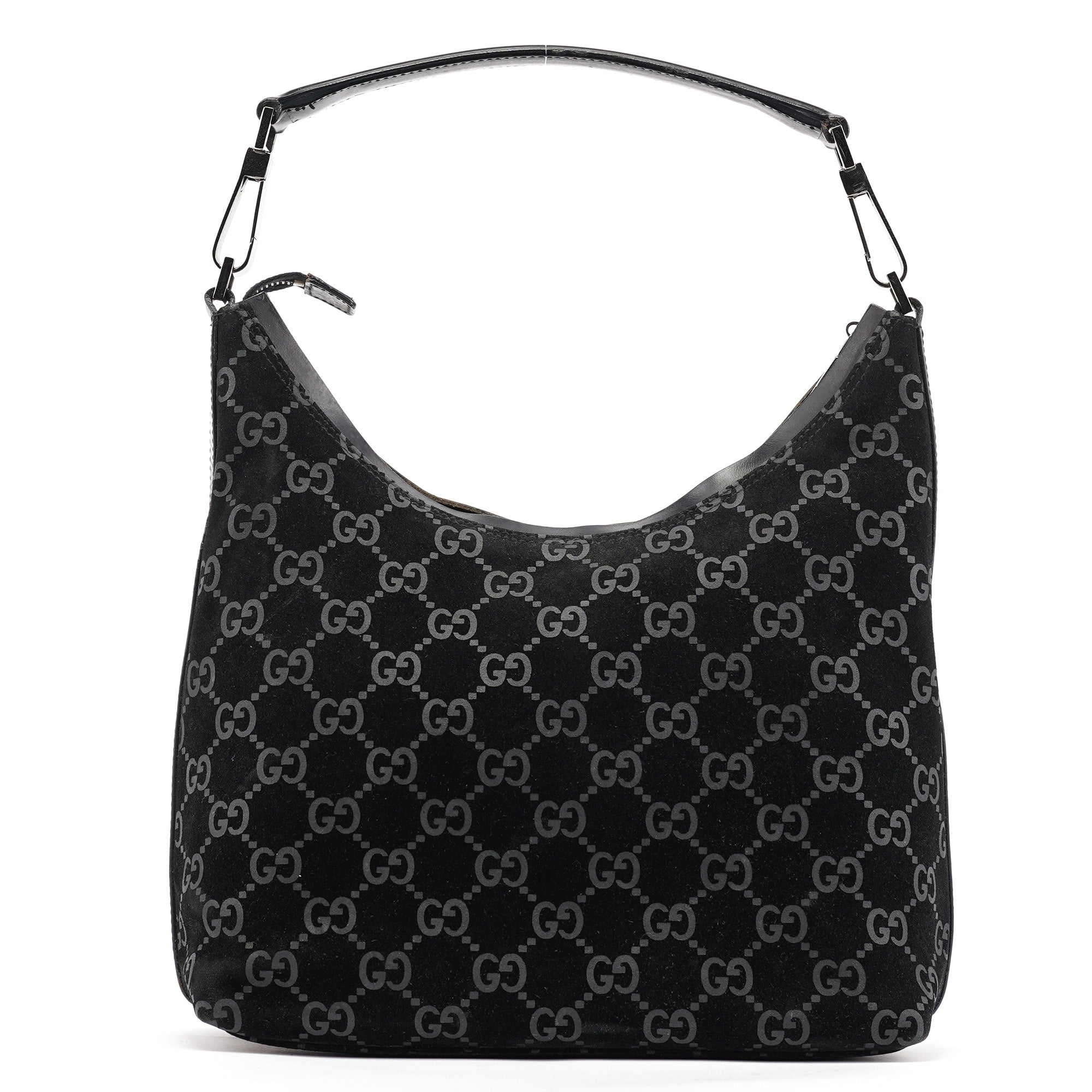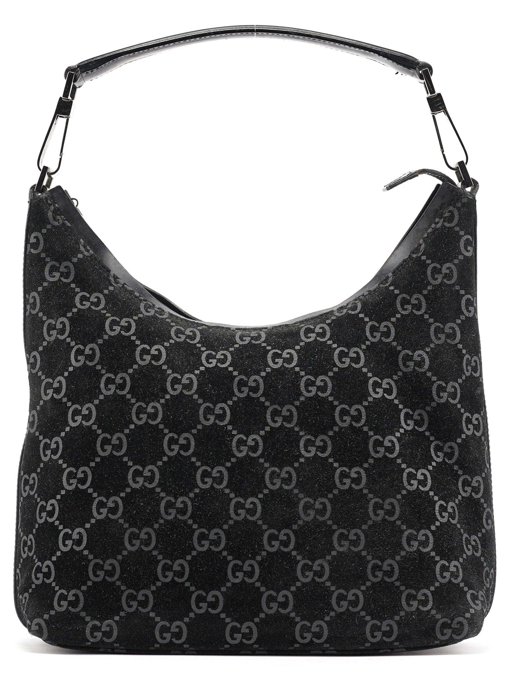 Designed in 1997 by Tom Ford, this vintage Gucci shoulder bag exemplifies the brand's classic monogram heritage Tom Ford's era. Crafted in black GG suede with the signature interlocking G pattern throughout, the bag features a curved hobo silhouette with a single leather shoulder strap accented by silver-tone hardware links. The zip-top closure opens to a black fabric-lined interior with one pocket.