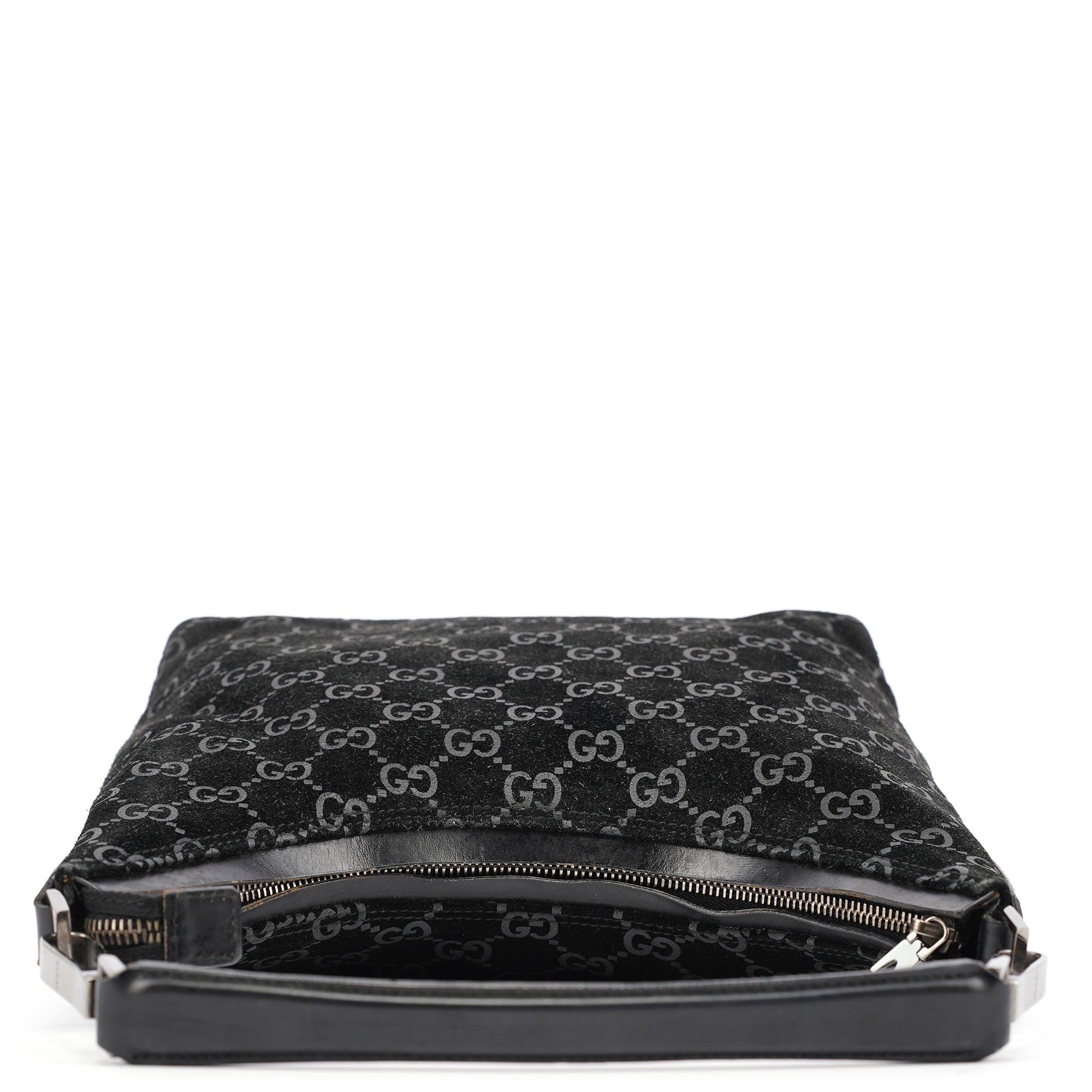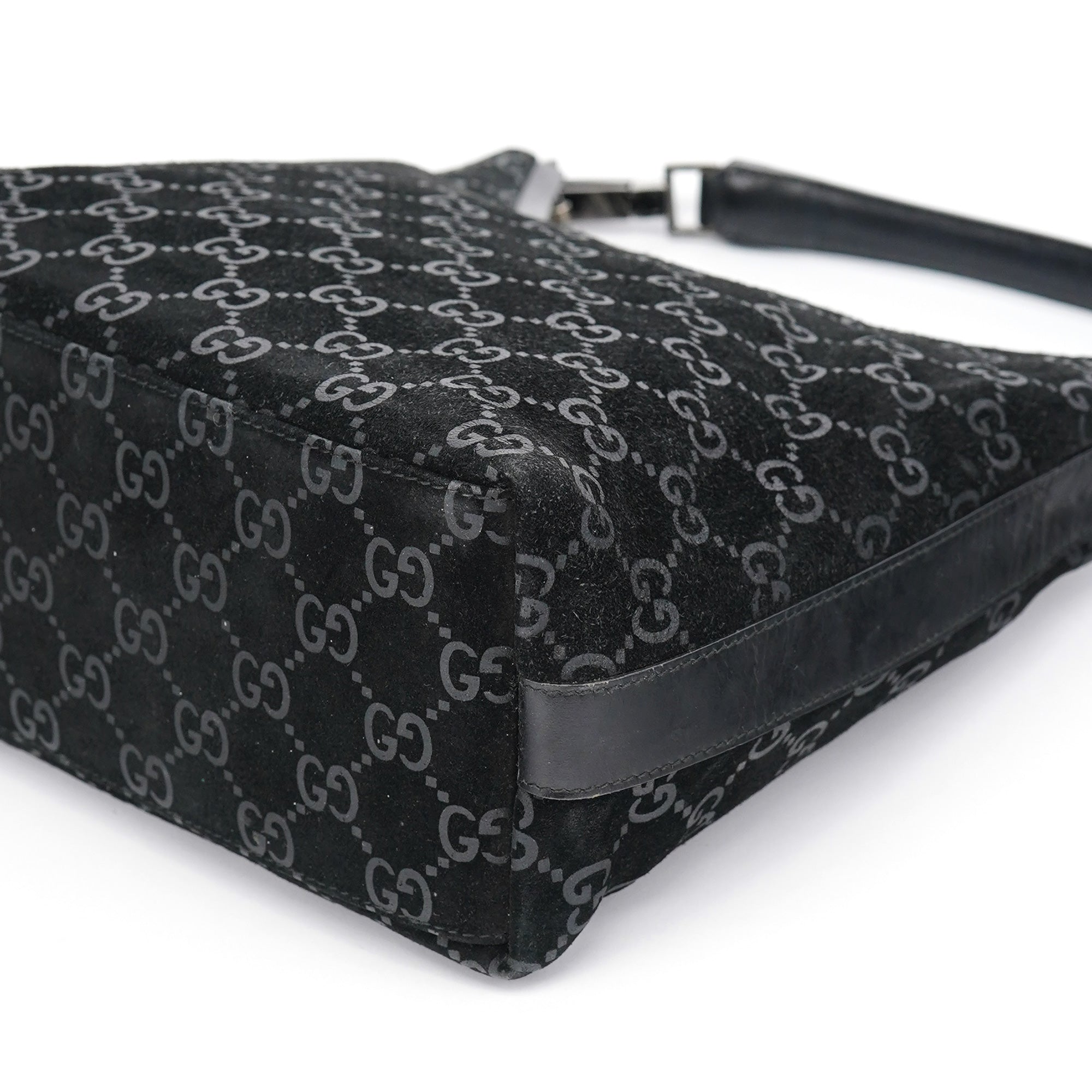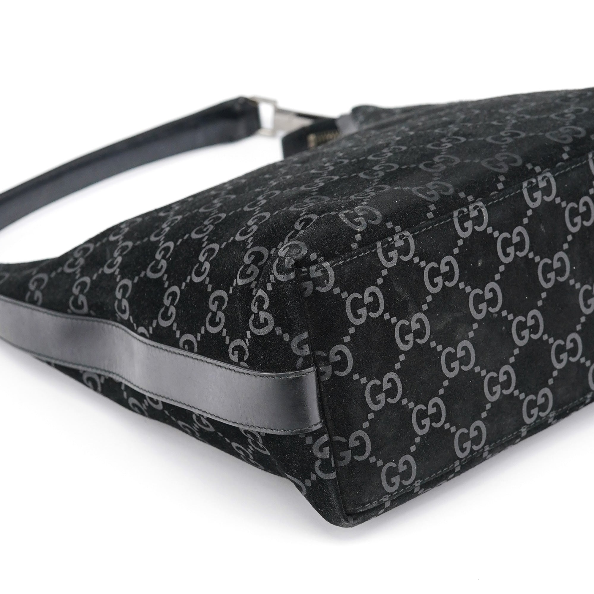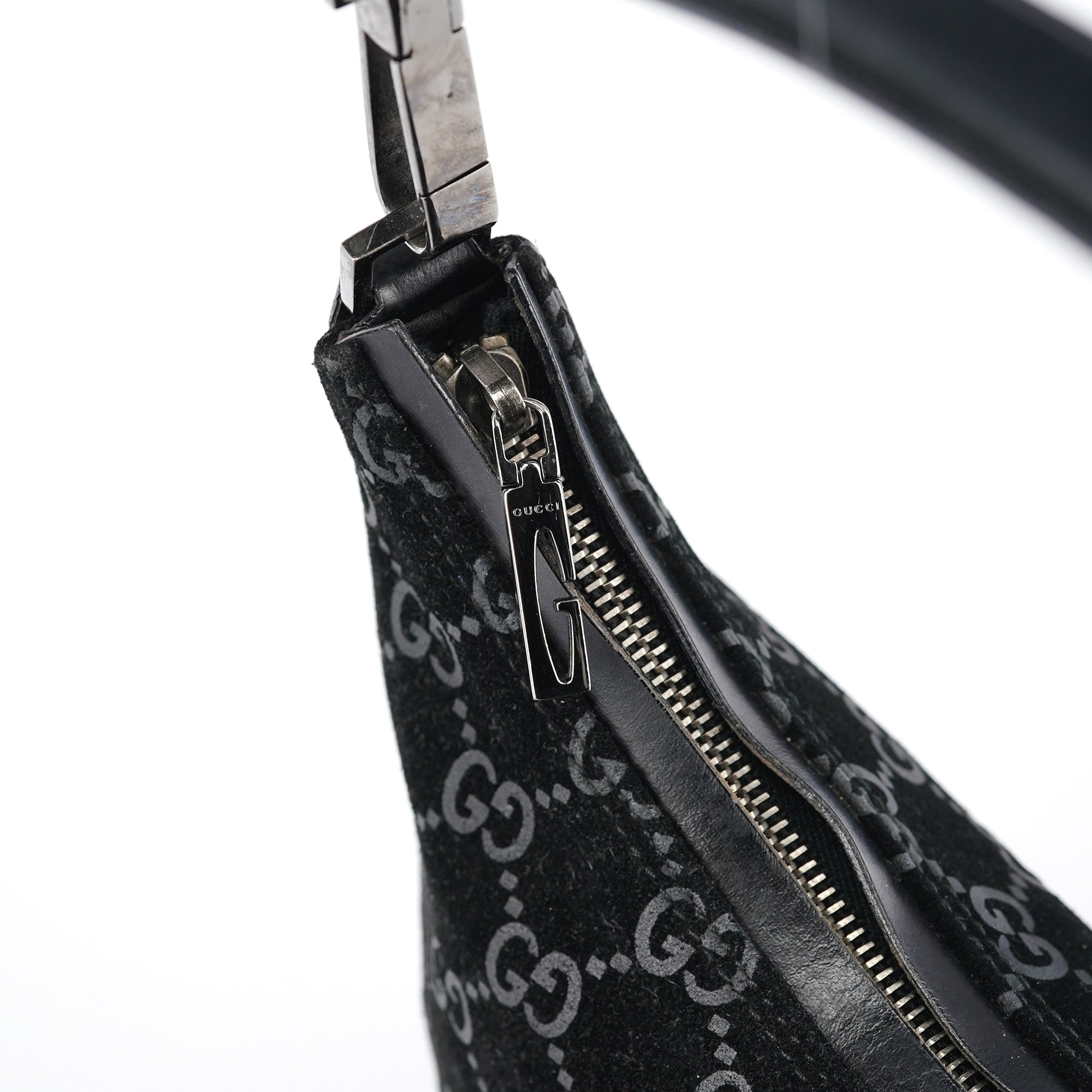 Designed in 1997 by Tom Ford, this vintage Gucci shoulder bag exemplifies the brand's classic monogram heritage Tom Ford's era. Crafted in black GG suede with the signature interlocking G pattern throughout, the bag features a curved hobo silhouette with a single leather shoulder strap accented by silver-tone hardware links. The zip-top closure opens to a black fabric-lined interior with one pocket.