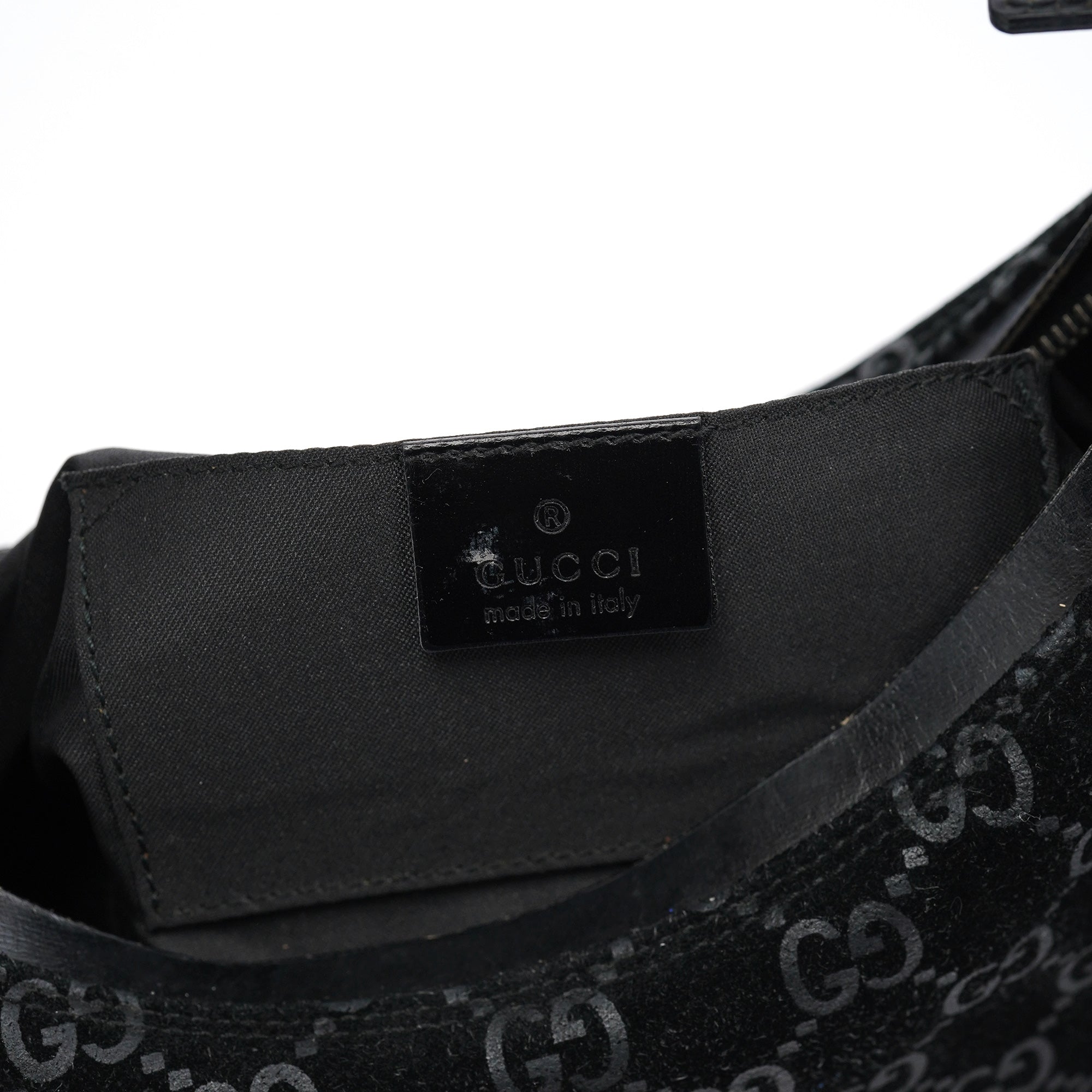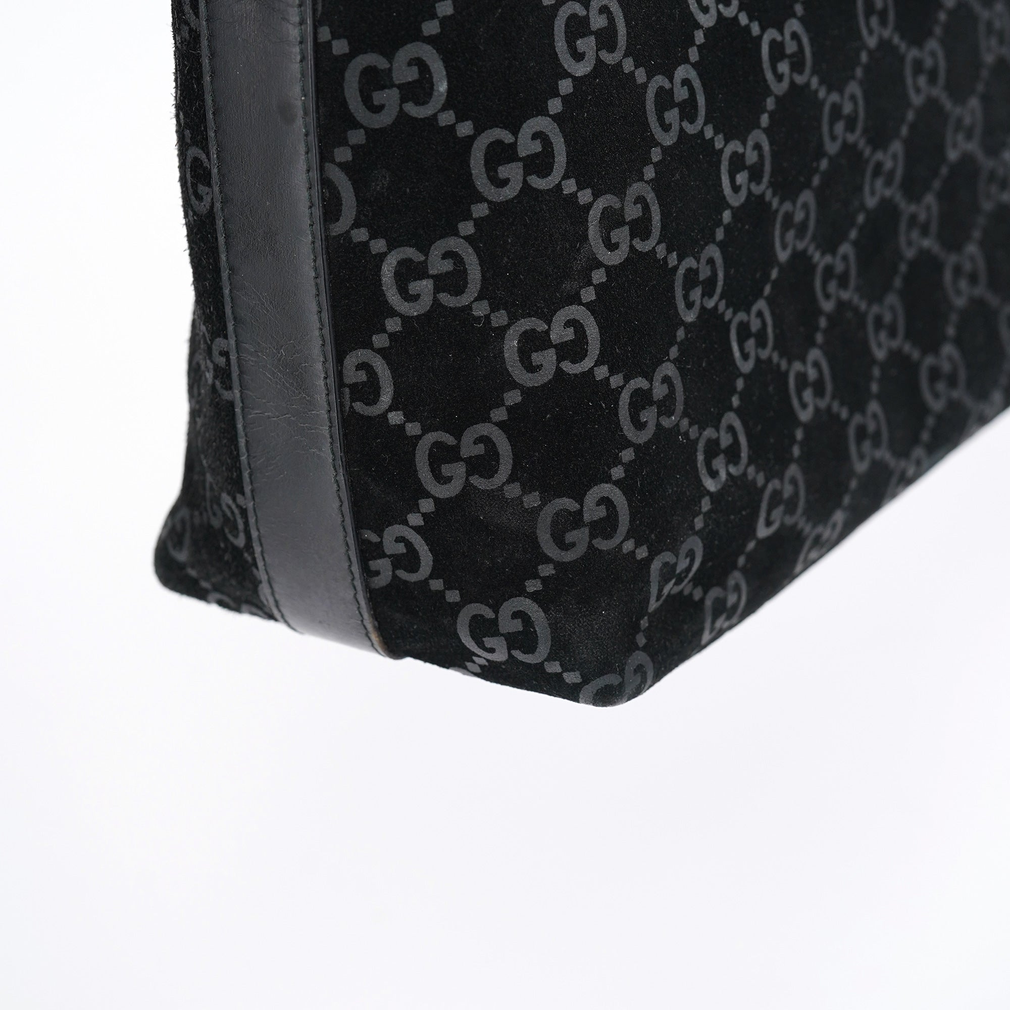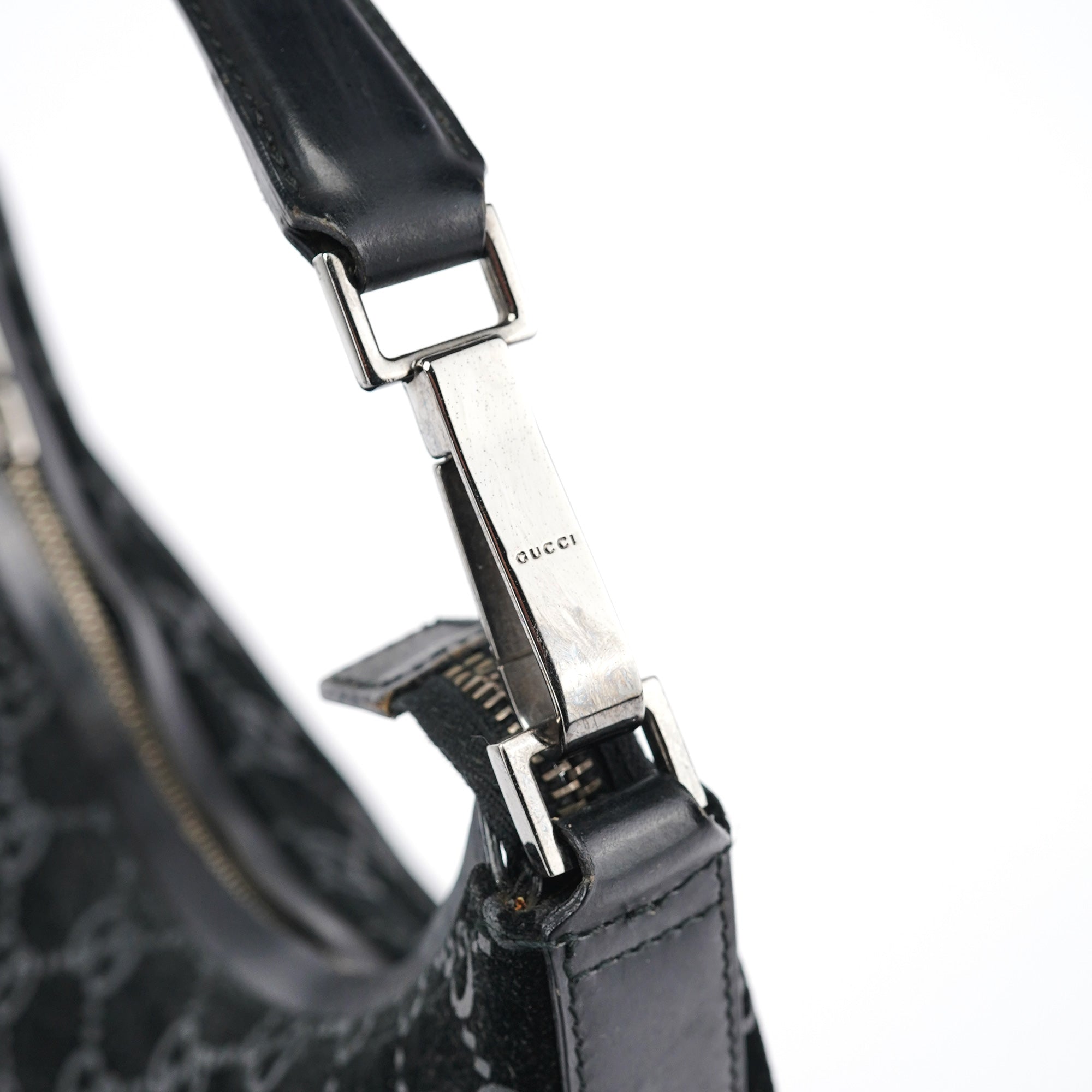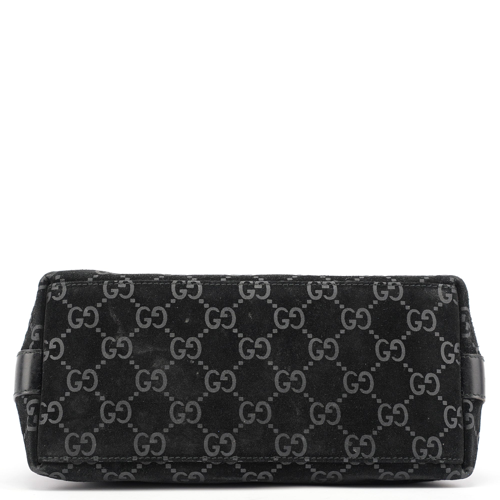 Designed in 1997 by Tom Ford, this vintage Gucci shoulder bag exemplifies the brand's classic monogram heritage Tom Ford's era. Crafted in black GG suede with the signature interlocking G pattern throughout, the bag features a curved hobo silhouette with a single leather shoulder strap accented by silver-tone hardware links. The zip-top closure opens to a black fabric-lined interior with one pocket.