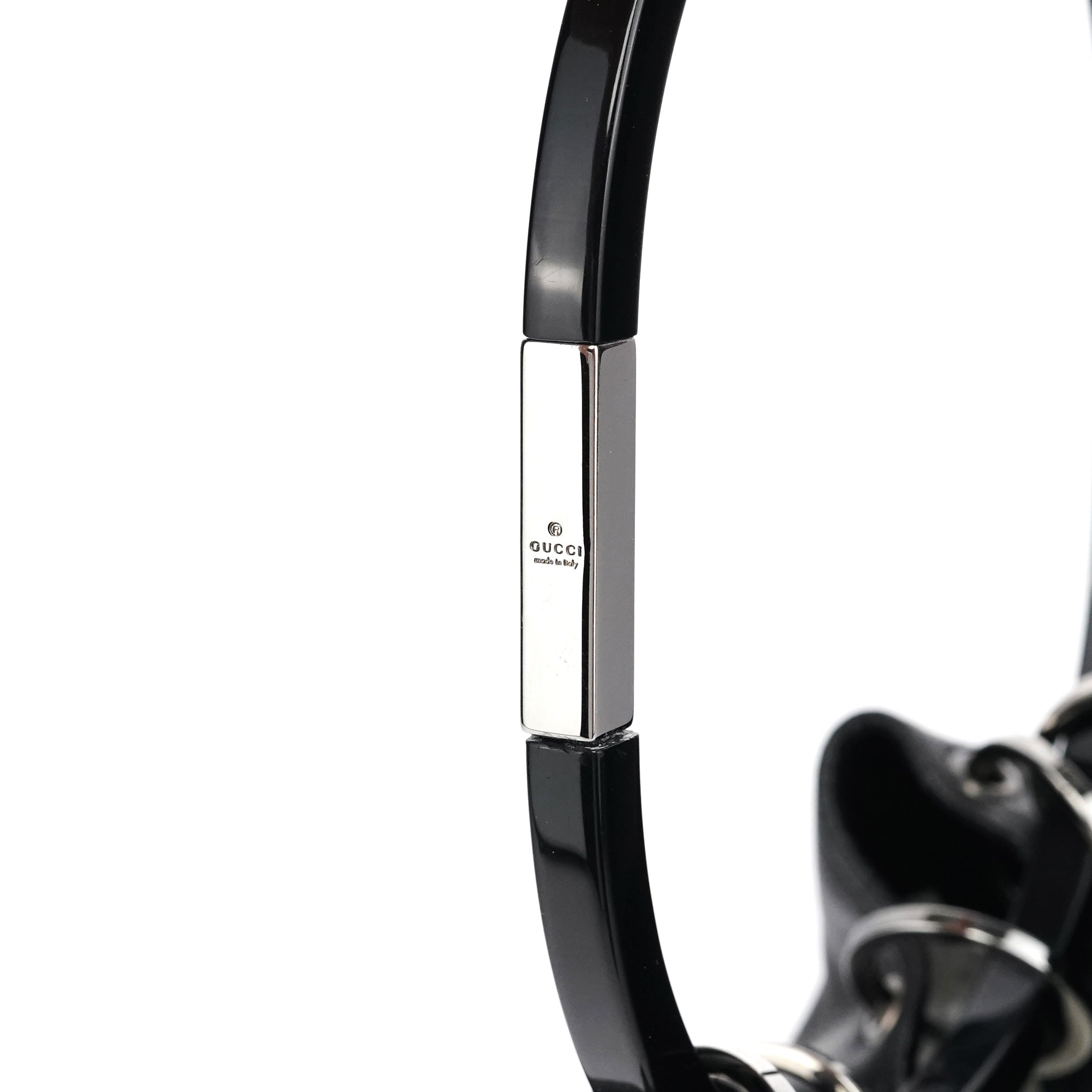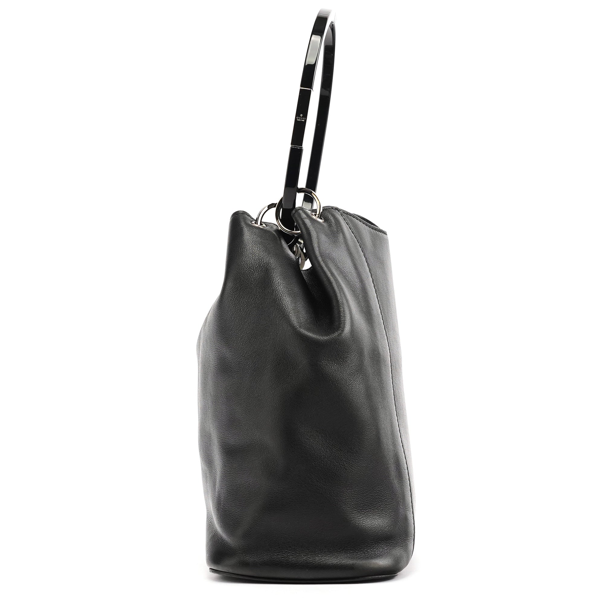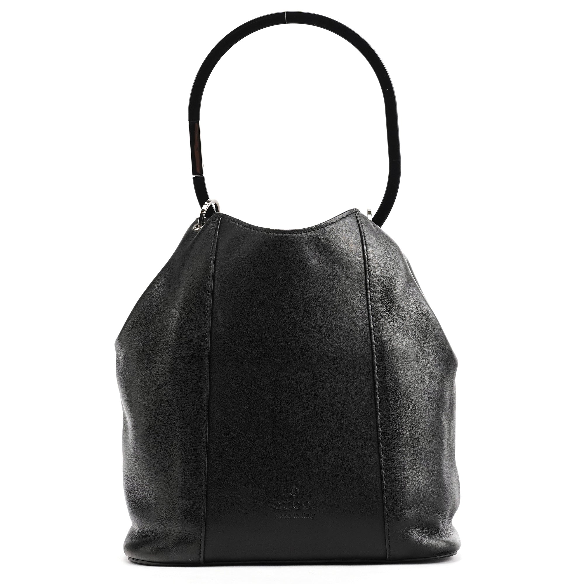 Designed in 1999 by Tom Ford, this Gucci Loop bag is crafted in smooth black calfskin with a distinctive rigid oval handle in lacquered resin and polished silver hardware. Its drawstring closure opens to a black suede-lined interior fitted with a small slip pocket. A sculptural and refined piece that embodies Ford’s late-90s vision of modern luxury.
