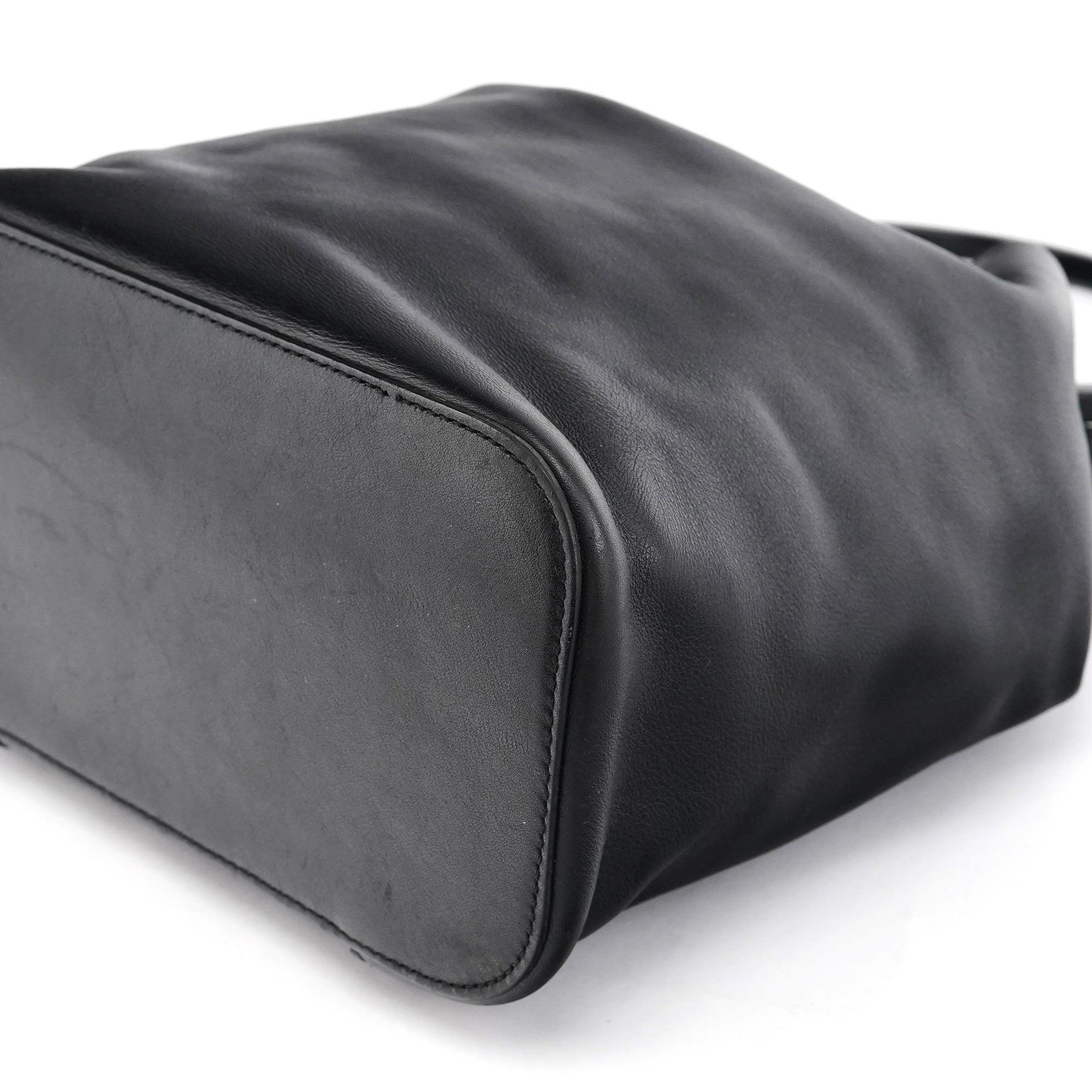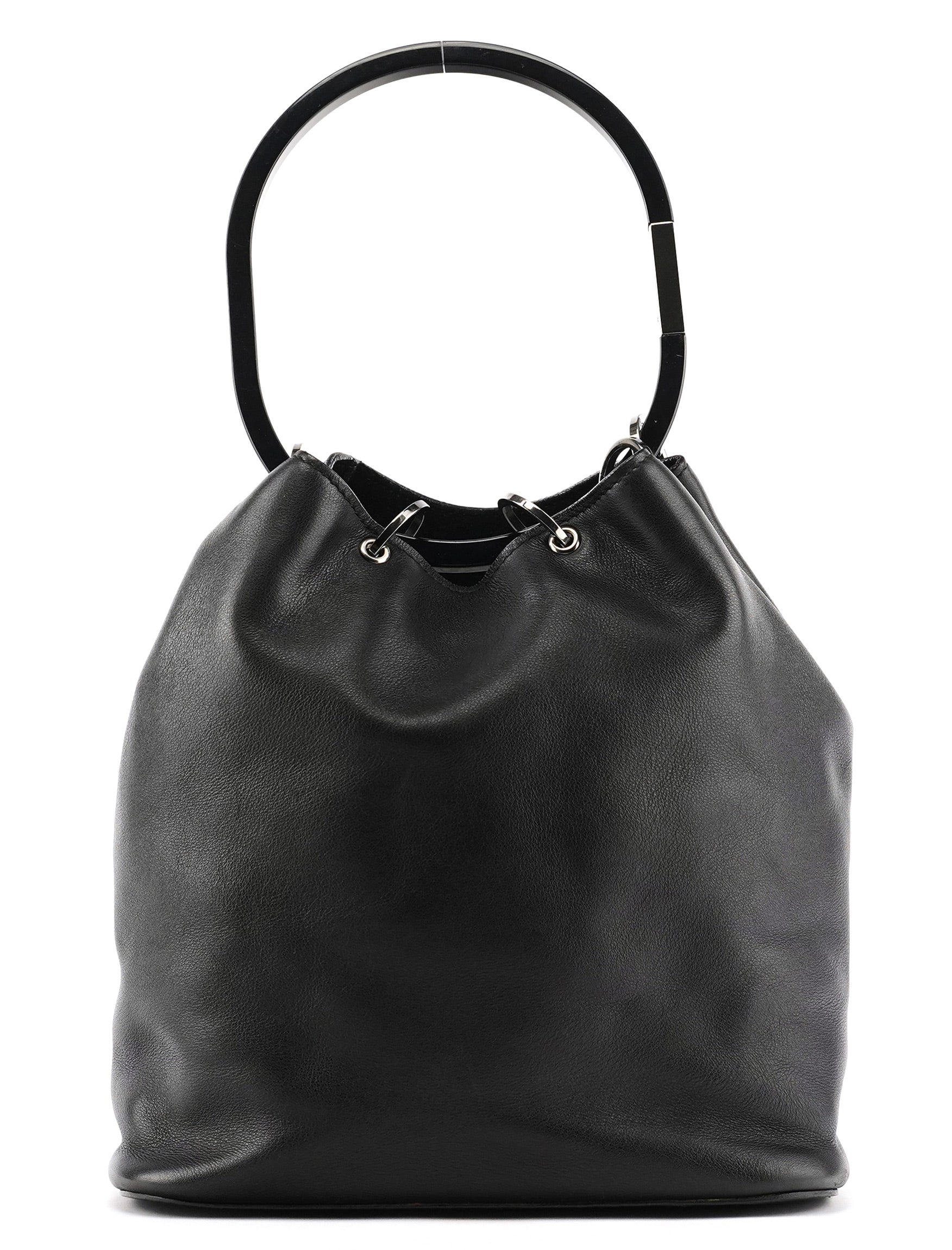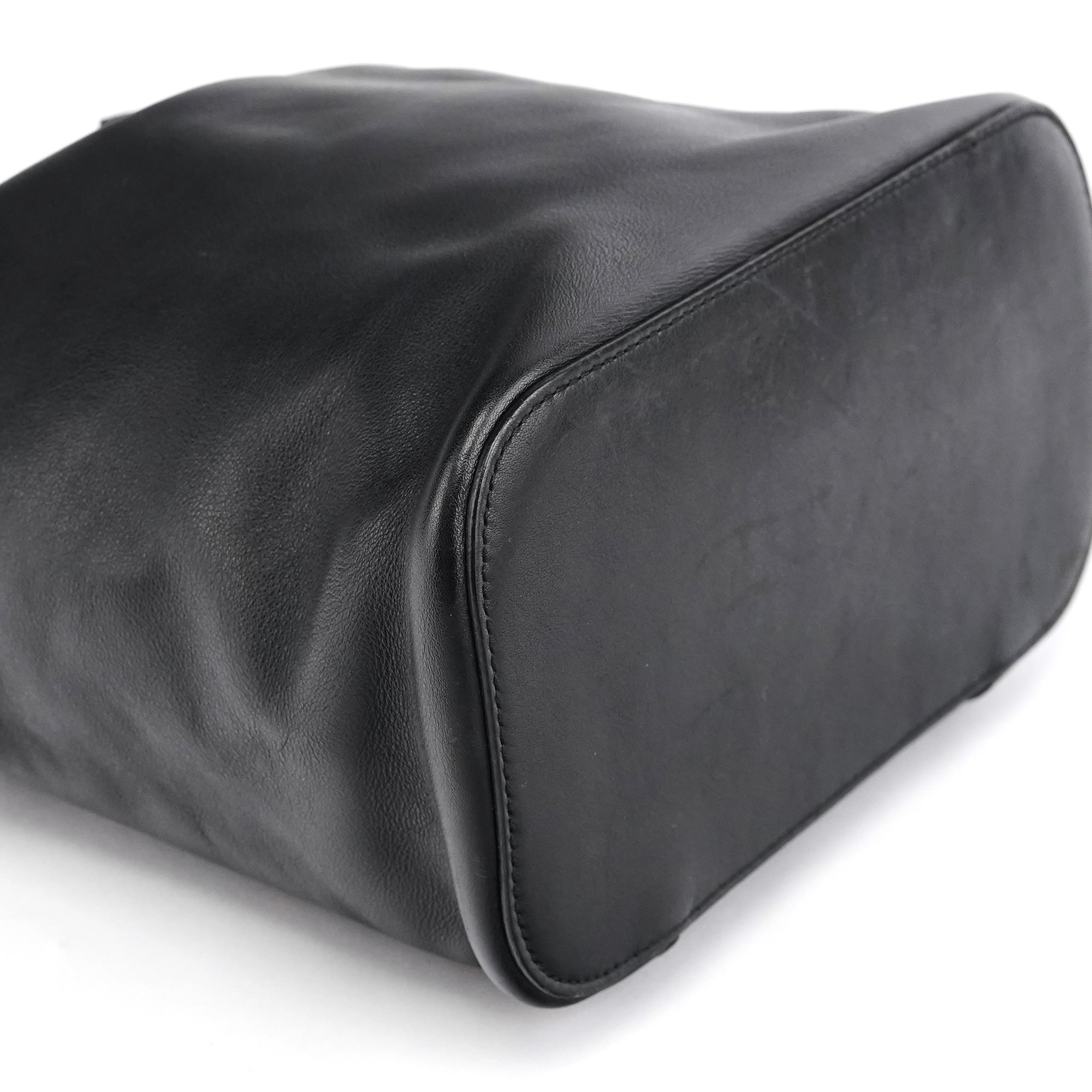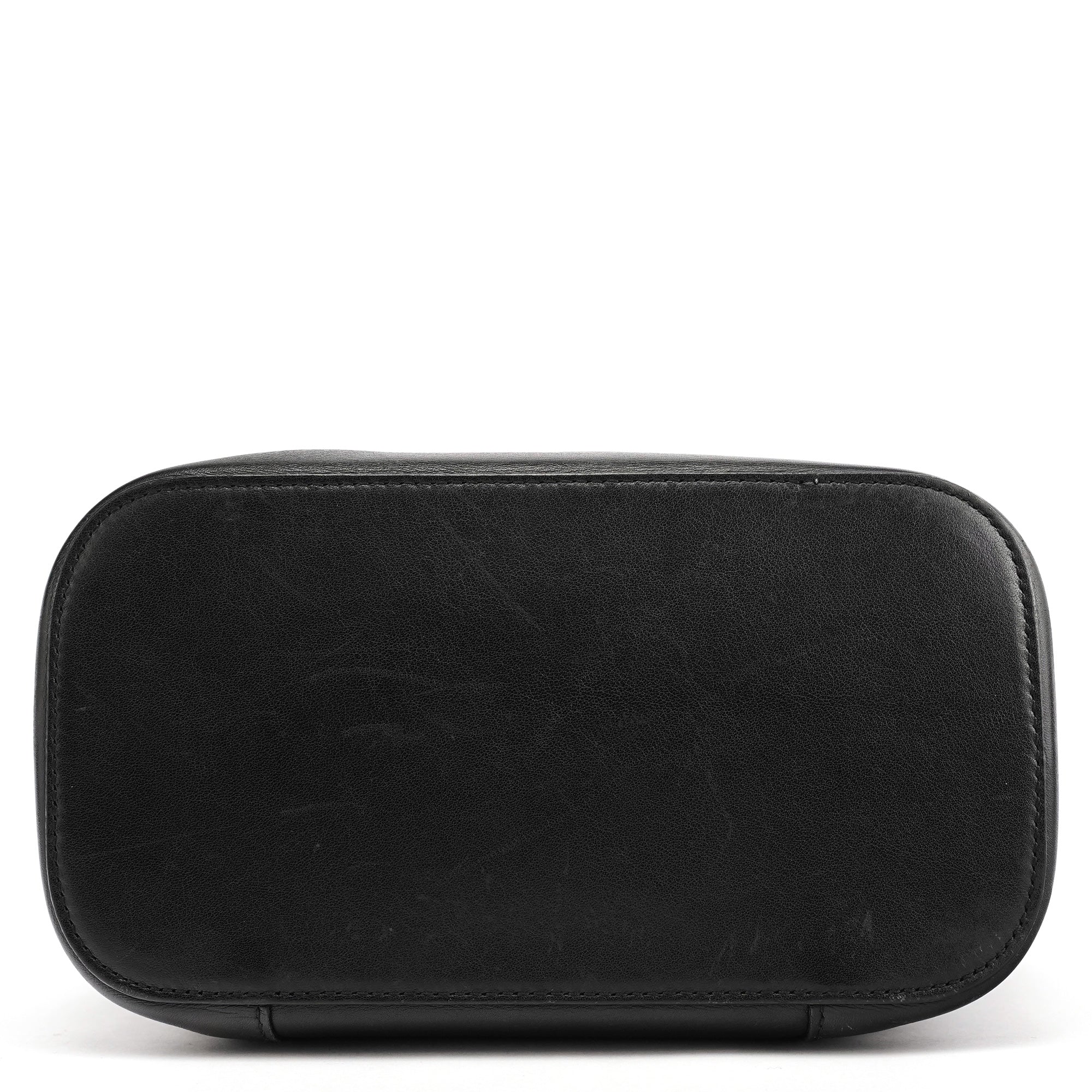 Designed in 1999 by Tom Ford, this Gucci Loop bag is crafted in smooth black calfskin with a distinctive rigid oval handle in lacquered resin and polished silver hardware. Its drawstring closure opens to a black suede-lined interior fitted with a small slip pocket. A sculptural and refined piece that embodies Ford’s late-90s vision of modern luxury.