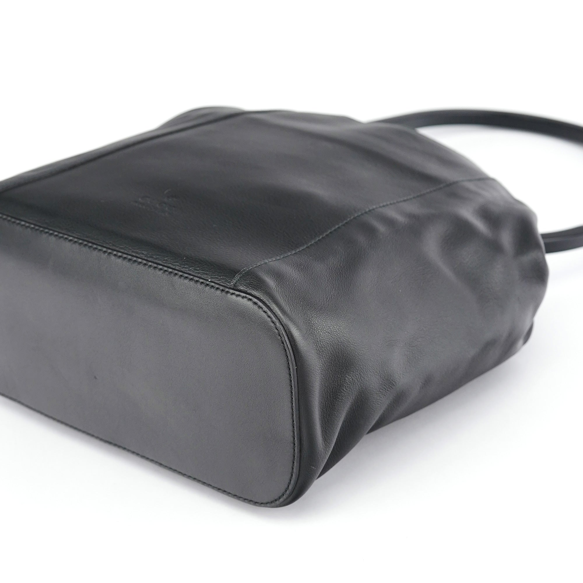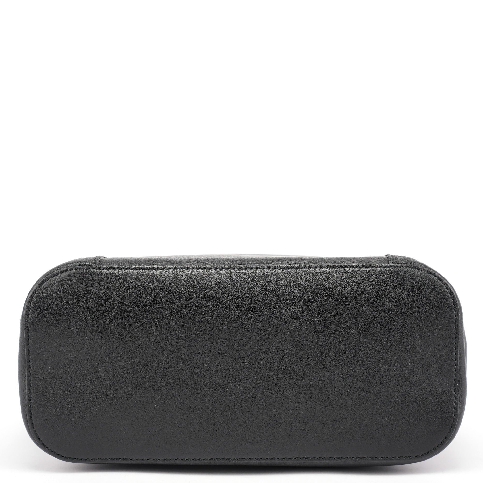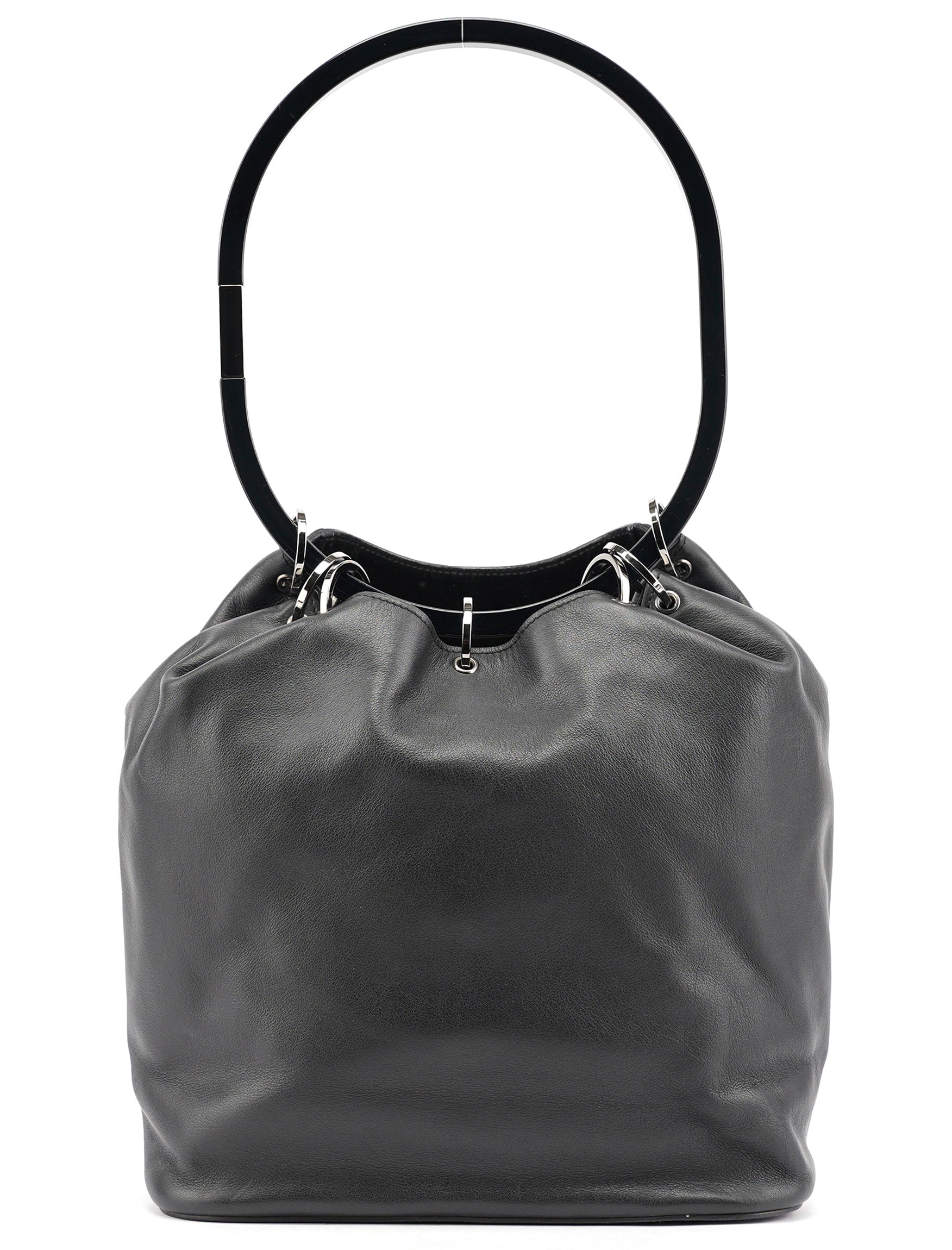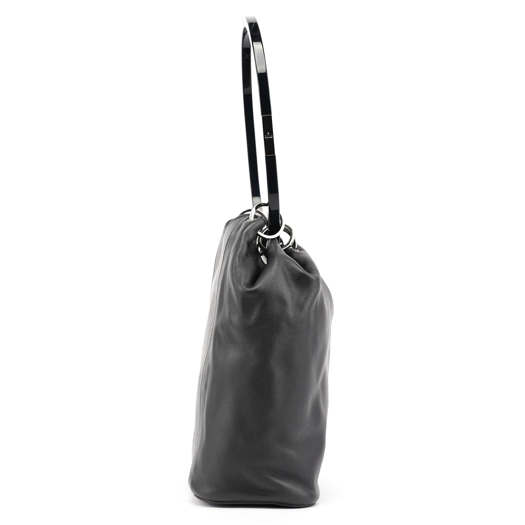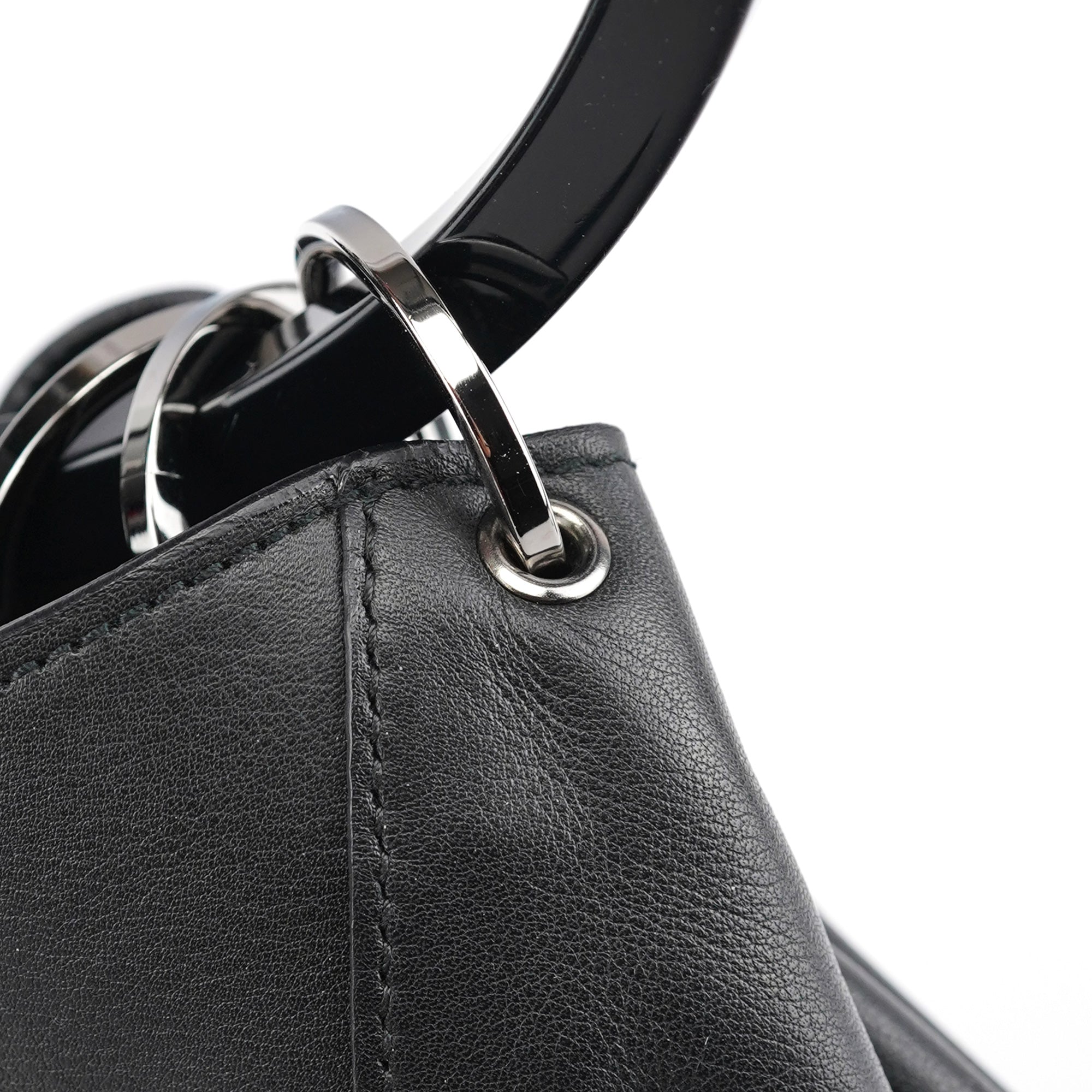 Designed in 1999 by Tom Ford, this Gucci ring bag is crafted in smooth black calfskin with polished silver-tone hardware and a structured circular handle. It features a softly pleated bucket silhouette with a silver-tone ring closed top and a suede-lined interior with interior pocket.