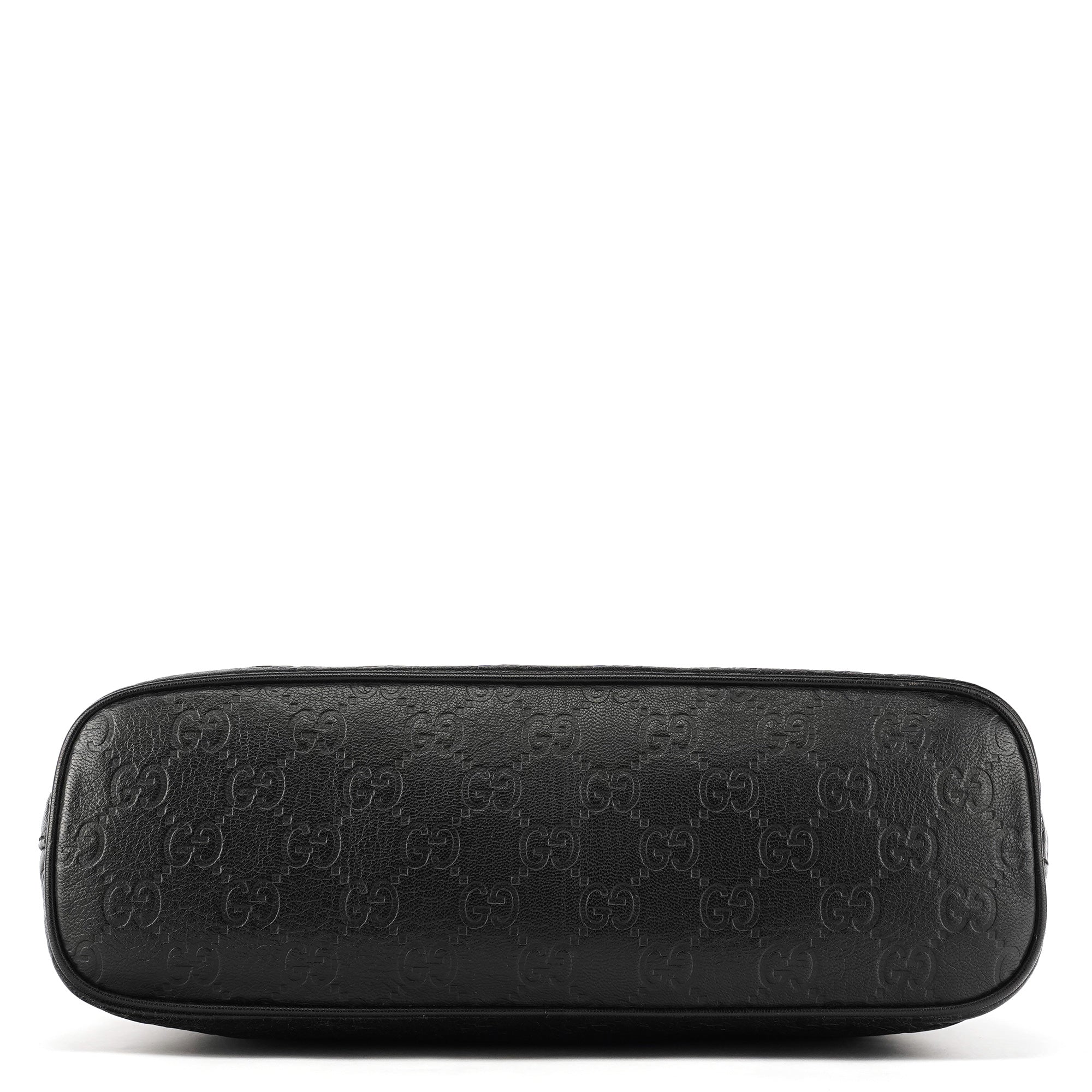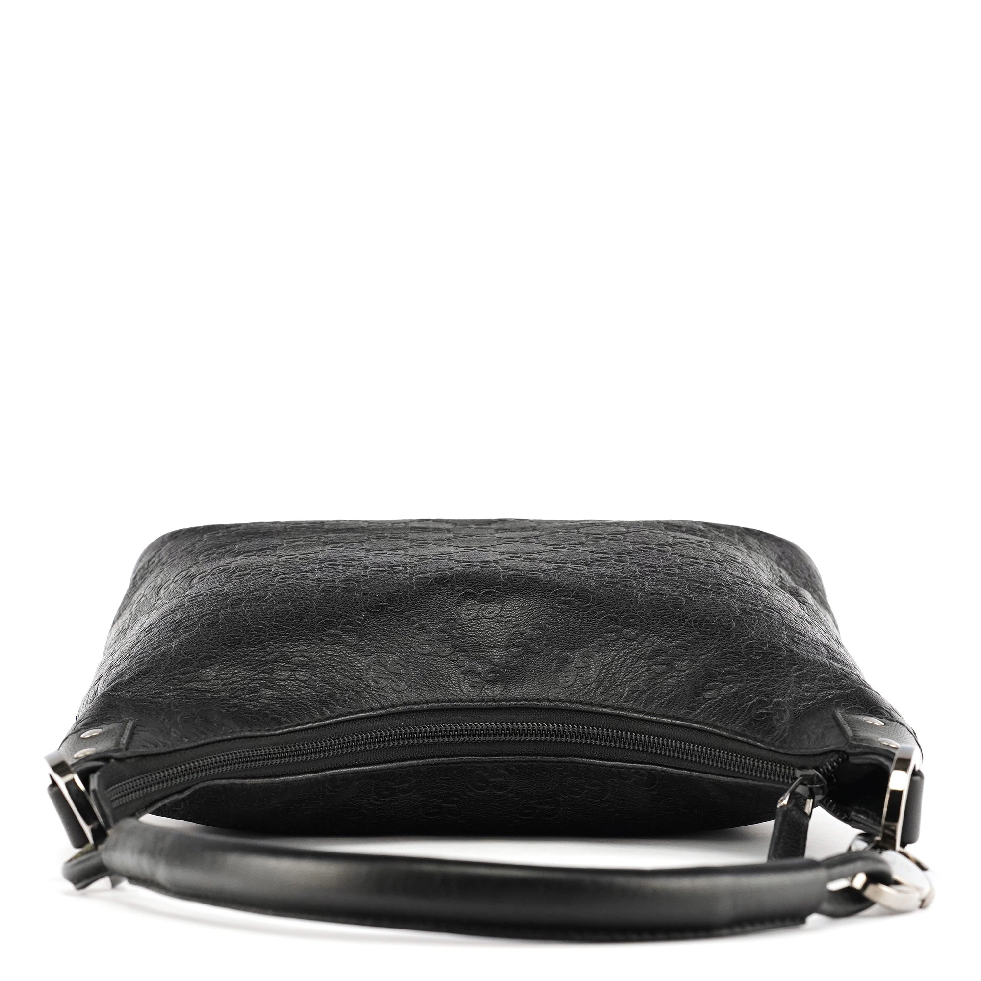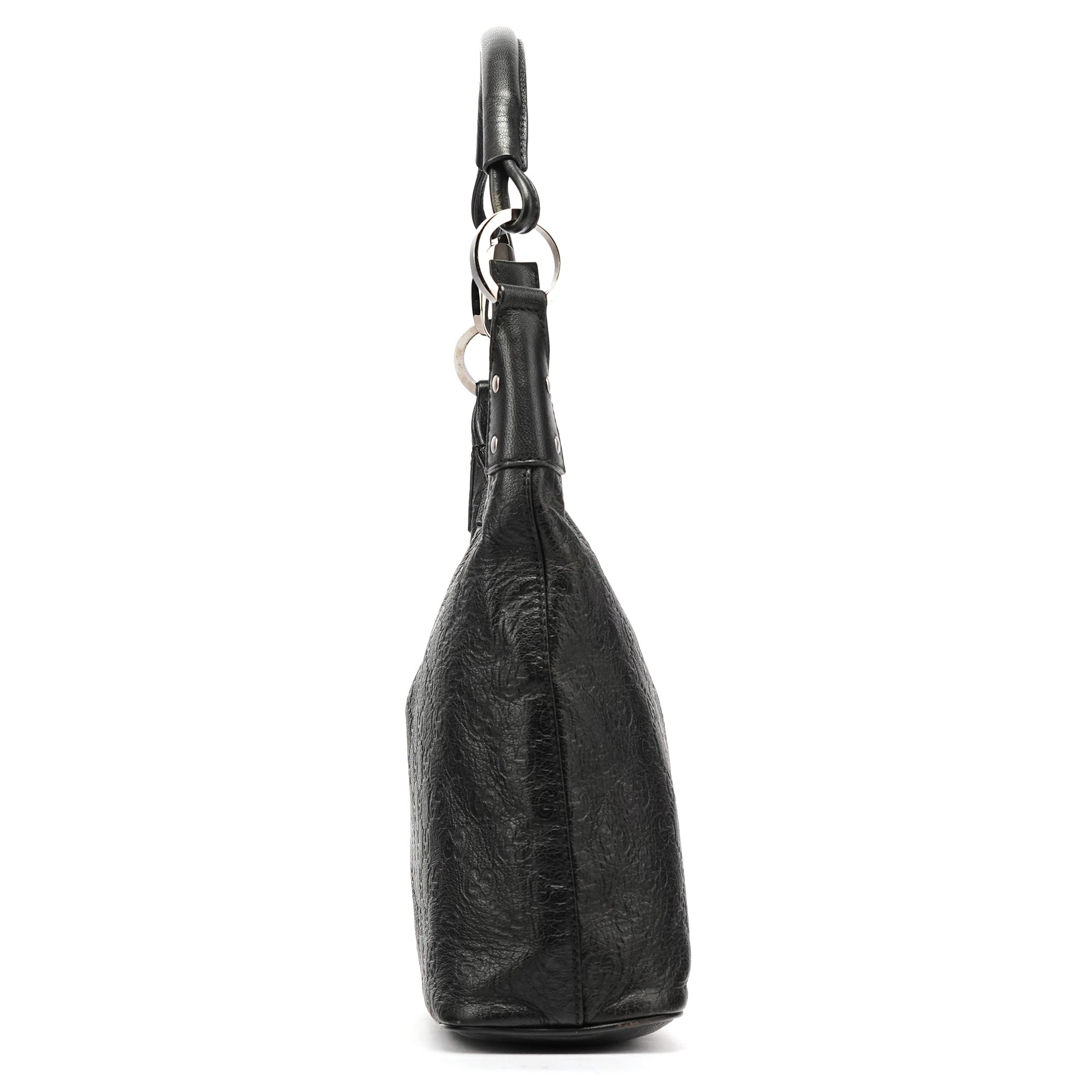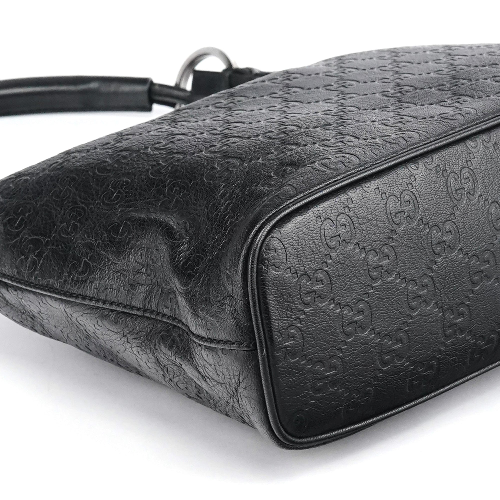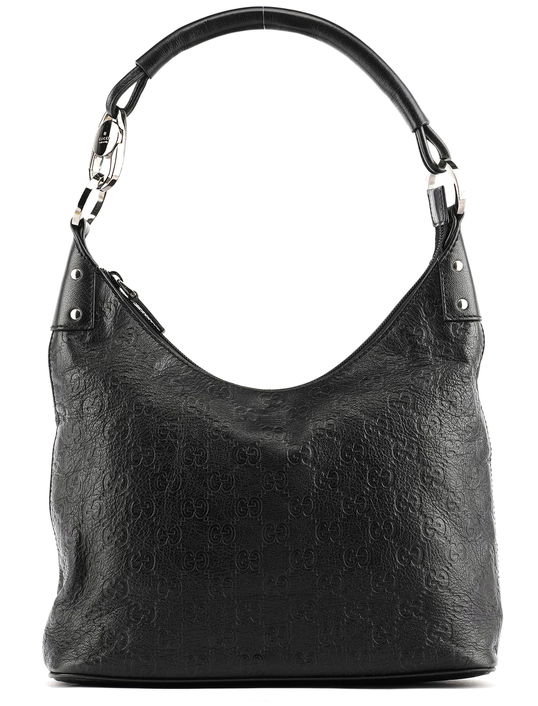 Designed in the early 2000s by Tom Ford, this Gucci GG shoulder bag is crafted in black calfskin embossed with the signature Guccissima pattern. The curved silhouette is paired with a structured single strap finished with polished silver-tone hardware links. The top zip opens to a black fabric-lined interior with a zip pocket.