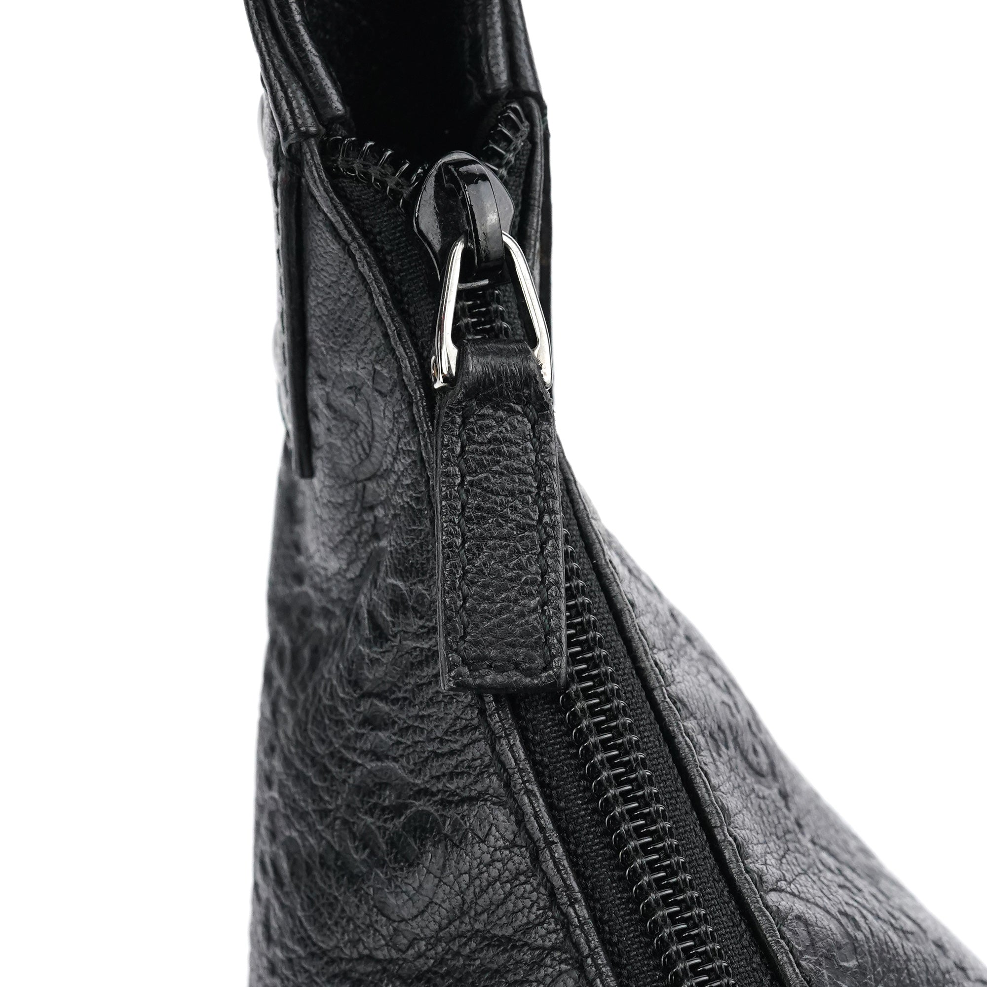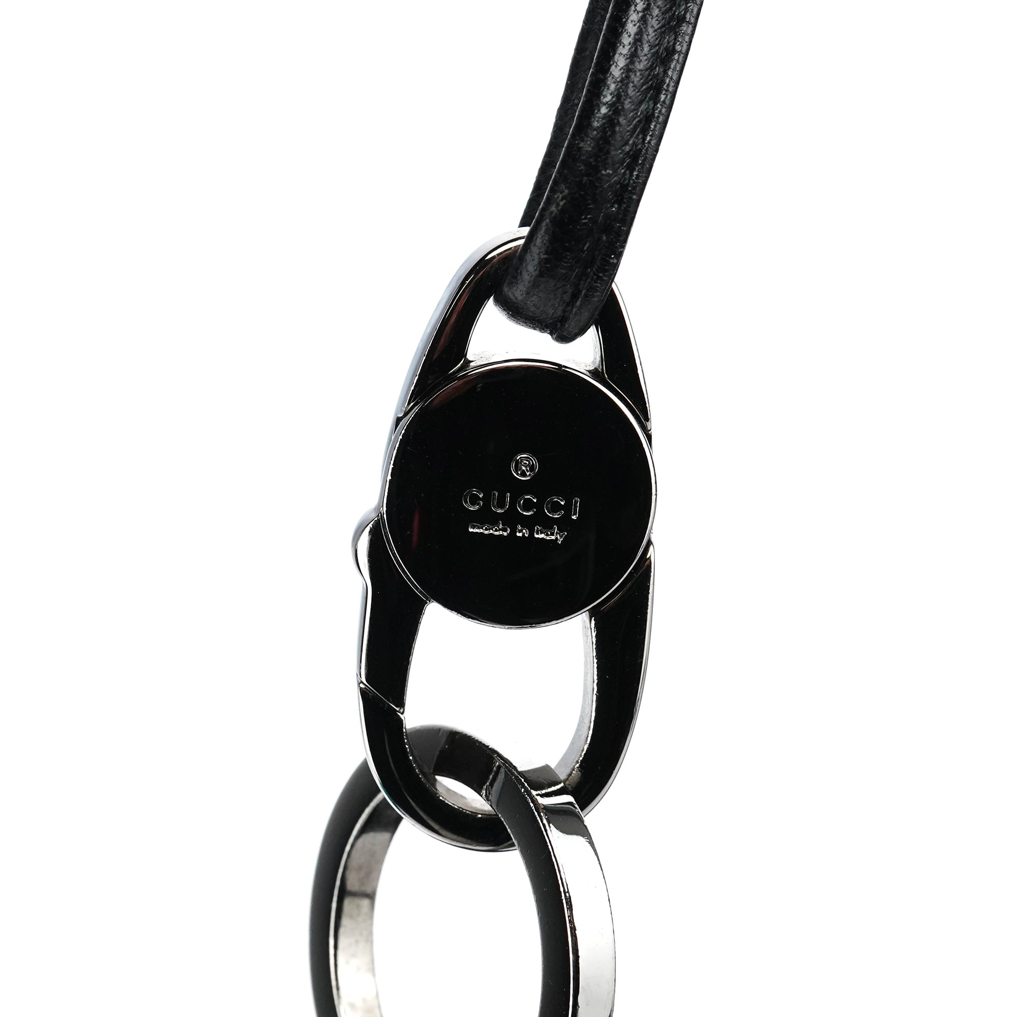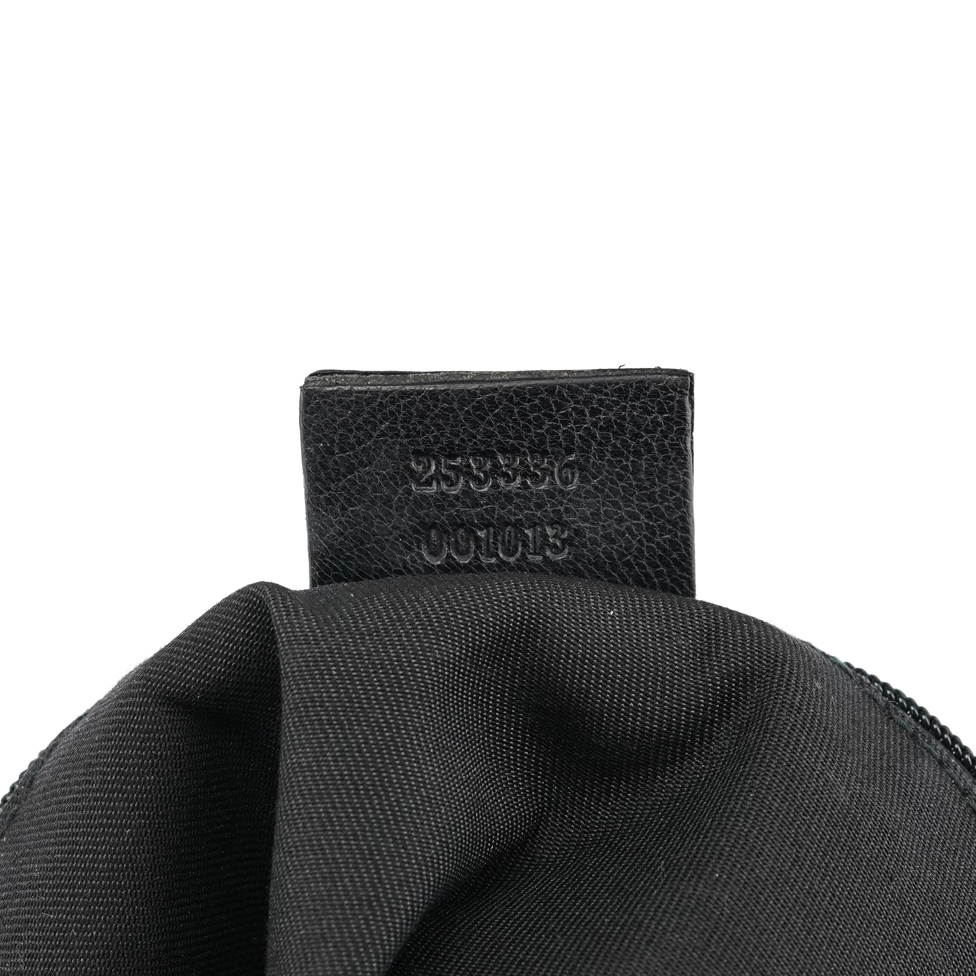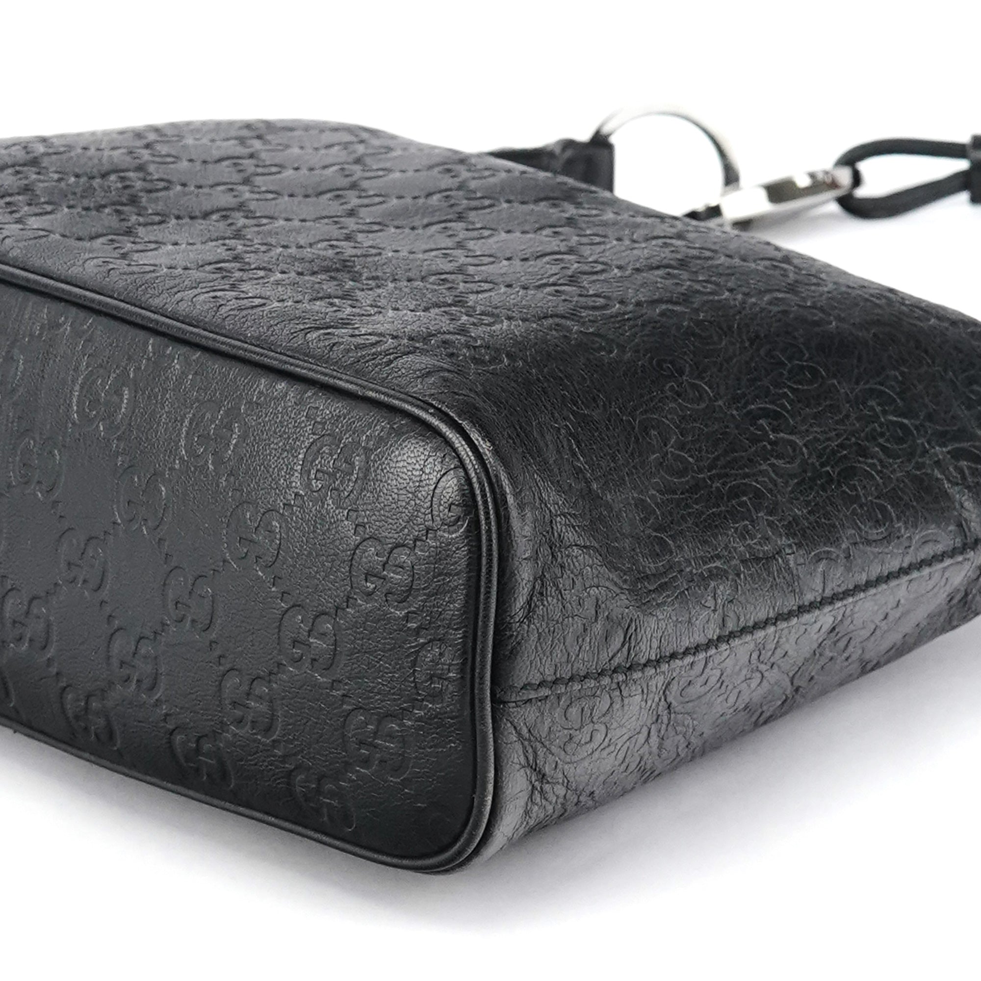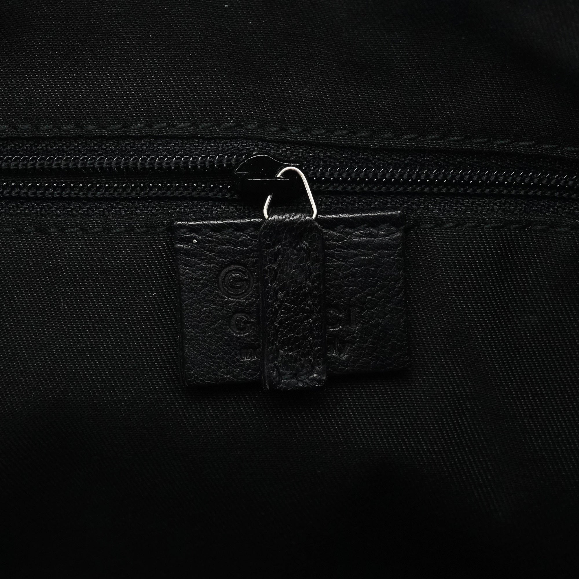 Designed in the early 2000s by Tom Ford, this Gucci GG shoulder bag is crafted in black calfskin embossed with the signature Guccissima pattern. The curved silhouette is paired with a structured single strap finished with polished silver-tone hardware links. The top zip opens to a black fabric-lined interior with a zip pocket.