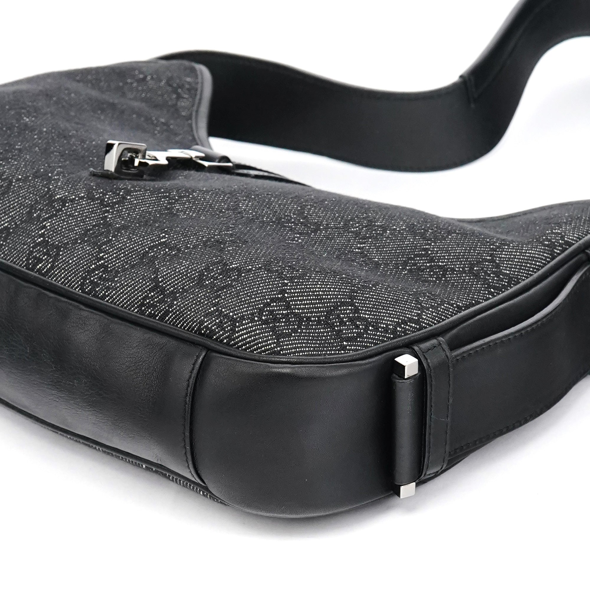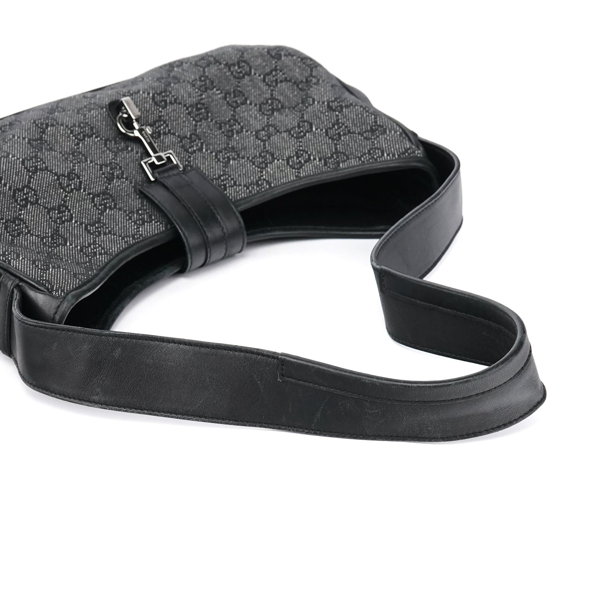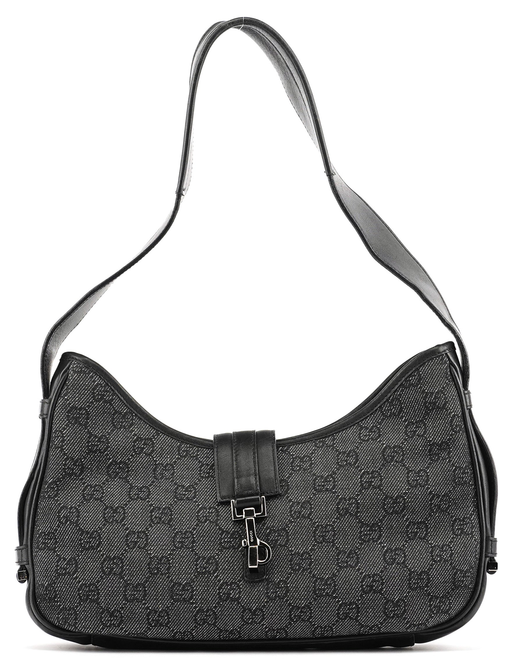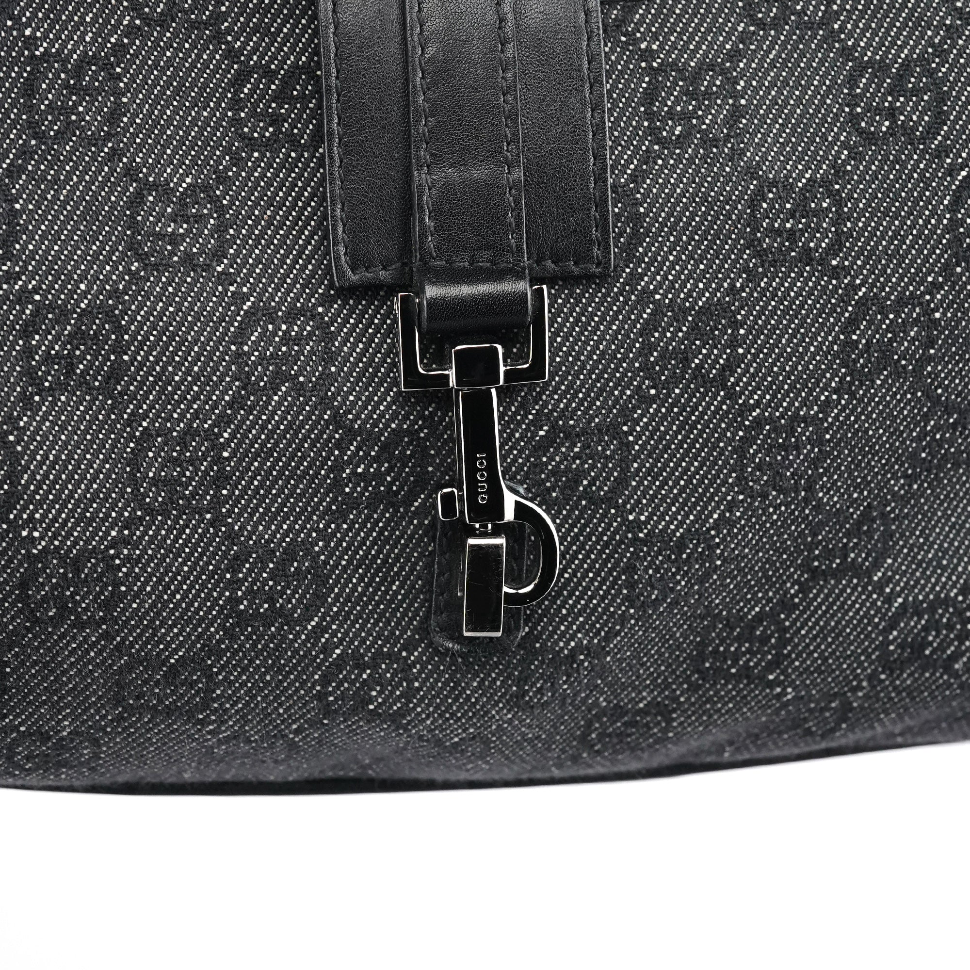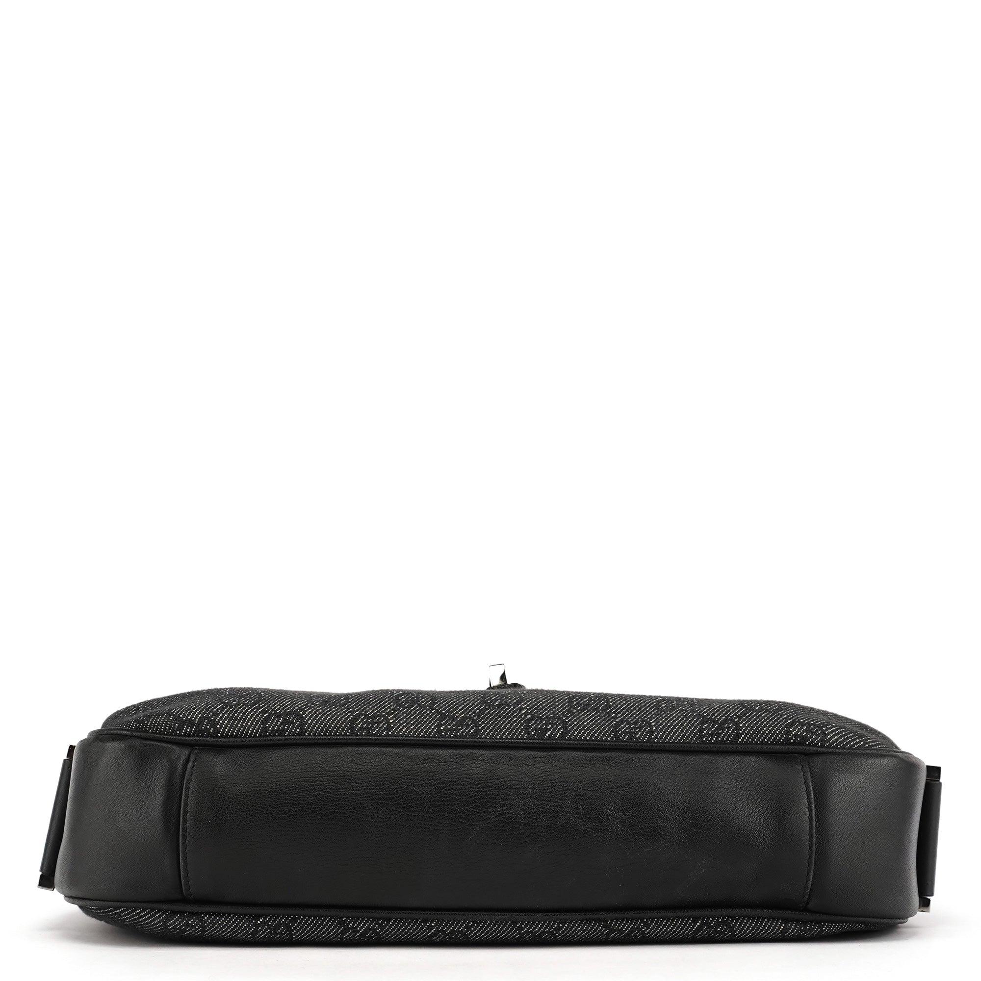 Designed in the early 2000s by Tom Ford, this Gucci Jackie features anthracite GG denim with black calf leather trim and a silver-tone piston clasp. The curved silhouette sits under the arm with a wide leather strap, and the interior includes a fabric lining with a zip pocket.