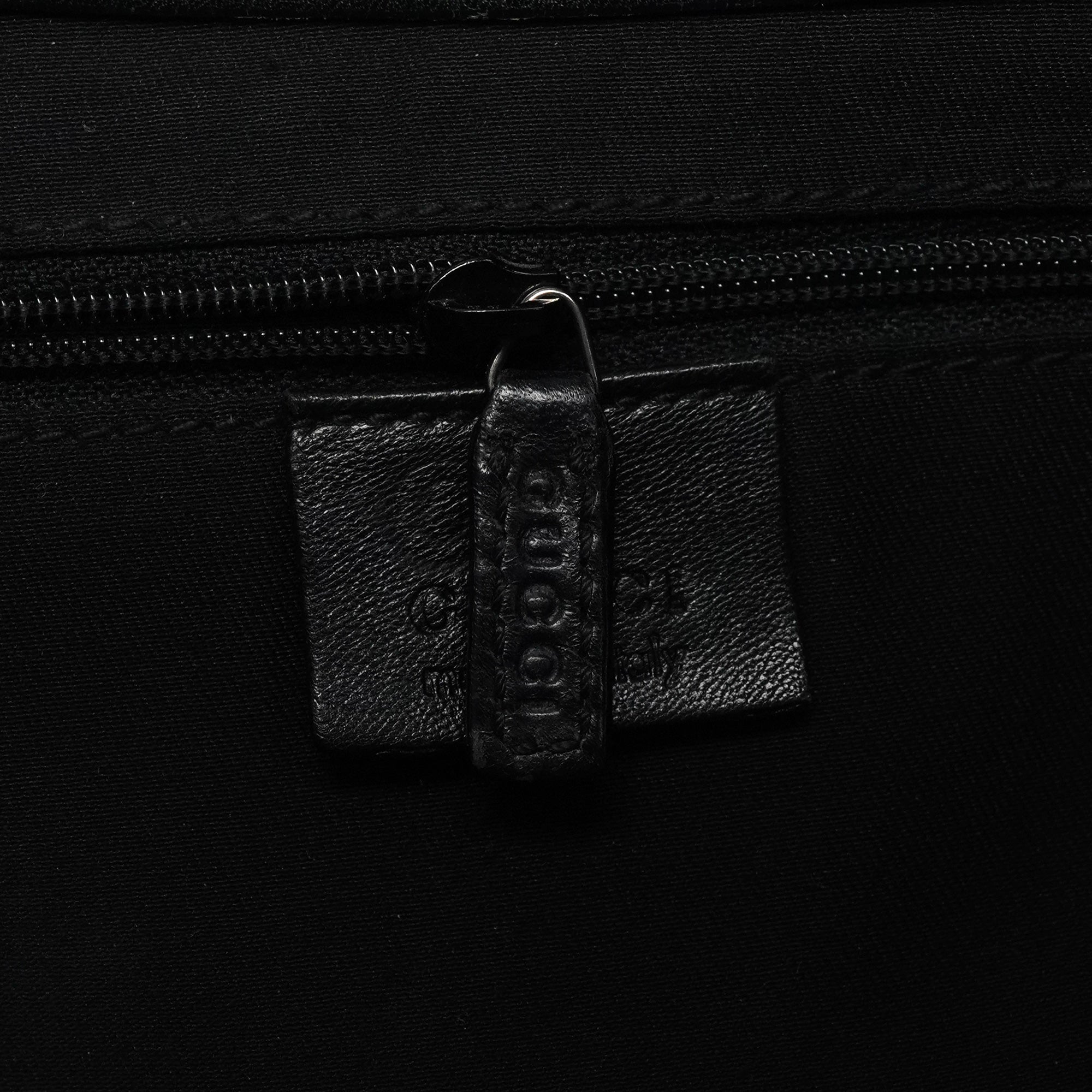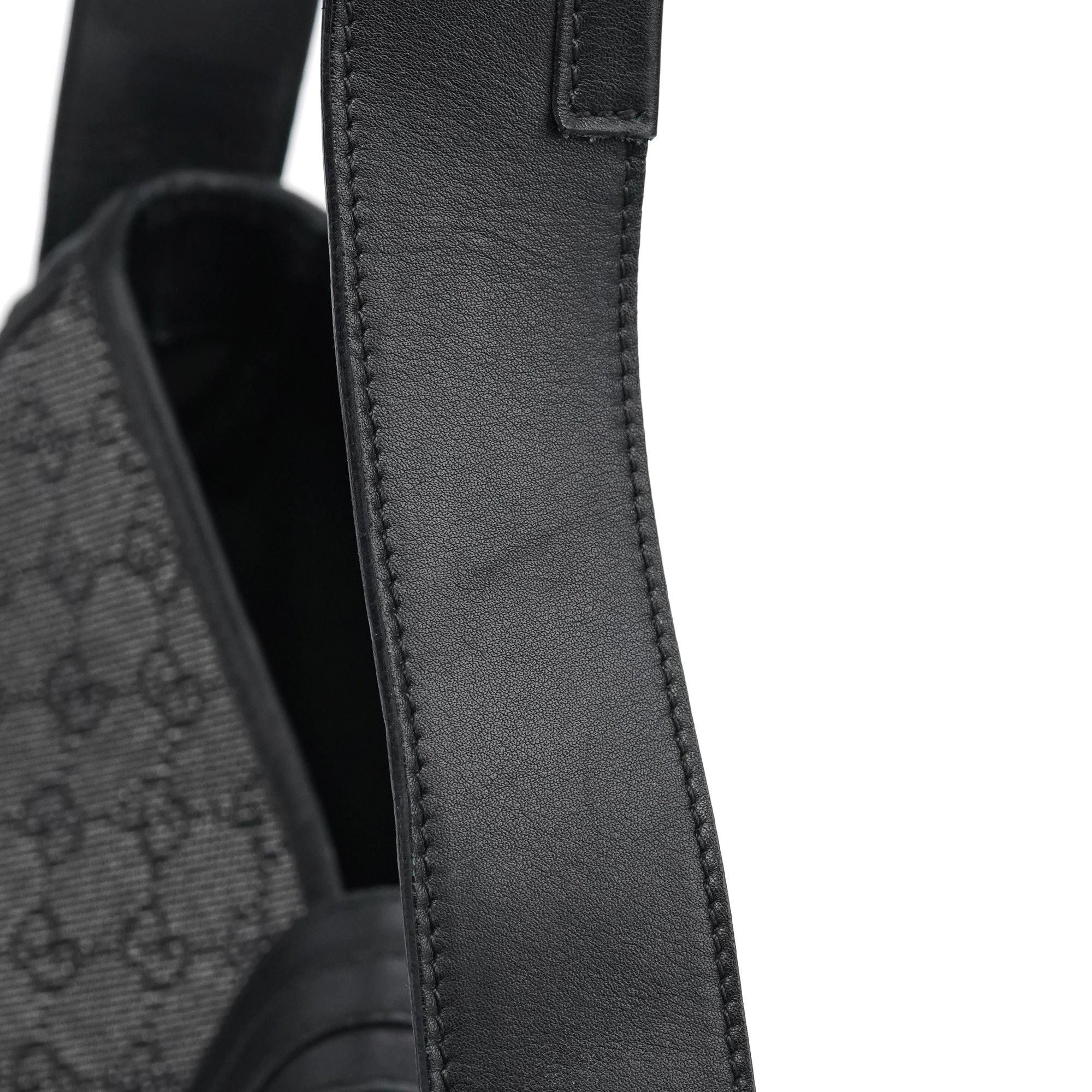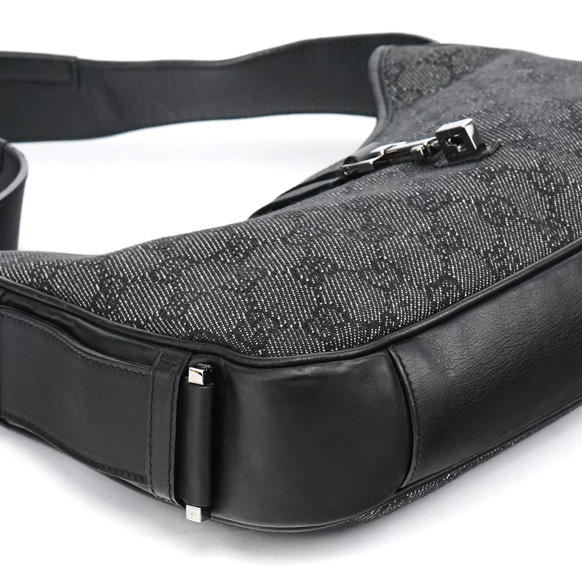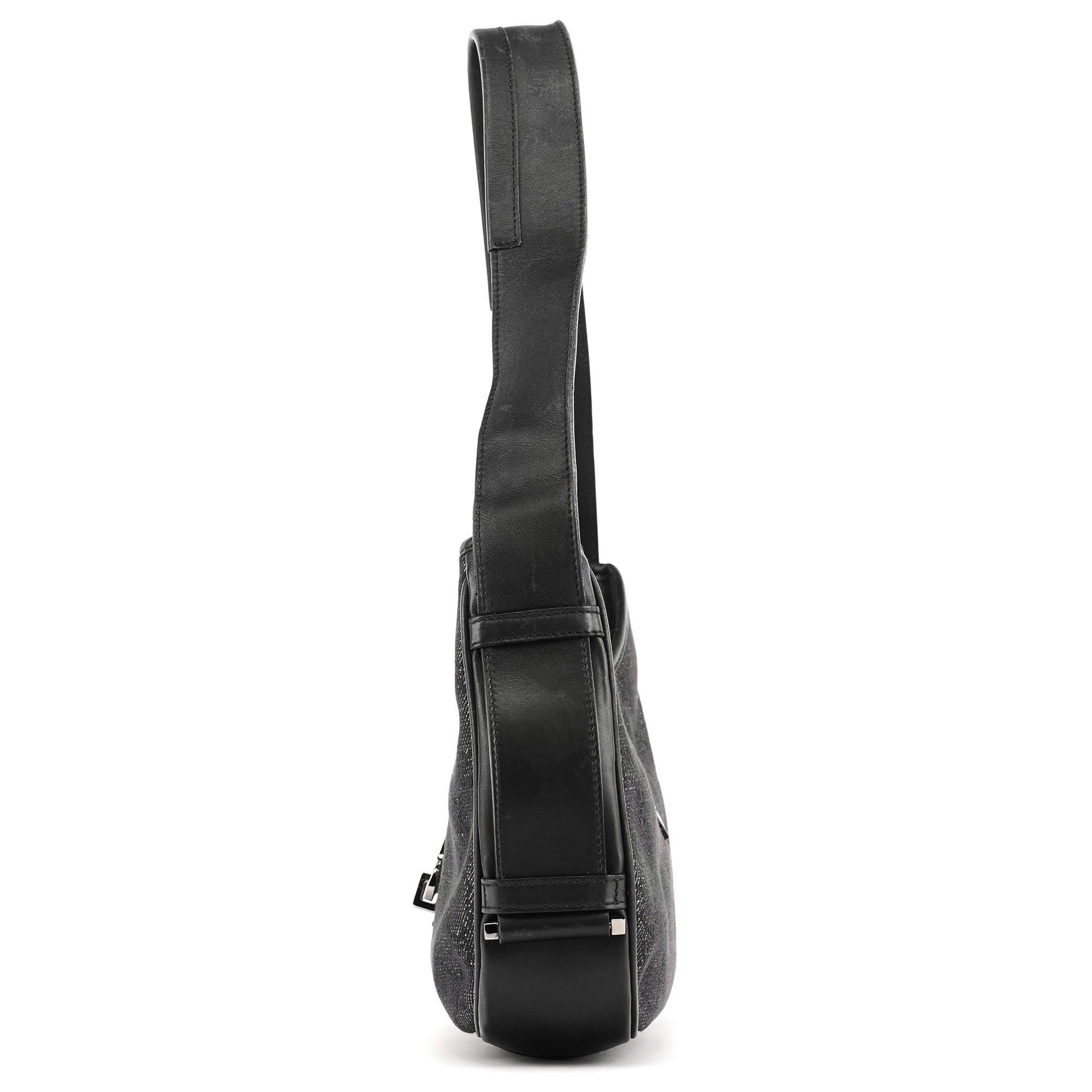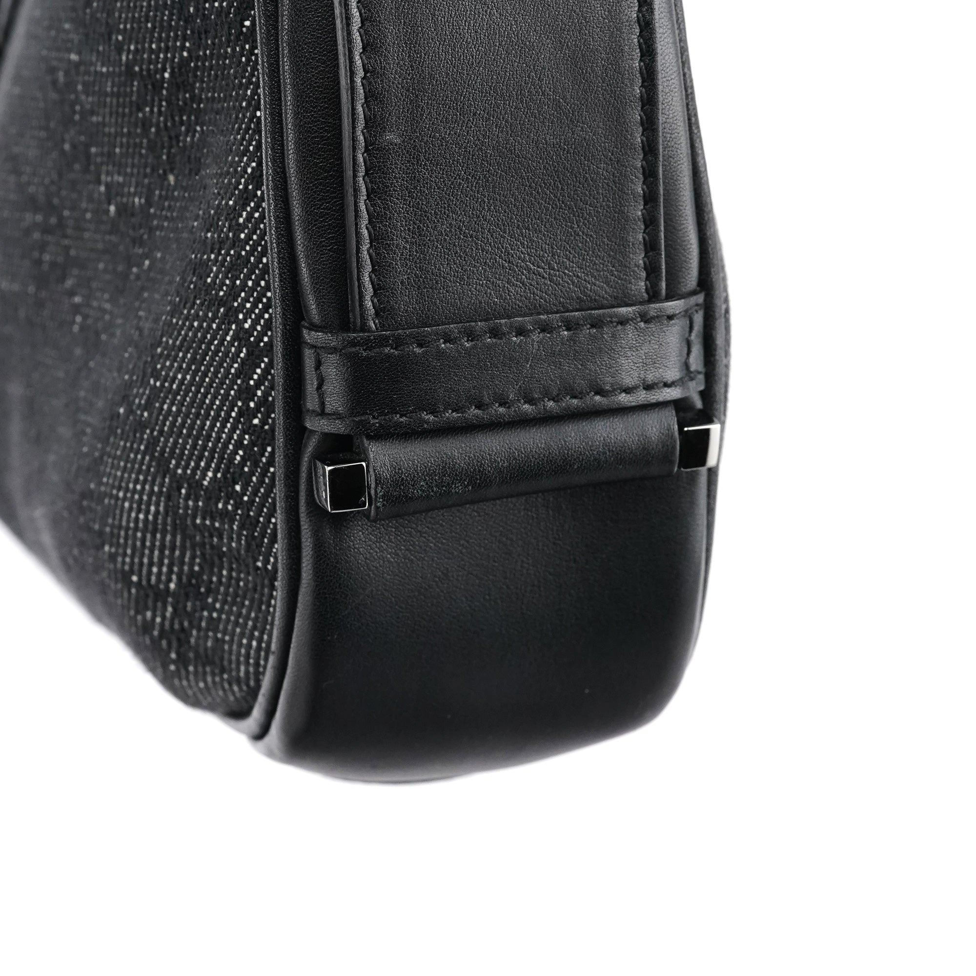 Designed in the early 2000s by Tom Ford, this Gucci Jackie features anthracite GG denim with black calf leather trim and a silver-tone piston clasp. The curved silhouette sits under the arm with a wide leather strap, and the interior includes a fabric lining with a zip pocket.