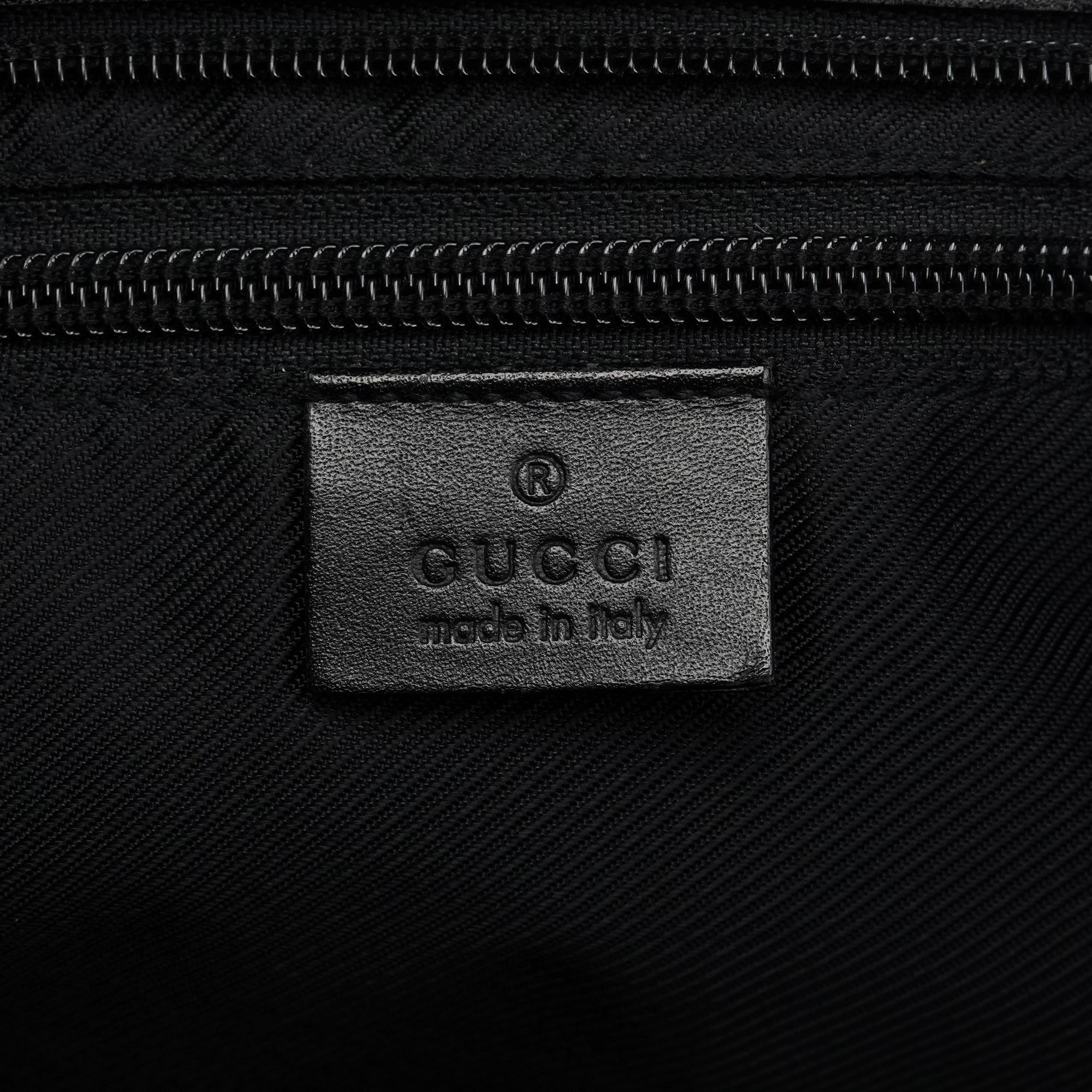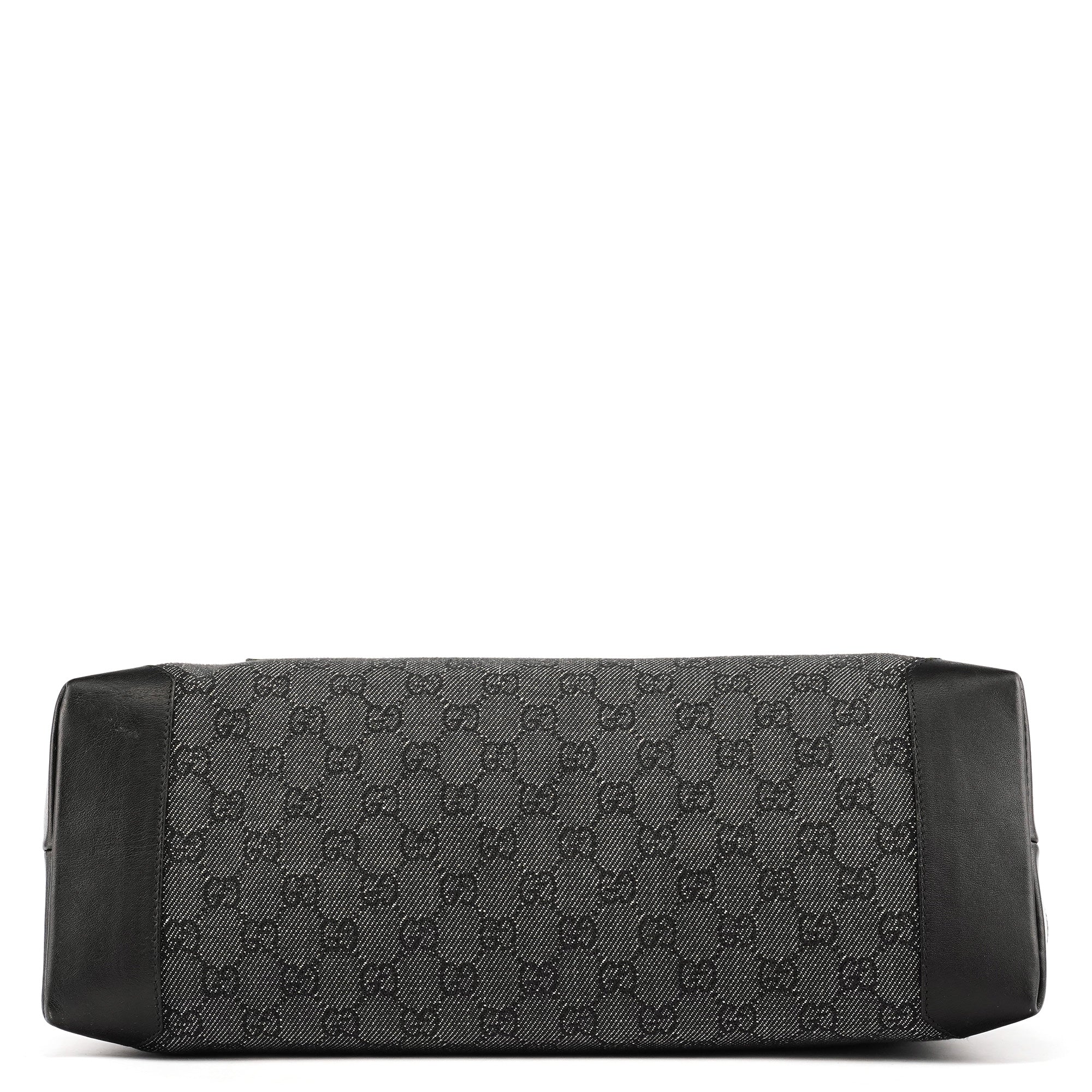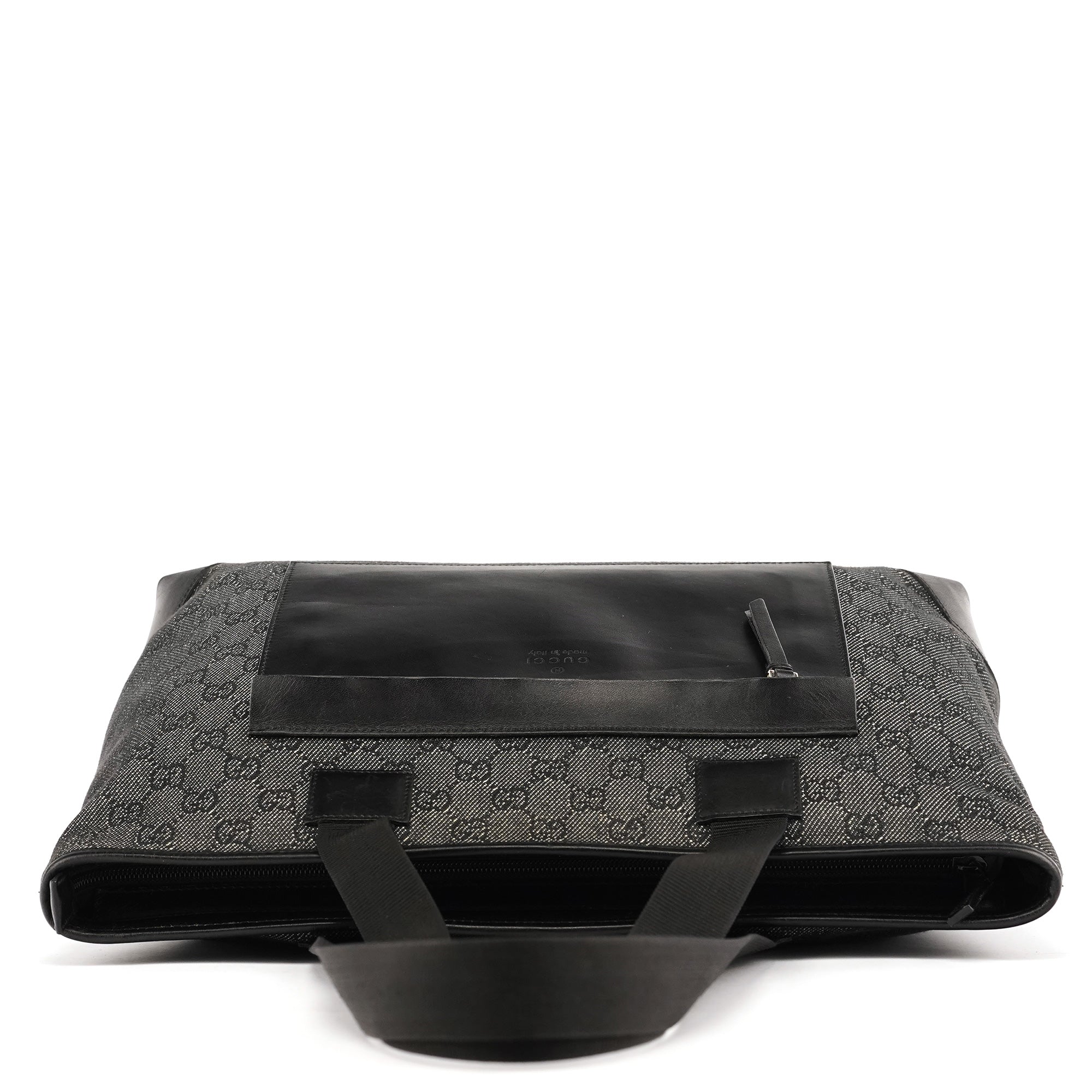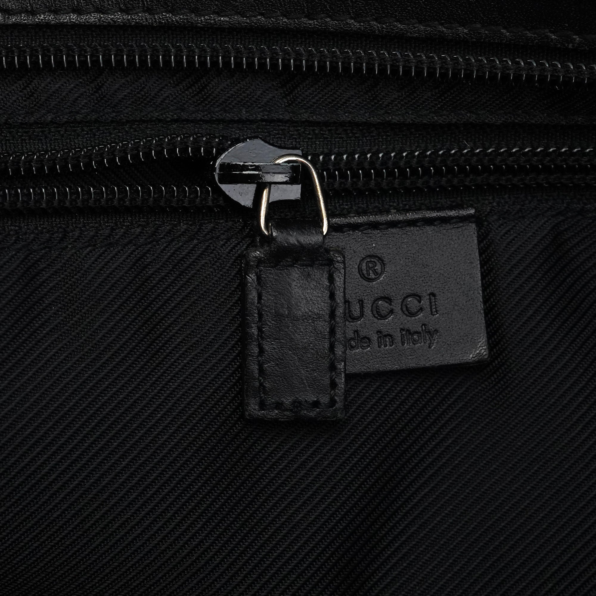 Designed in the late 1990s by Tom Ford for Gucci, this structured tote features black GG monogram canvas with glossy calfskin leather panels and silver-tone hardware. The design is finished with sturdy webbed shoulder straps, a large front zipped pocket, and a top zipper closure. The interior is lined in satin including zipper pocket.