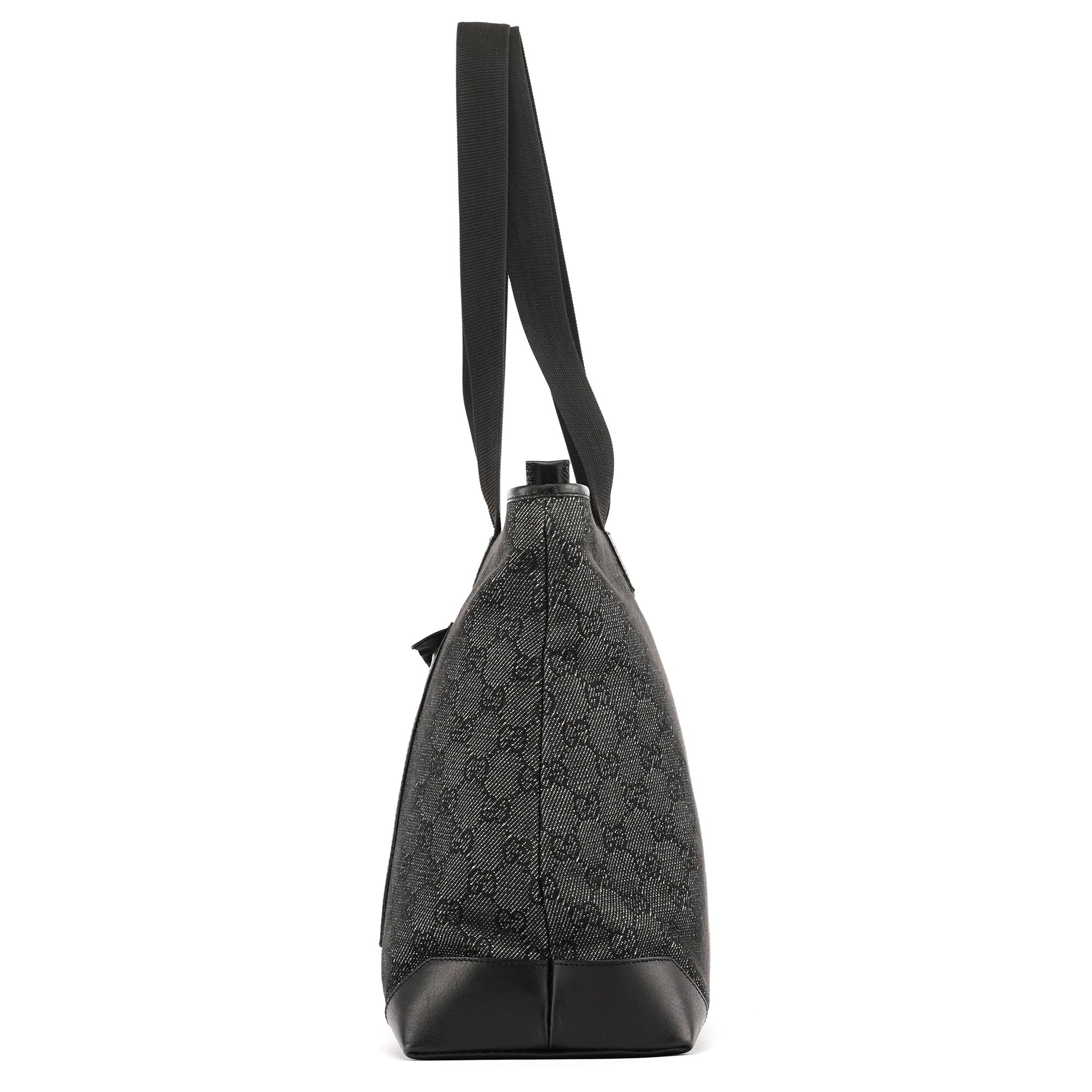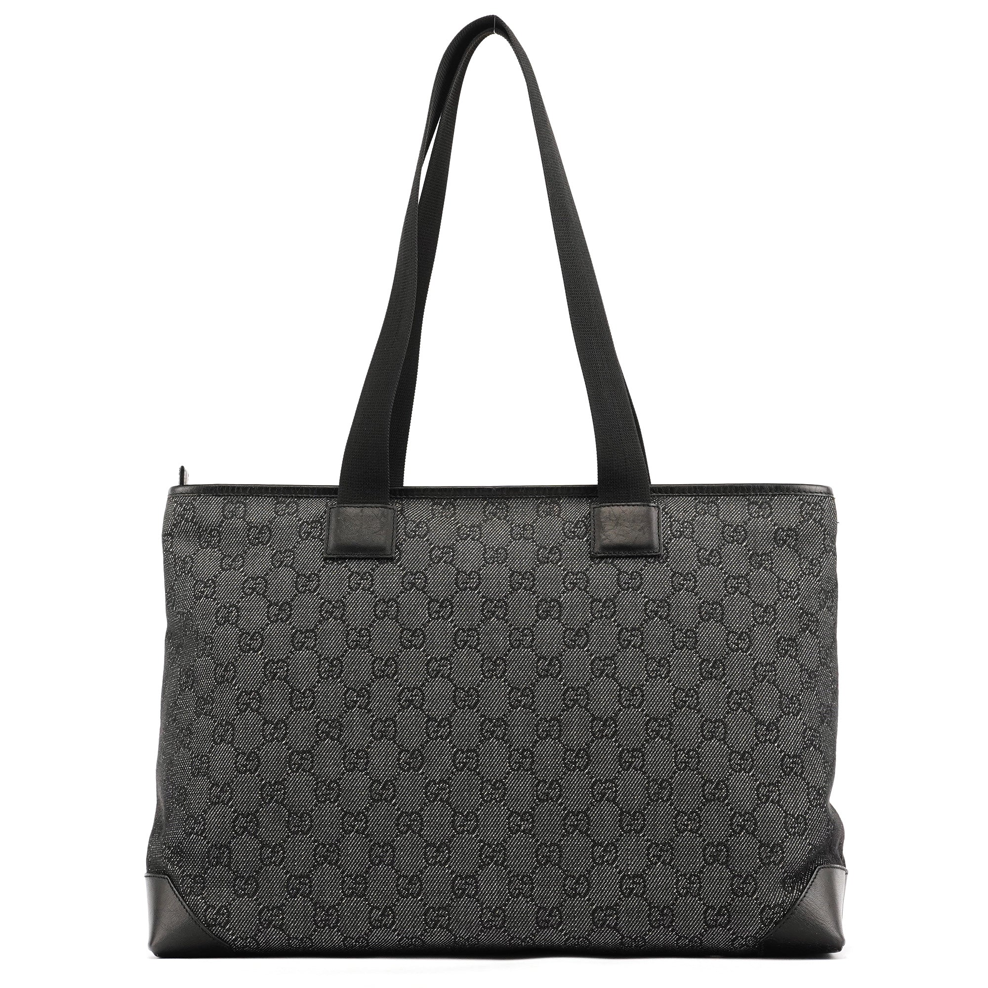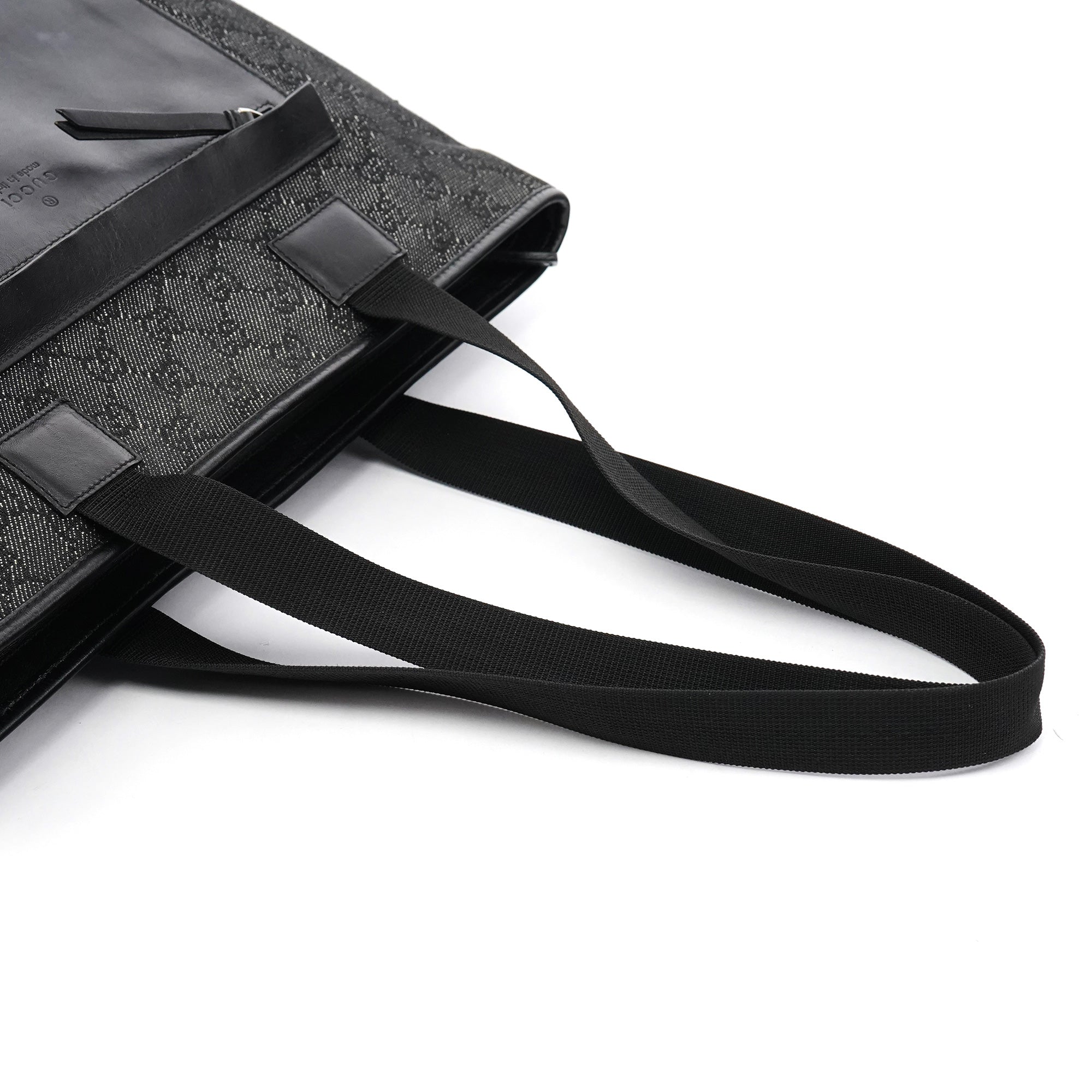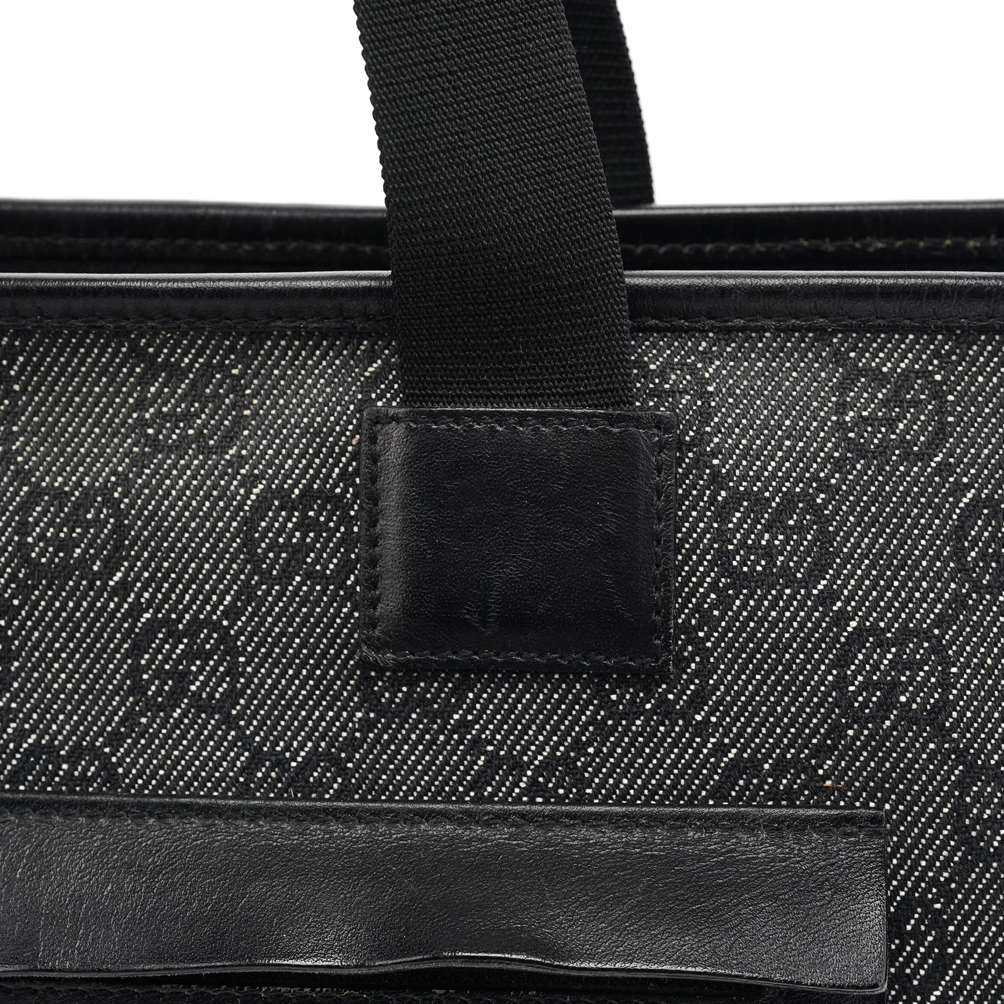 Designed in the late 1990s by Tom Ford for Gucci, this structured tote features black GG monogram canvas with glossy calfskin leather panels and silver-tone hardware. The design is finished with sturdy webbed shoulder straps, a large front zipped pocket, and a top zipper closure. The interior is lined in satin including zipper pocket.