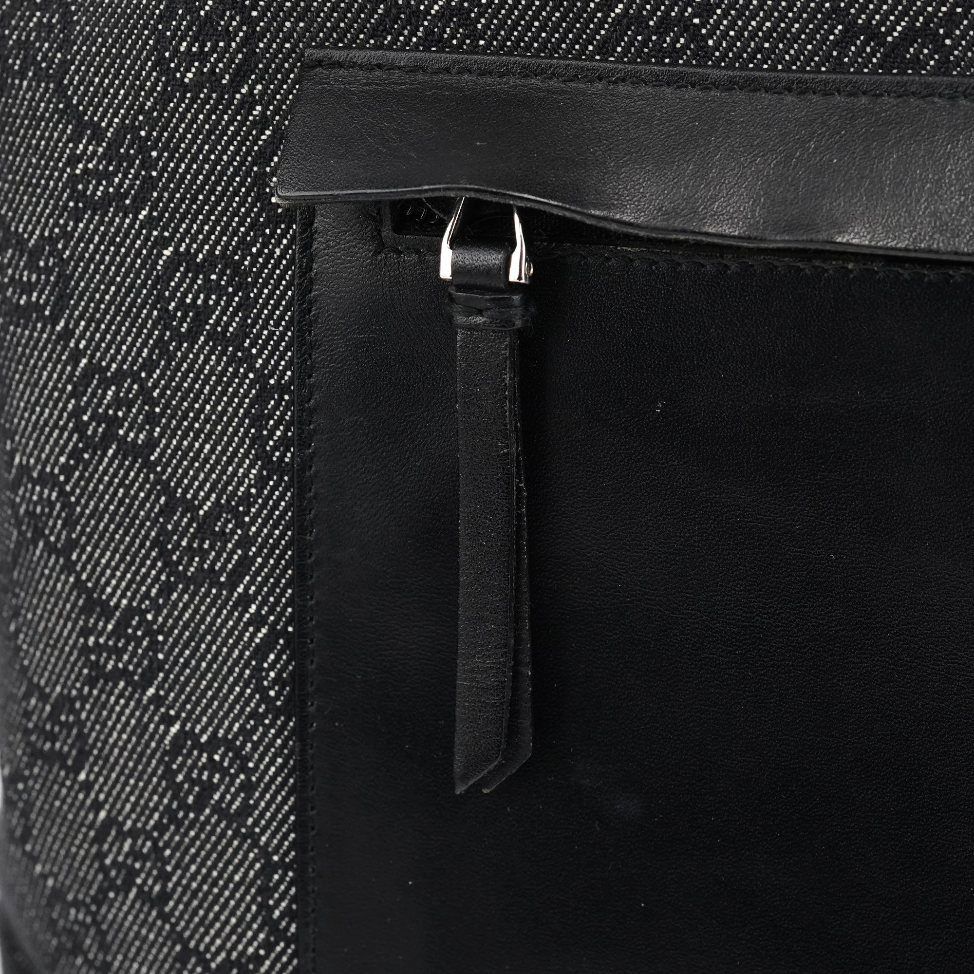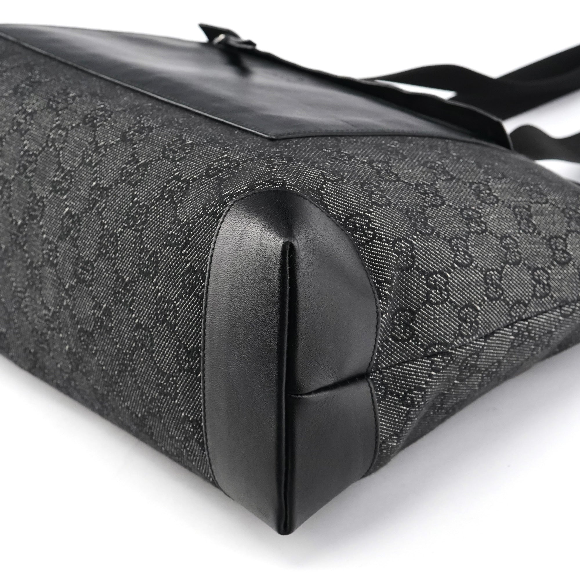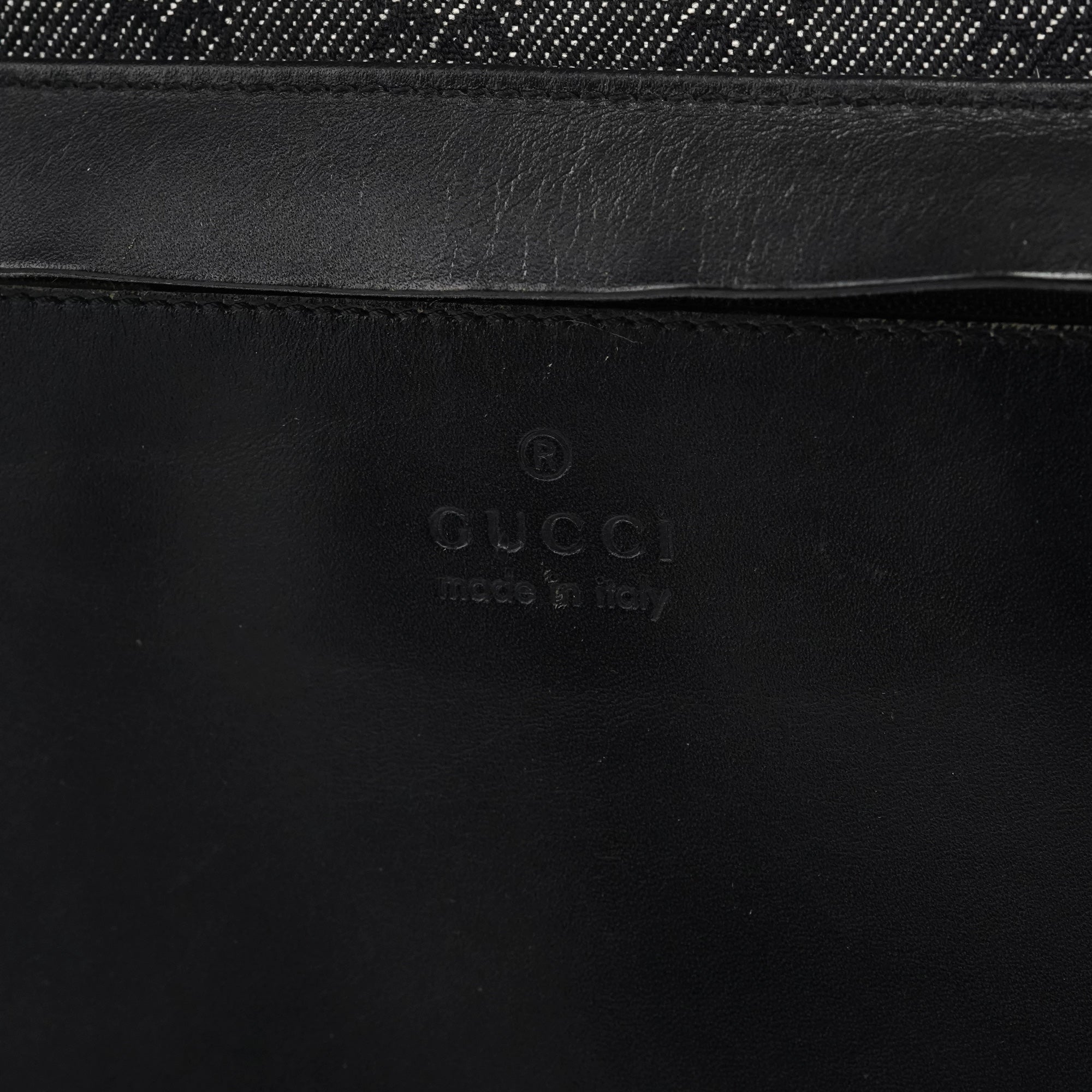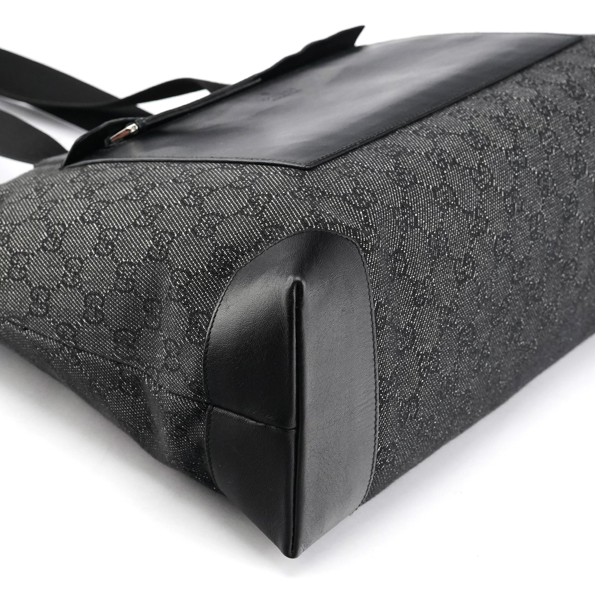Designed in the late 1990s by Tom Ford for Gucci, this structured tote features black GG monogram canvas with glossy calfskin leather panels and silver-tone hardware. The design is finished with sturdy webbed shoulder straps, a large front zipped pocket, and a top zipper closure. The interior is lined in satin including zipper pocket.