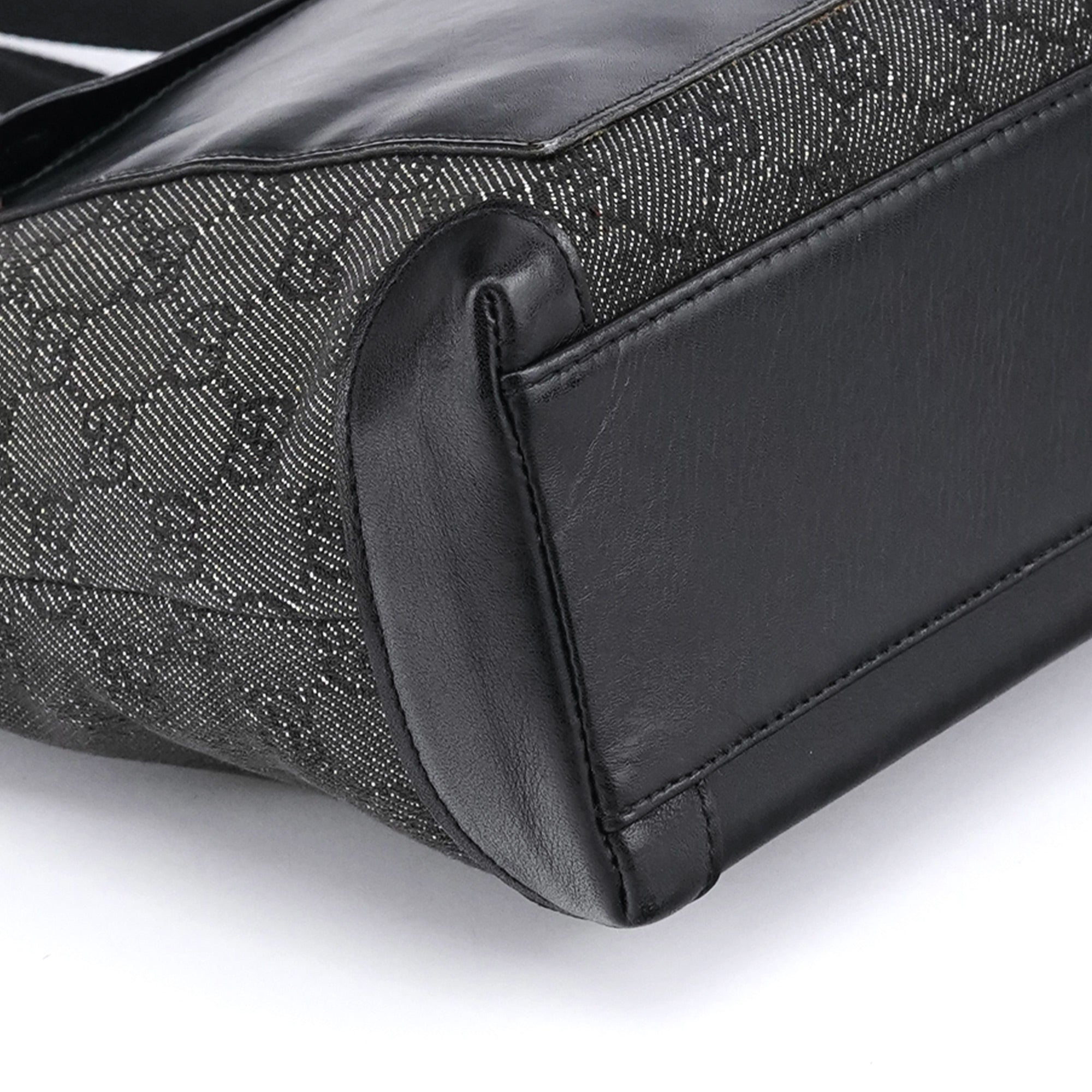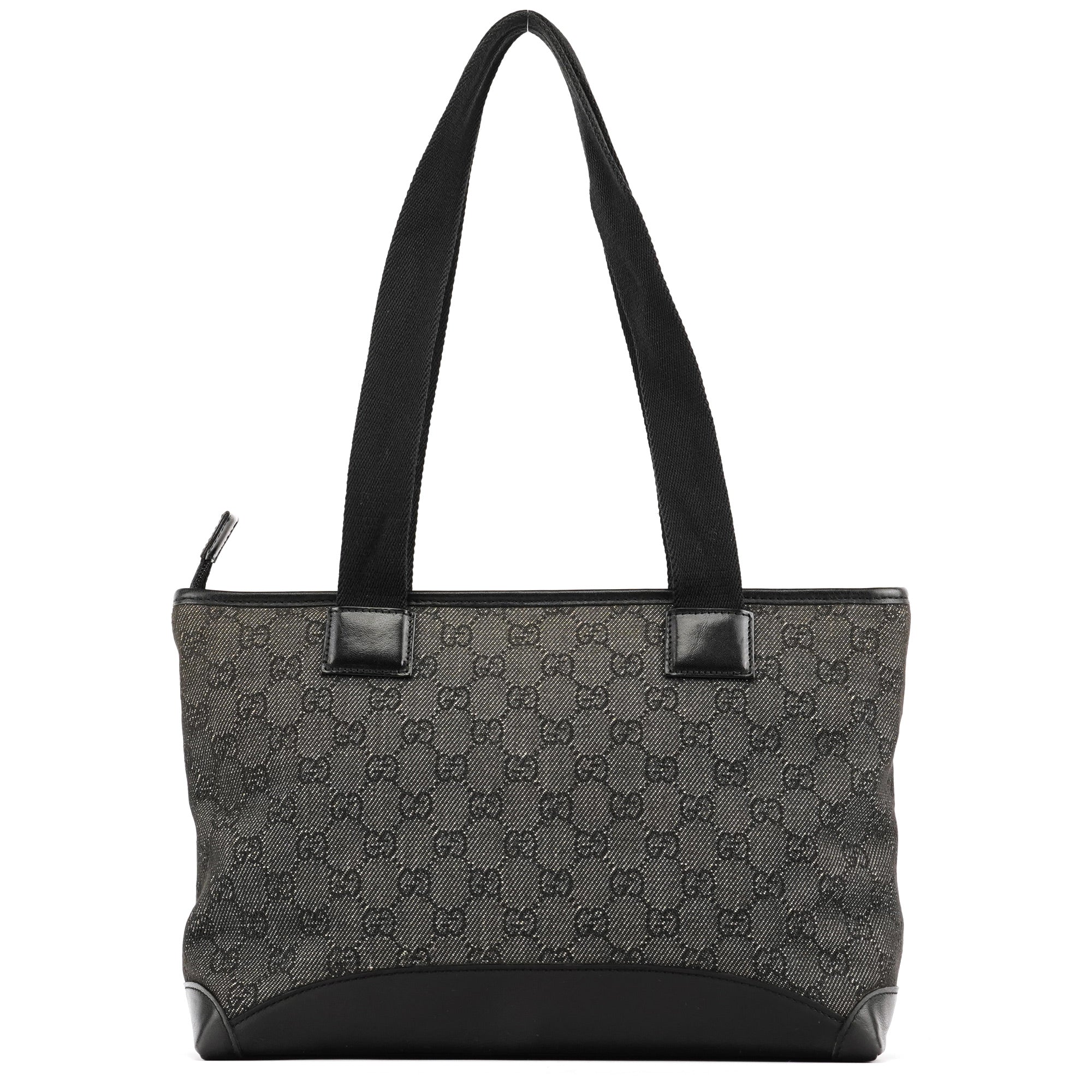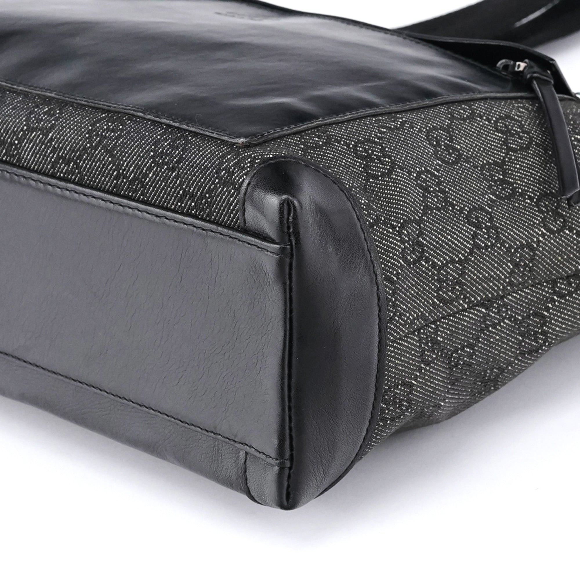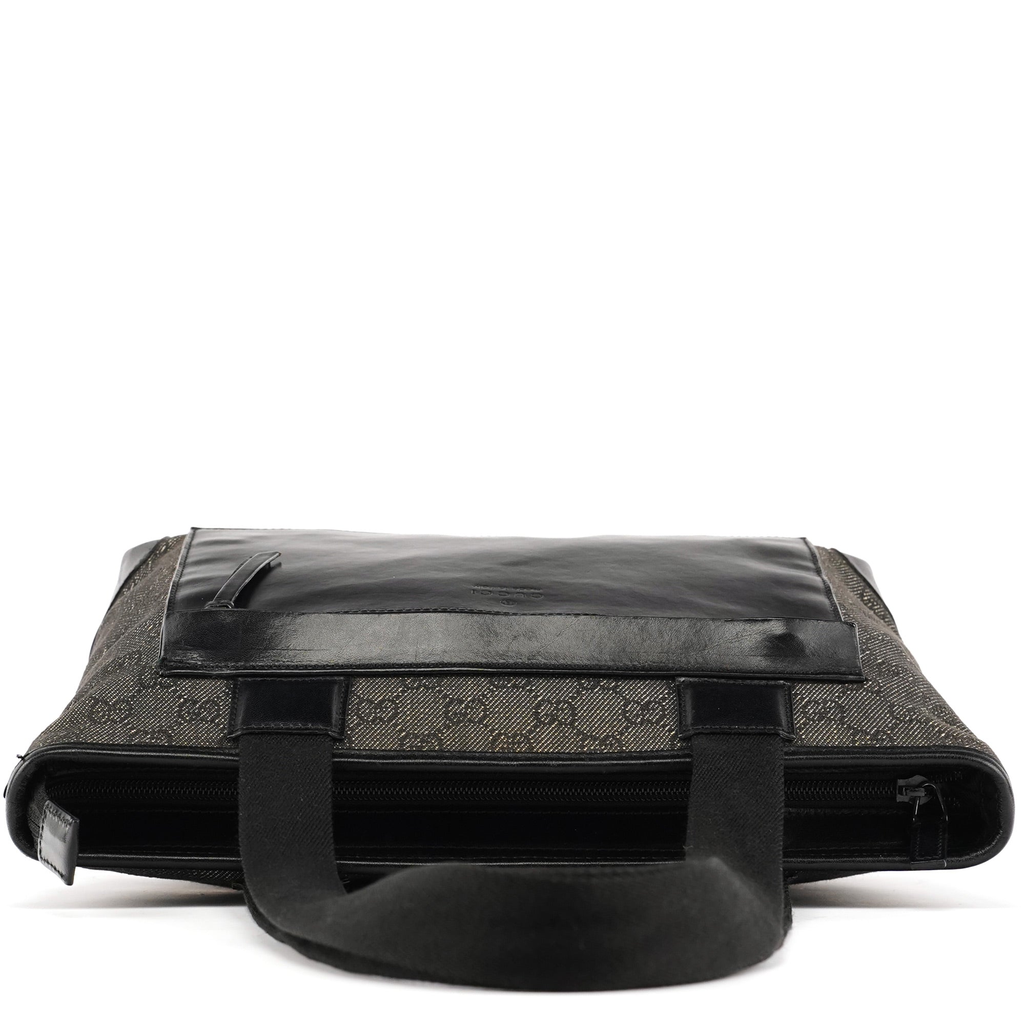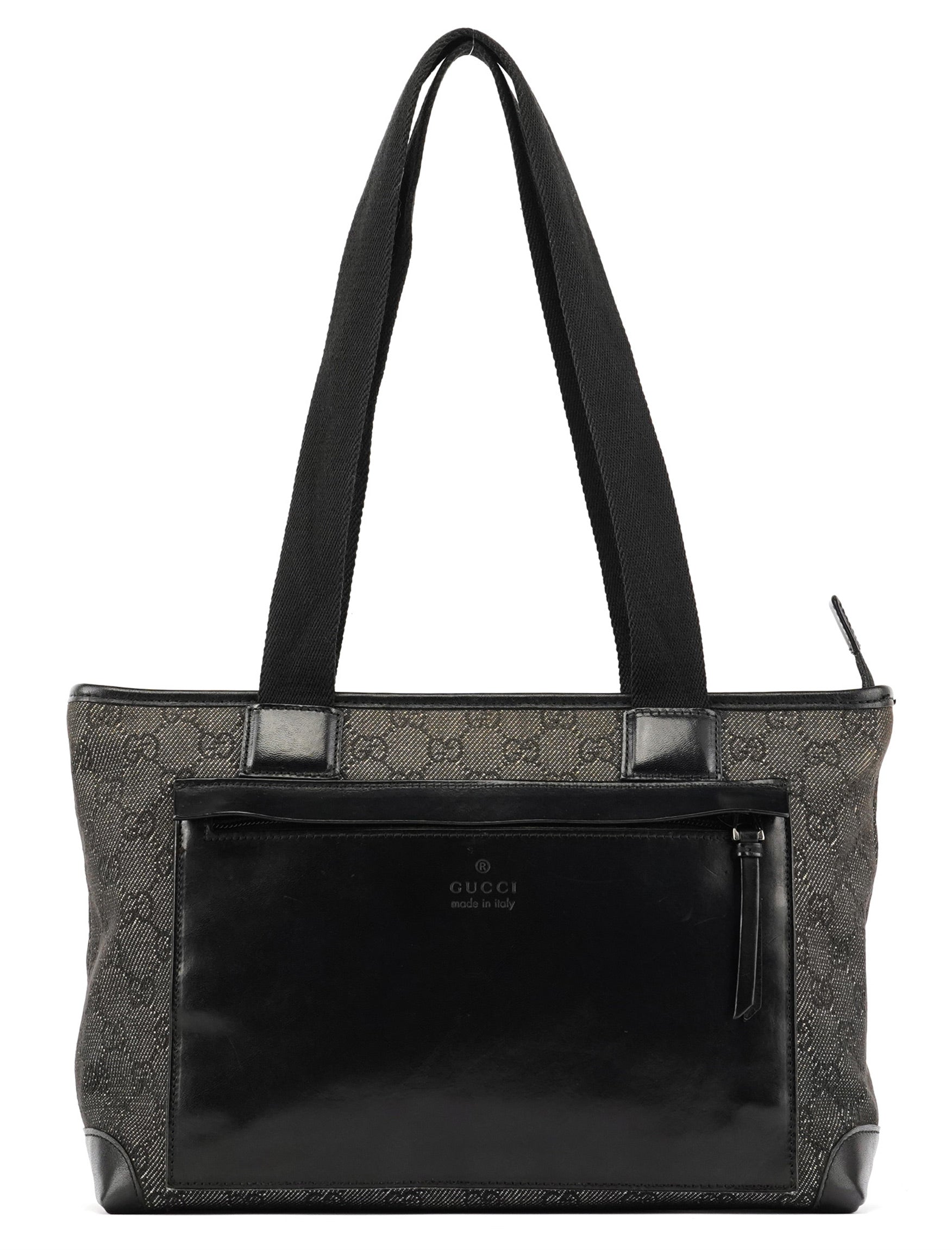 Designed in the late 1990s by Tom Ford for Gucci, this structured tote features black GG monogram canvas with glossy calfskin leather panels and silver-tone hardware. The design is finished with sturdy webbed shoulder straps, a large front zipped pocket, and a top zipper closure. The interior is lined in satin including zipper pocket.