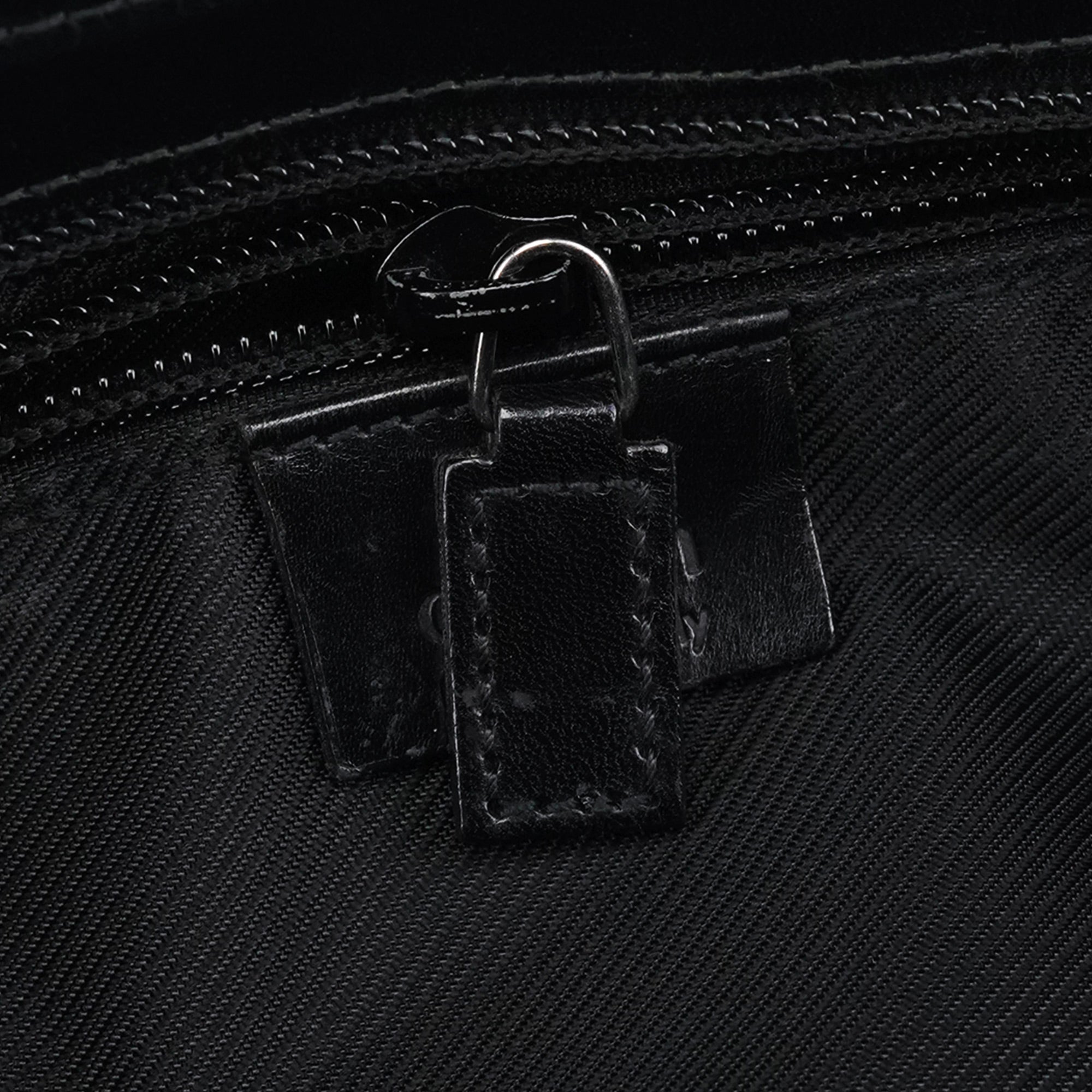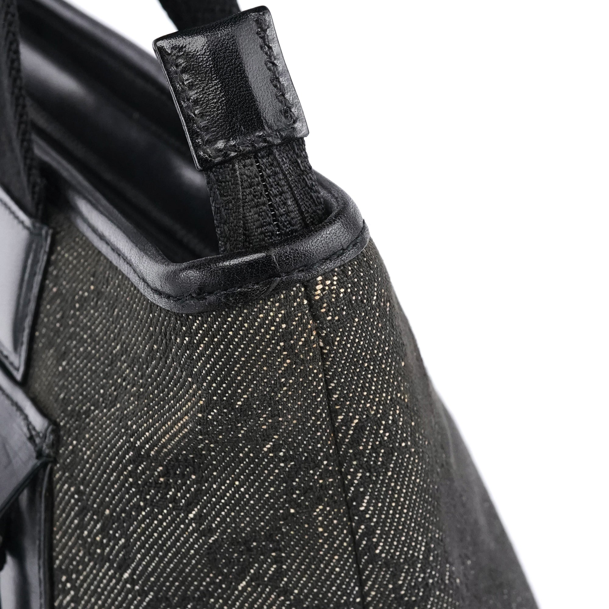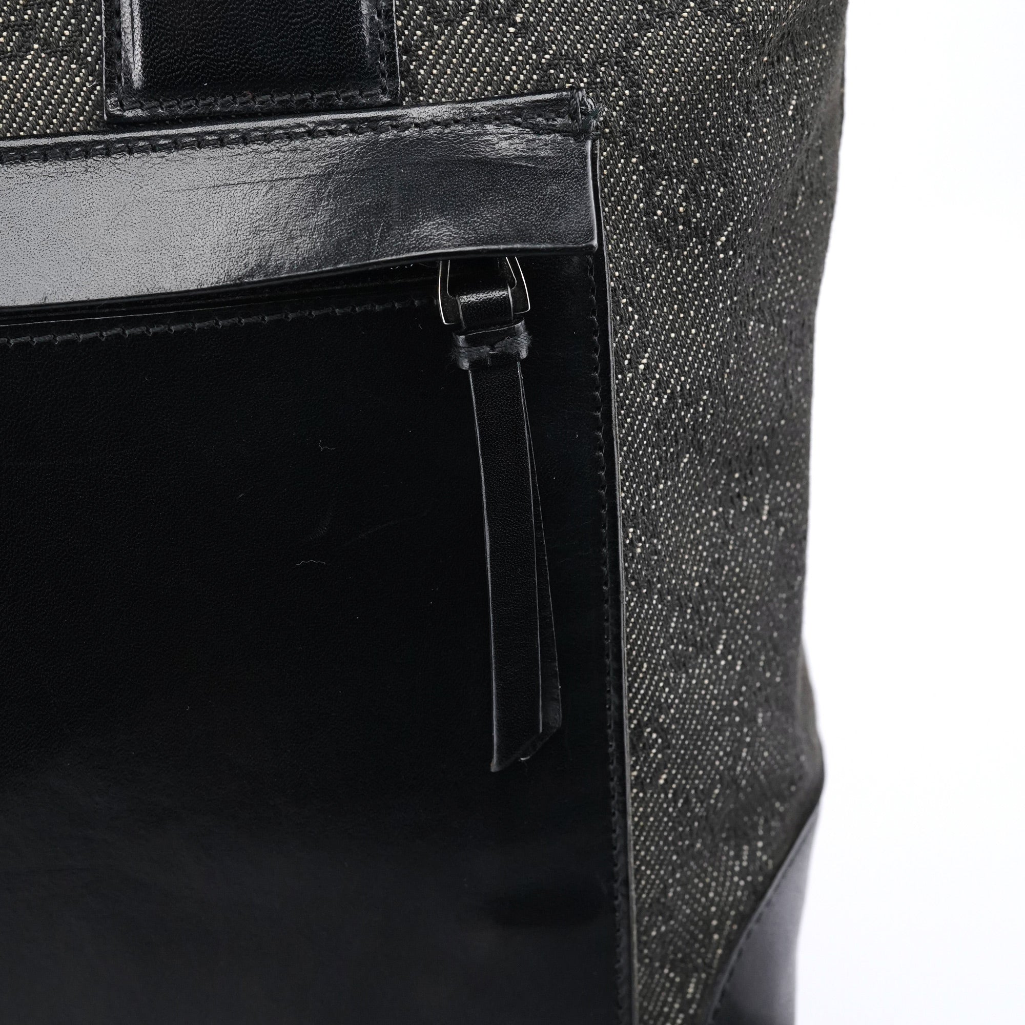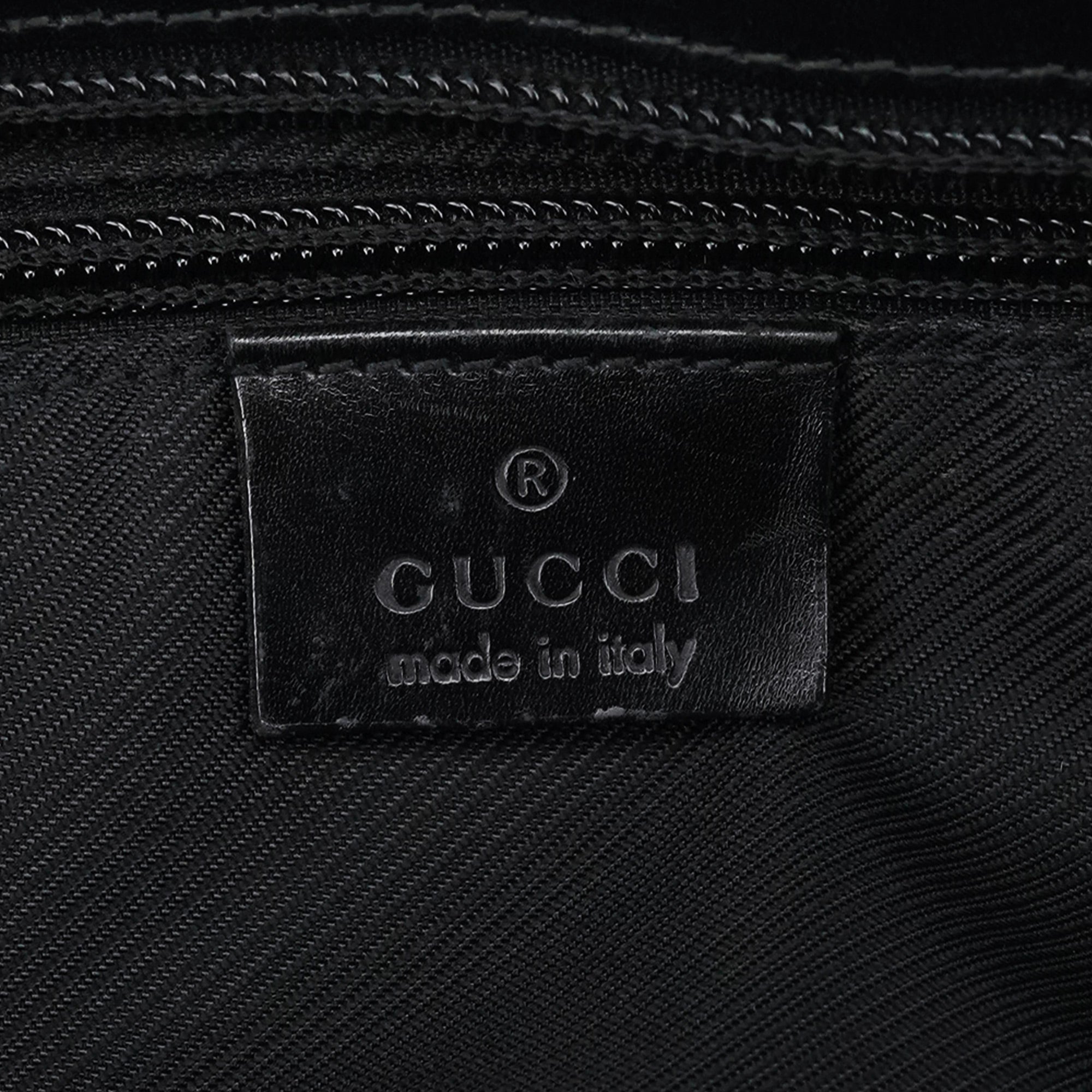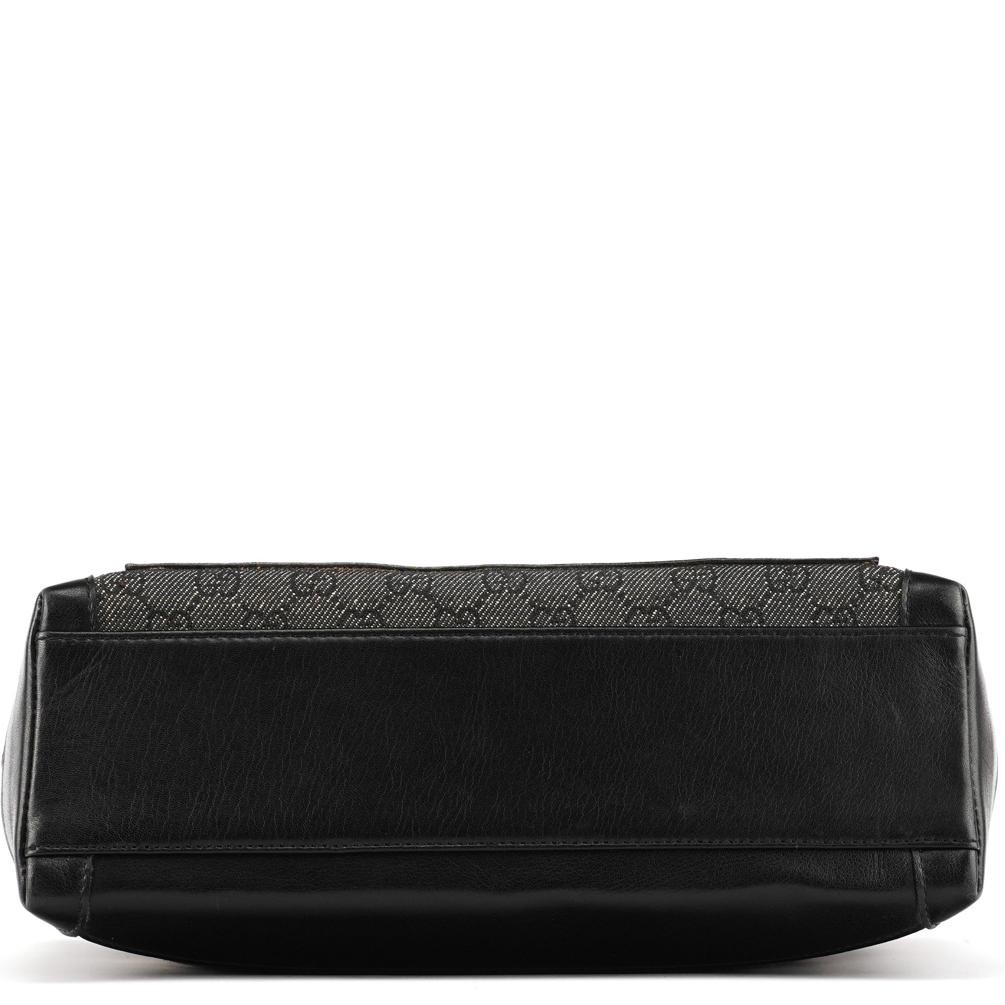 Designed in the late 1990s by Tom Ford for Gucci, this structured tote features black GG monogram canvas with glossy calfskin leather panels and silver-tone hardware. The design is finished with sturdy webbed shoulder straps, a large front zipped pocket, and a top zipper closure. The interior is lined in satin including zipper pocket.