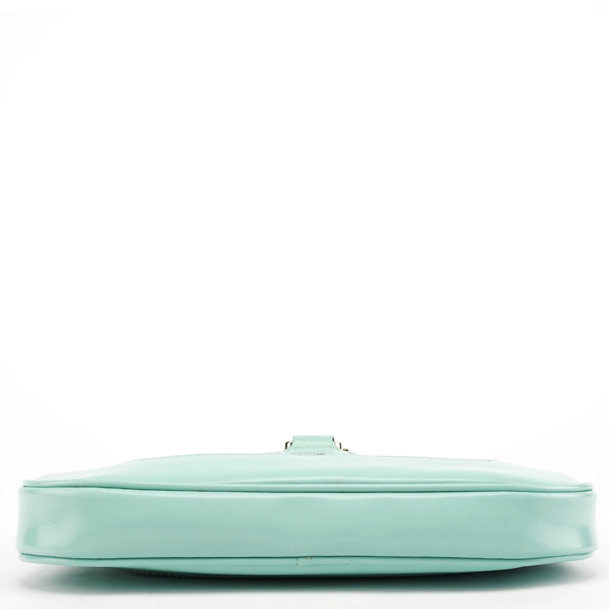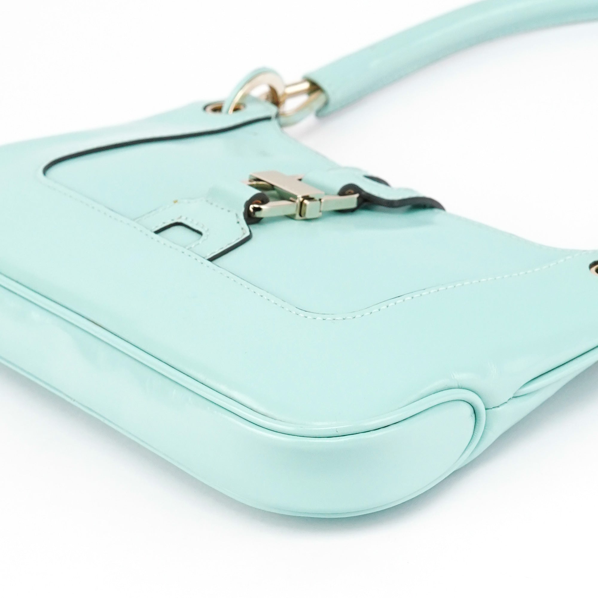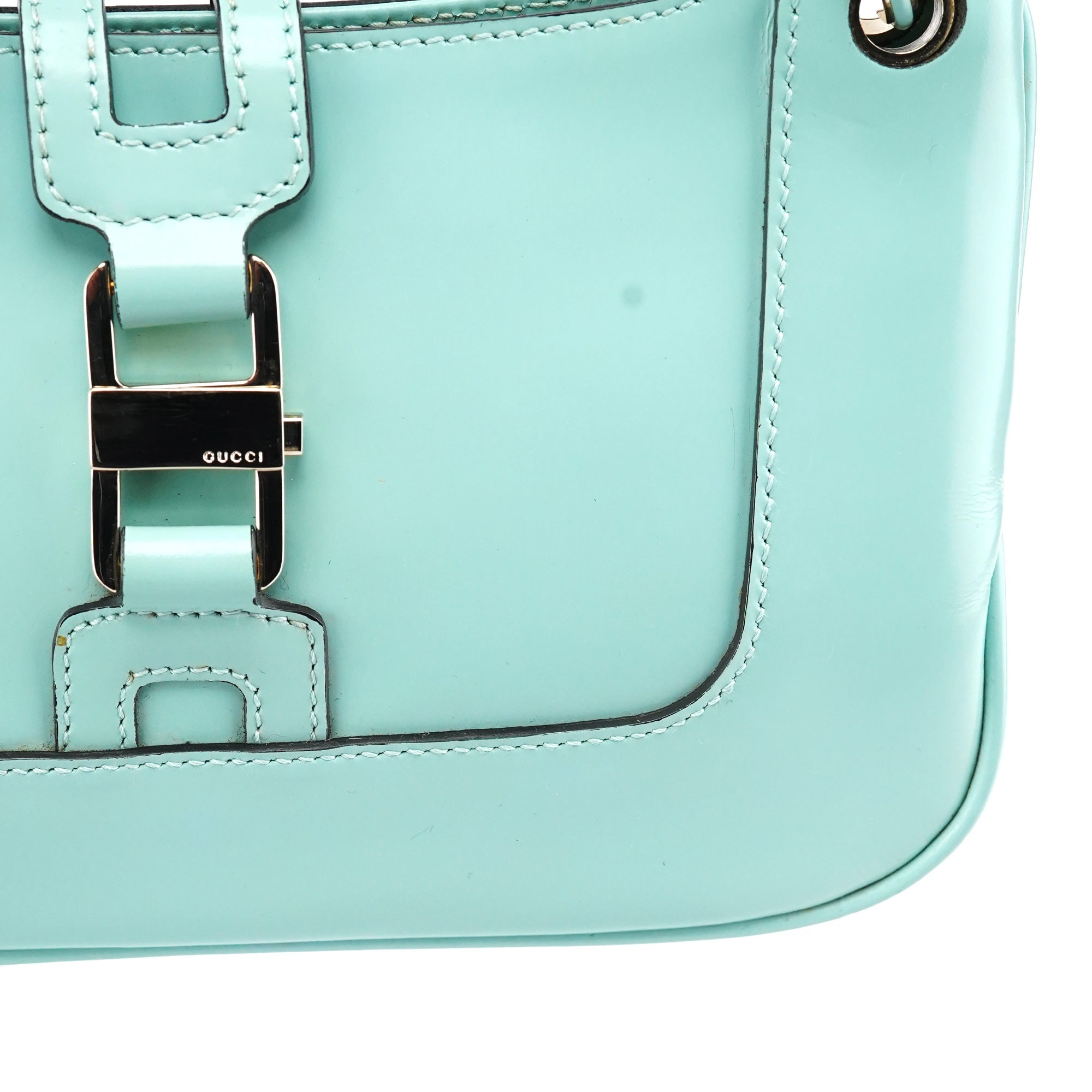 Designed in the early 2000s by Tom Ford, this Gucci Jackie shoulder bag is crafted from baby blue patent leather with gold hardware. The design features the signature piston closure at the front and a curved handle with rounded metal rings, creating a sleek and feminine silhouette.