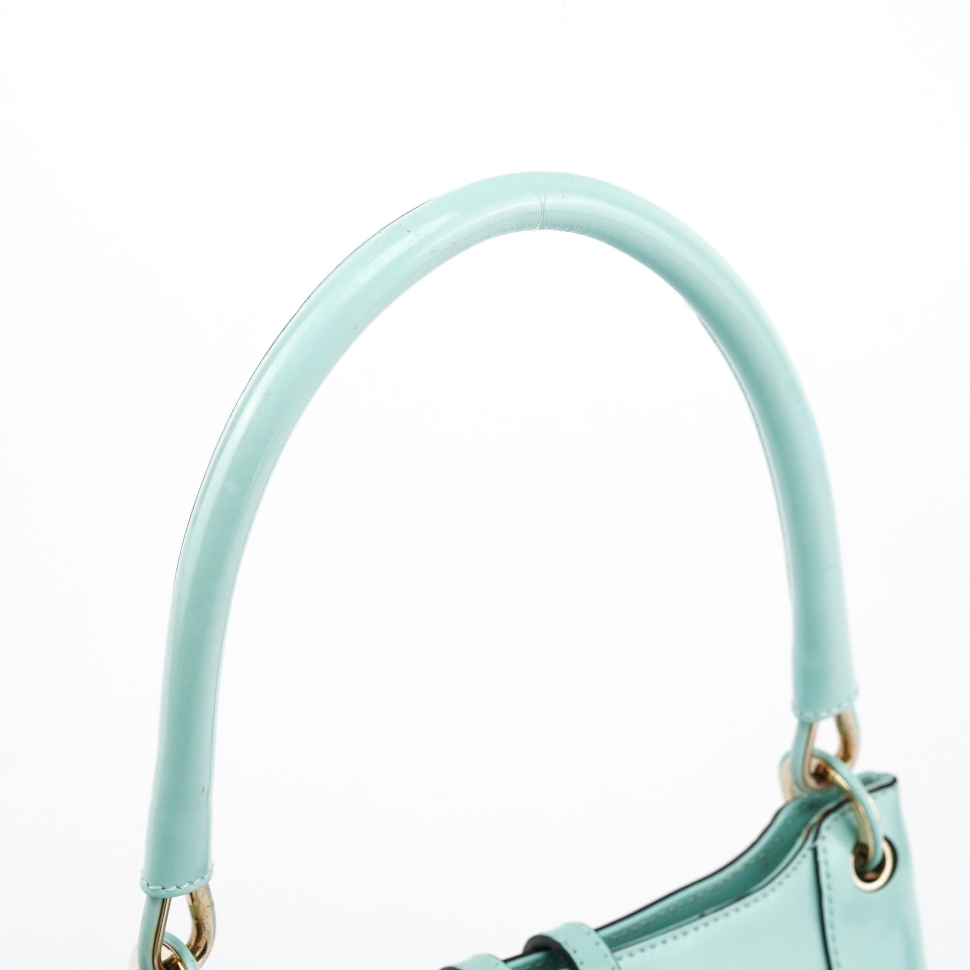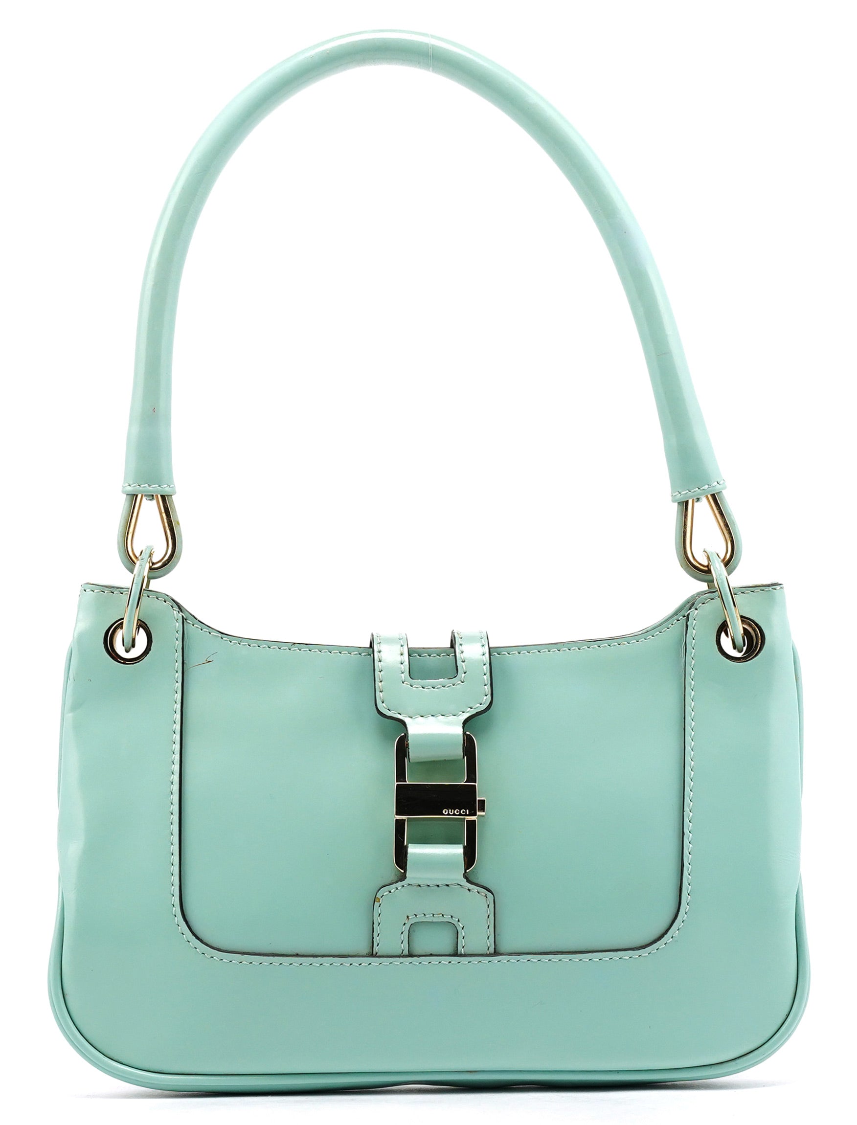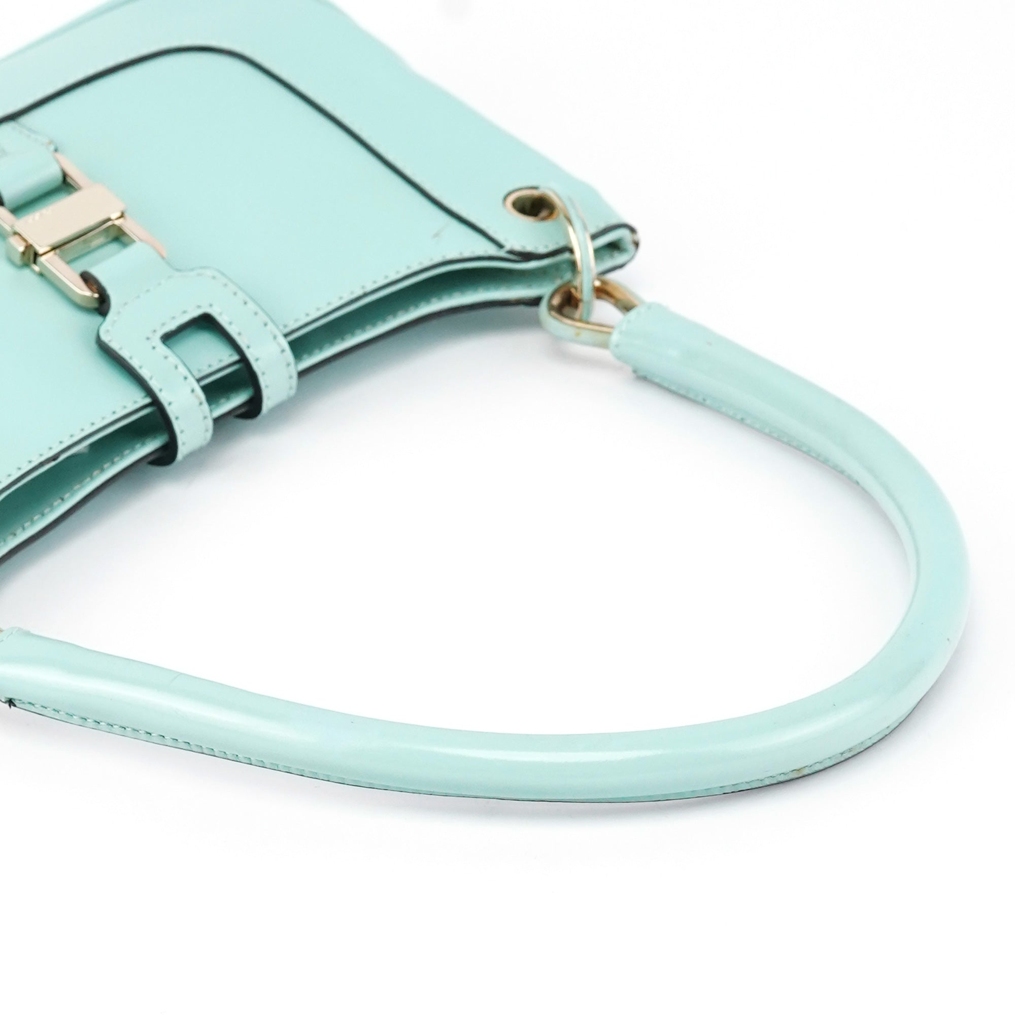 Designed in the early 2000s by Tom Ford, this Gucci Jackie shoulder bag is crafted from baby blue patent leather with gold hardware. The design features the signature piston closure at the front and a curved handle with rounded metal rings, creating a sleek and feminine silhouette.