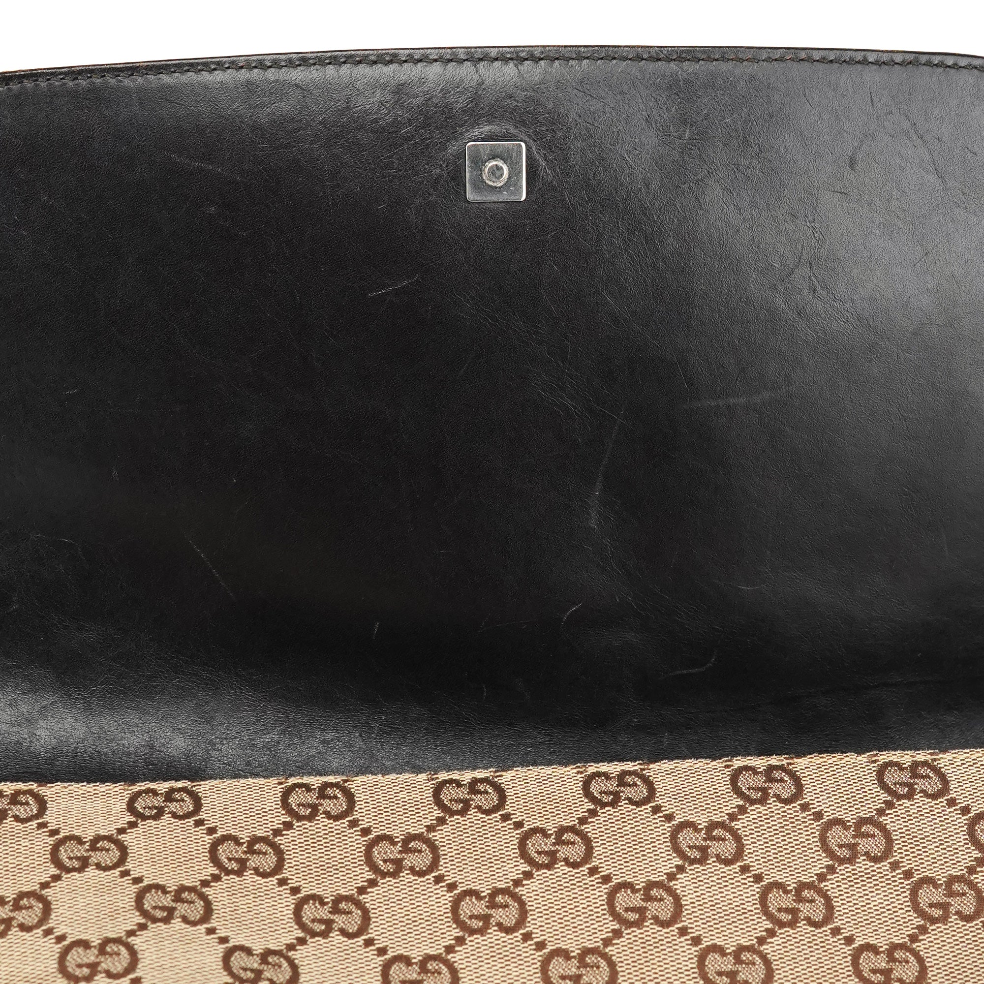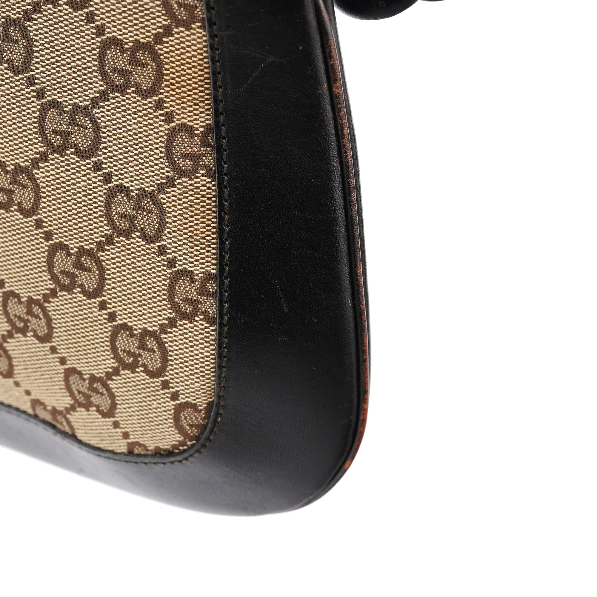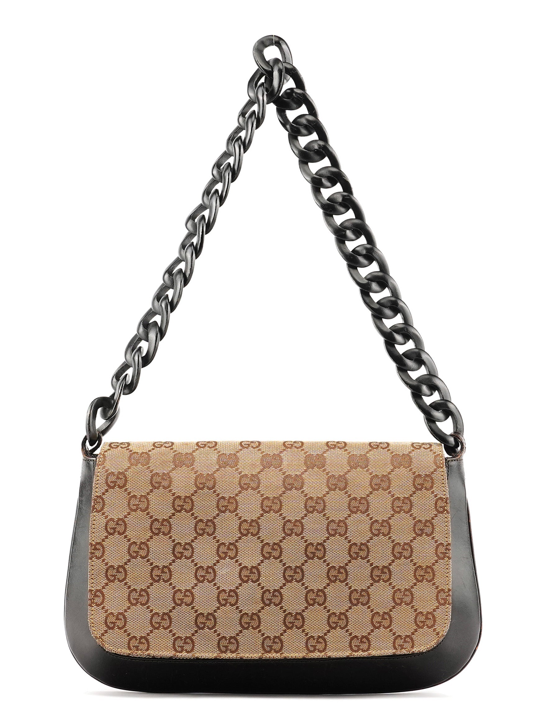 Designed by Tom Ford in the early 2000s, this rare Gucci GG Chain bag is handcrafted from beige GG monogram canvas with smooth brown leather trim. Its standout feature is the sculptural wood chain handle—a bold detail unique to this limited design. The flap opens to a satin-lined interior with a slip pocket, blending iconic branding with striking craftsmanship.
