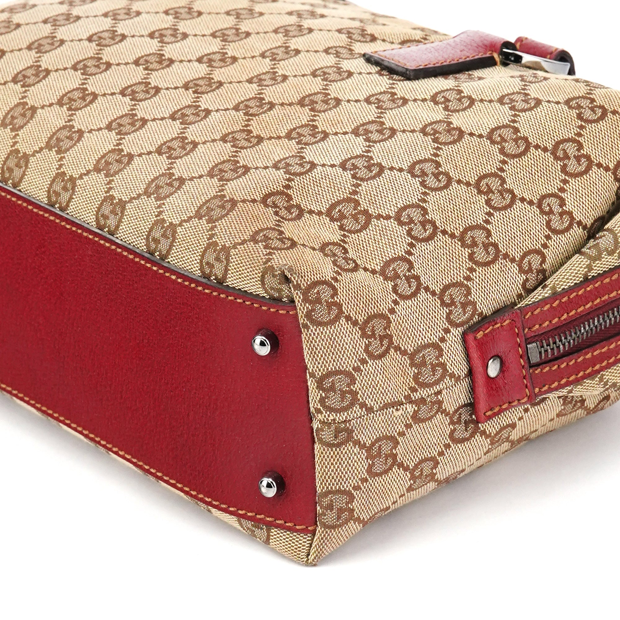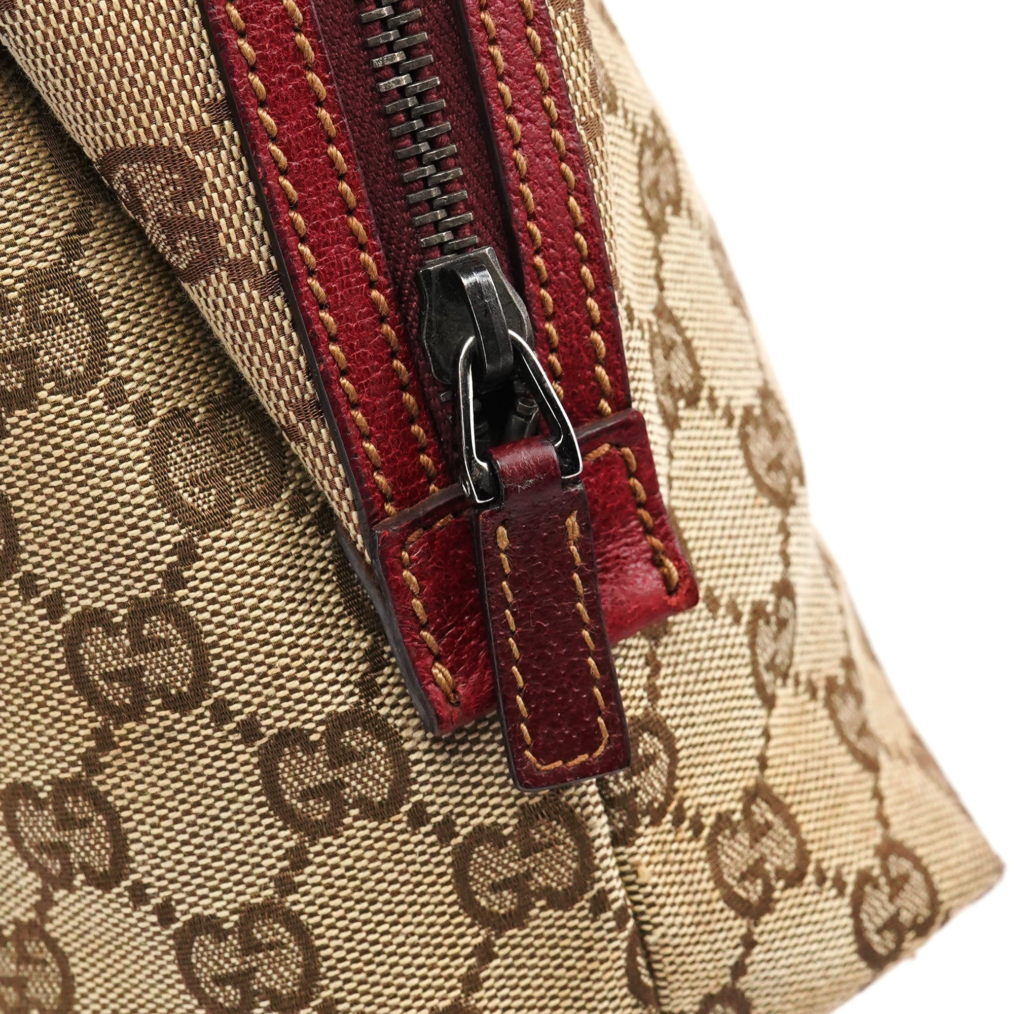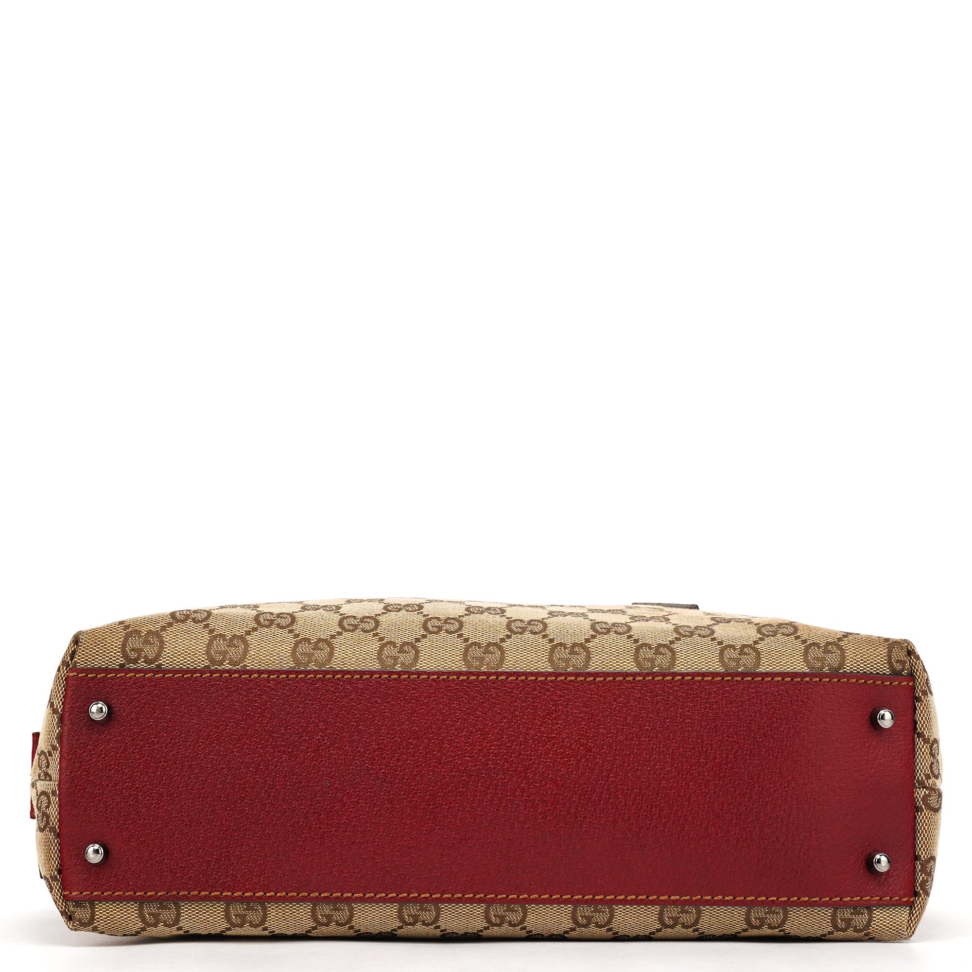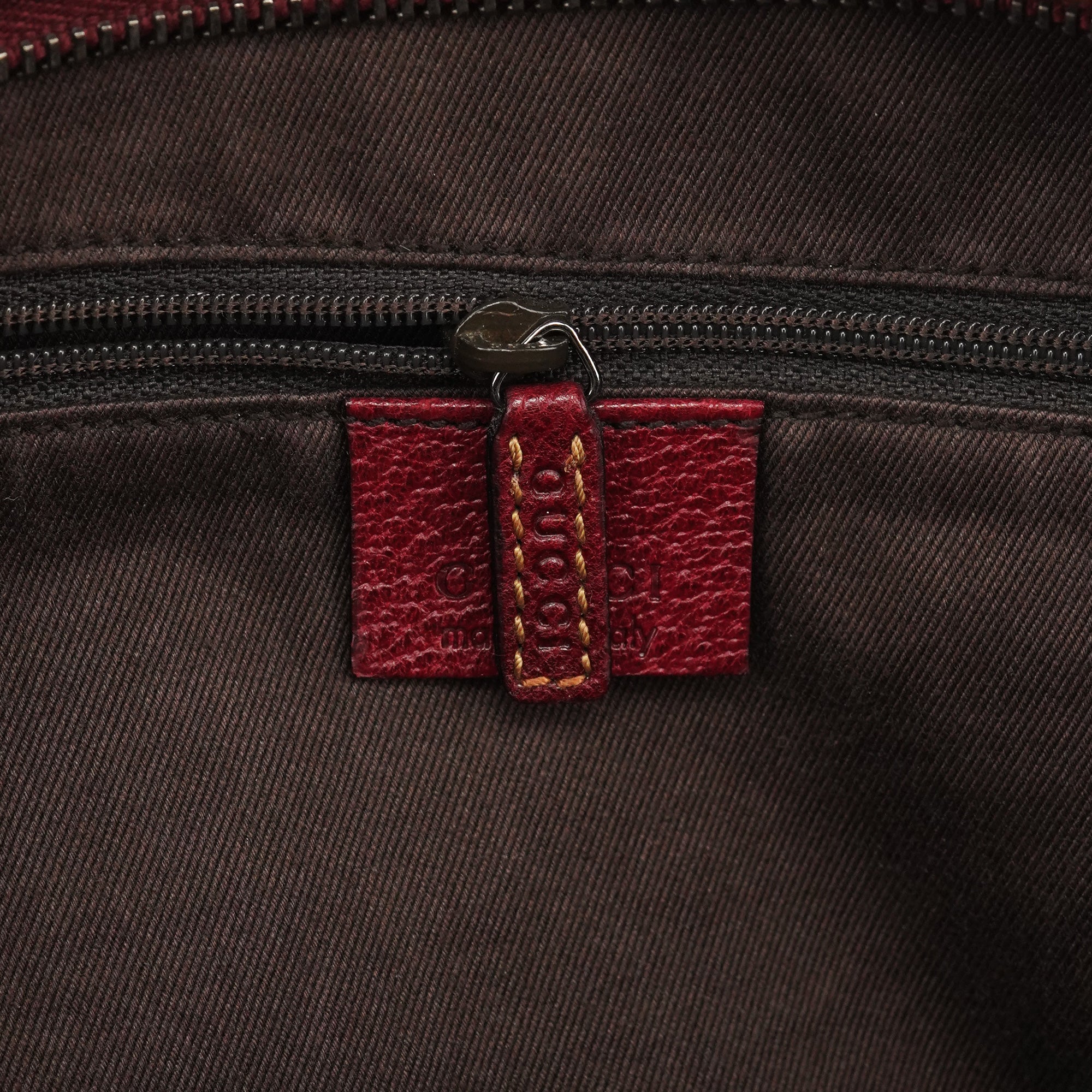 Designed in the early 2000s by Tom Ford, this Gucci tote bag is crafted in beige GG canvas with contrasting burgundy leather trim. The structured silhouette features rounded top handles with ring hardware and a full top-zip closure. The interior is lined in dark fabric with a zipped pocket for essentials.