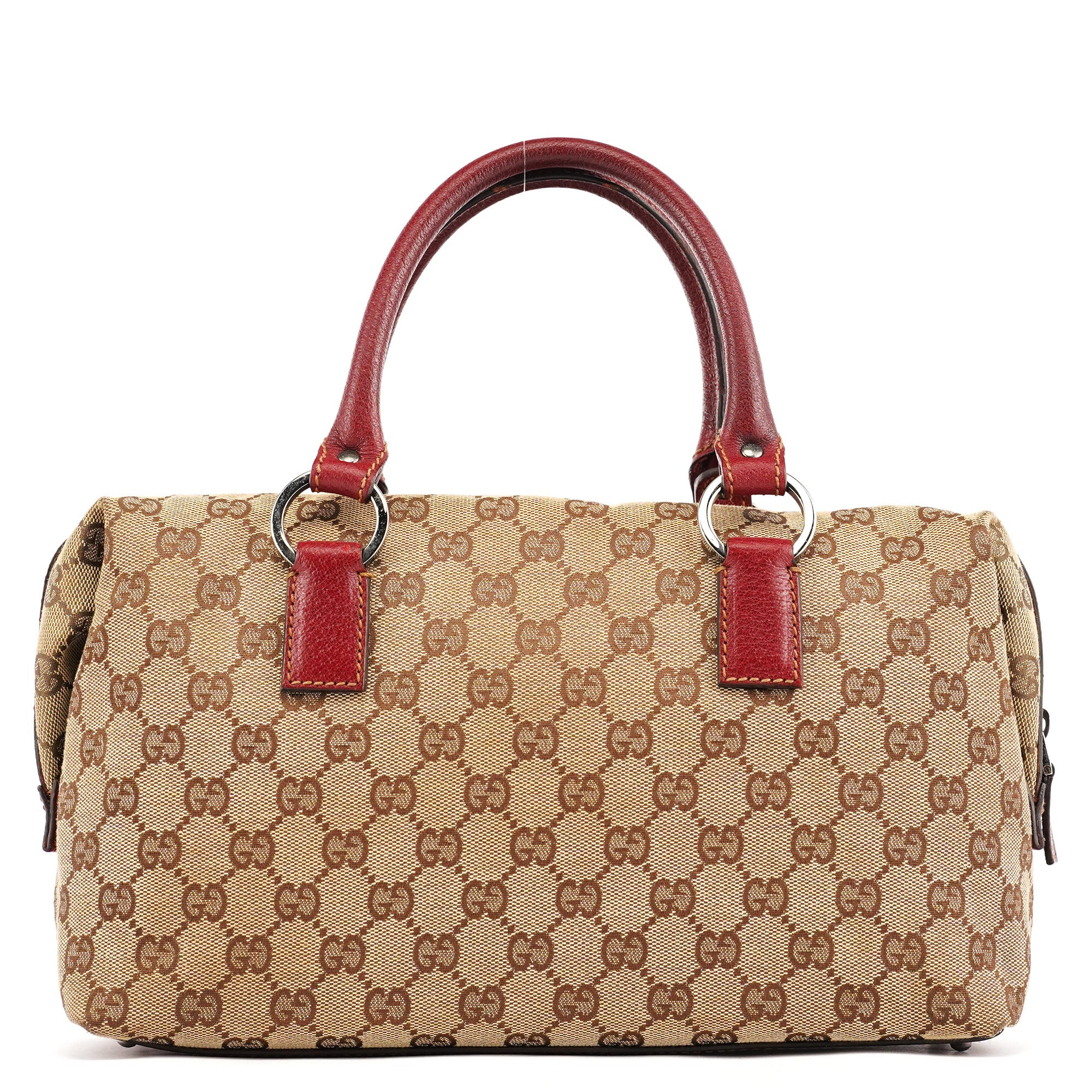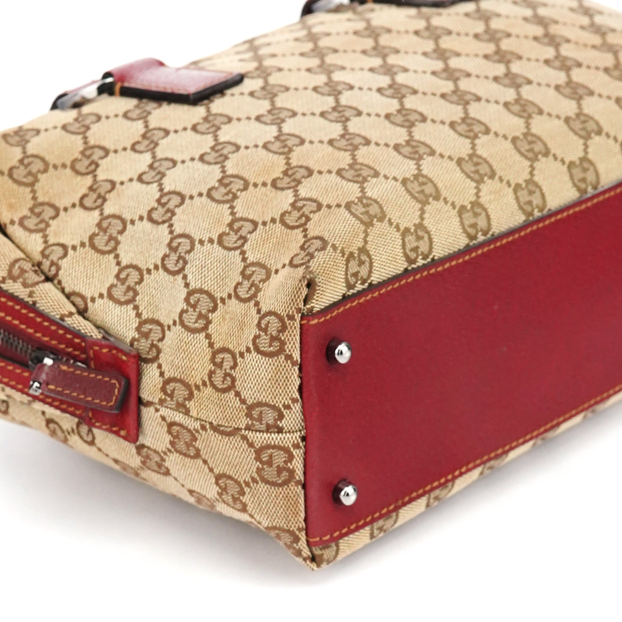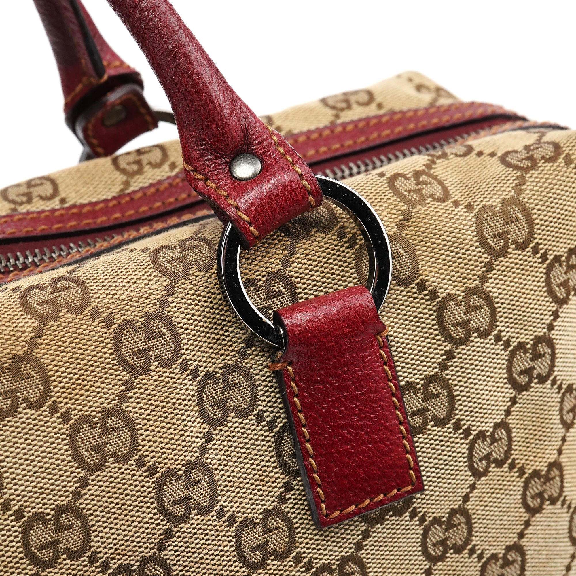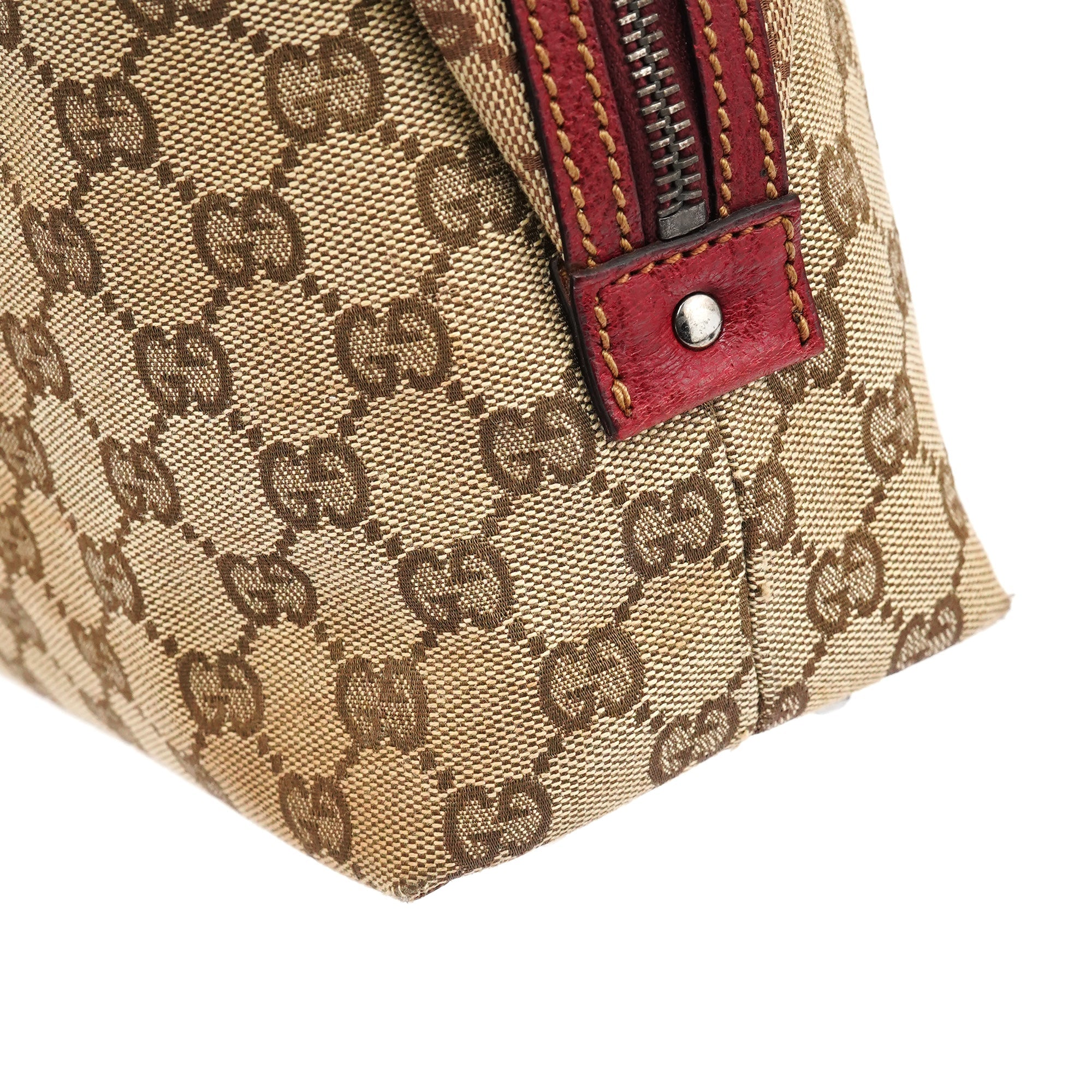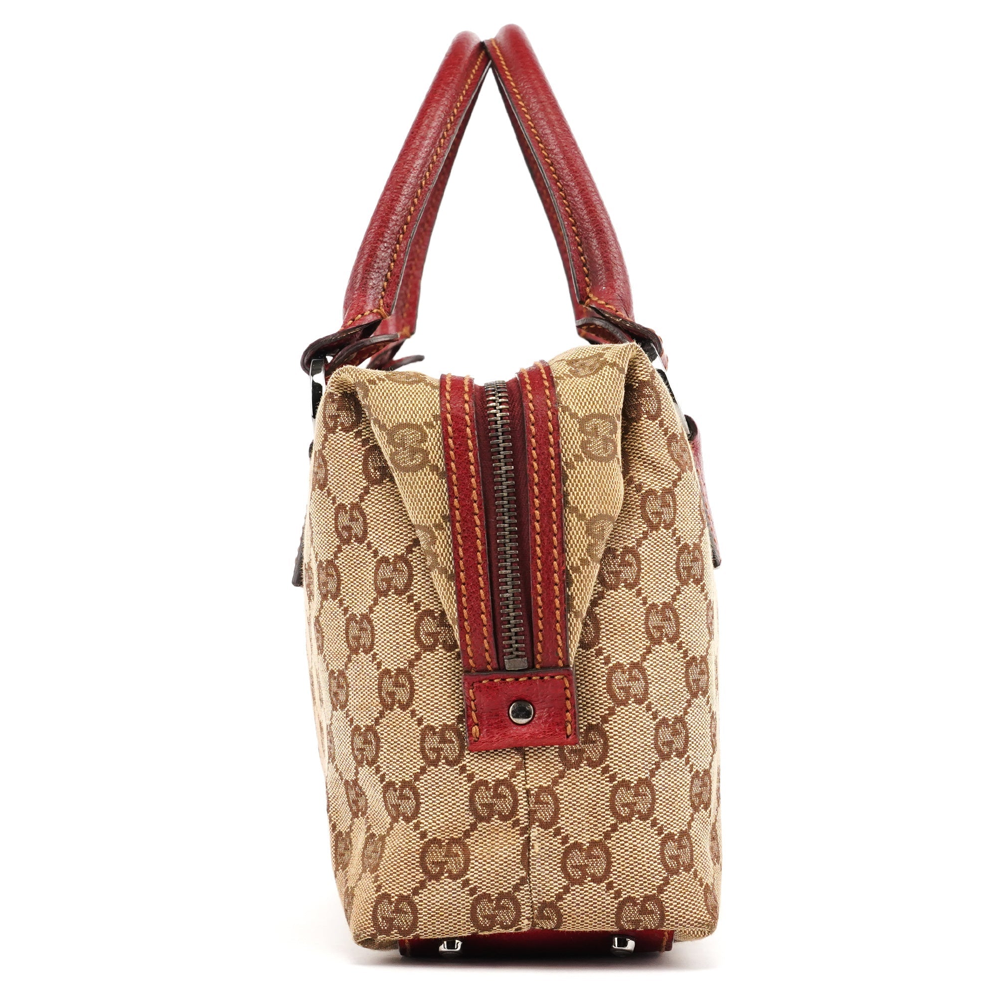 Designed in the early 2000s by Tom Ford, this Gucci tote bag is crafted in beige GG canvas with contrasting burgundy leather trim. The structured silhouette features rounded top handles with ring hardware and a full top-zip closure. The interior is lined in dark fabric with a zipped pocket for essentials.