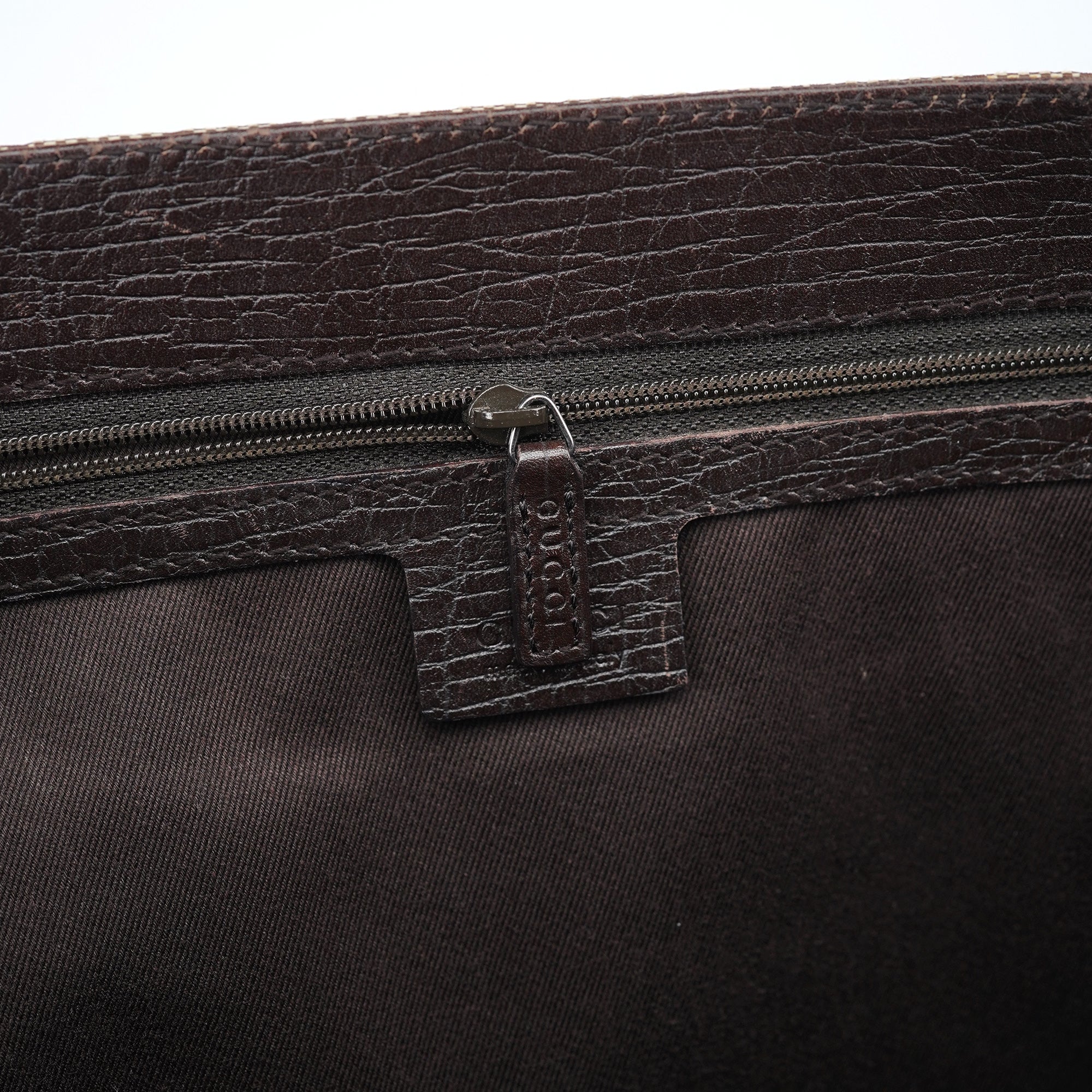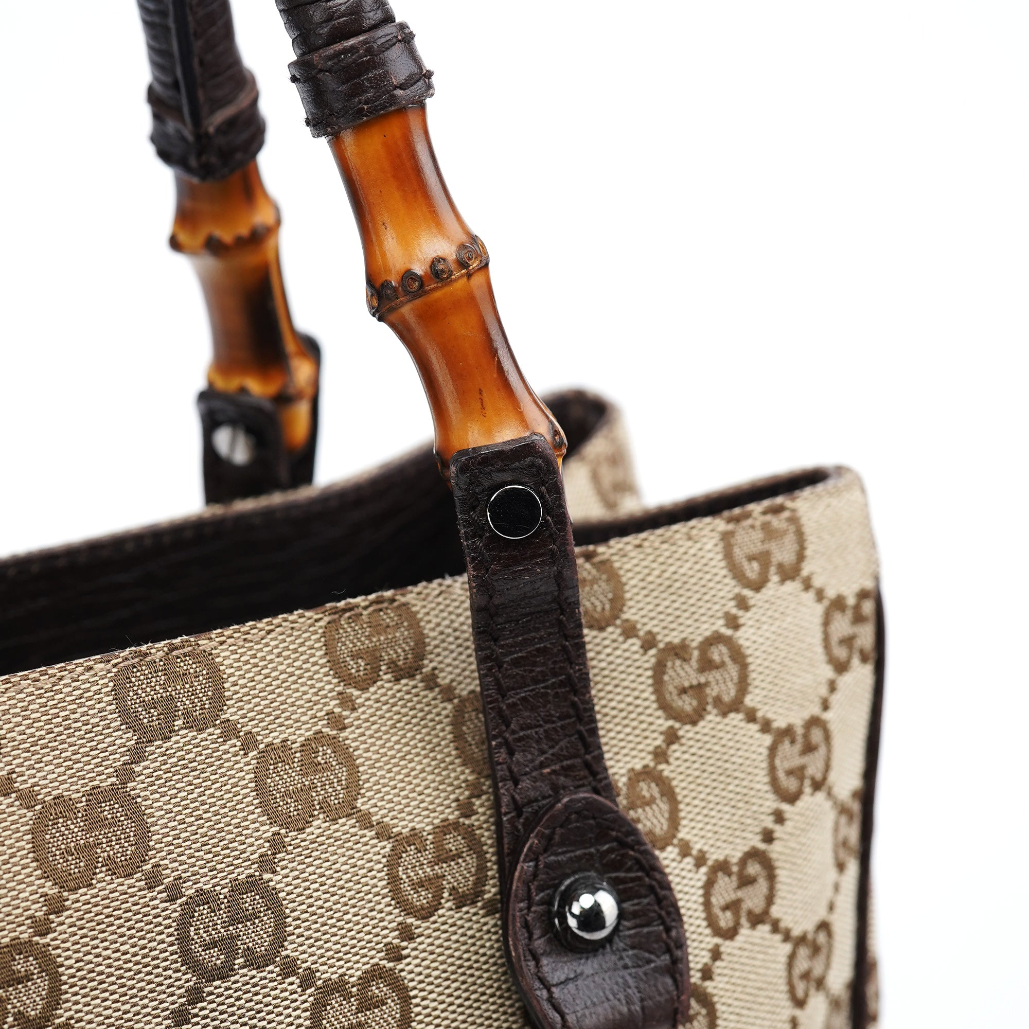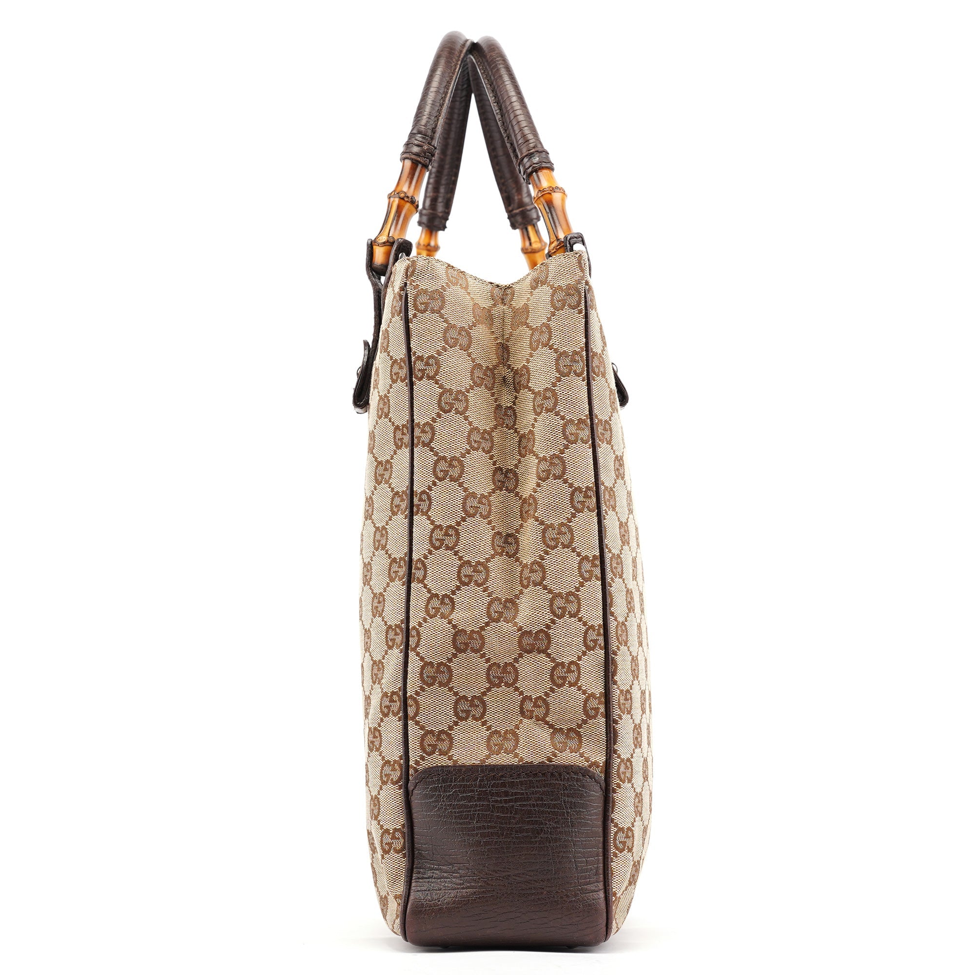 Designed in the early 2000s by Tom Ford, this vintage Gucci GG Bamboo tote bag showcases the iconic GG monogram canvas in beige and brown with distinctive bamboo handle accents. The structured tote silhouette features the classic GG pattern throughout, dark brown leather trim and bamboo-wrapped handles that became a signature Gucci design element. The spacious interior is lined in brown fabric with a zippered compartment for organization.