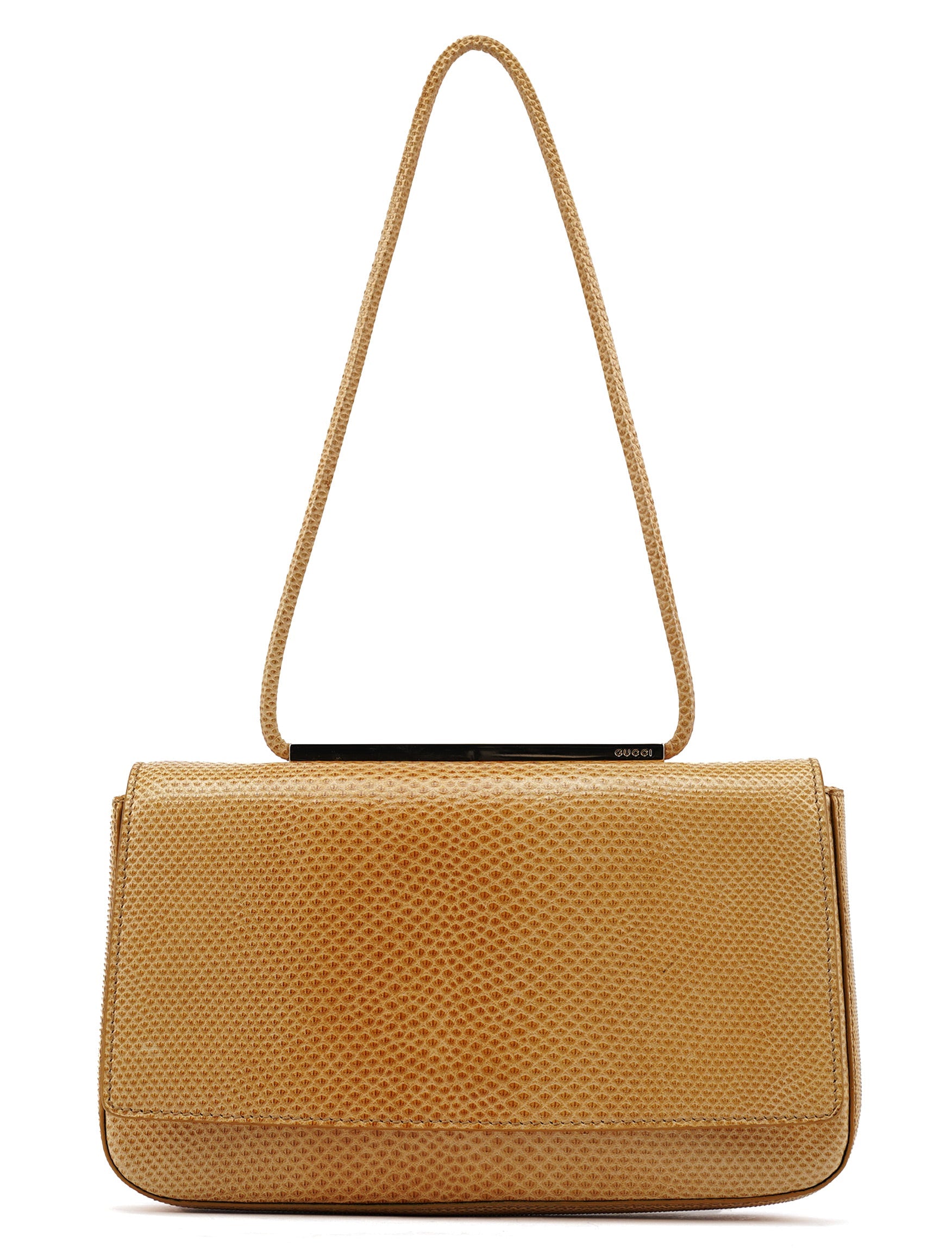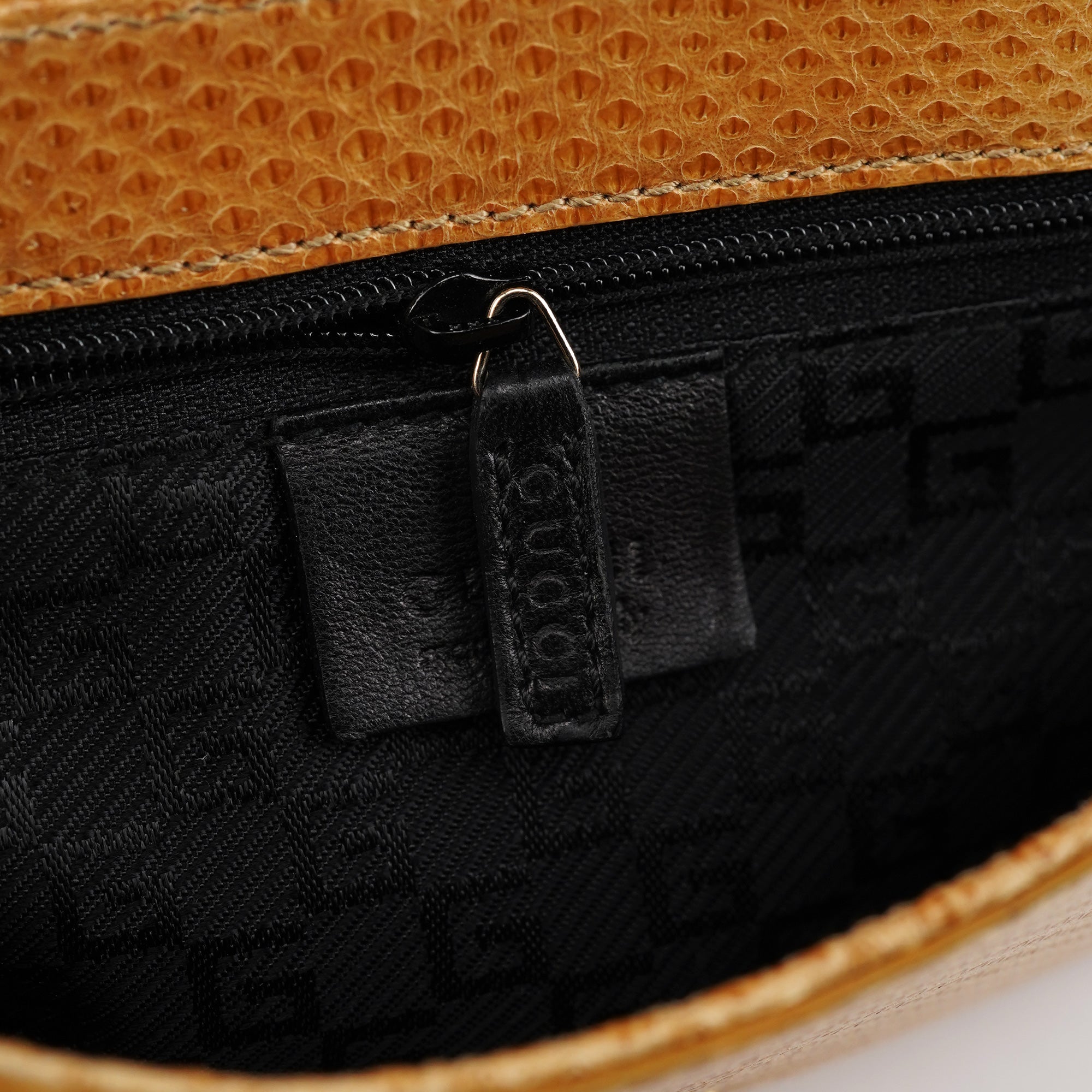Designed in the late 1990s by Tom Ford, this structured shoulder bag captures his sleek, architectural vision for Gucci in genuine lizard leather. The clean rectangular silhouette is accented with minimalist gold-tone hardware, including a bar detail engraved with the house logo. The flap opens to reveal a logo-jacquard interior with a zip pocket, while the rigid top handle maintains its sculptural form.