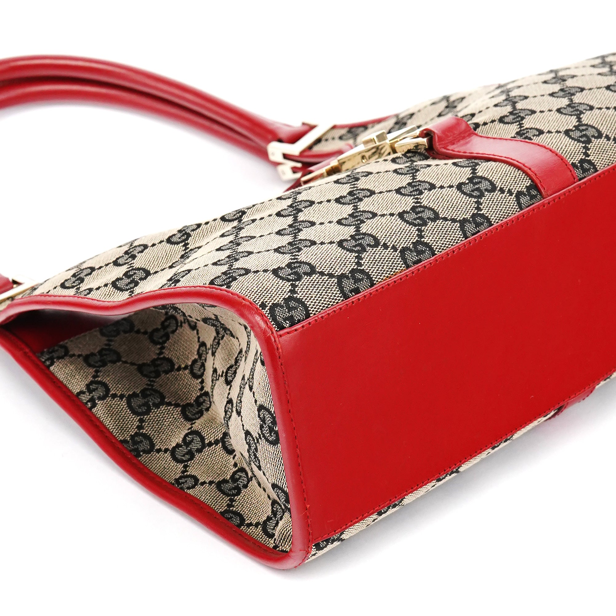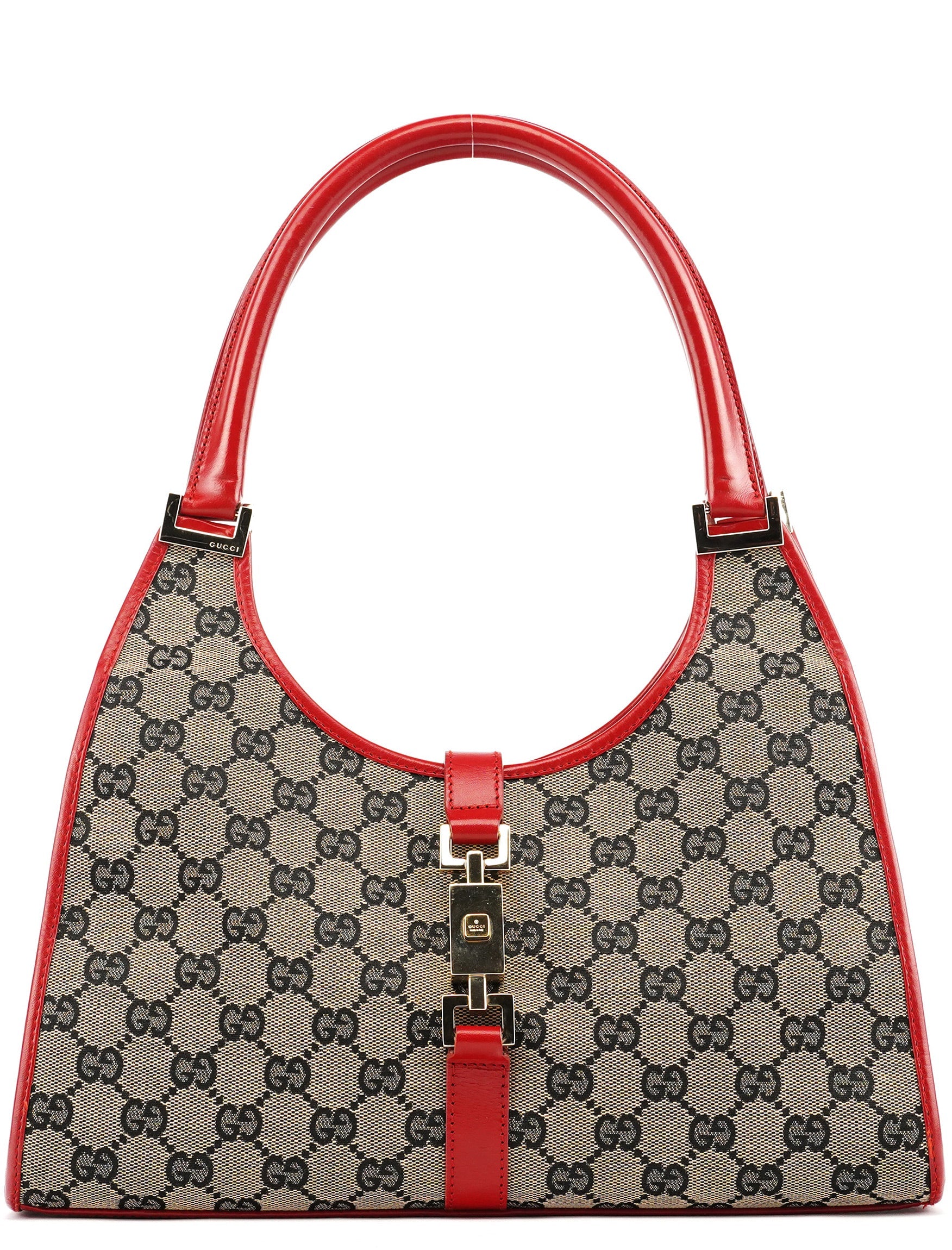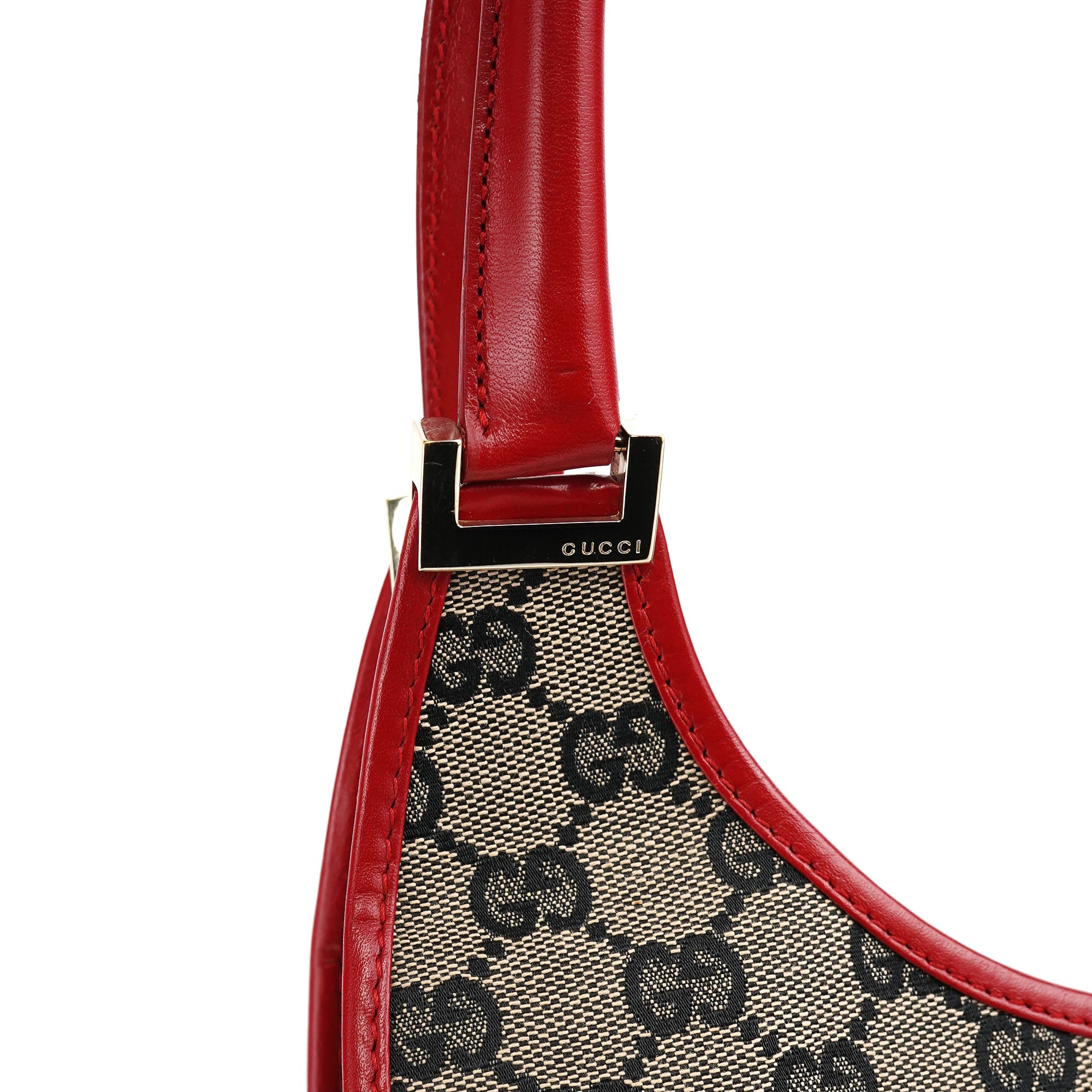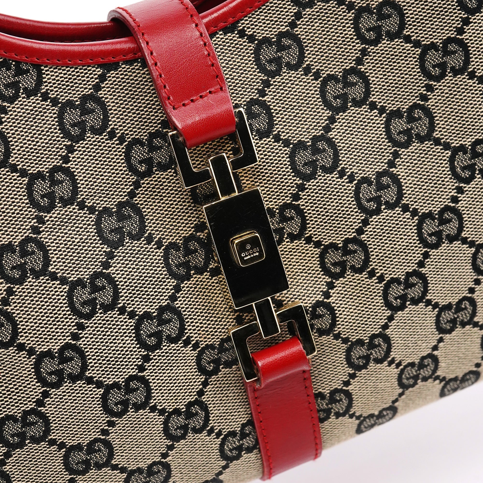 Designed in the late 1990s by Tom Ford, this Gucci Jackie bag is crafted from beige and black GG monogram canvas with vibrant red leather trim. The curved hobo silhouette features a prominent black and gold-tone piston lock closure. It includes a single rolled red leather handle and a simple black fabric-lined interior compartment.