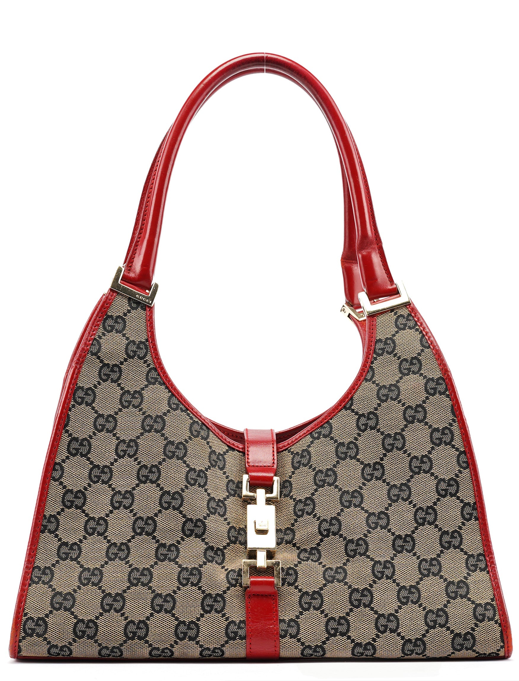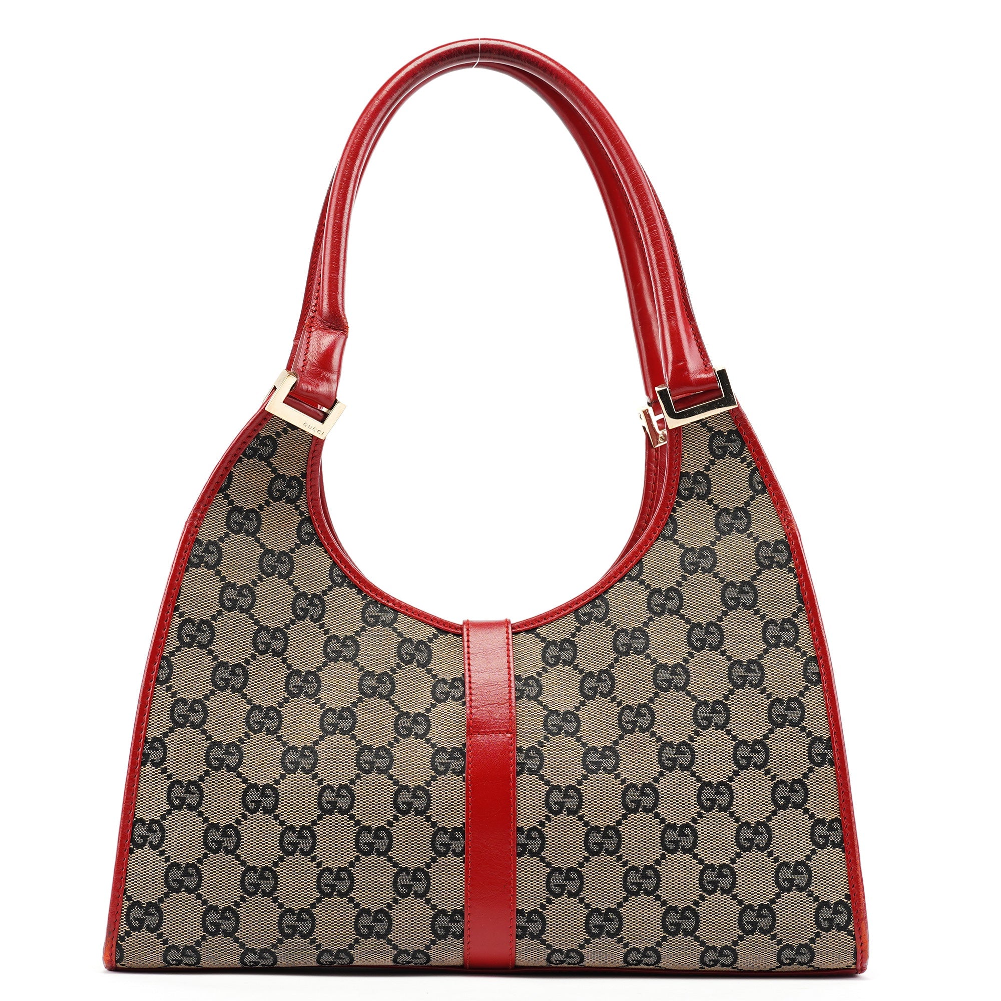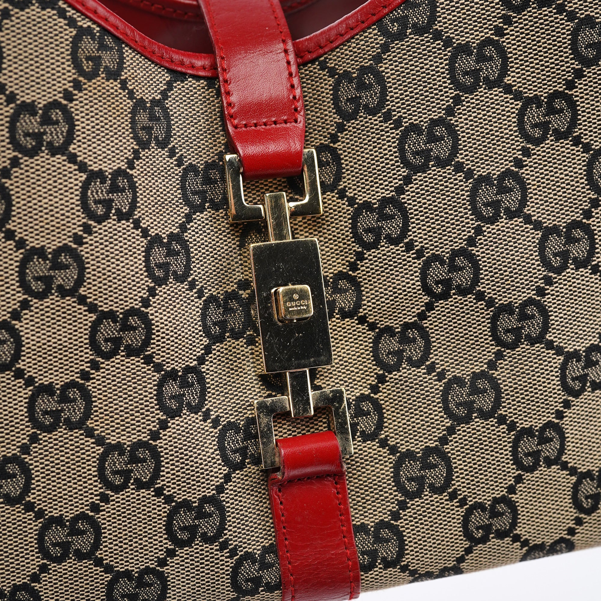 Designed in the late 1990s by Tom Ford, this vintage Gucci Jackie shoulder bag features the iconic GG monogram canvas in beige with striking red leather trim and gold-tone hardware. The timeless hobo silhouette showcases the signature Jackie metal fittings and piston closure that made this model a house icon, with a structured yet relaxed shape perfect for daily wear. The interior is lined in coordinating fabric with internal pockets for organization.