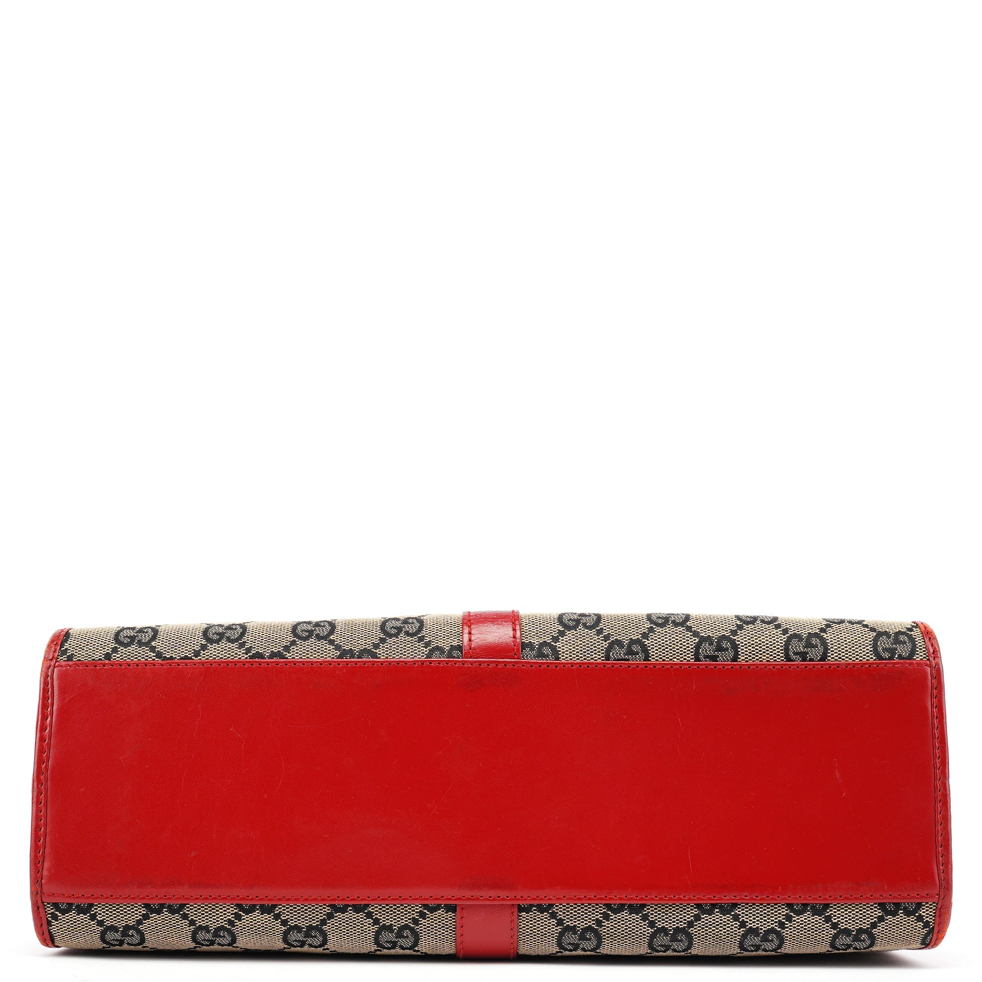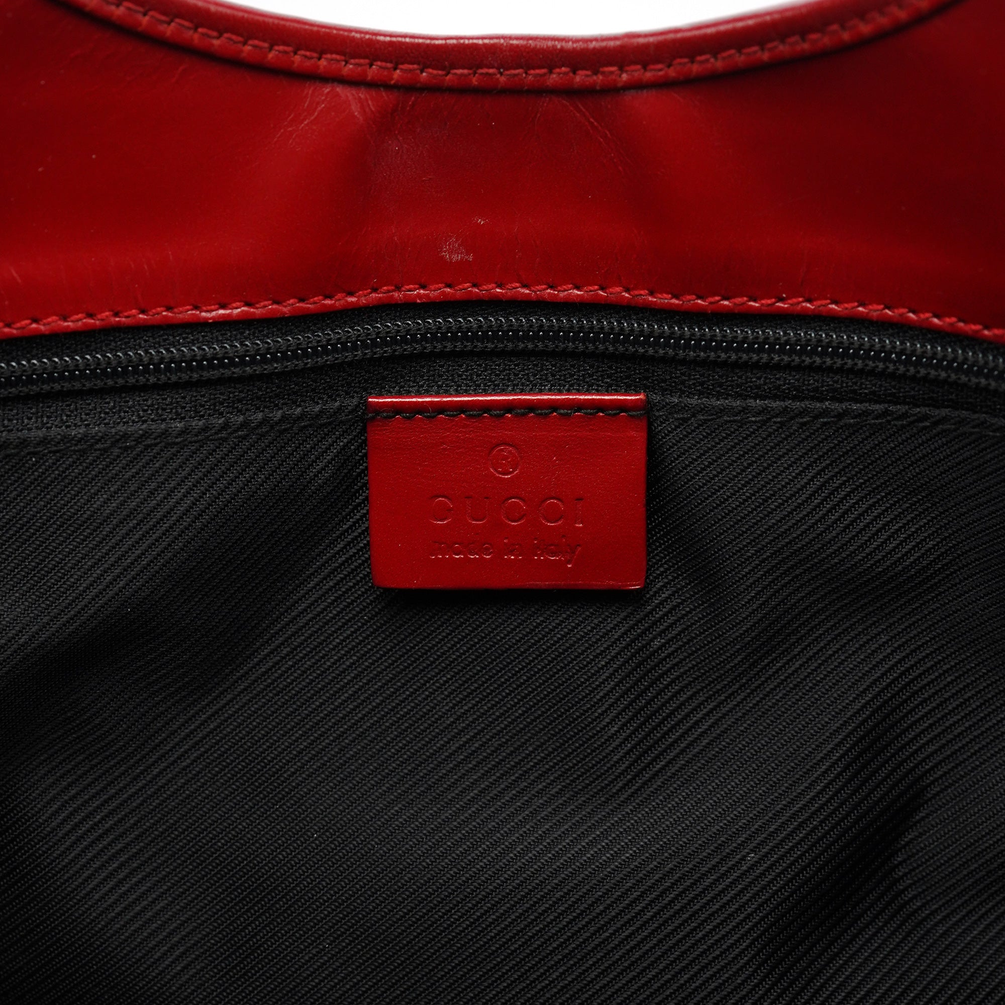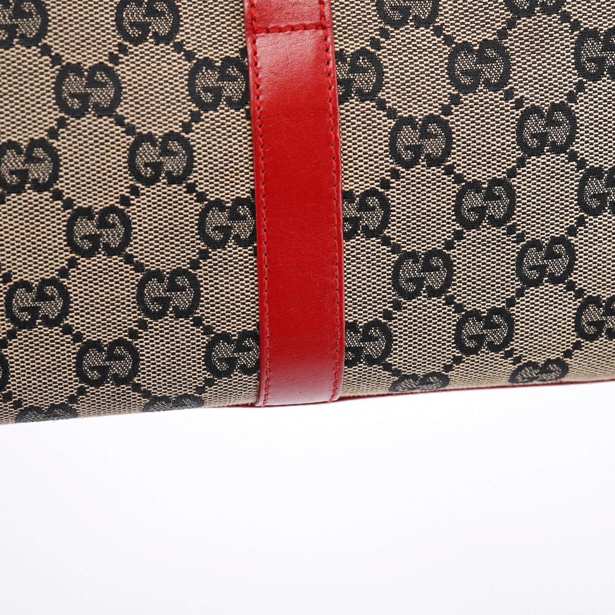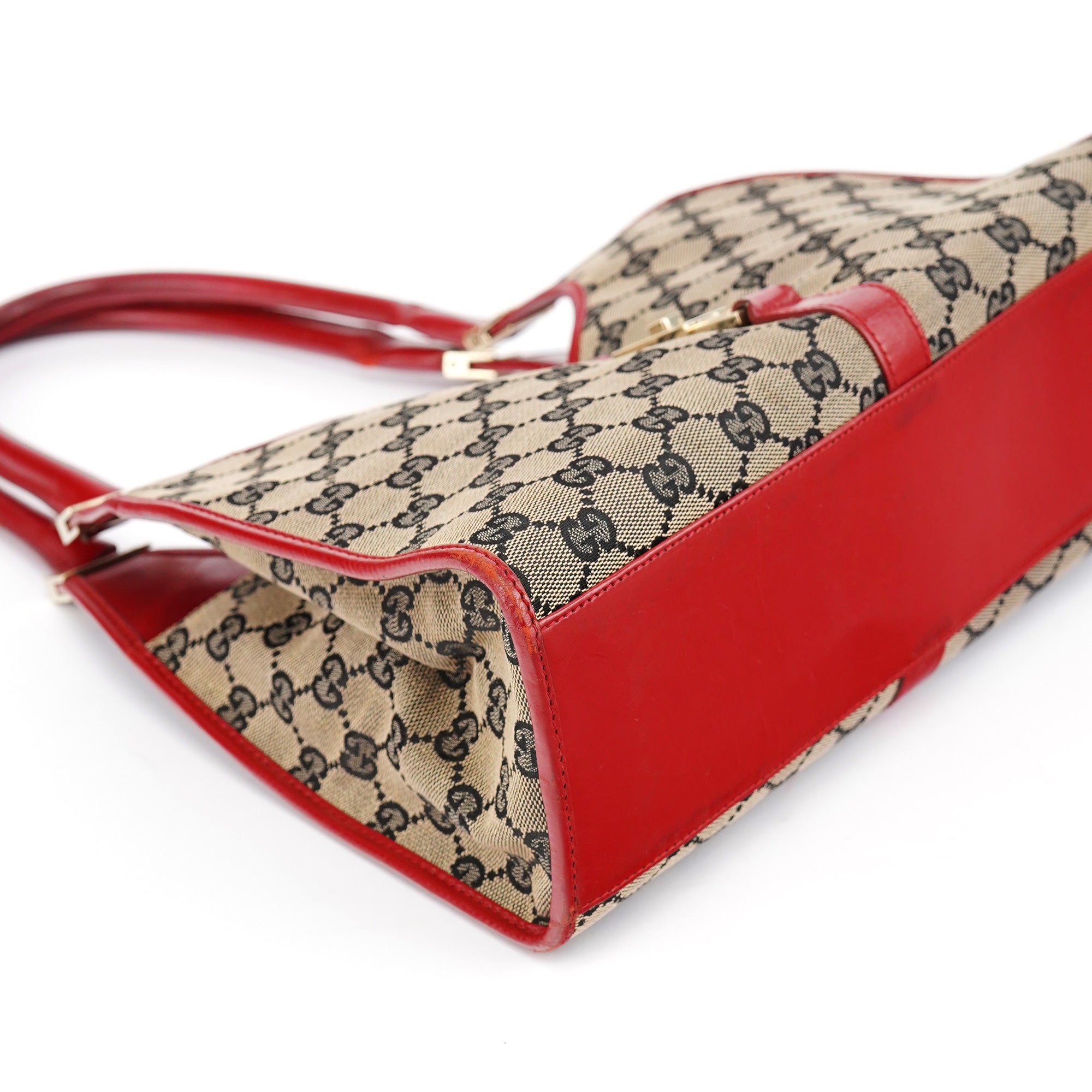 Designed in the late 1990s by Tom Ford, this vintage Gucci Jackie shoulder bag features the iconic GG monogram canvas in beige with striking red leather trim and gold-tone hardware. The timeless hobo silhouette showcases the signature Jackie metal fittings and piston closure that made this model a house icon, with a structured yet relaxed shape perfect for daily wear. The interior is lined in coordinating fabric with internal pockets for organization.