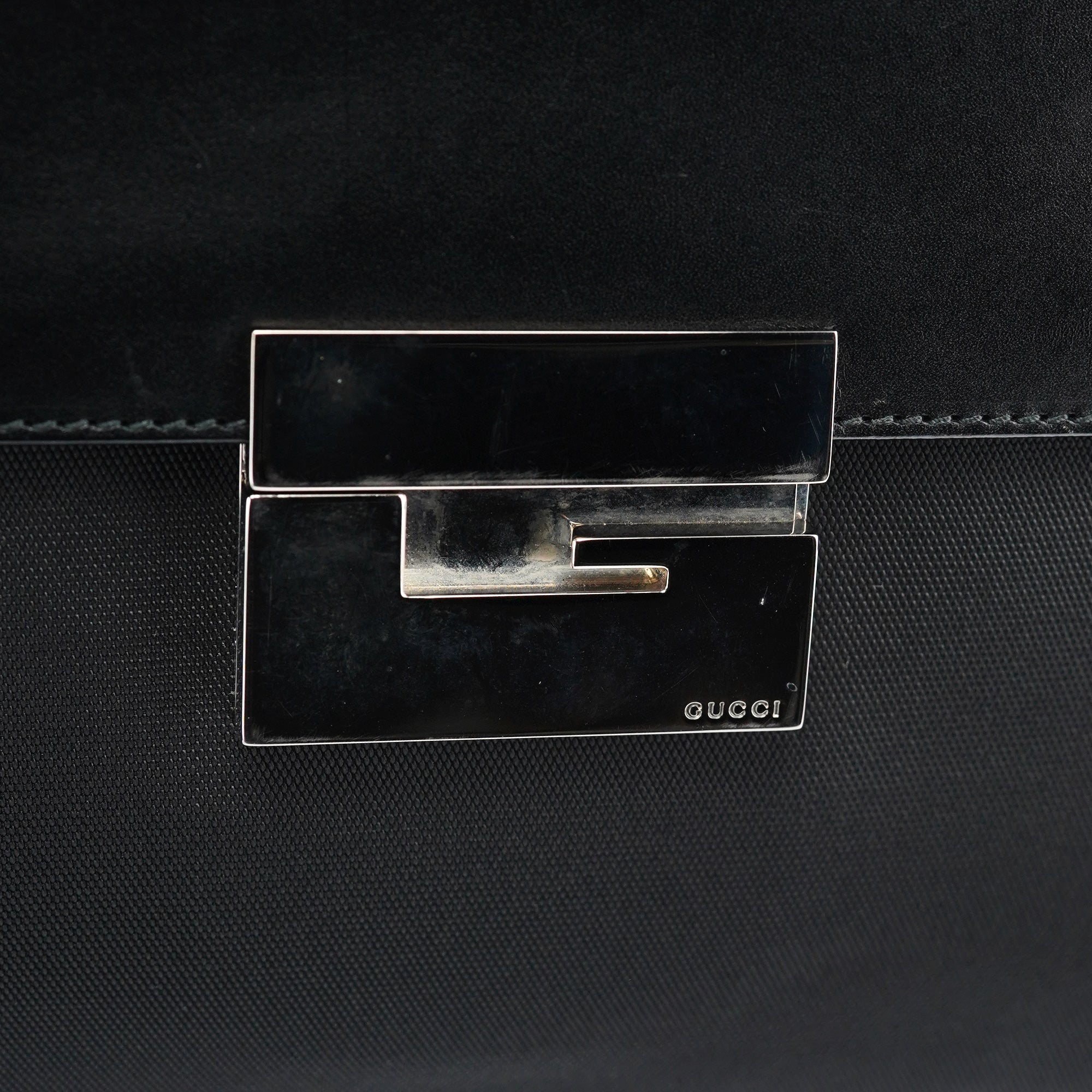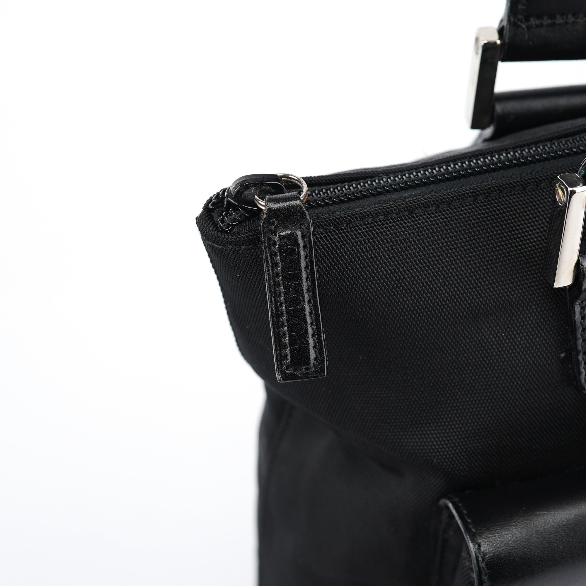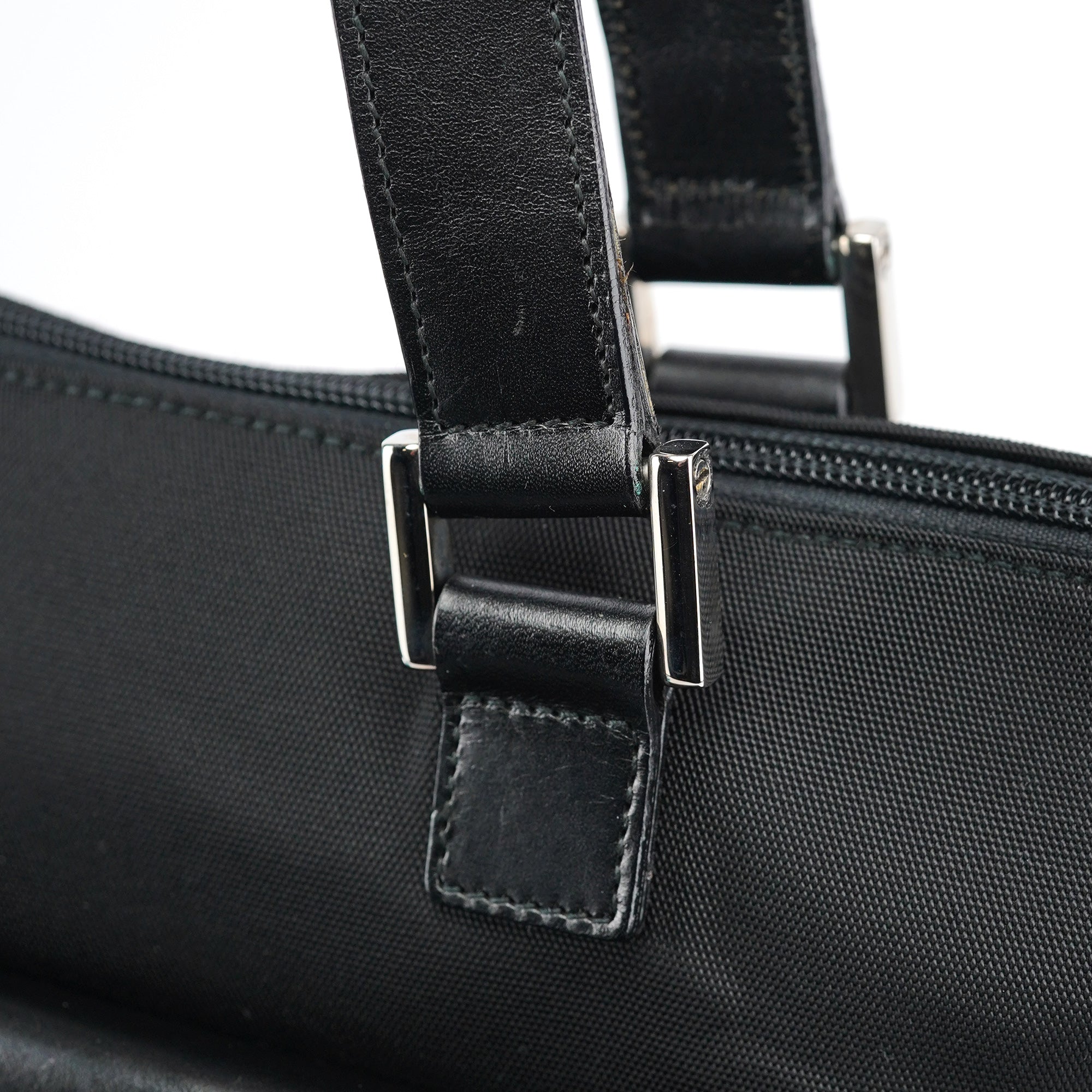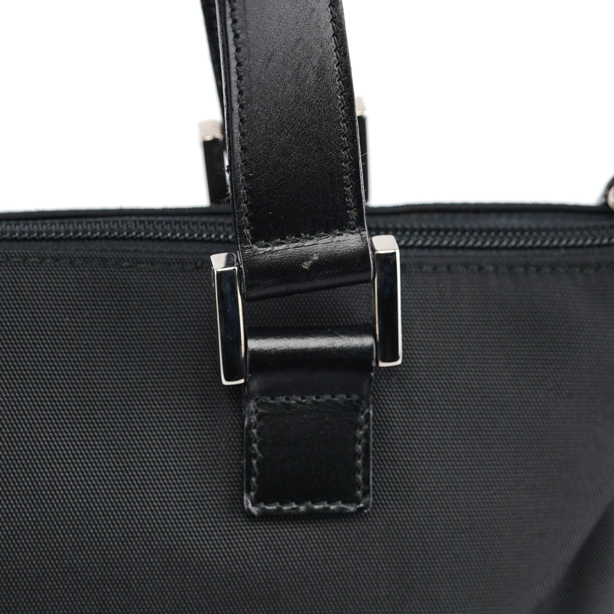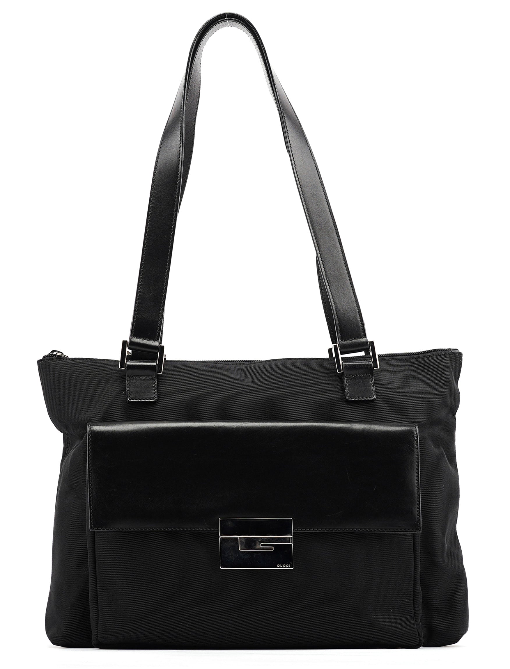 Designed in the mid 1990's by Tom Ford, this vintage Gucci Square G tote bag features durable black nylon with black leather trim and distinctive large silver-tone square G metal fittings on the exterior pocket. The practical silhouette includes dual top leather handles for versatile carry. The interior is lined with durable fabric and features one zippered pocket for organized storage.