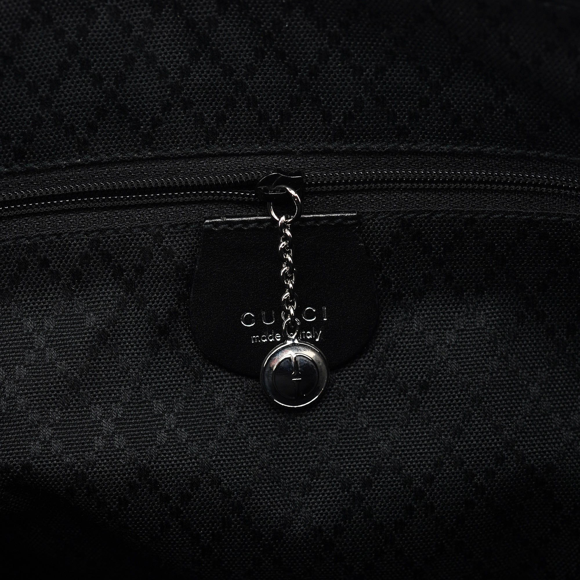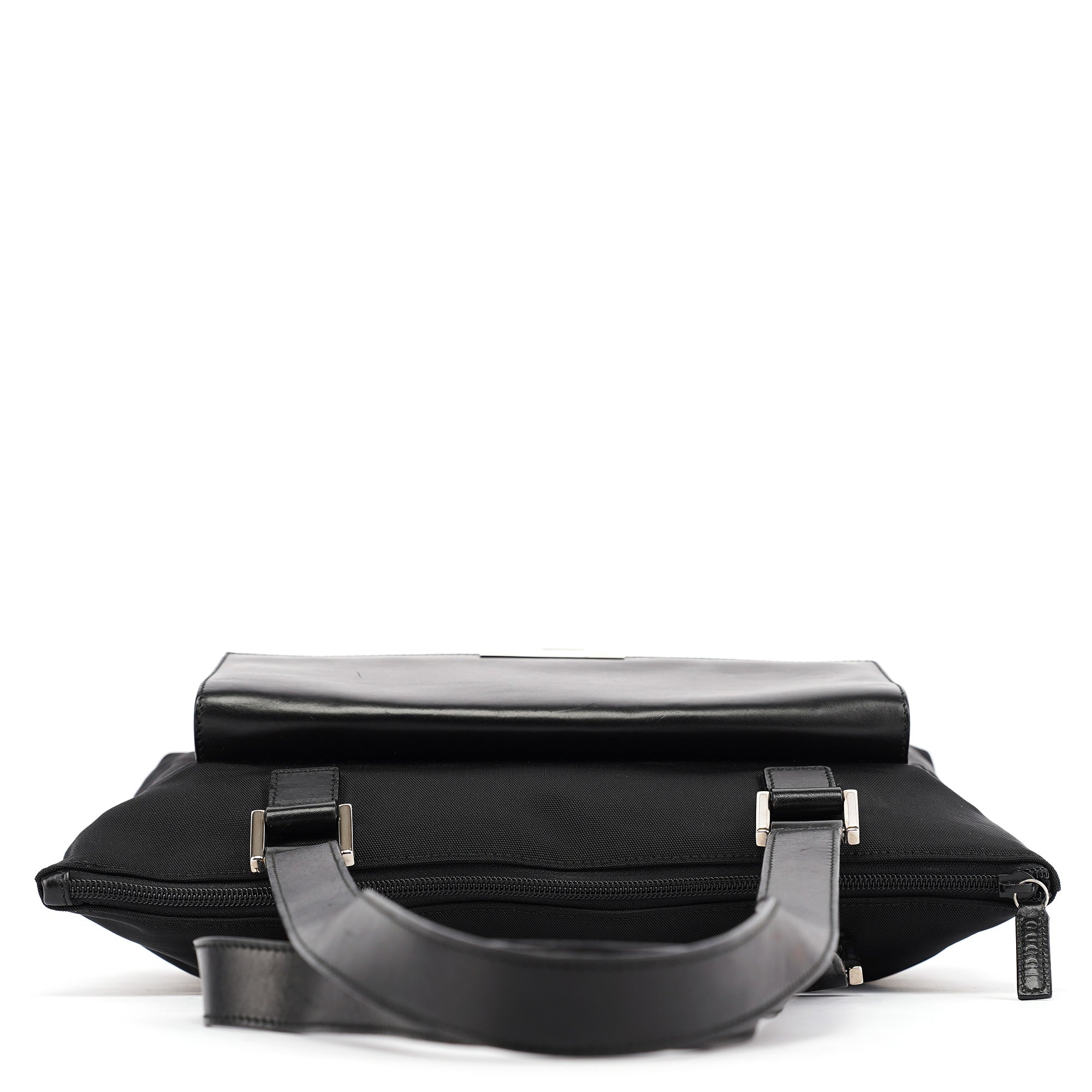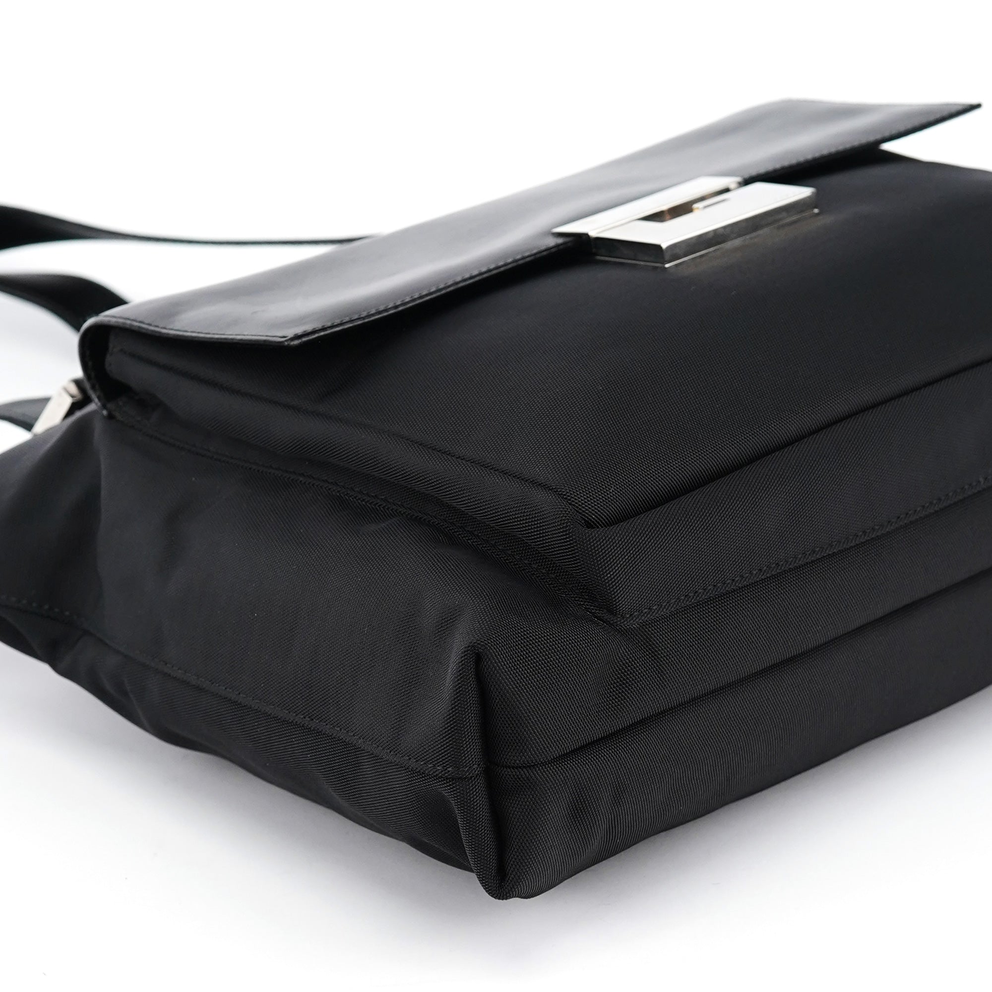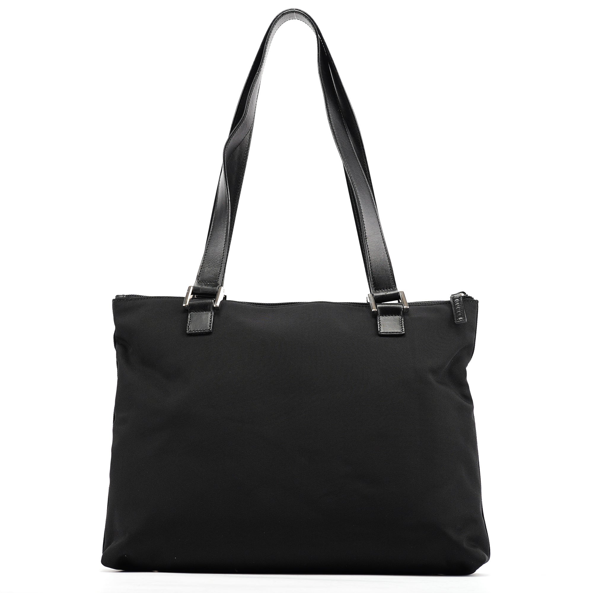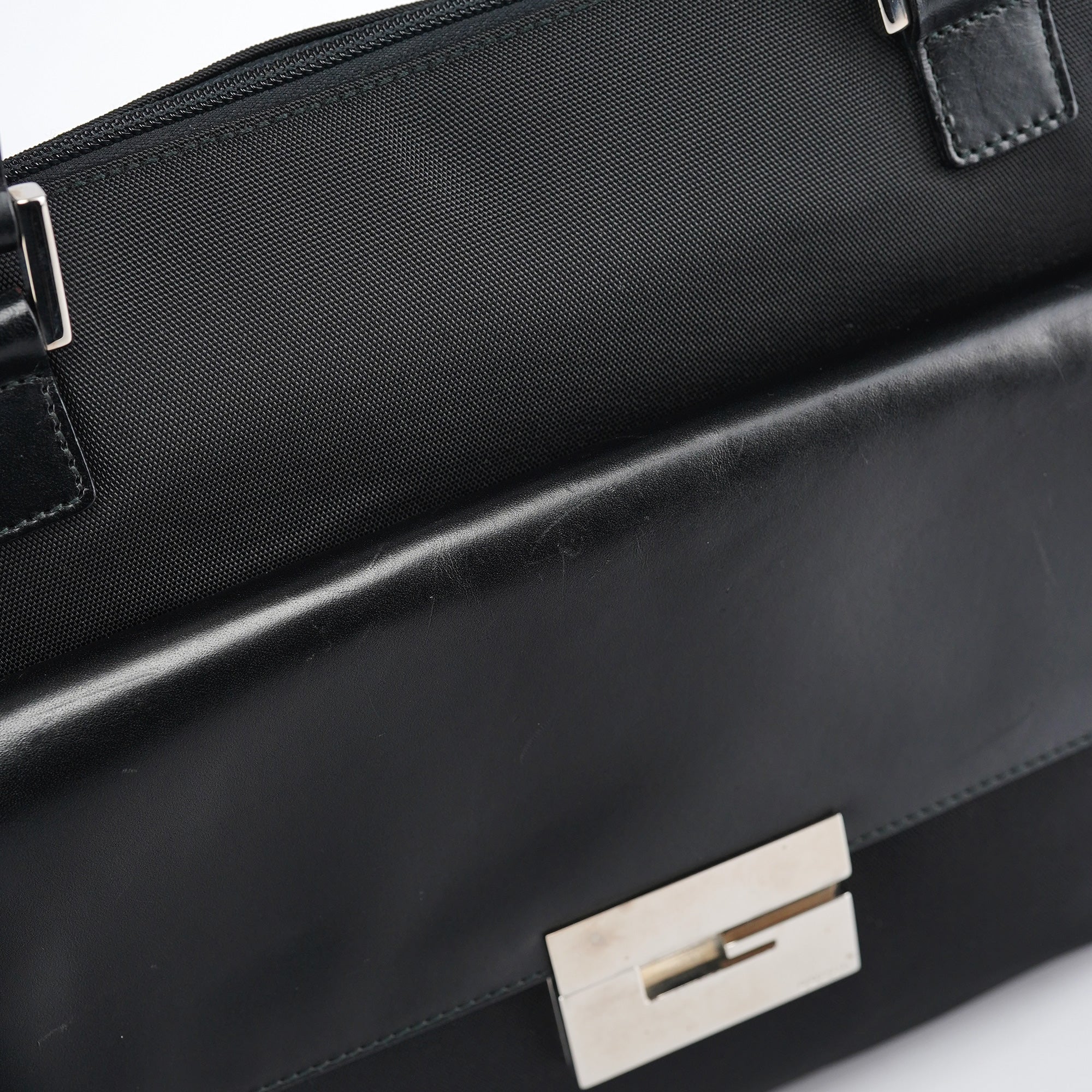 Designed in the mid 1990's by Tom Ford, this vintage Gucci Square G tote bag features durable black nylon with black leather trim and distinctive large silver-tone square G metal fittings on the exterior pocket. The practical silhouette includes dual top leather handles for versatile carry. The interior is lined with durable fabric and features one zippered pocket for organized storage.