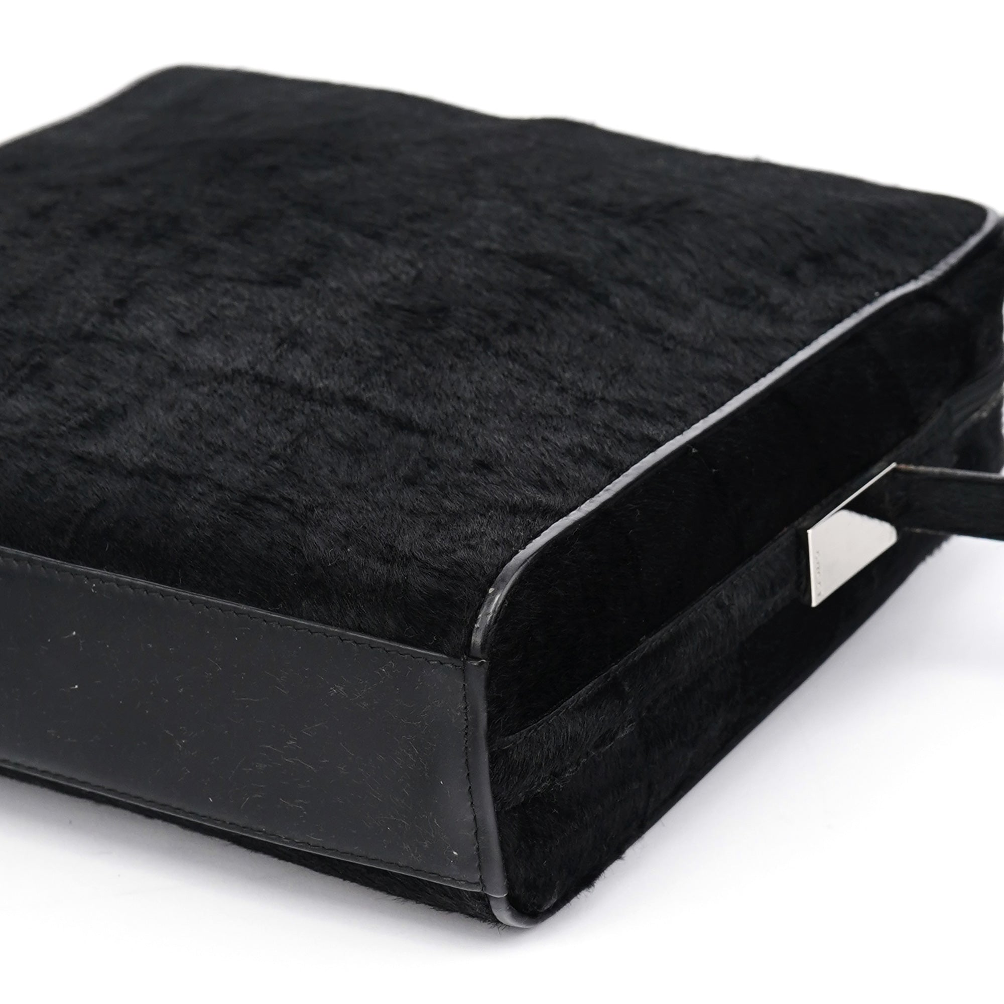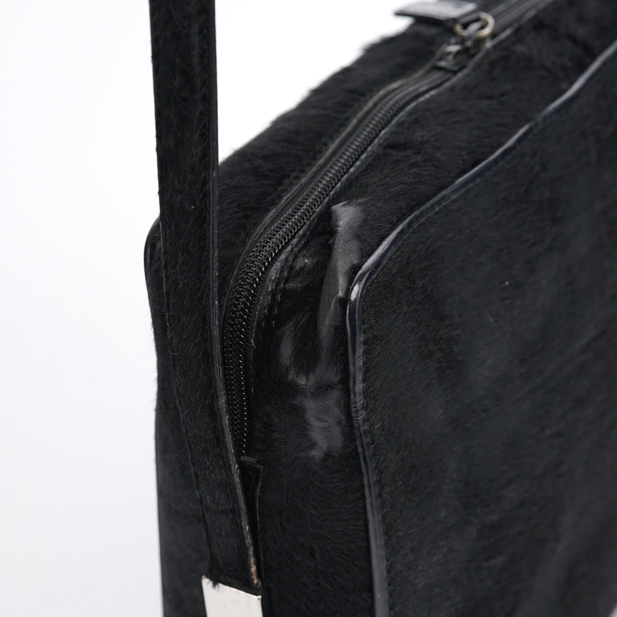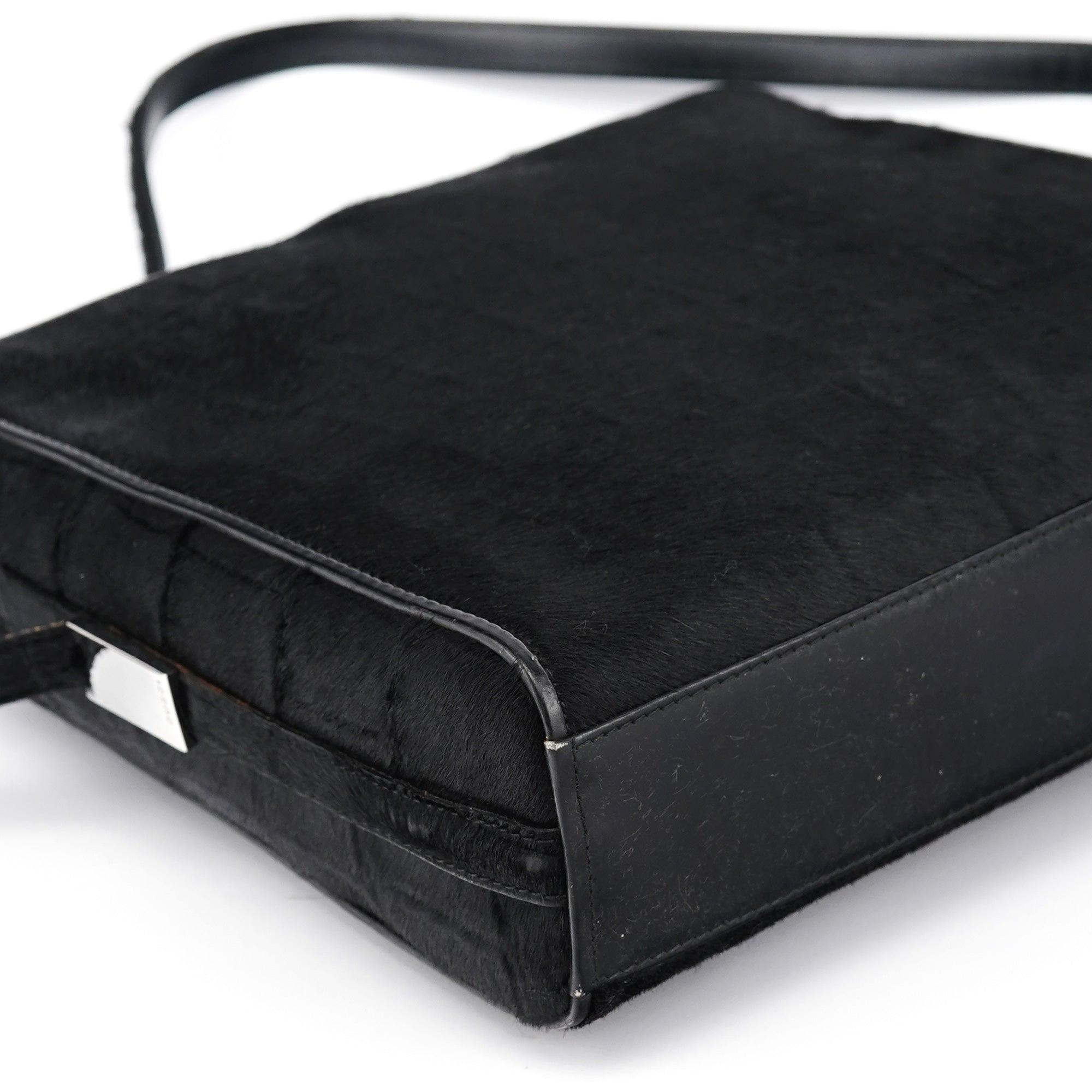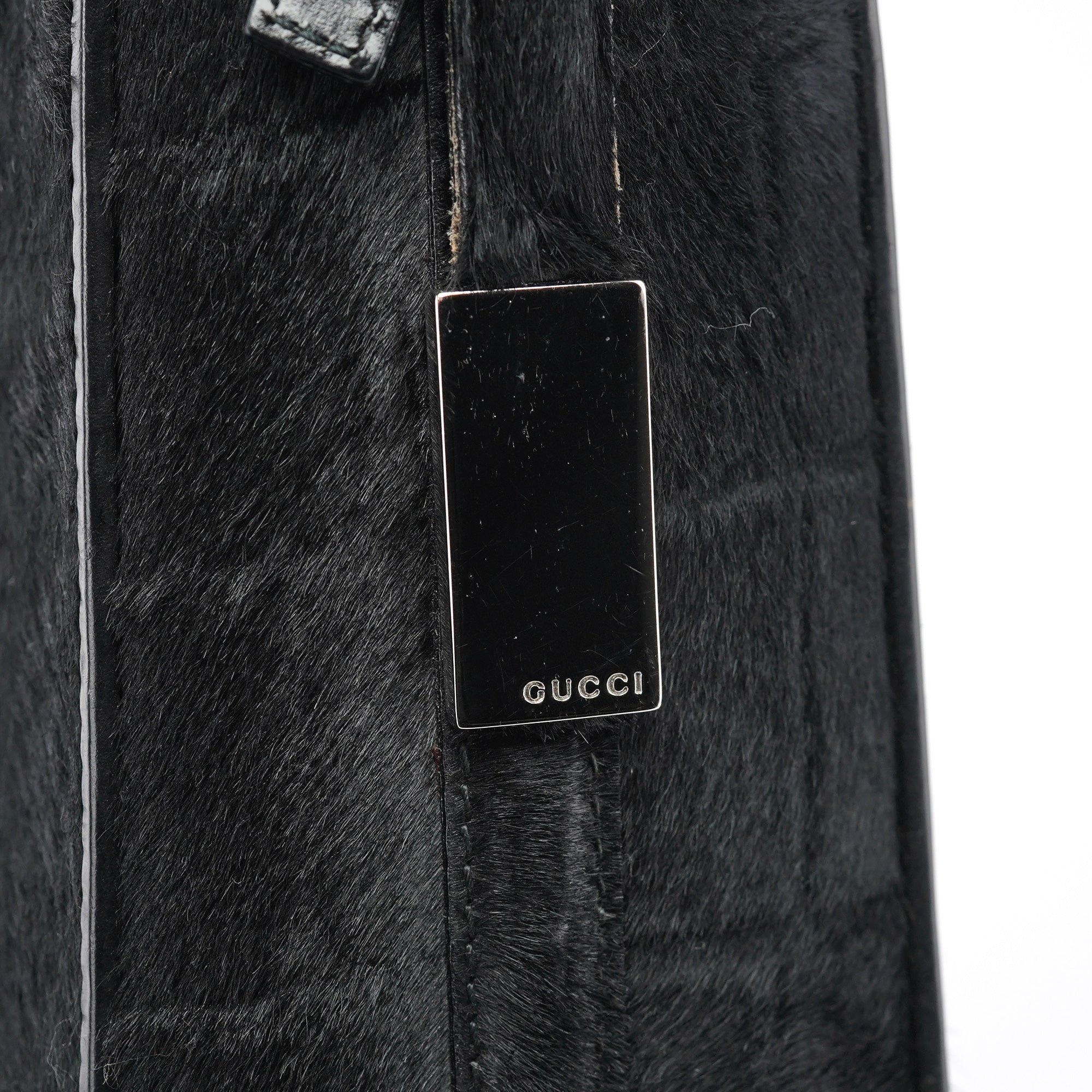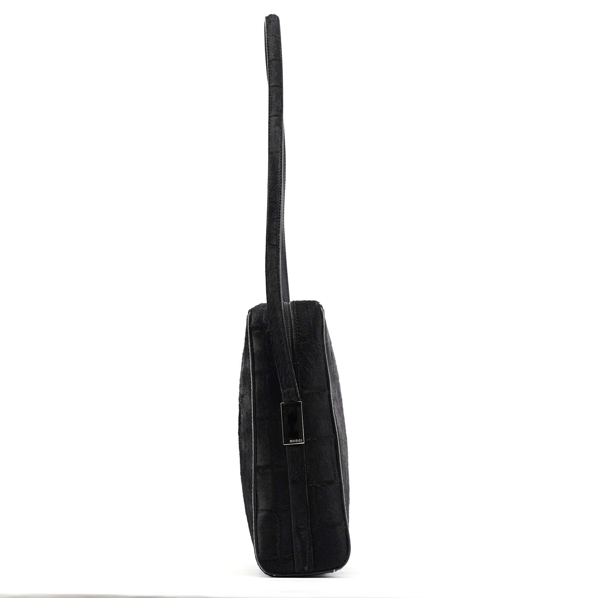 Designed in the late 1990s by Tom Ford, this rare Gucci shoulder bag features embossed calf hair leather in jet black with a subtle crocodile effect. The slim rectangular silhouette is finished with a silver-tone plaque engraved with the Gucci logo, a top zip closure, and a slim shoulder strap. The interior is lined in black leather with a single zip pocket.