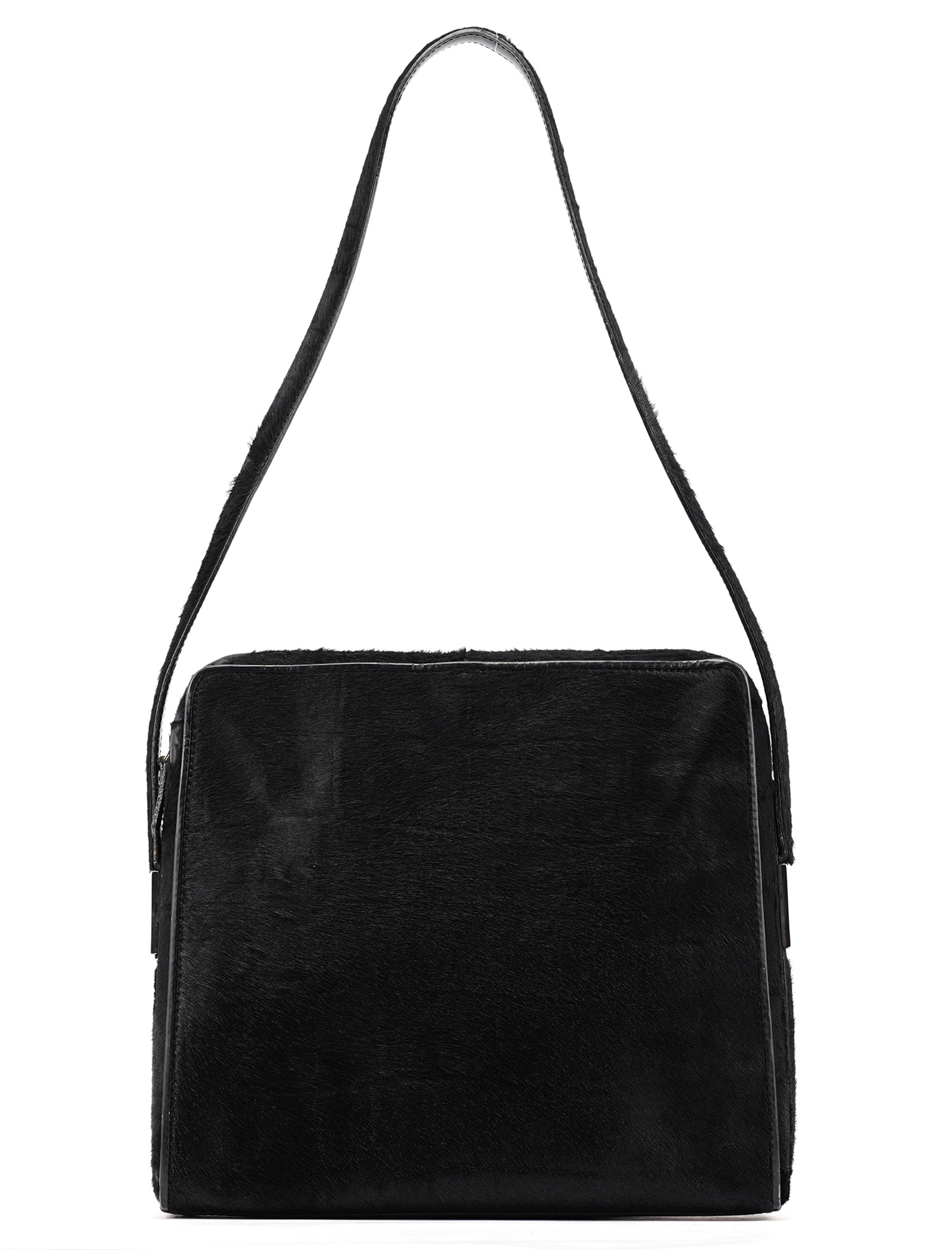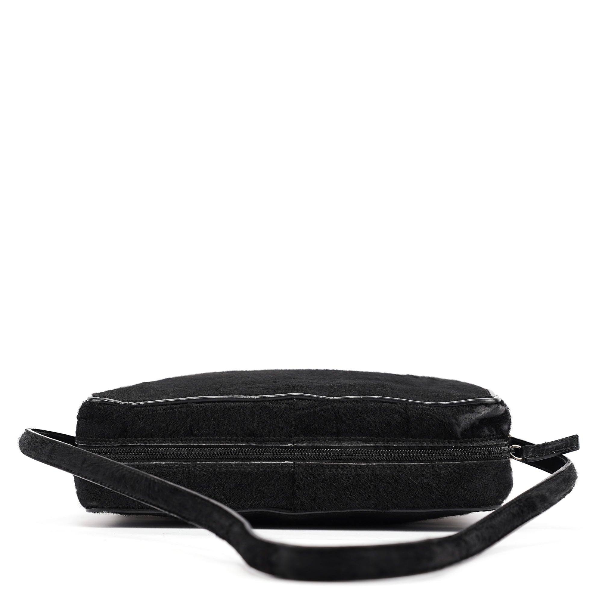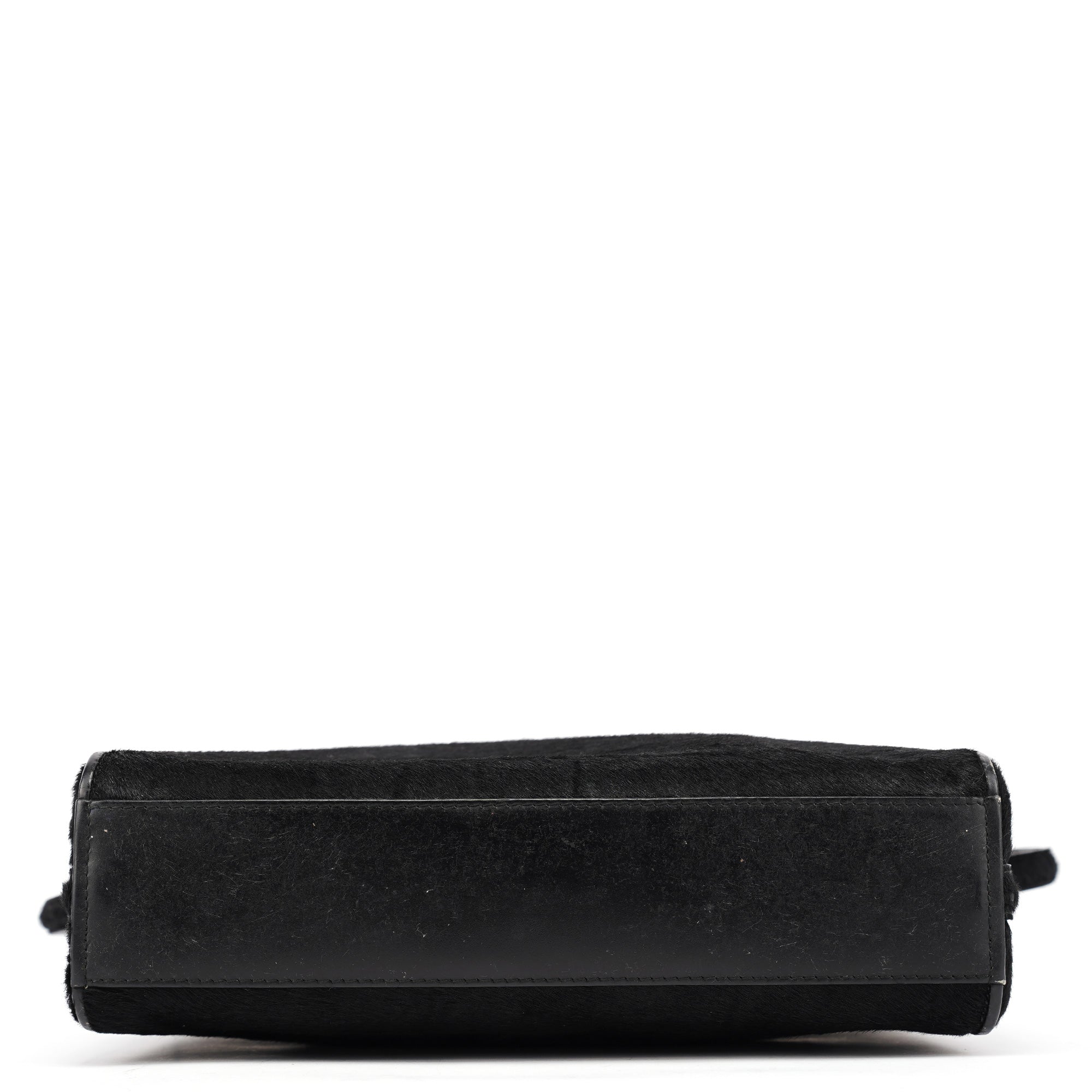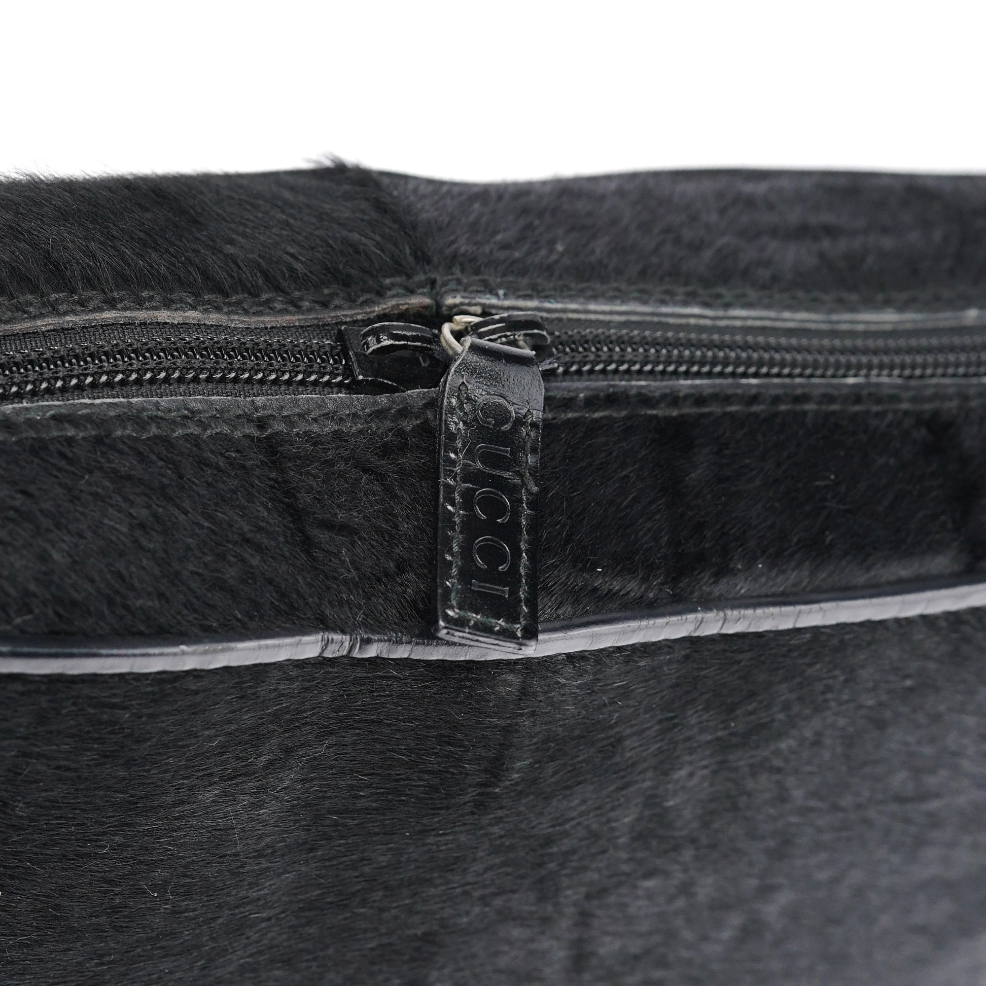 Designed in the late 1990s by Tom Ford, this rare Gucci shoulder bag features embossed calf hair leather in jet black with a subtle crocodile effect. The slim rectangular silhouette is finished with a silver-tone plaque engraved with the Gucci logo, a top zip closure, and a slim shoulder strap. The interior is lined in black leather with a single zip pocket.