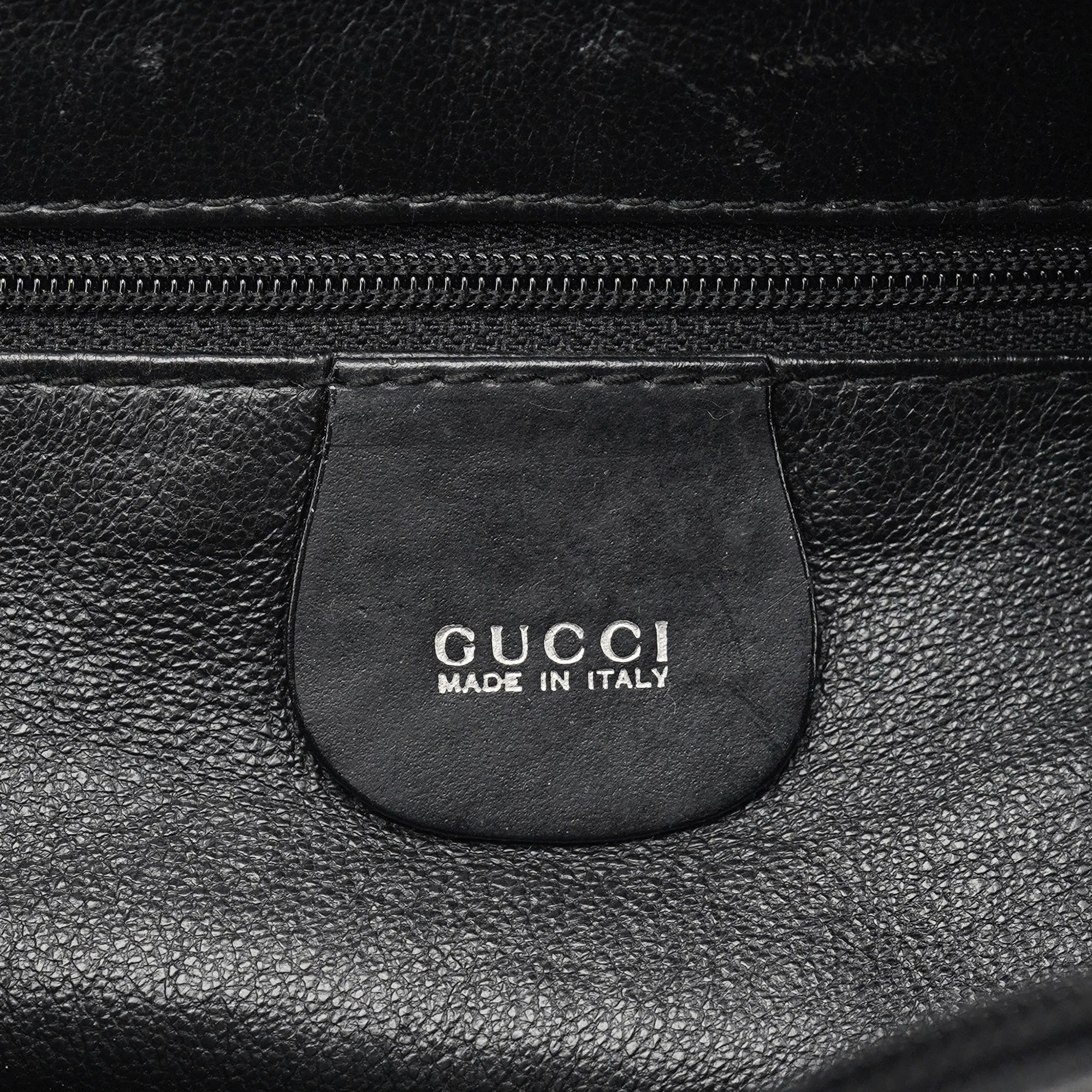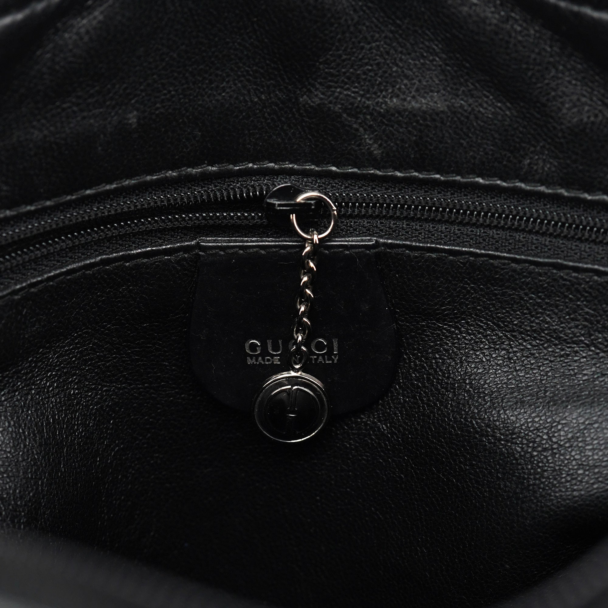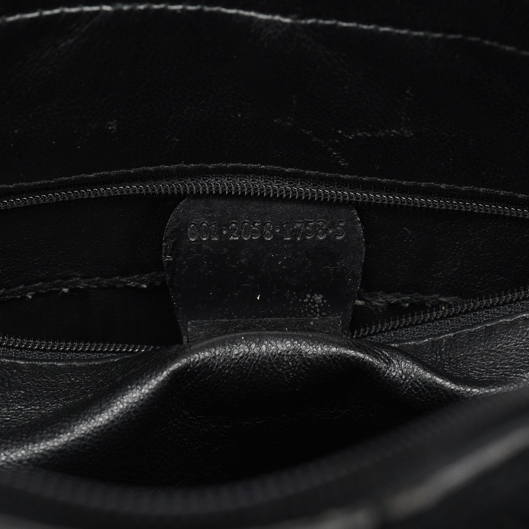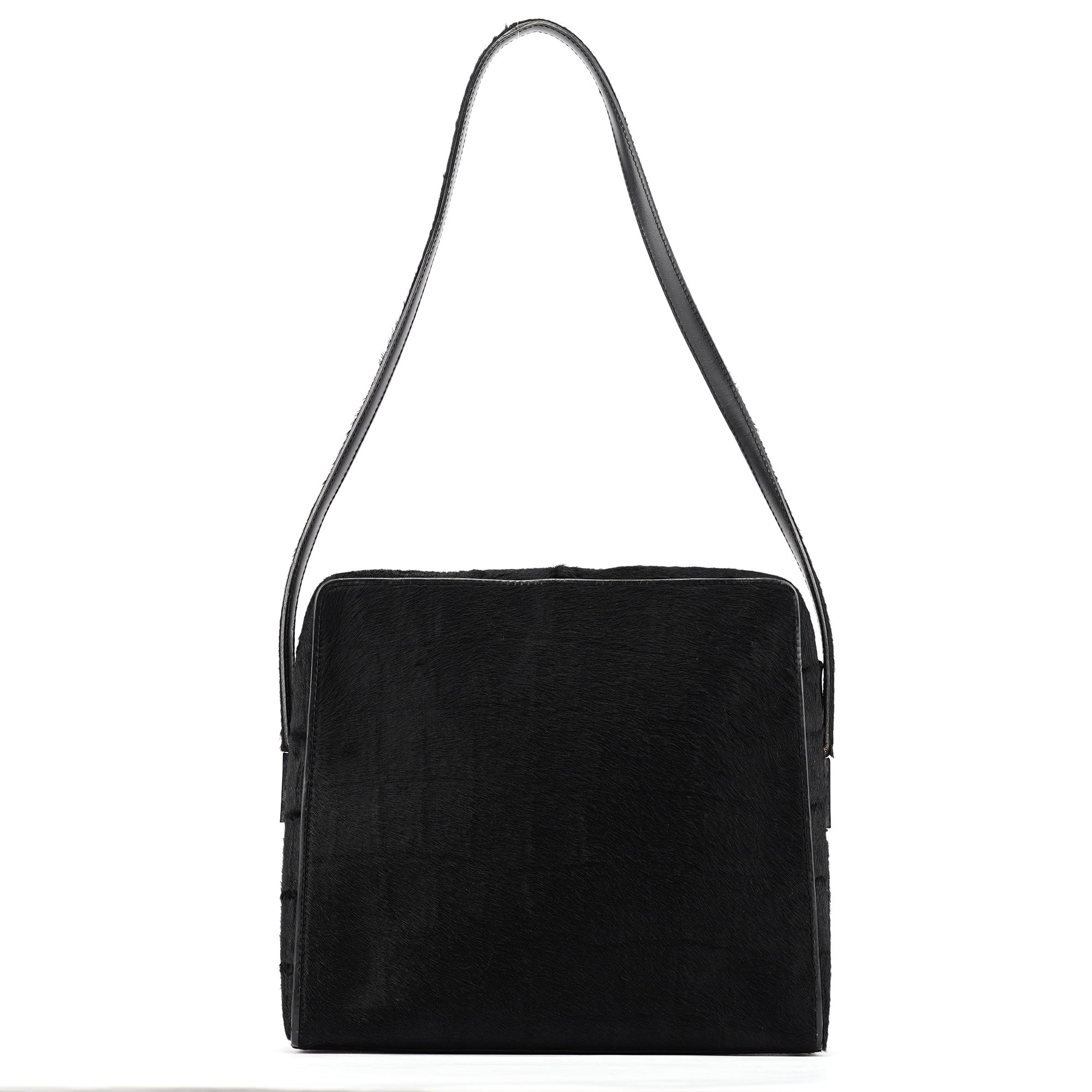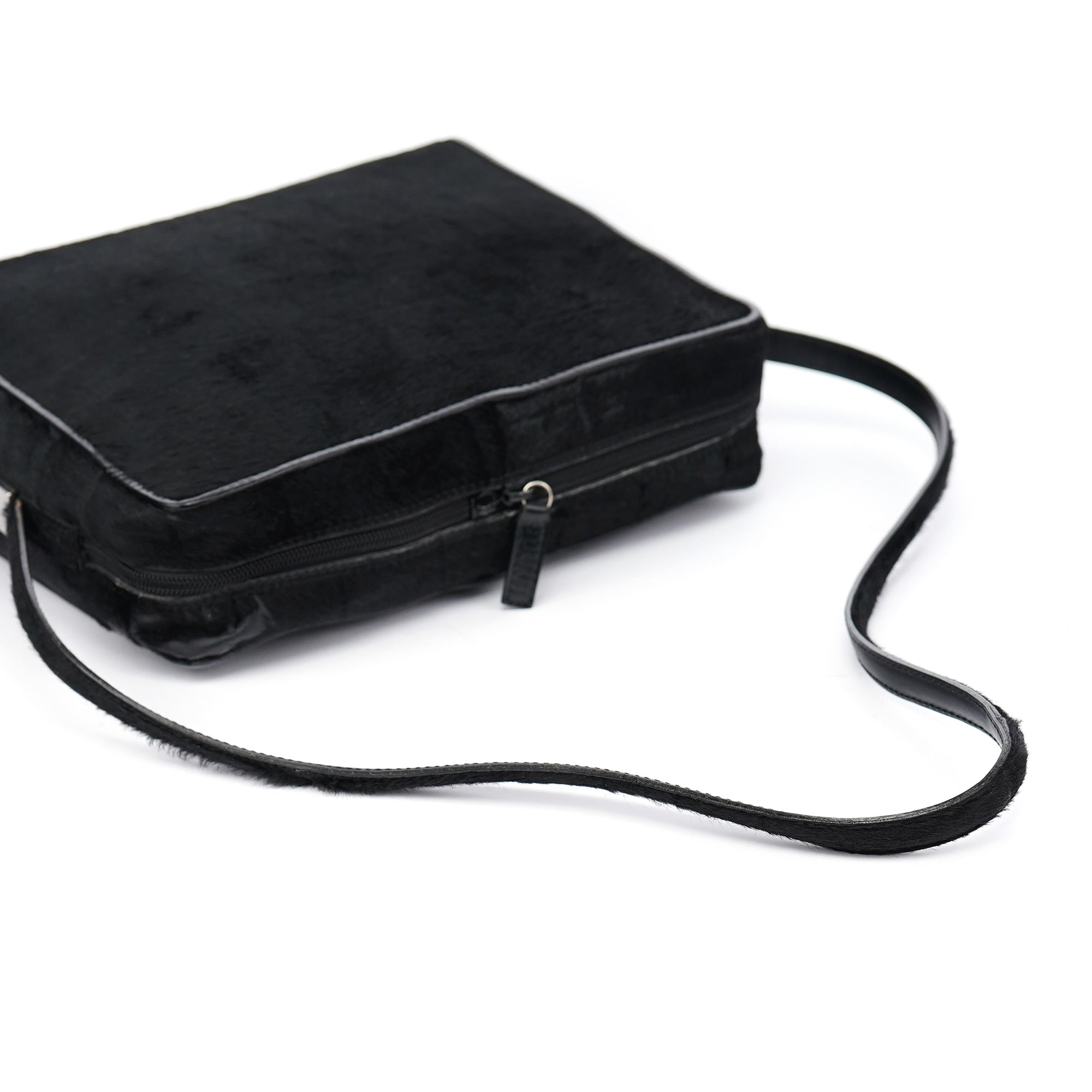 Designed in the late 1990s by Tom Ford, this rare Gucci shoulder bag features embossed calf hair leather in jet black with a subtle crocodile effect. The slim rectangular silhouette is finished with a silver-tone plaque engraved with the Gucci logo, a top zip closure, and a slim shoulder strap. The interior is lined in black leather with a single zip pocket.