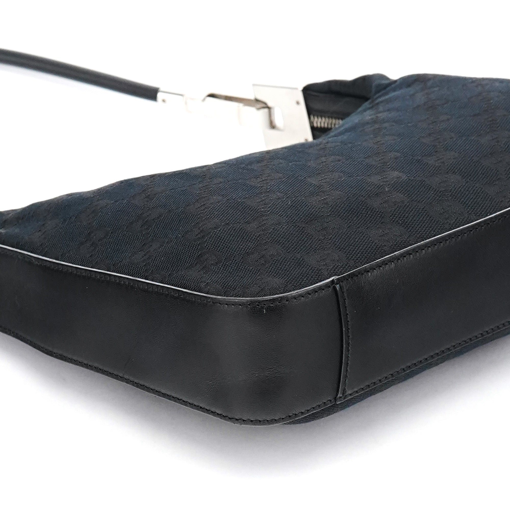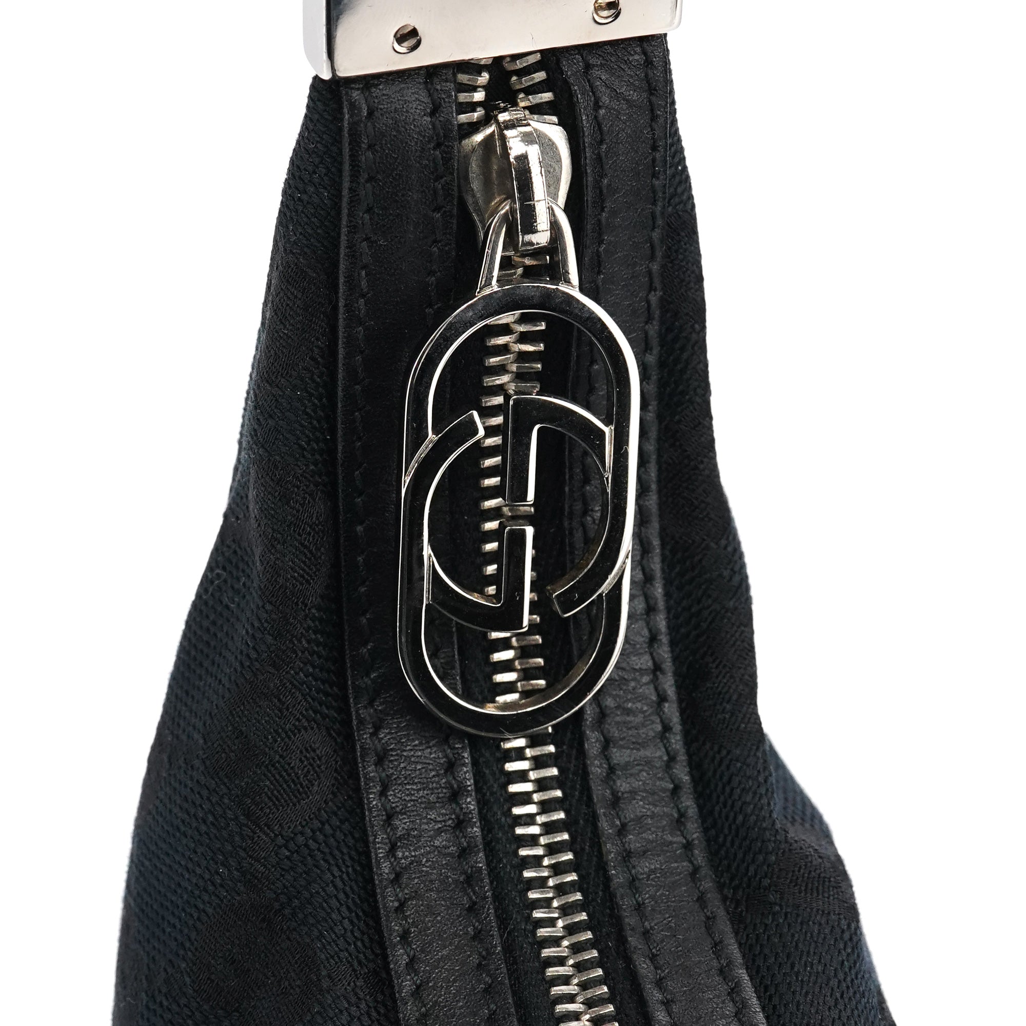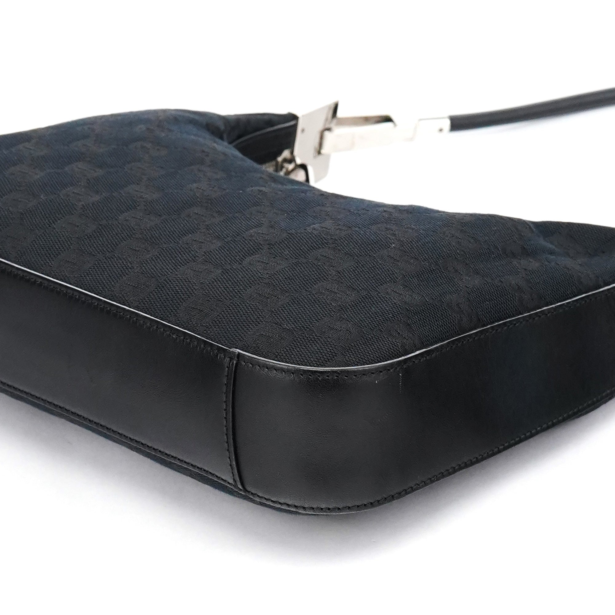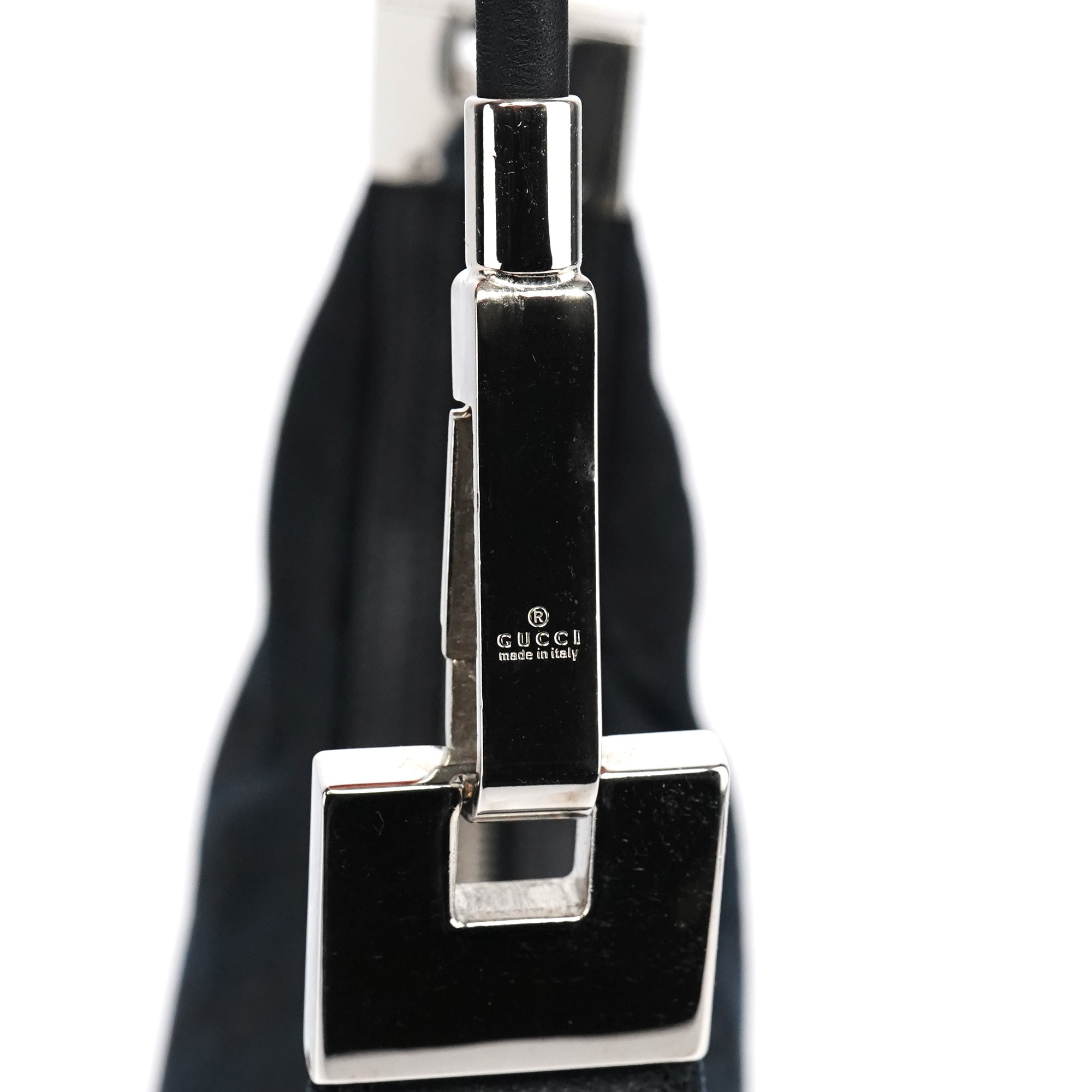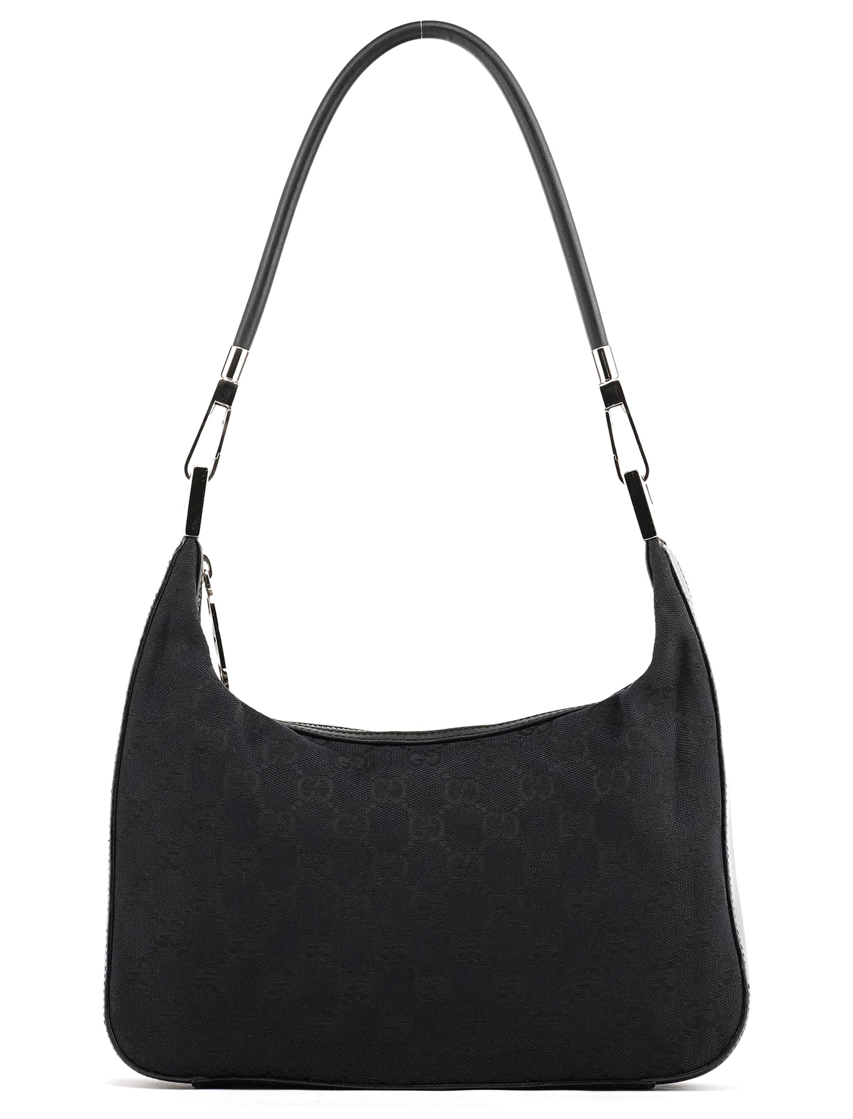 Designed in the late 1990s by Tom Ford, this Gucci GG hobo shoulder bag features black GG canvas with smooth black leather trim and sleek silver-tone hardware. Its minimalist shape and structured strap detail highlight the clean, modern aesthetic that defined the era.
