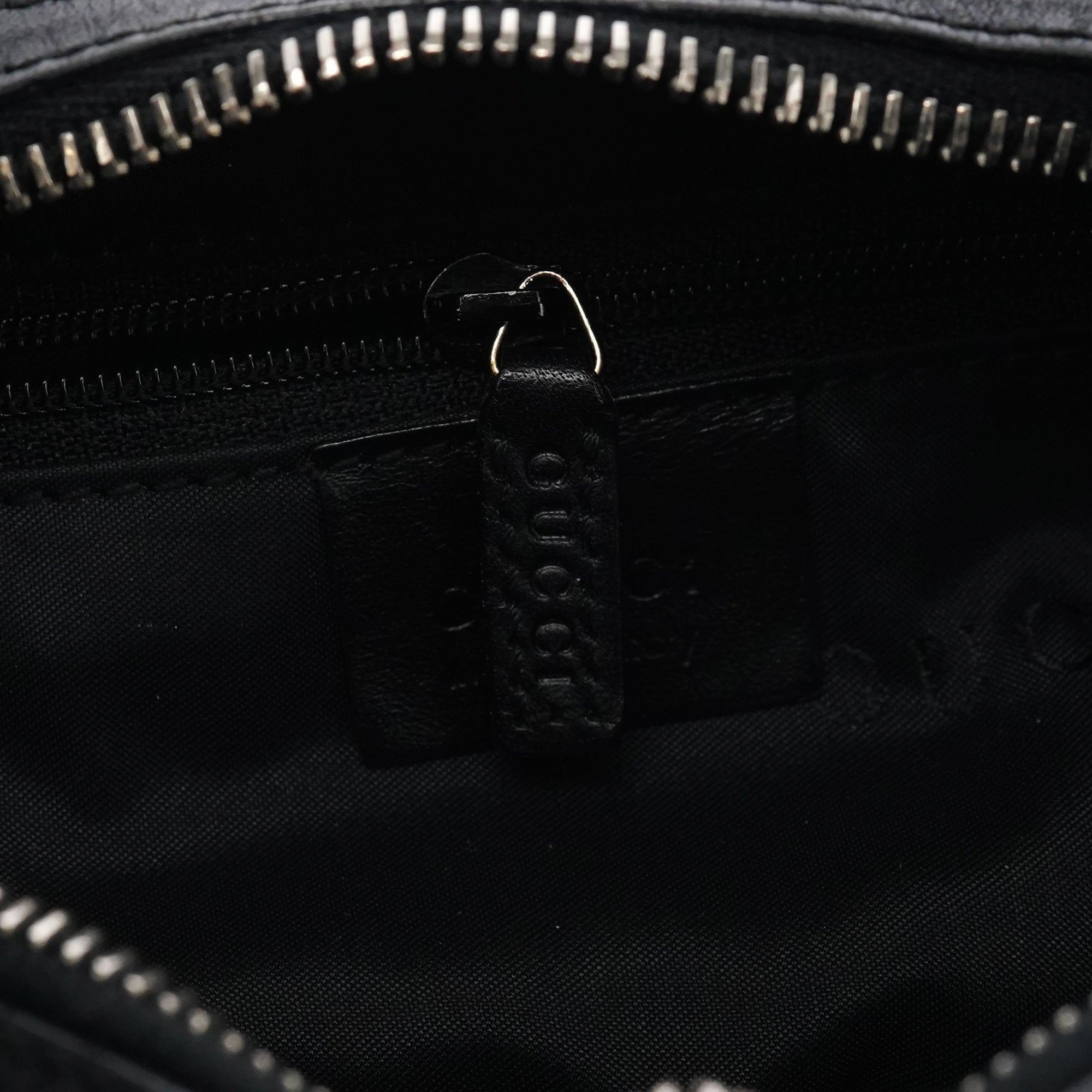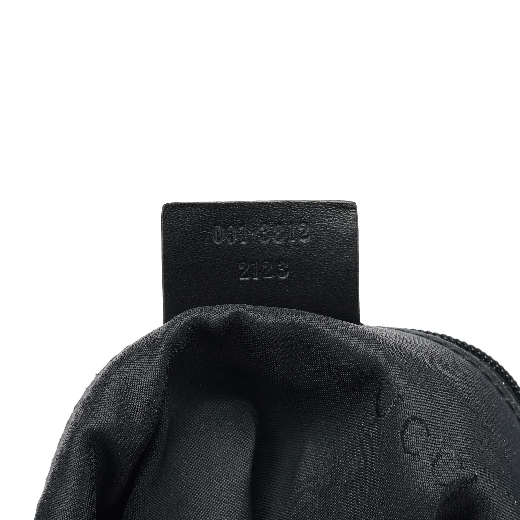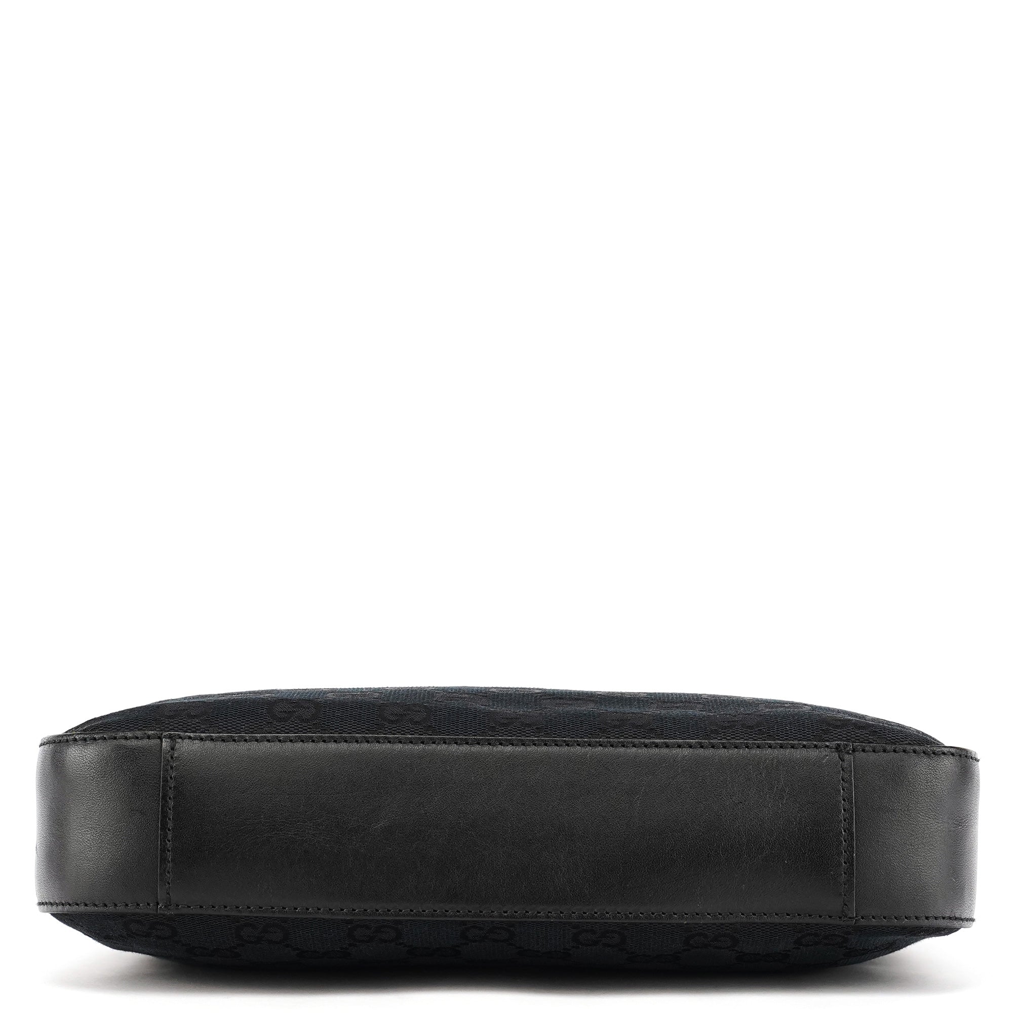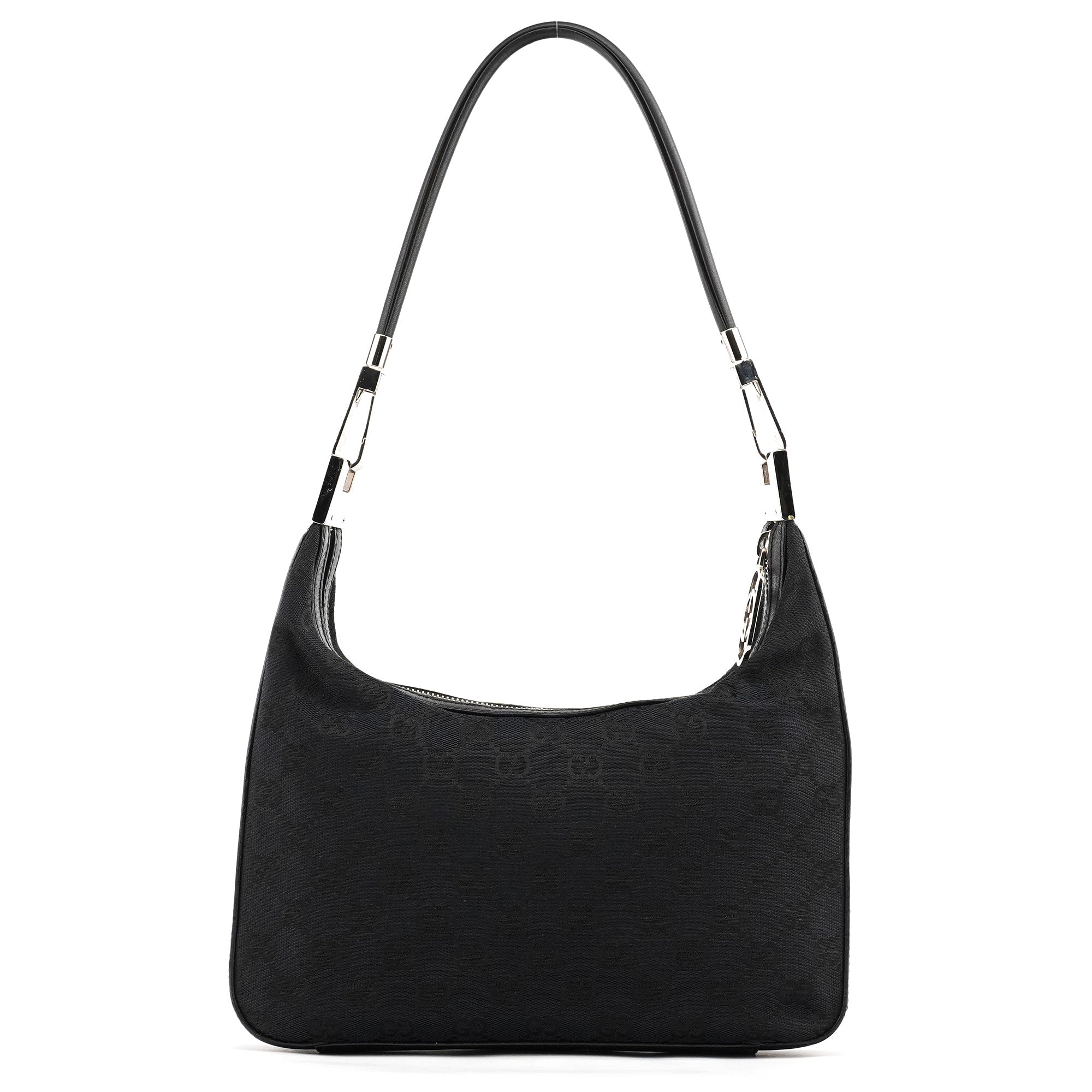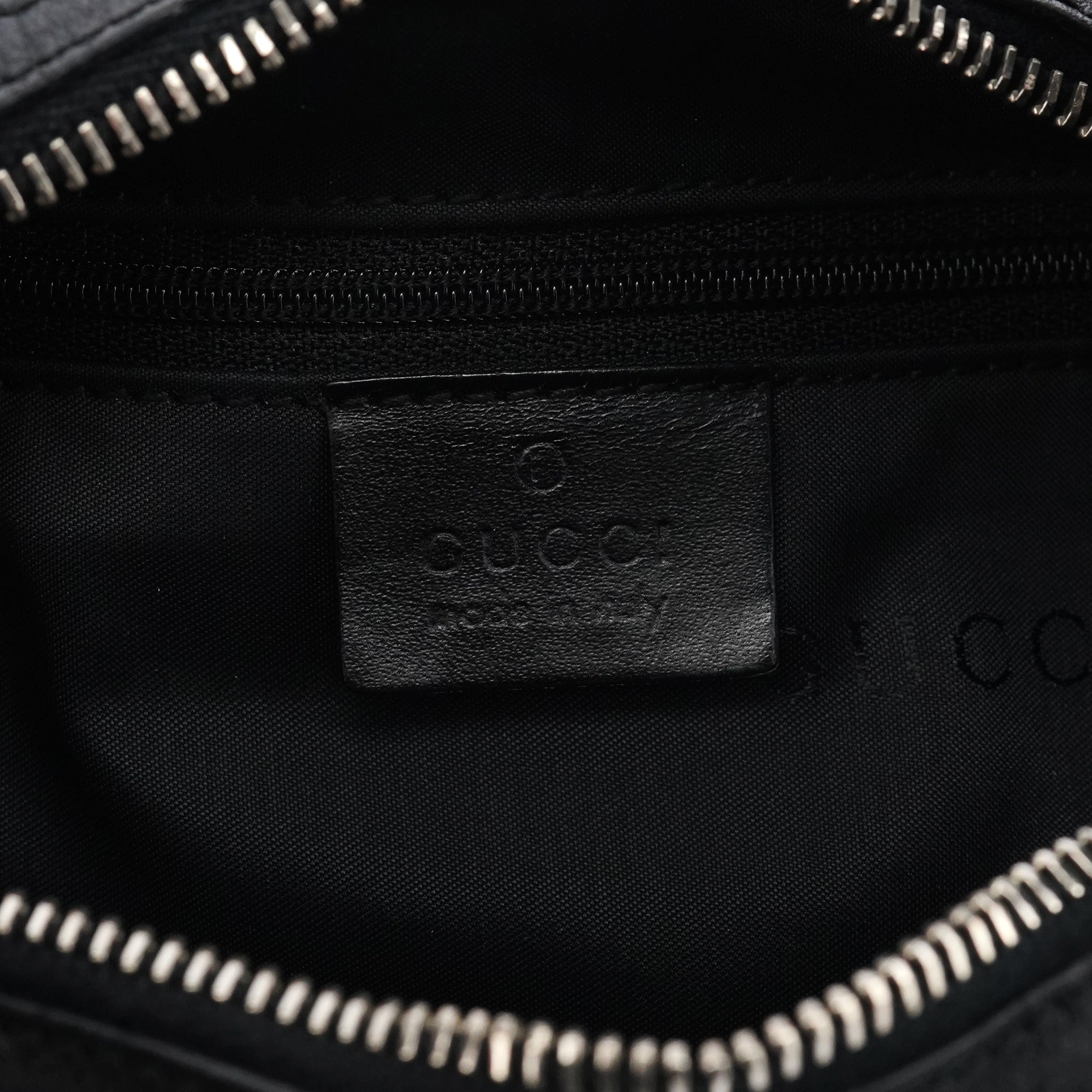 Designed in the late 1990s by Tom Ford, this Gucci GG hobo shoulder bag features black GG canvas with smooth black leather trim and sleek silver-tone hardware. Its minimalist shape and structured strap detail highlight the clean, modern aesthetic that defined the era.
