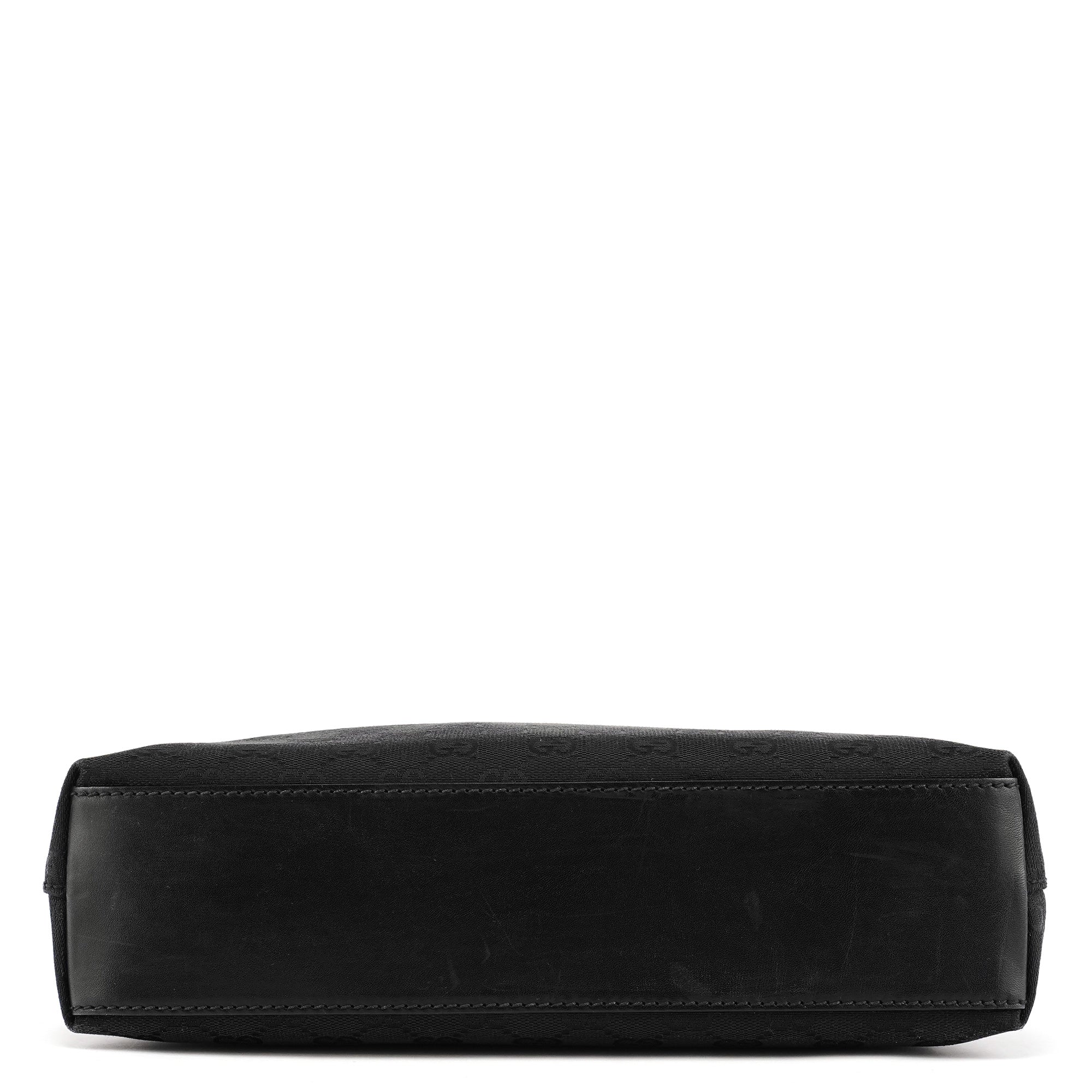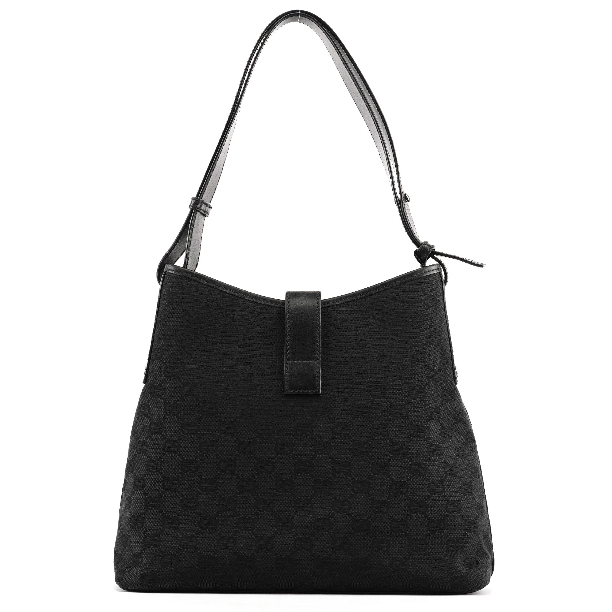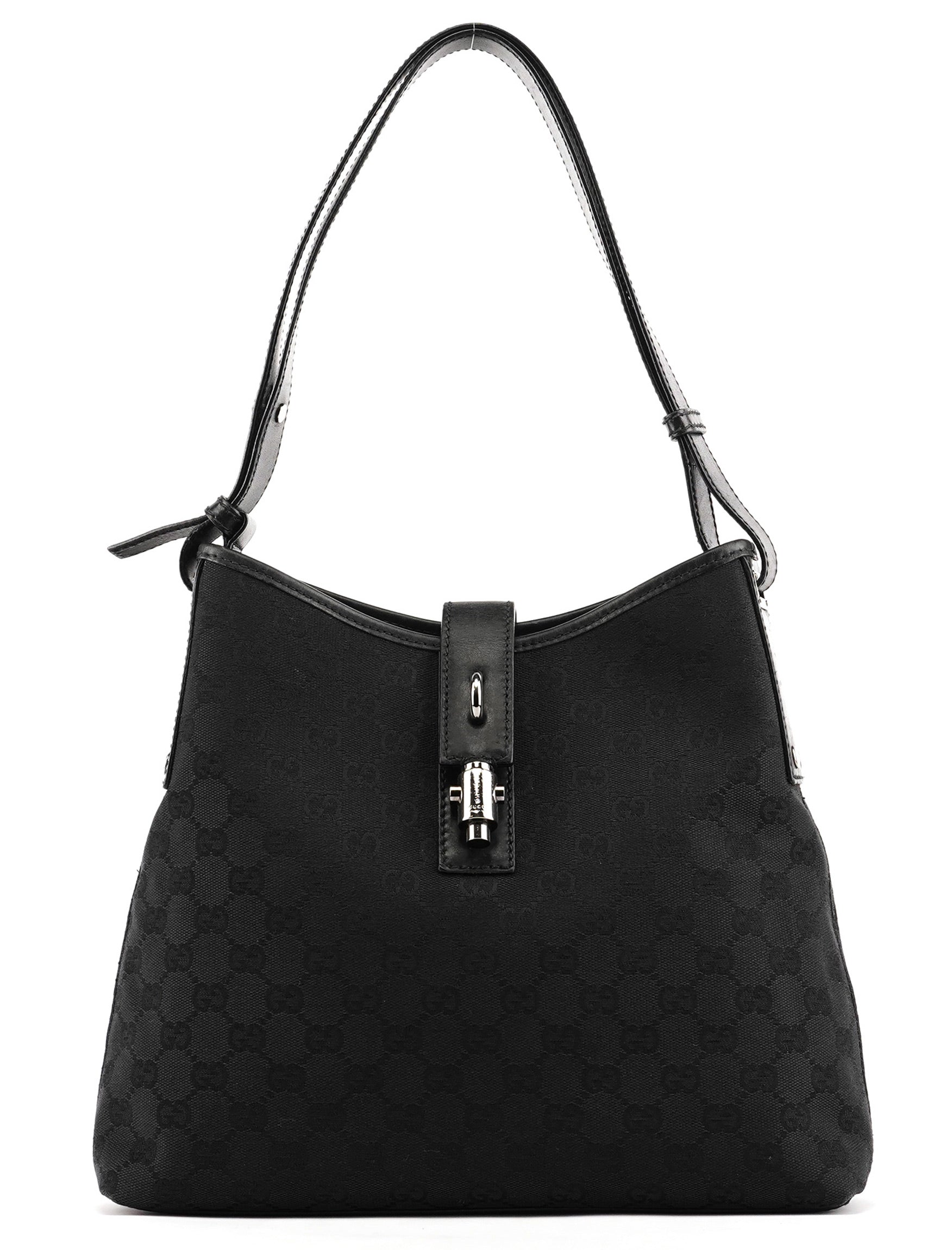 Designed in the early 2000s by Tom Ford, this Gucci Jackie bag is crafted from black GG canvas with leather trim and silver hardware. The signature piston lock closure and curved silhouette reflect Ford’s refined, sensual approach to the house’s heritage designs.