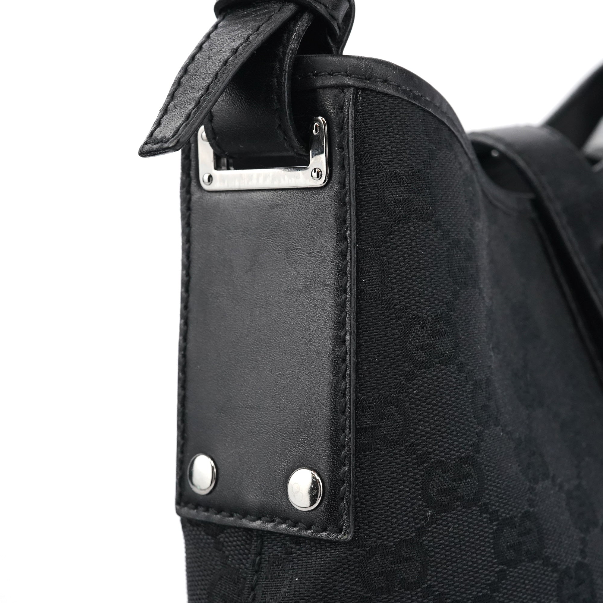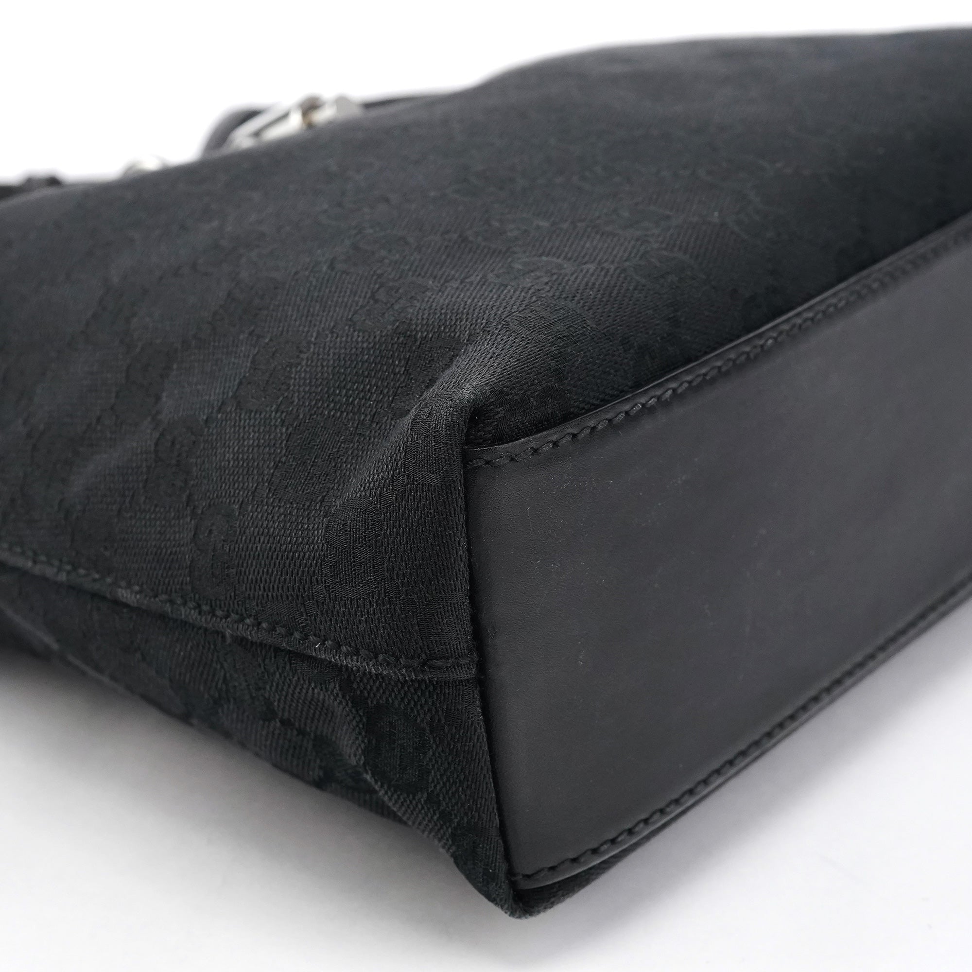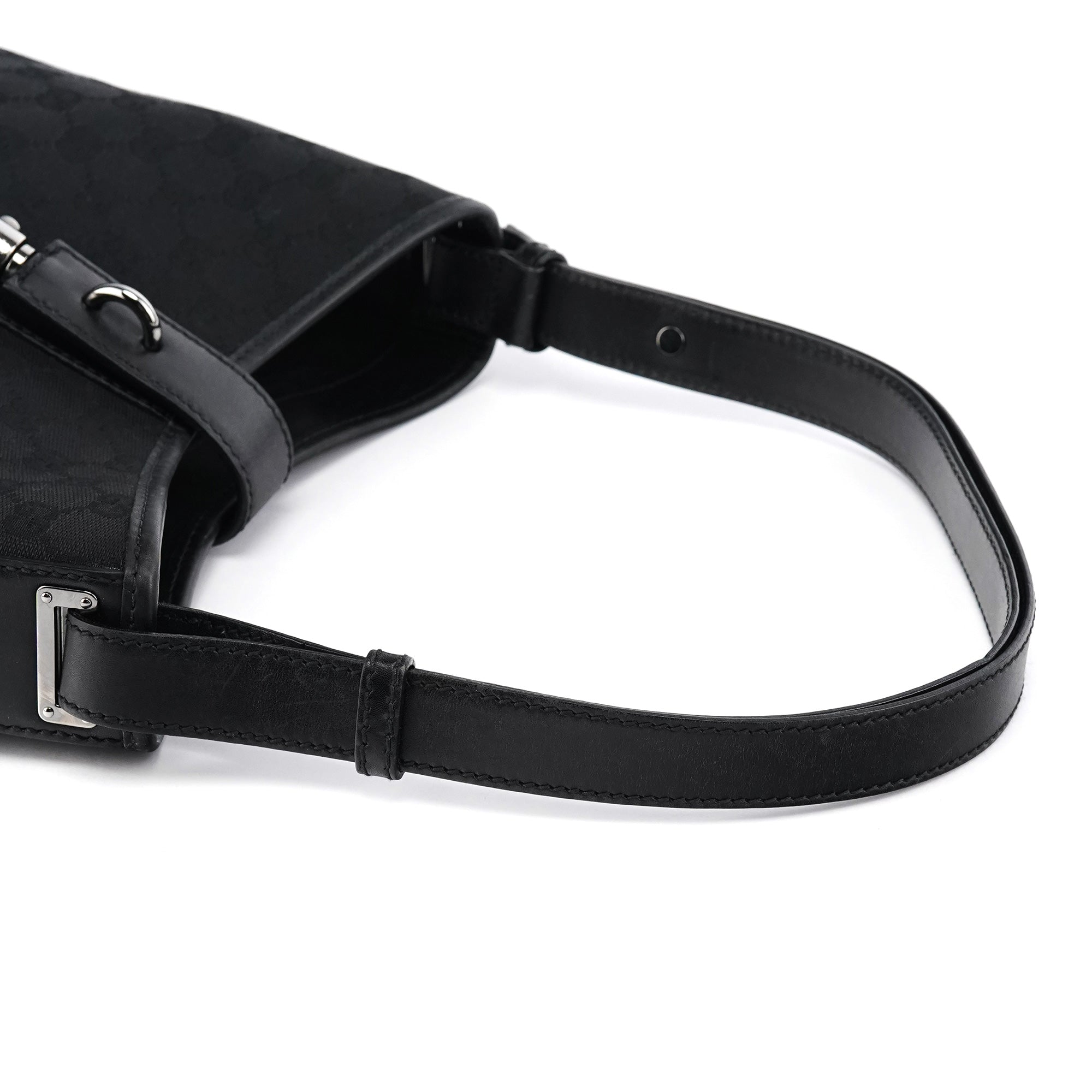 Designed in the early 2000s by Tom Ford, this Gucci Jackie bag is crafted from black GG canvas with leather trim and silver hardware. The signature piston lock closure and curved silhouette reflect Ford’s refined, sensual approach to the house’s heritage designs.