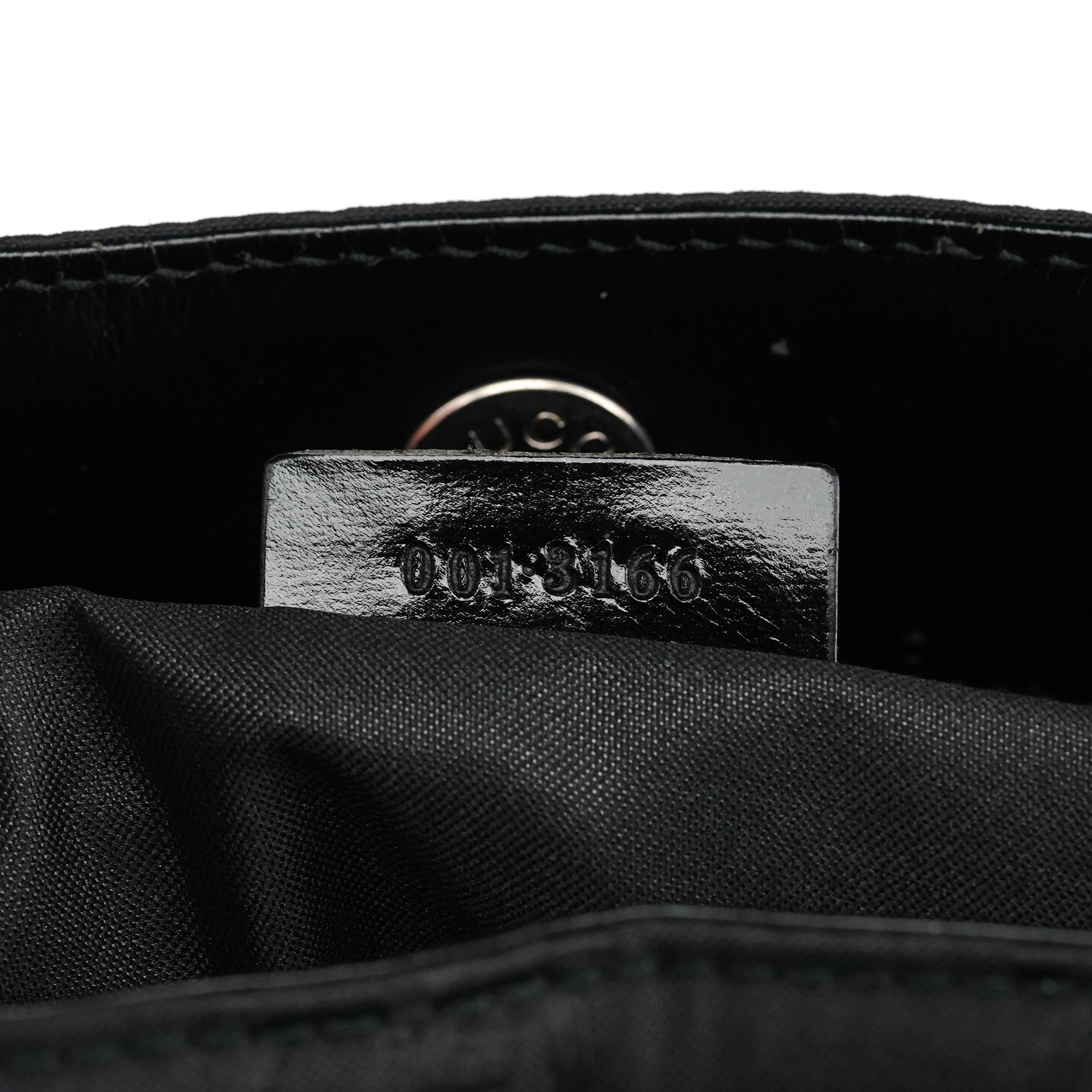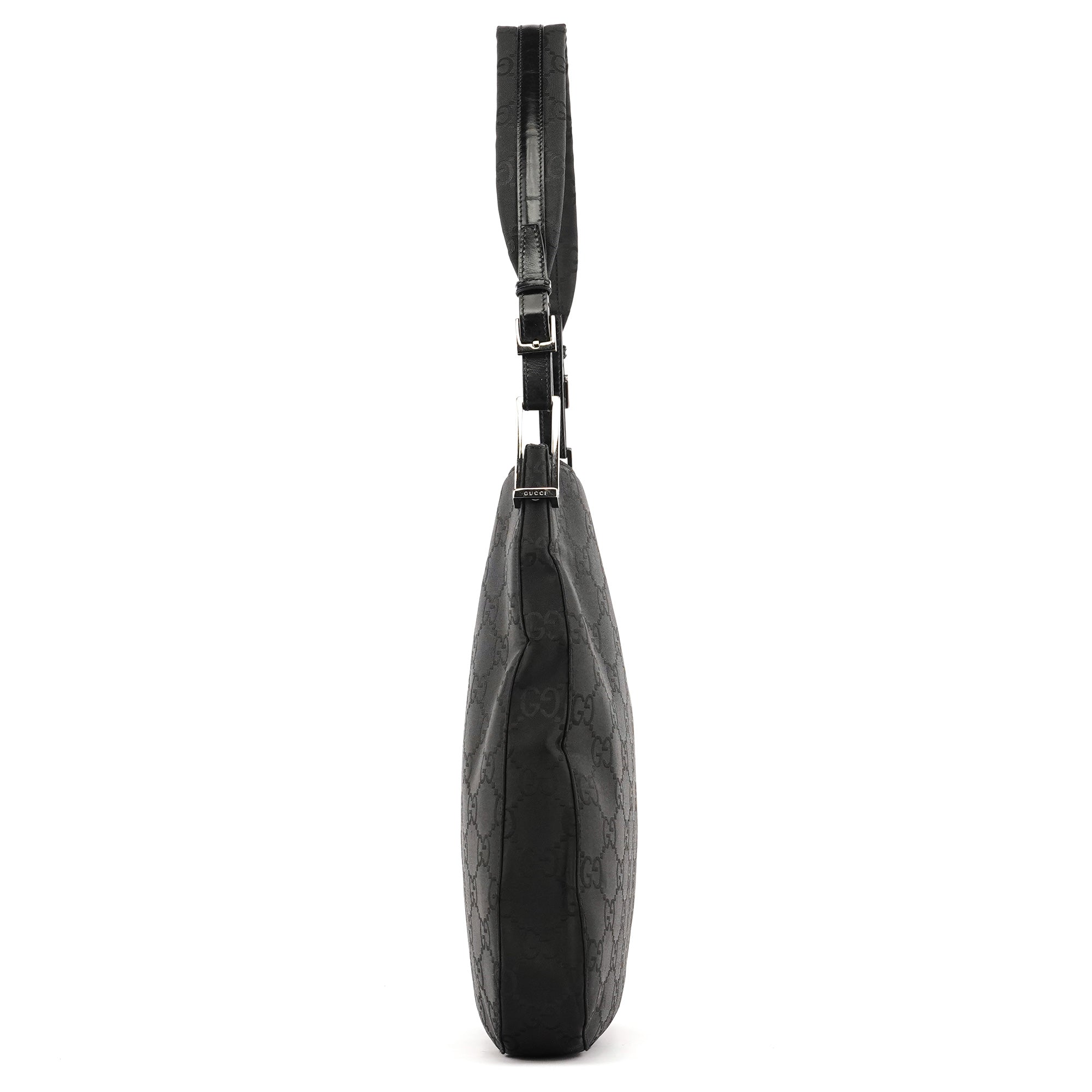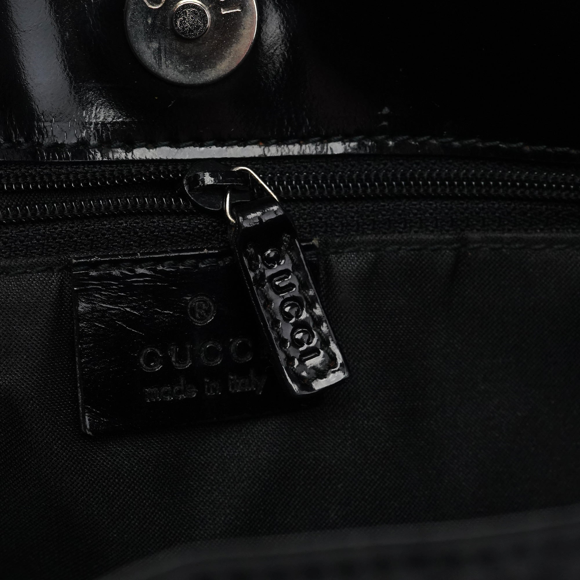 Designed in the late 1990s by Tom Ford, this Gucci shoulder bag is crafted from black GG monogram canvas with patent leather trim and silver hardware. It features an adjustable shoulder strap with buckle detailing, a magnetic closure, and a fabric-lined interior with a zip pocket and leather logo tag.