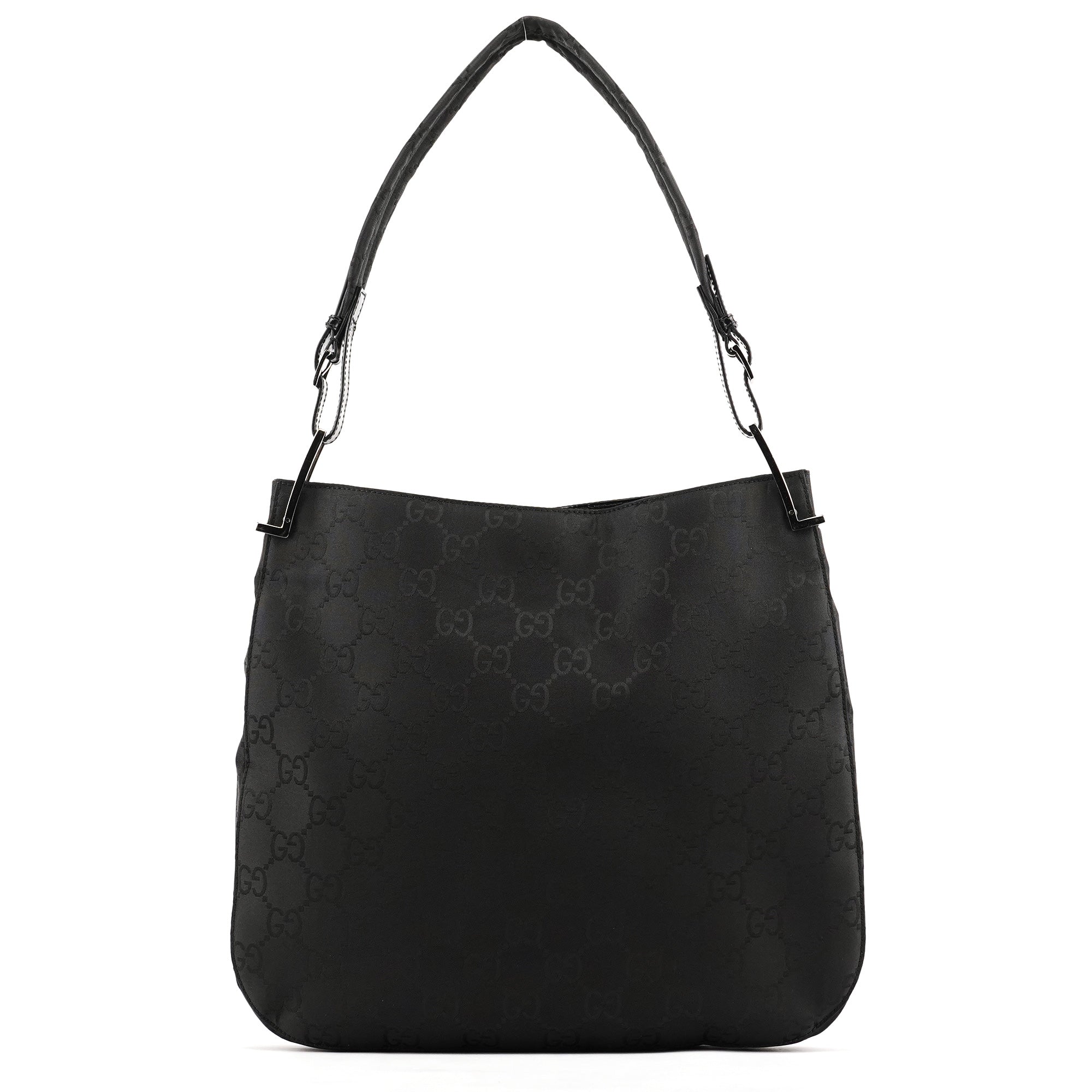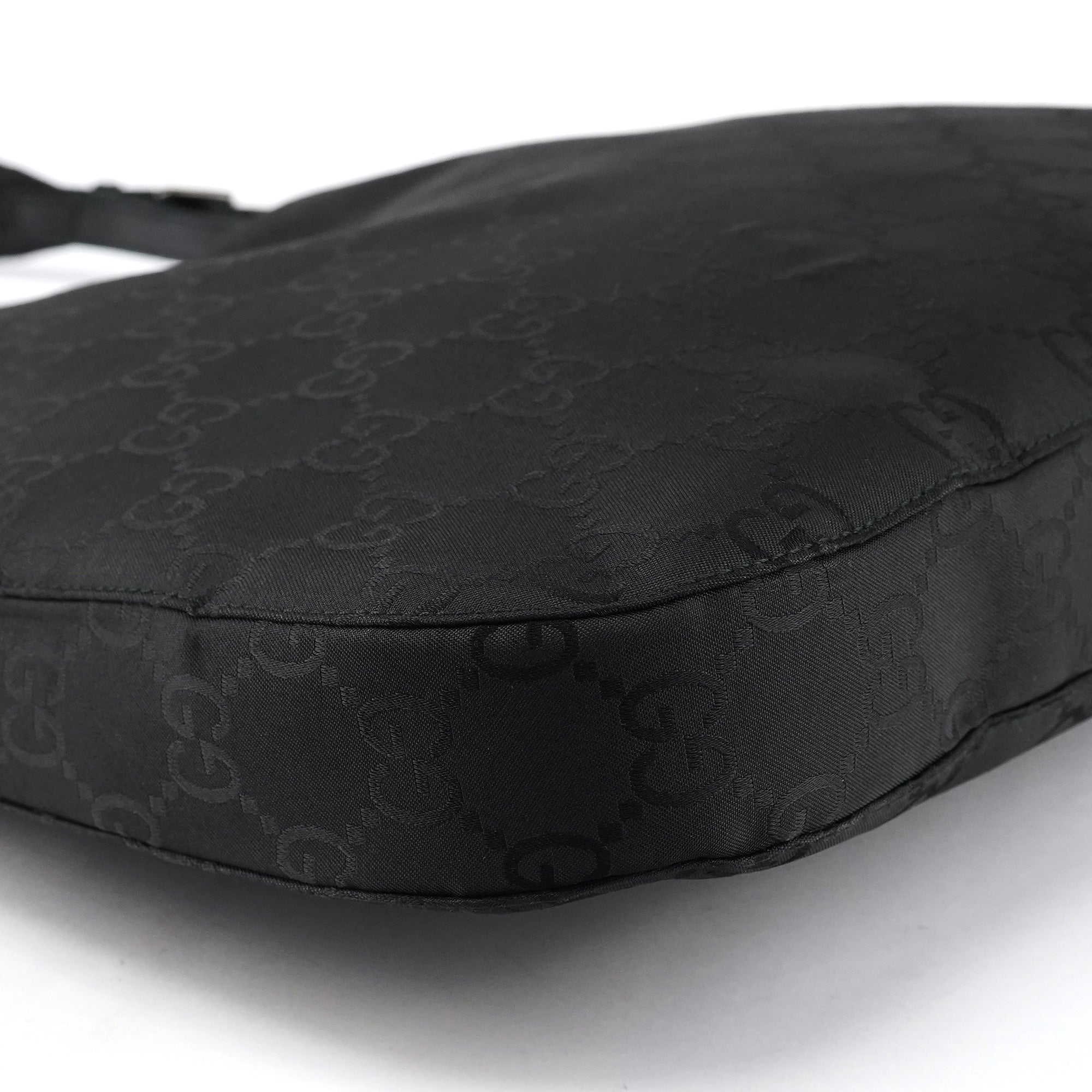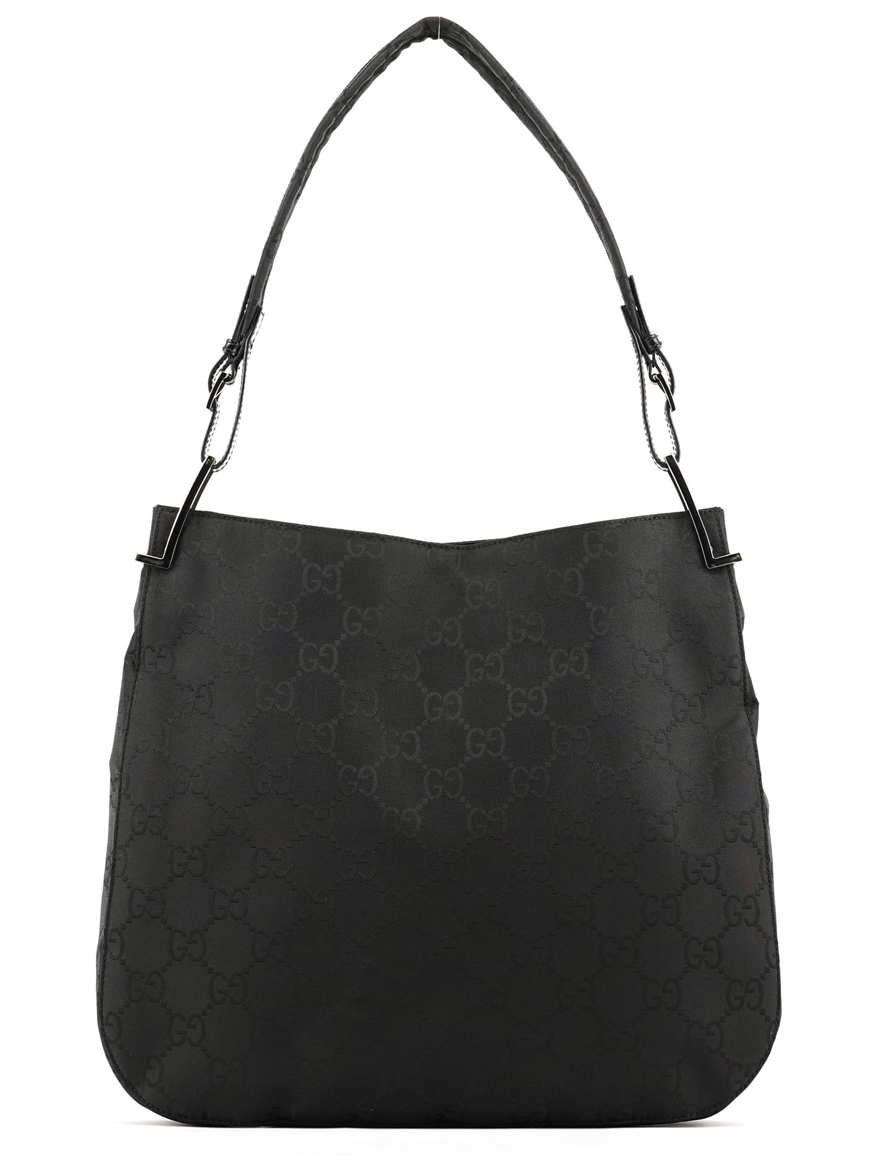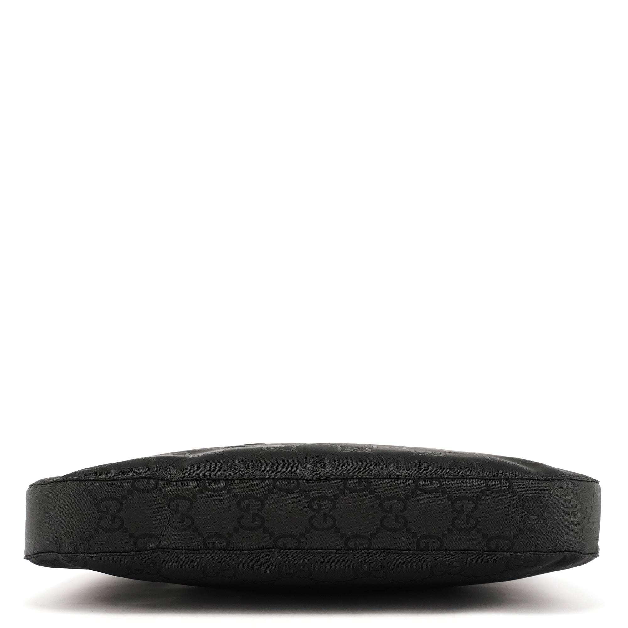 Designed in the late 1990s by Tom Ford, this Gucci shoulder bag is crafted from black GG monogram canvas with patent leather trim and silver hardware. It features an adjustable shoulder strap with buckle detailing, a magnetic closure, and a fabric-lined interior with a zip pocket and leather logo tag.
