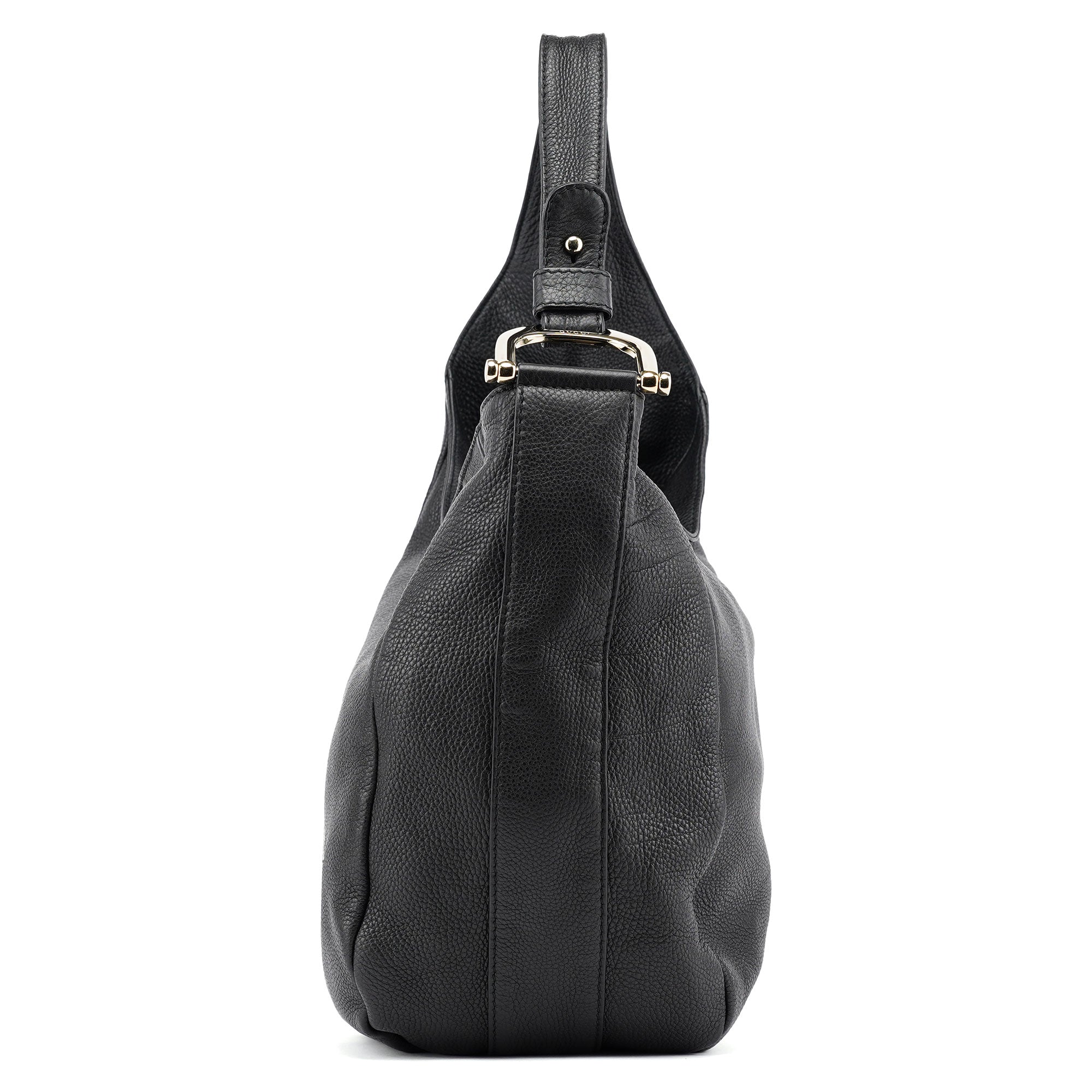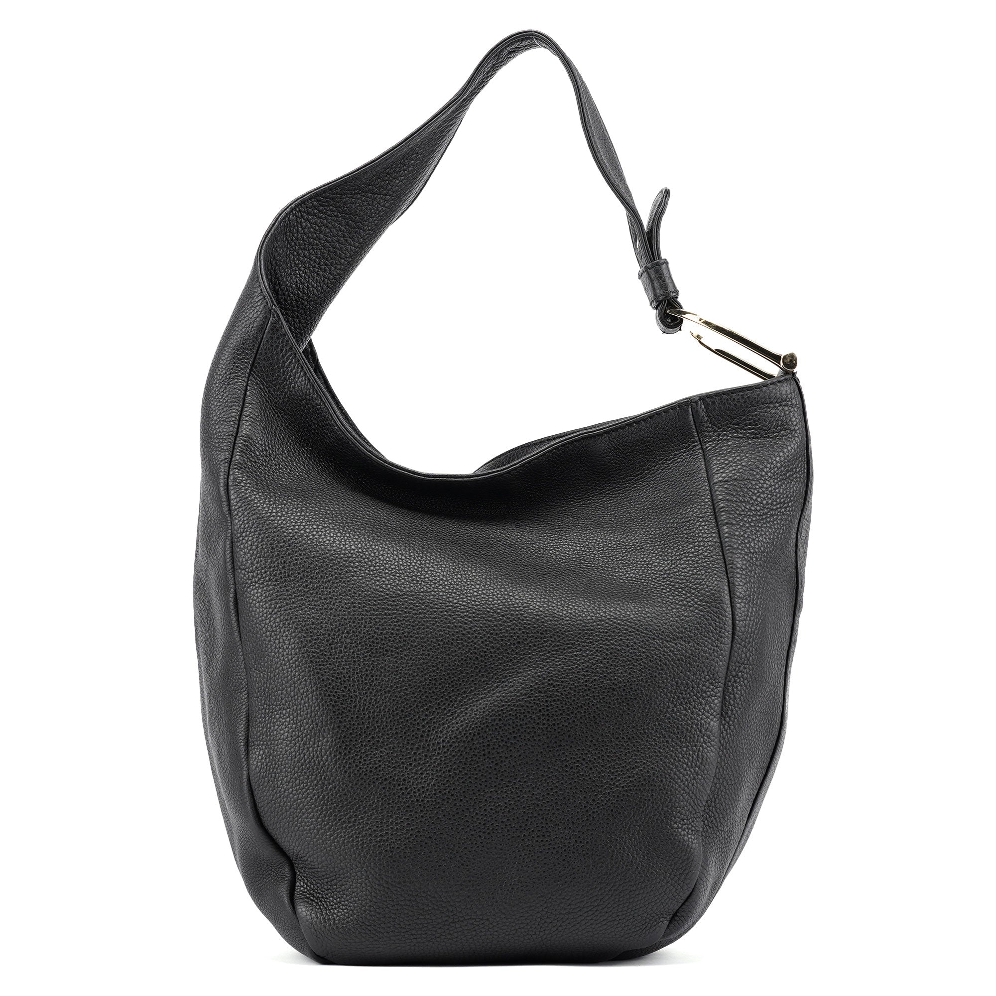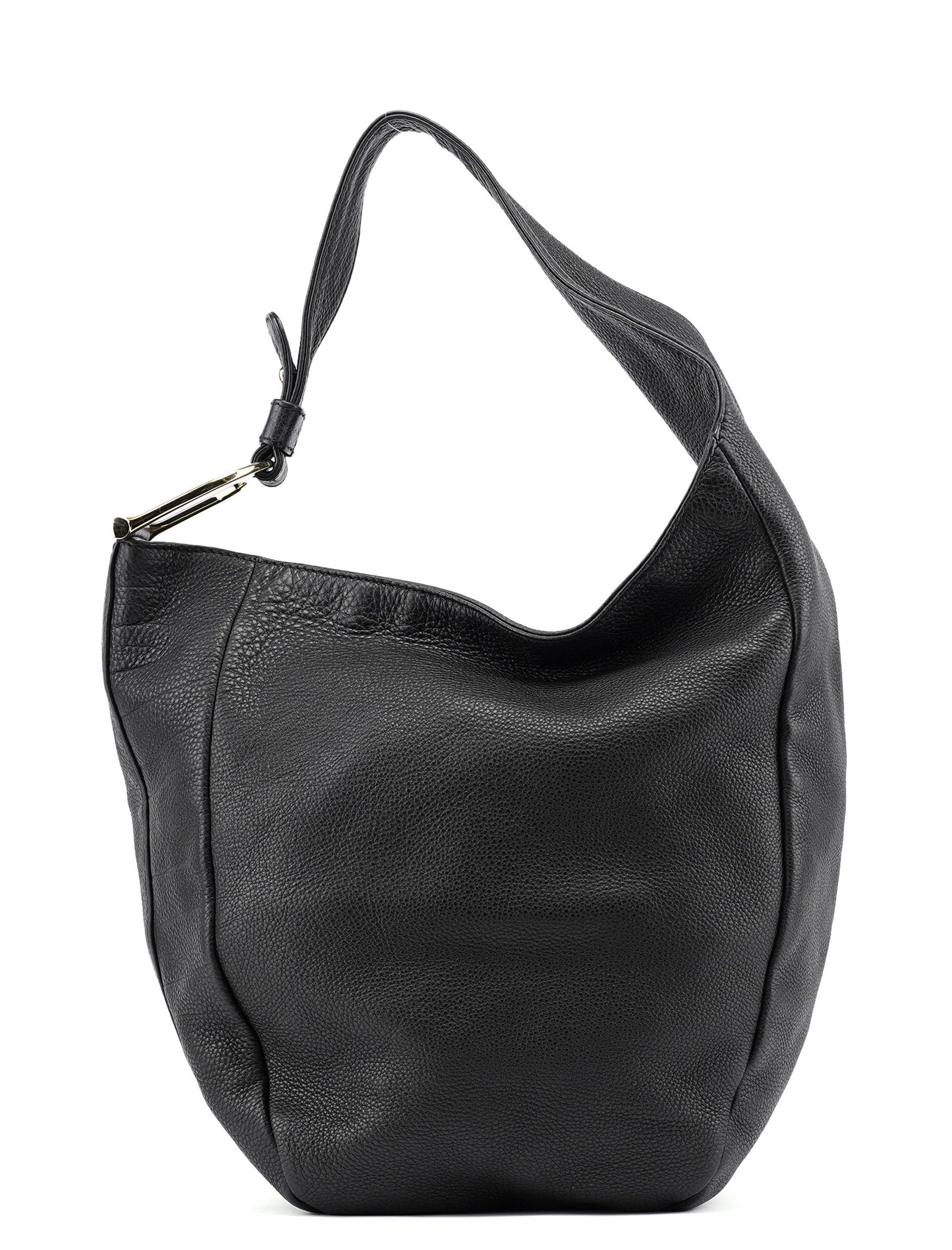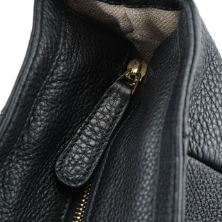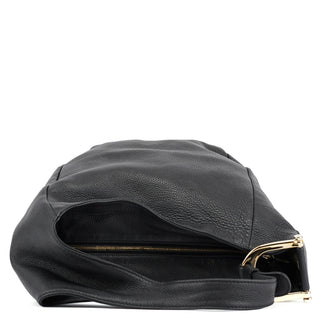 Handcrafted in black leather and designed by Tom Ford, this Gucci Hobo bag features gold-tone hardware with Gucci logo engraving and an asymmetrical shoulder strap. It's secured with a zipper closure and boasts a cotton canvas-lined interior with an interior zipper pocket.