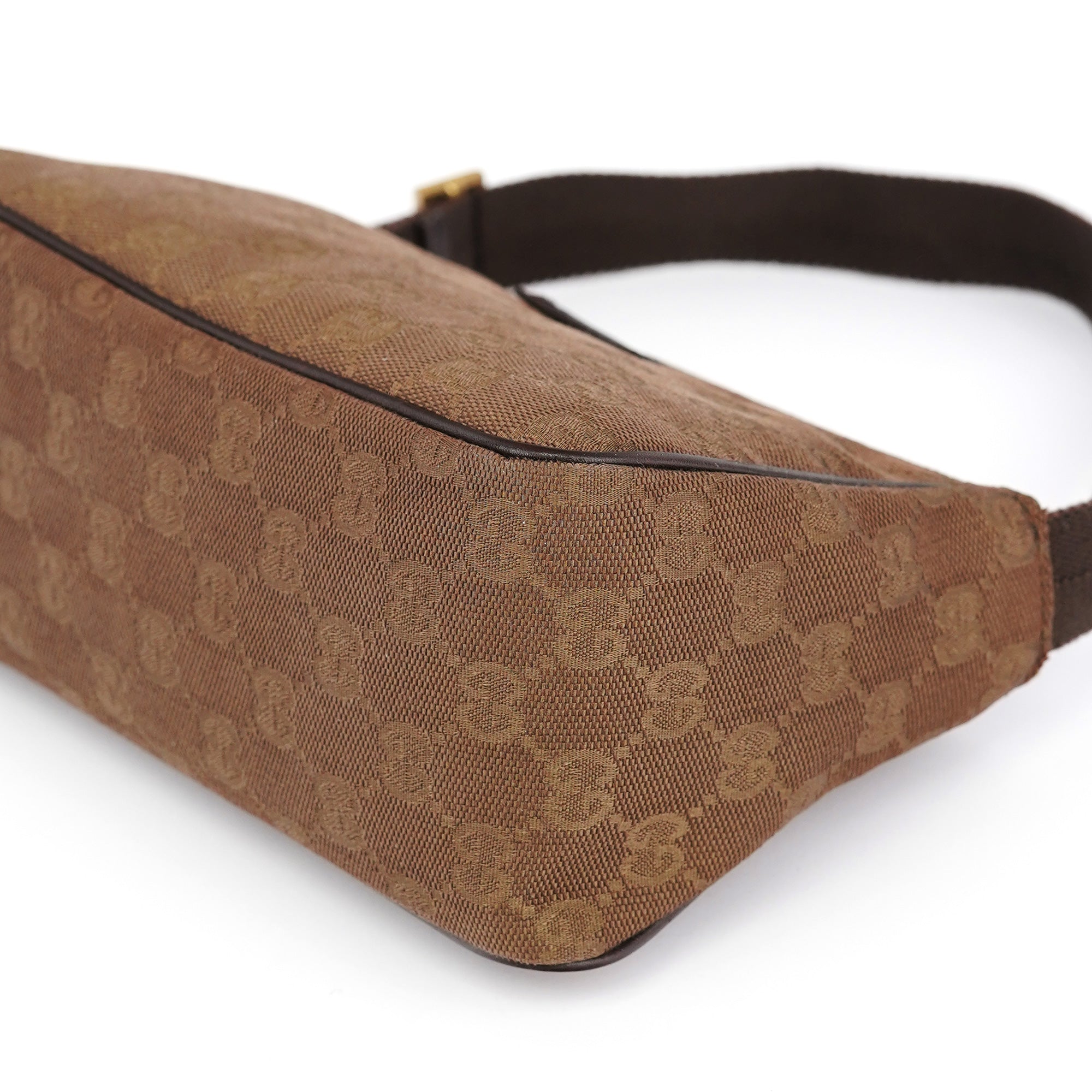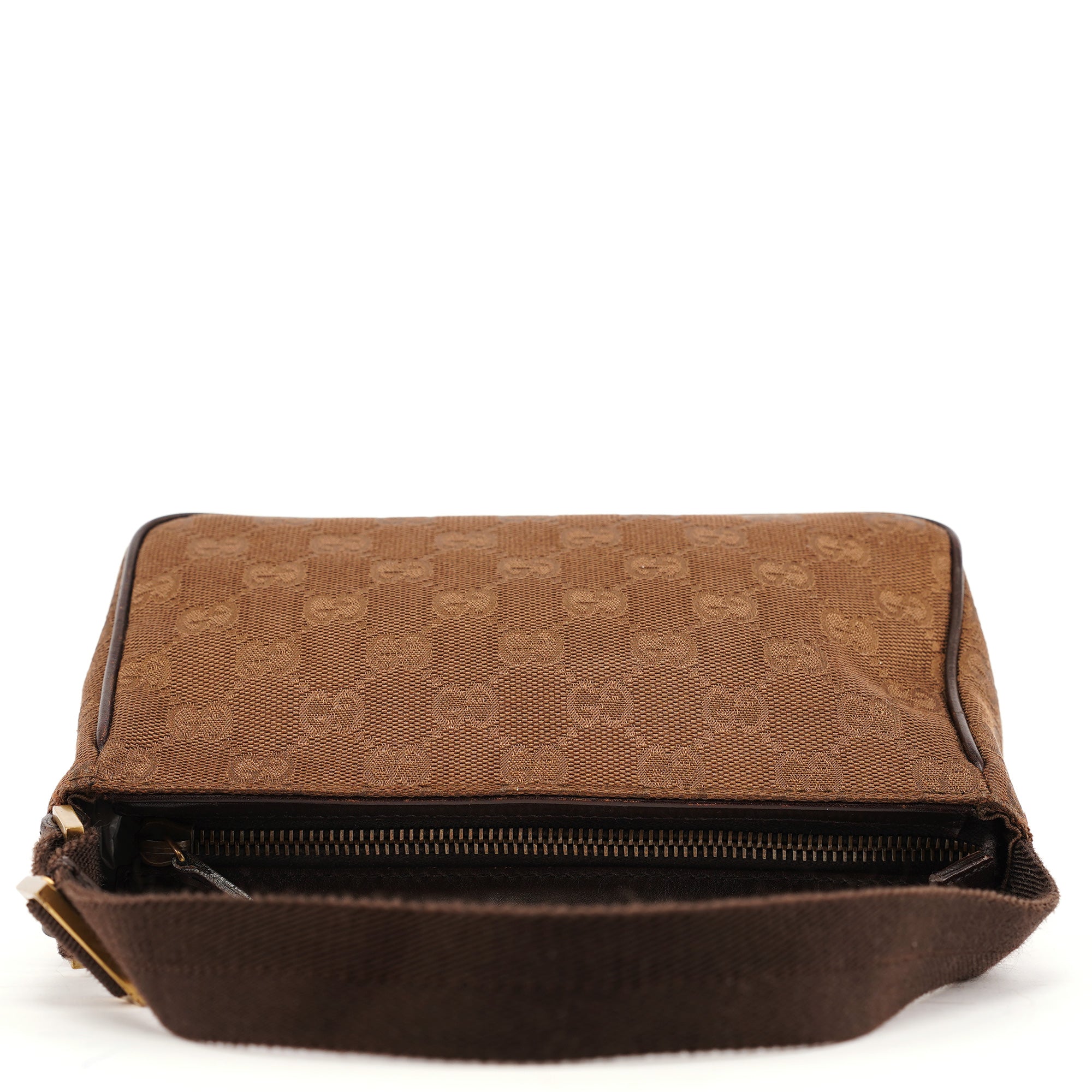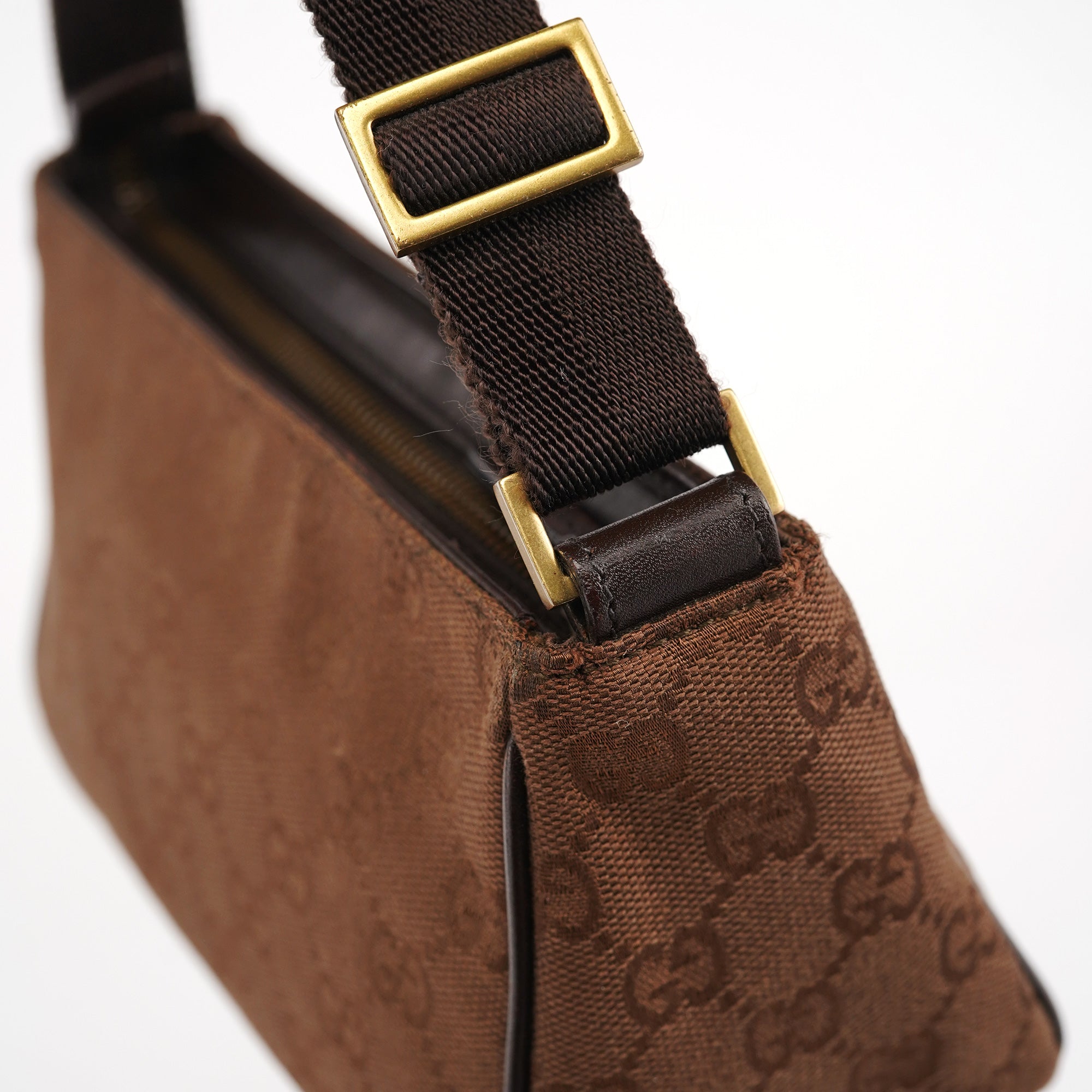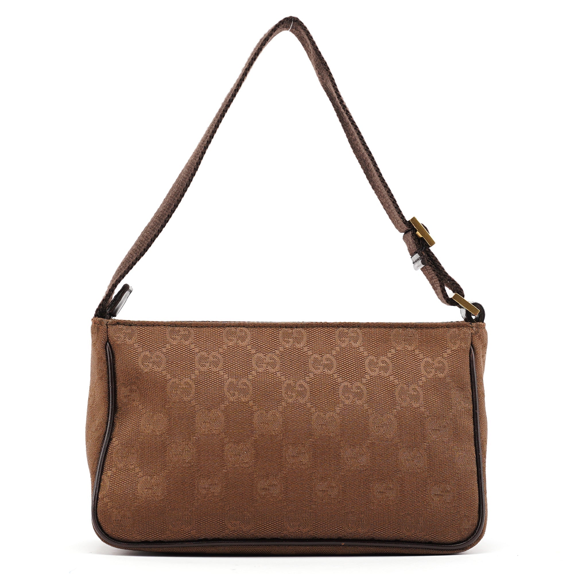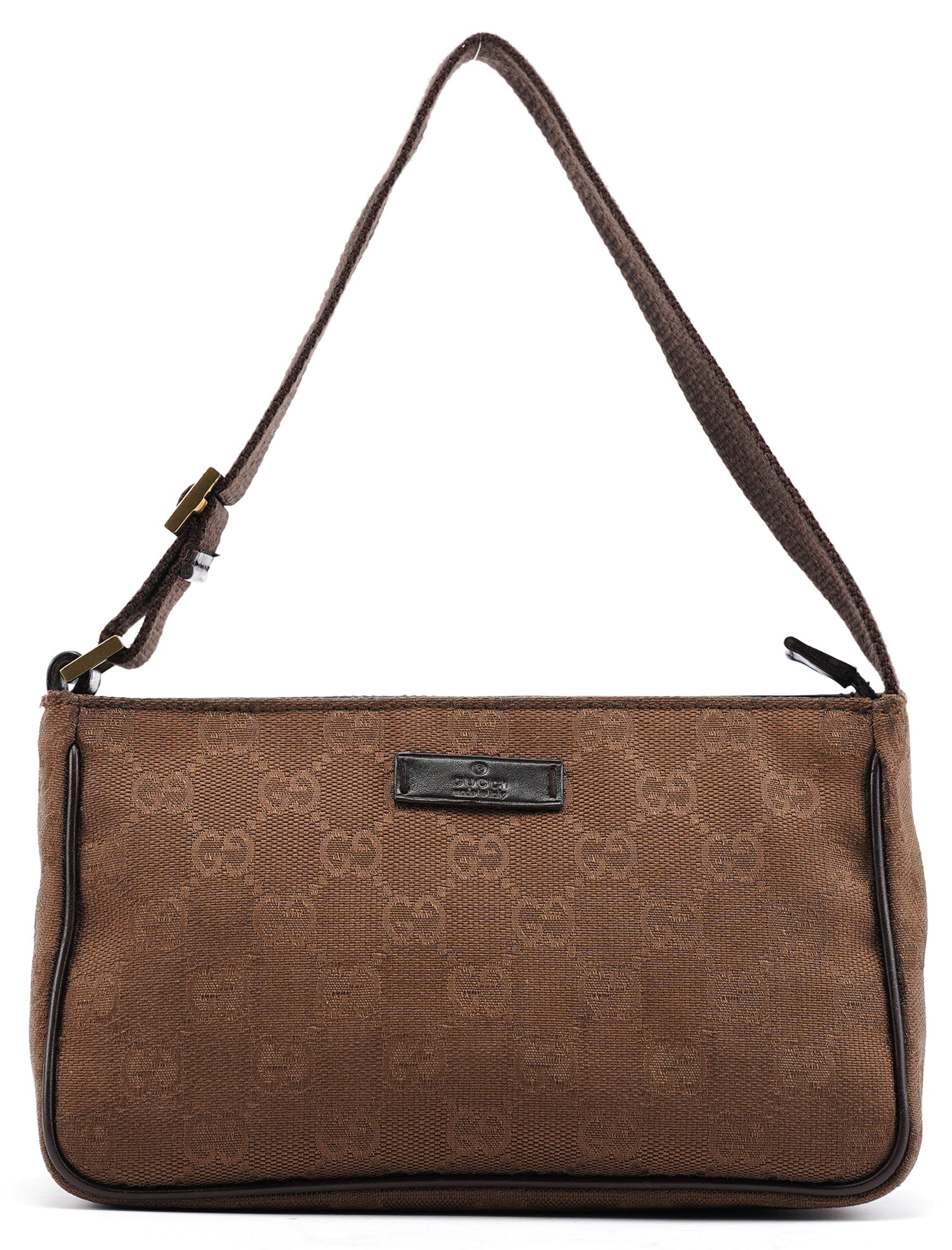 Designed in the early 2000's by Tom Ford, this vintage Gucci shoulder bag features brown GG canvas with dark brown leather trim. The compact crossbody silhouette includes an adjustable canvas shoulder strap with leather accents and a top zip closure. The front is accented by a leather Gucci label, while the fabric-lined interior offers practical storage.