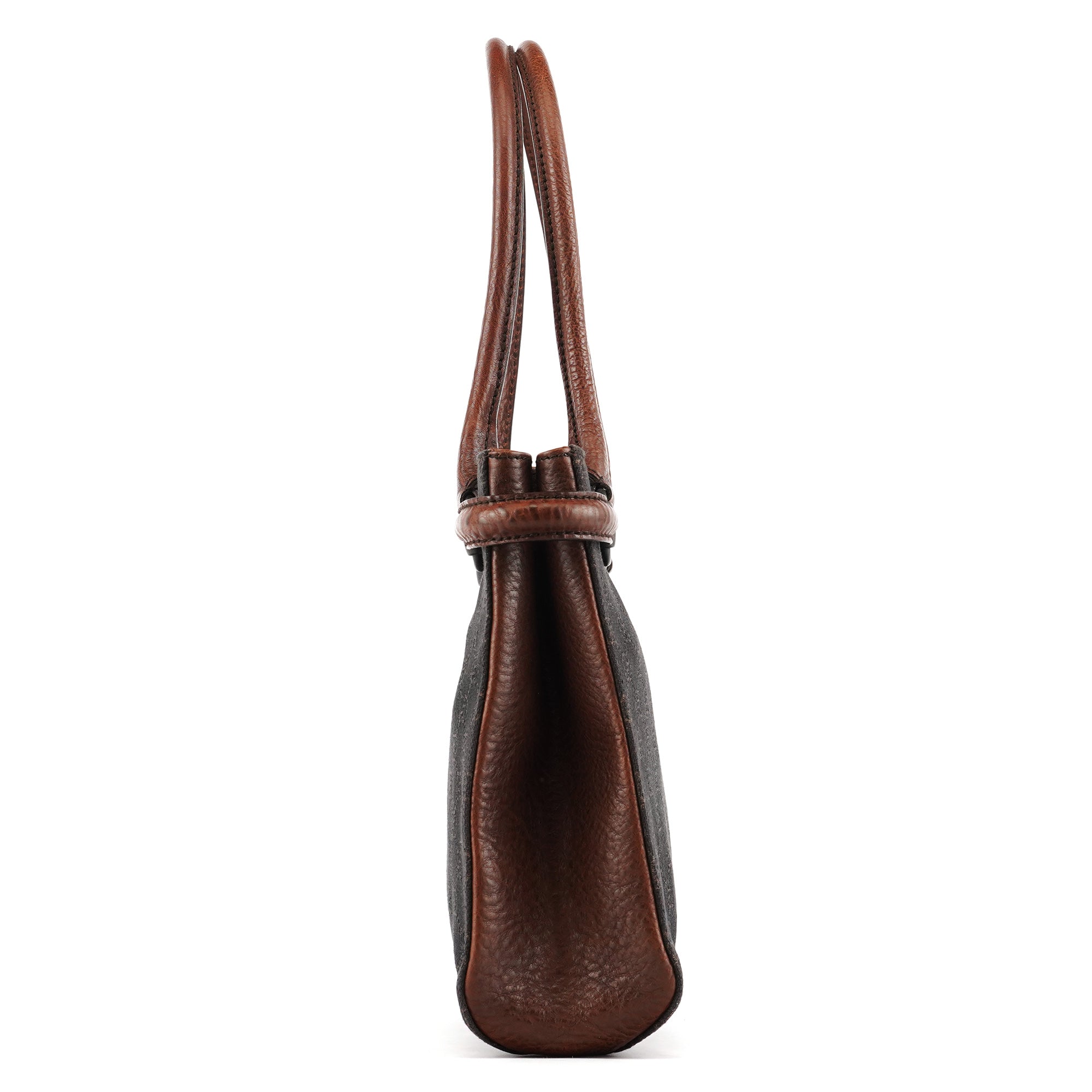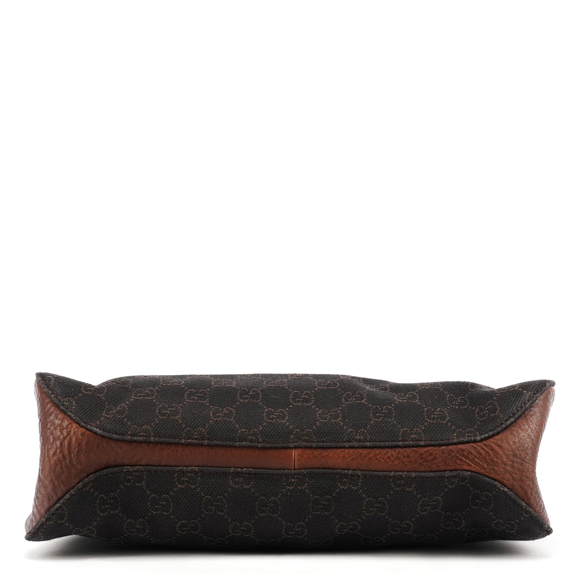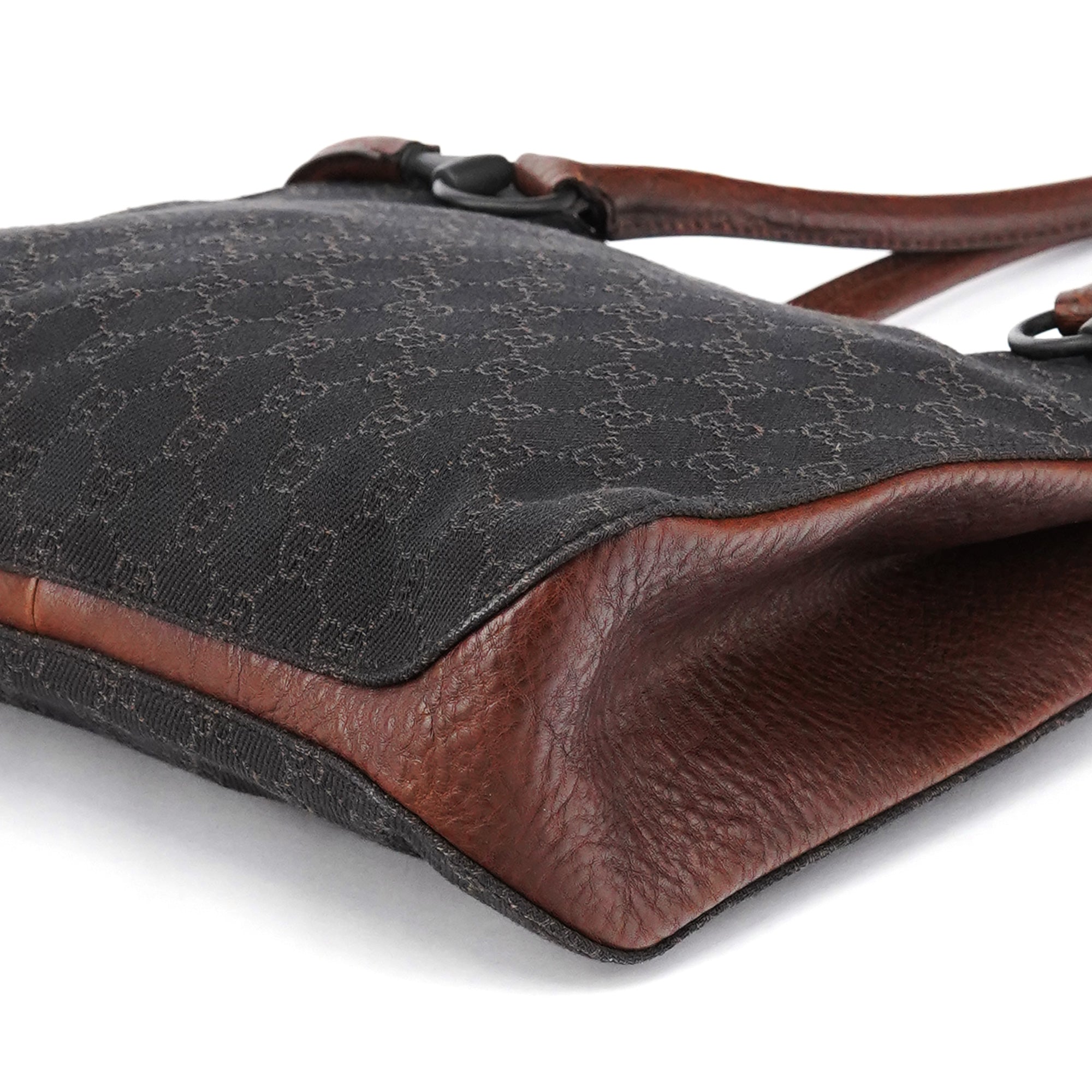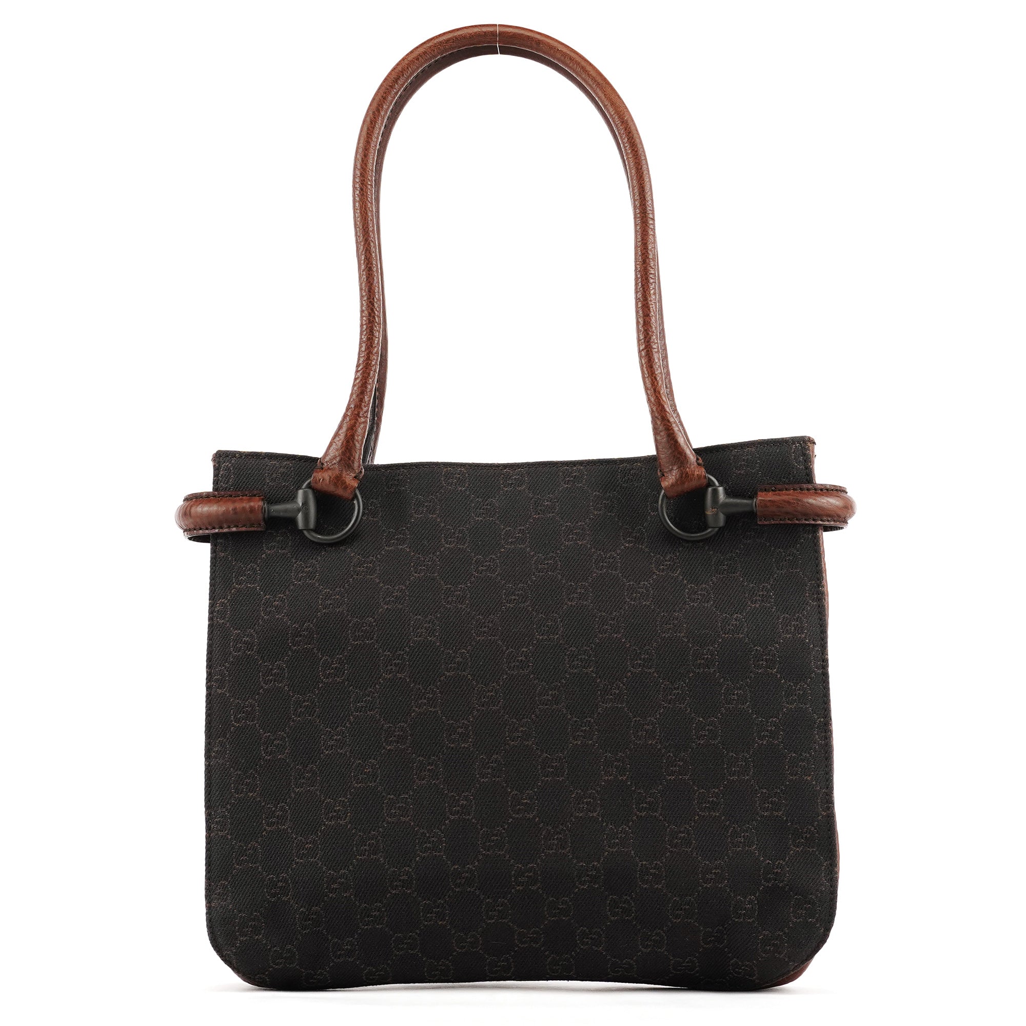 Designed in the early 2000s by Tom Ford, this Gucci GG Horsebit tote is crafted in brown GG canvas with matching leather side panels and long rolled top handles anchored by signature equestrian-inspired hardware. The open-top silhouette features a spacious interior lined in dark textile with a zip pocket for essentials and reinforced leather trim throughout.