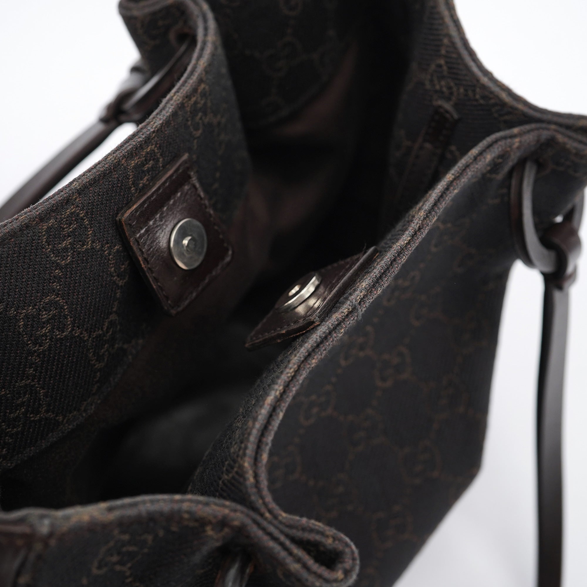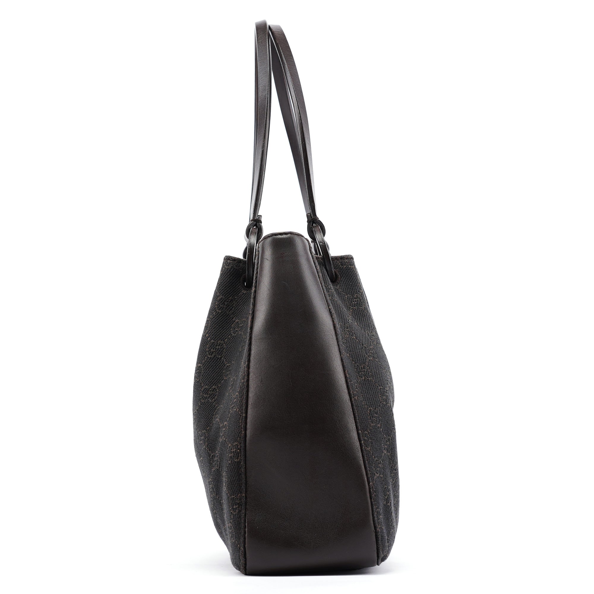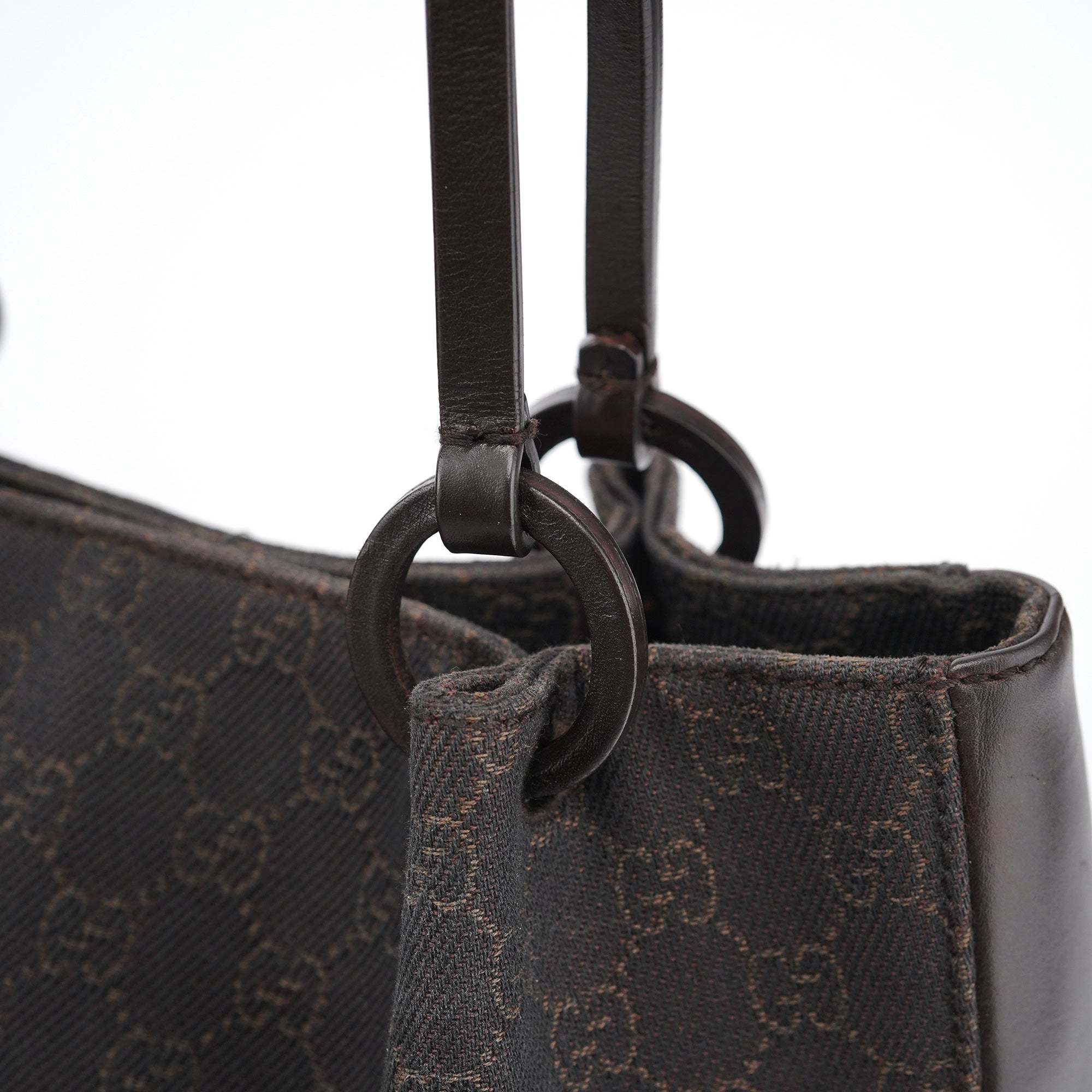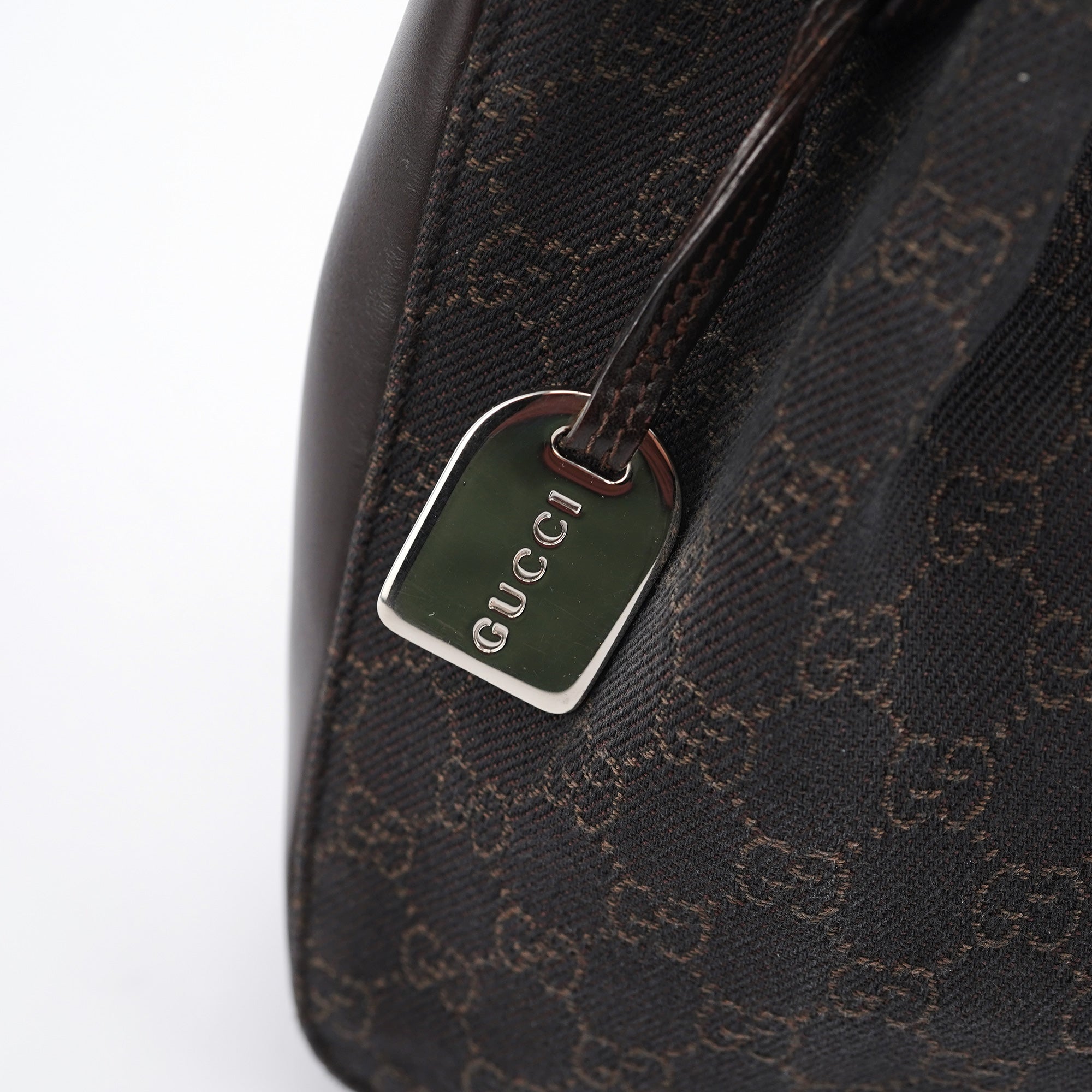 Designed in the early 2000's by Tom Ford, this vintage Gucci tote bag features the house's signature GG denim canvas in dark brown with calfskin leather trim. The compact structured silhouette includes dual leather handles, a flat base for stability, and a magnetic closure. The interior is lined in cotton canvas including a leather pouch attached to the interior. The bag is finished with a silver-tone charm with Gucci logo engraving.