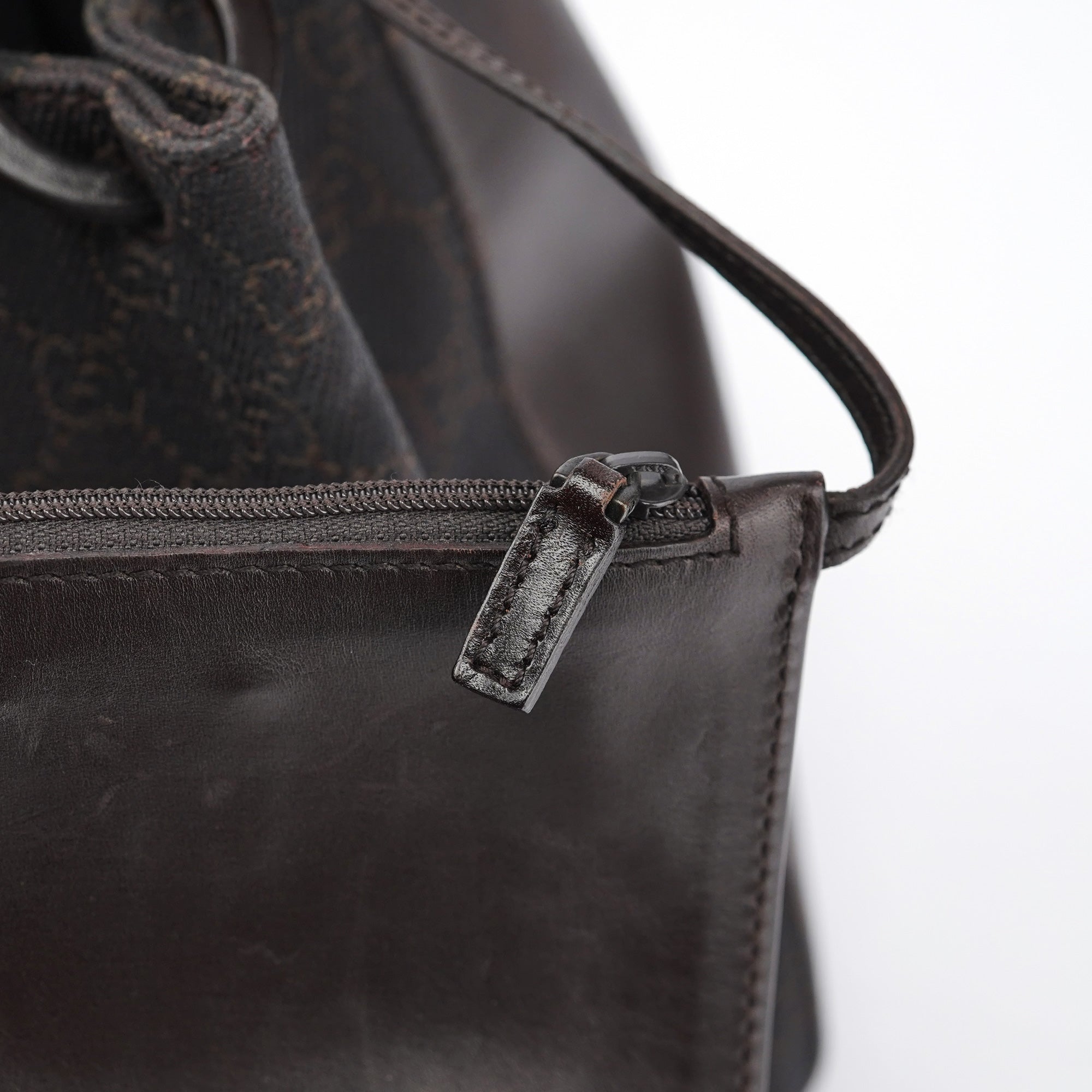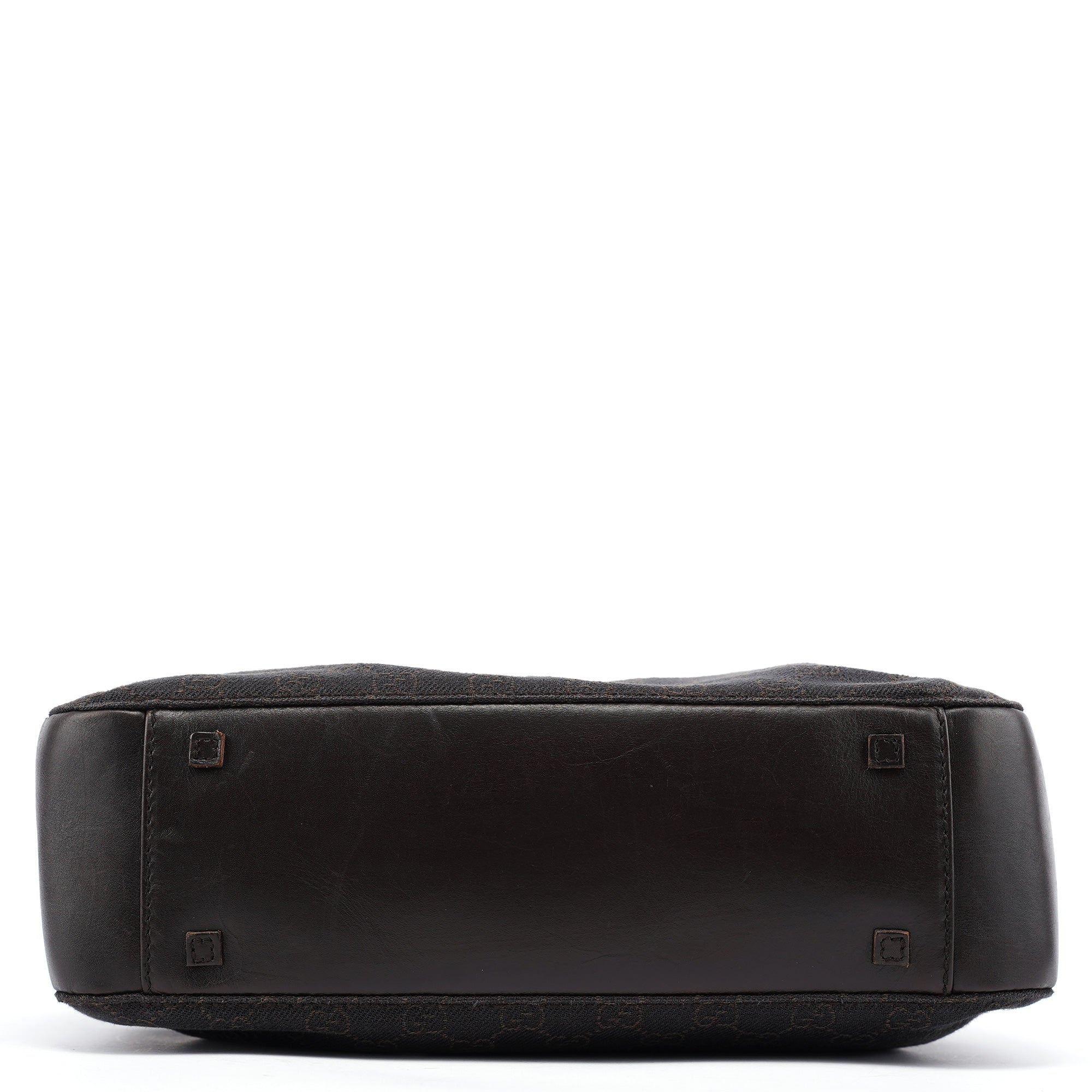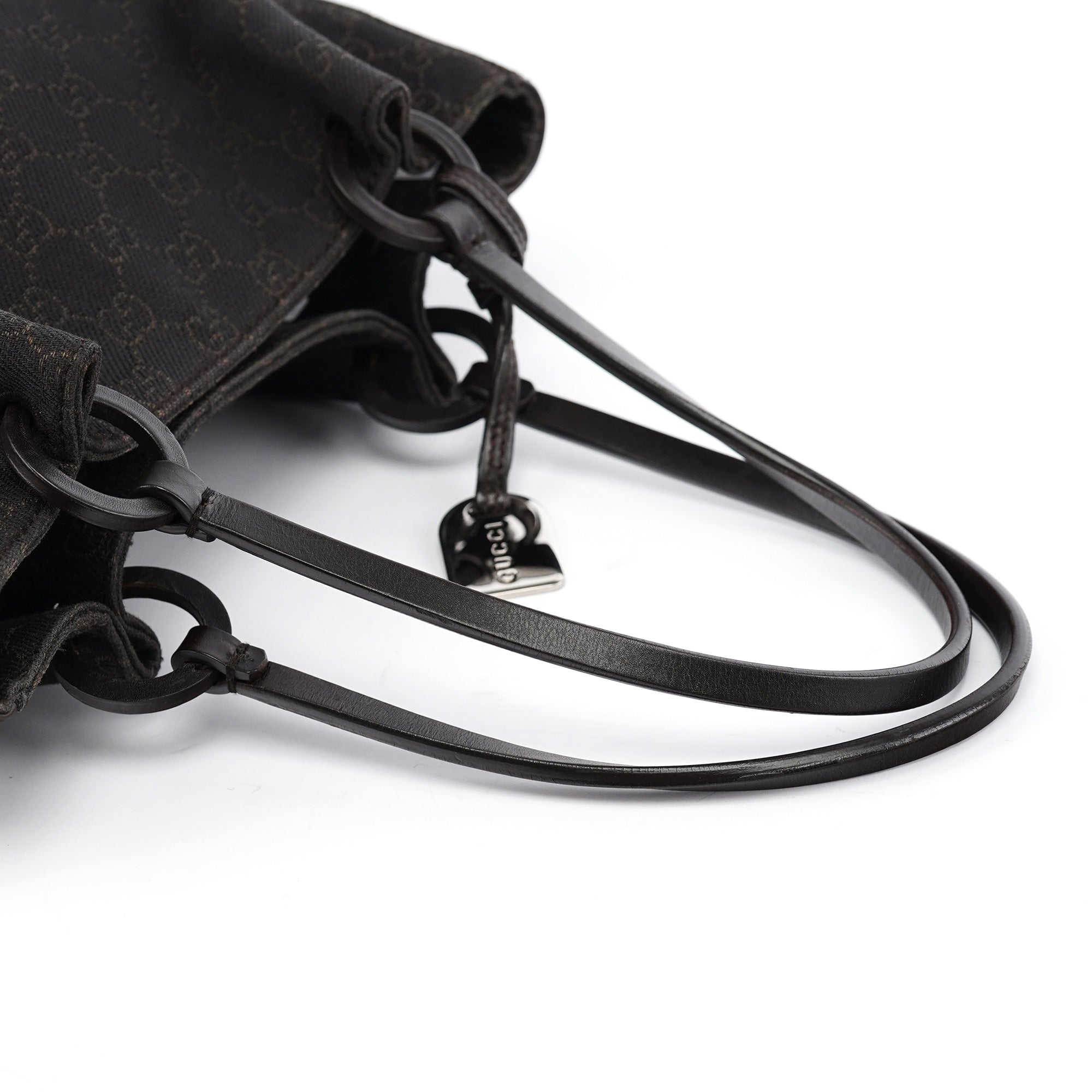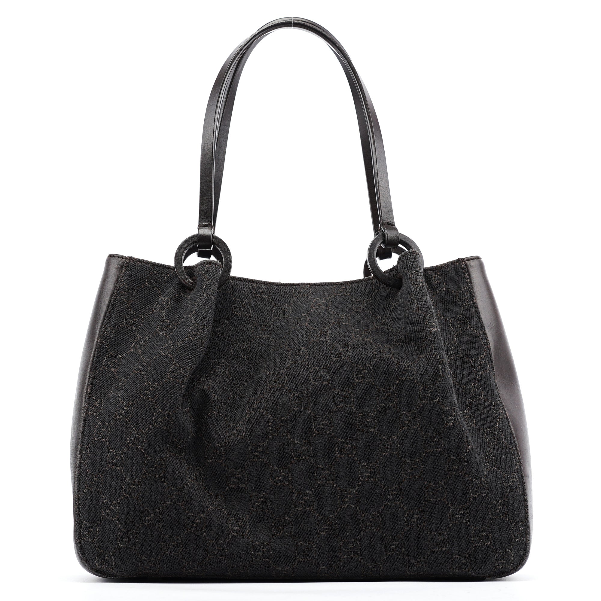 Designed in the early 2000's by Tom Ford, this vintage Gucci tote bag features the house's signature GG denim canvas in dark brown with calfskin leather trim. The compact structured silhouette includes dual leather handles, a flat base for stability, and a magnetic closure. The interior is lined in cotton canvas including a leather pouch attached to the interior. The bag is finished with a silver-tone charm with Gucci logo engraving.