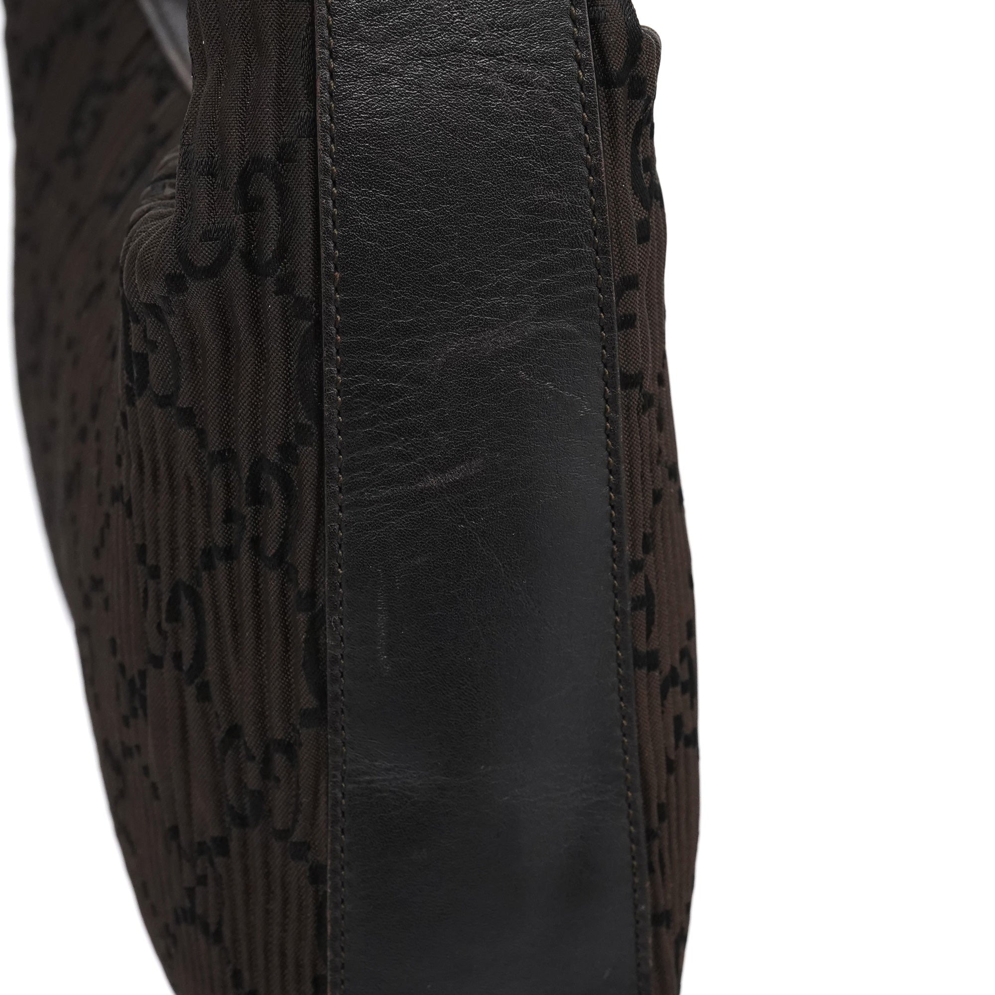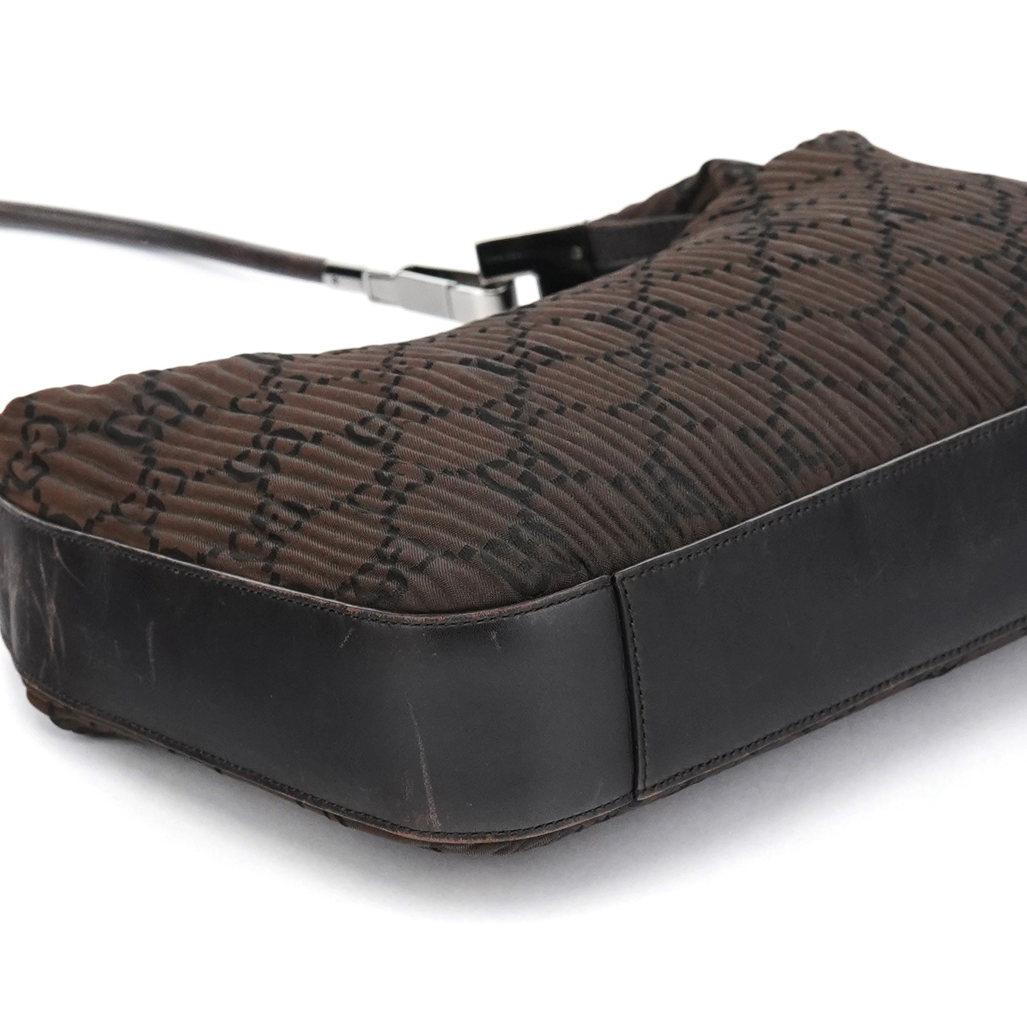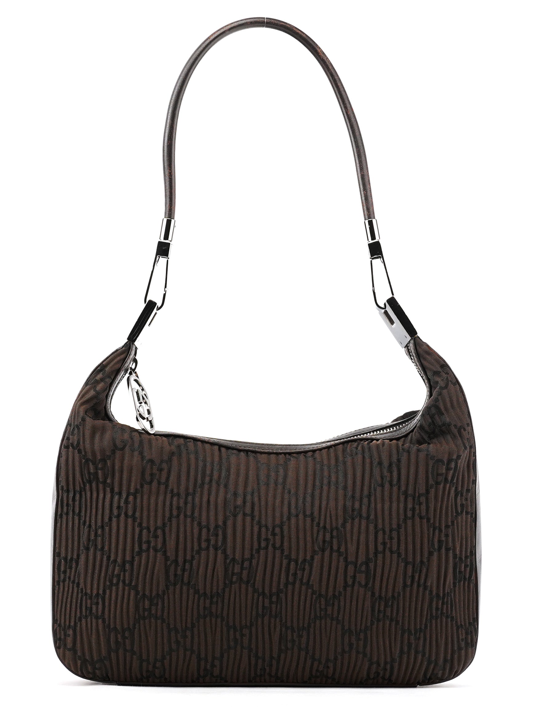 Designed in the late 1990s by Tom Ford, this Gucci GG quilted hobo shoulder bag comes in brown GG quilted canvas with smooth calfskin leather trim and silver-tone hardware. The slim silhouette, zip-top closure, and GG charm detail enhance its refined minimalist feel. The interior is lined in fabric with a zip pocket.