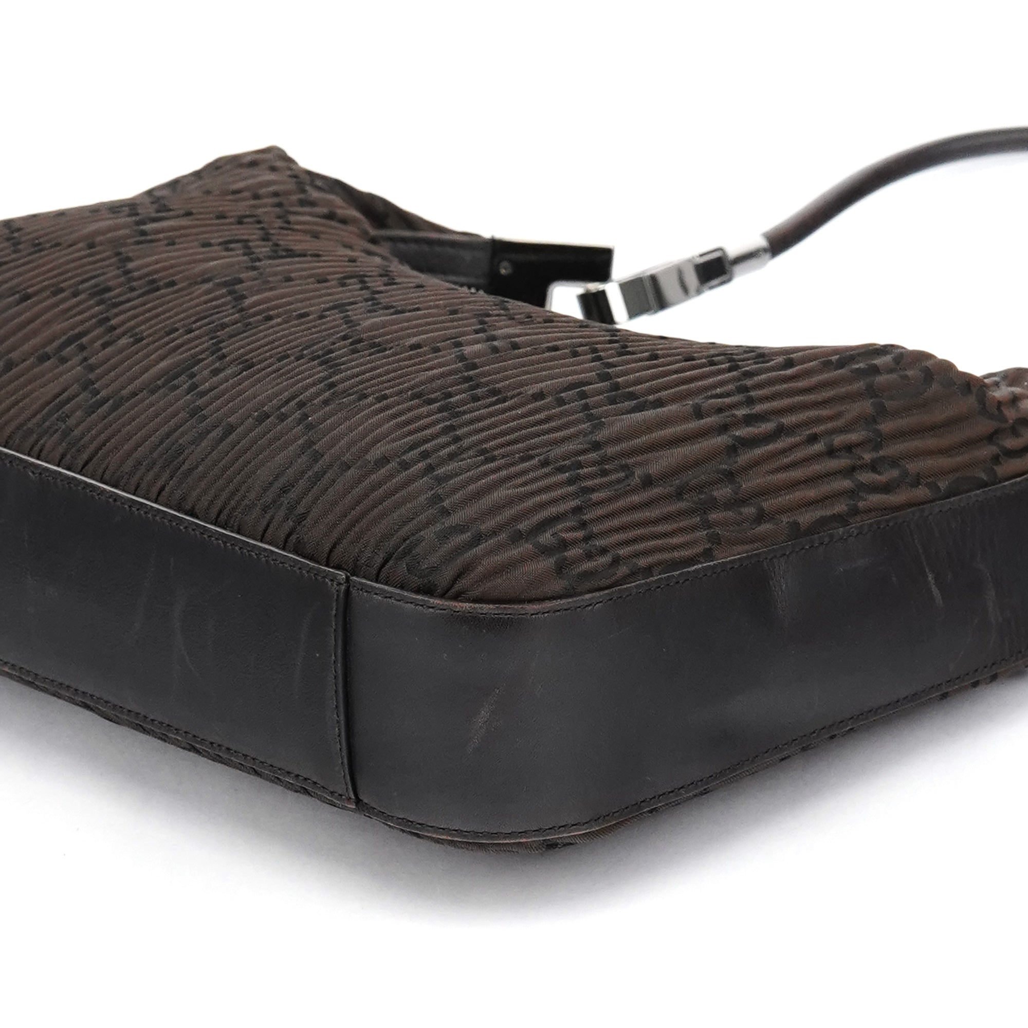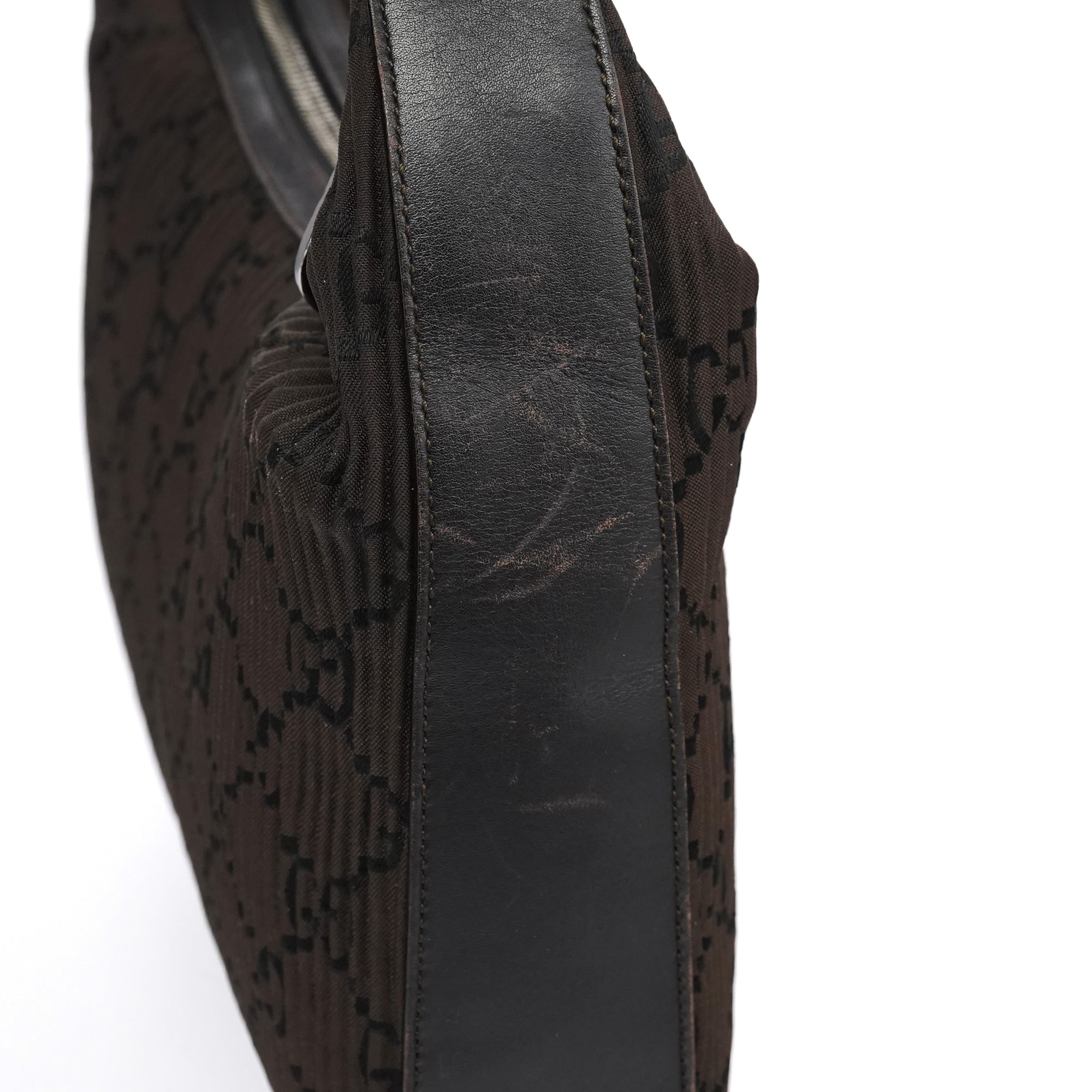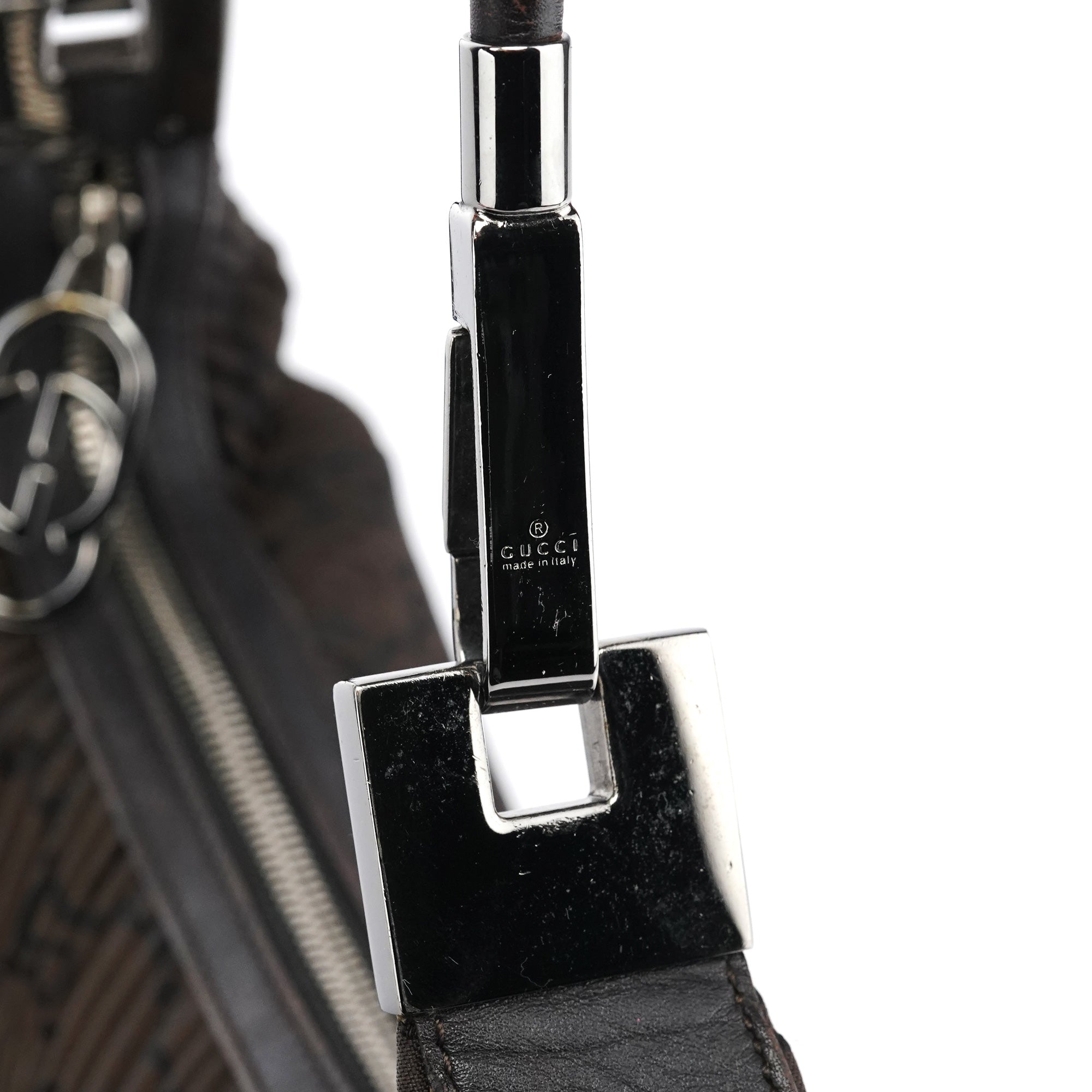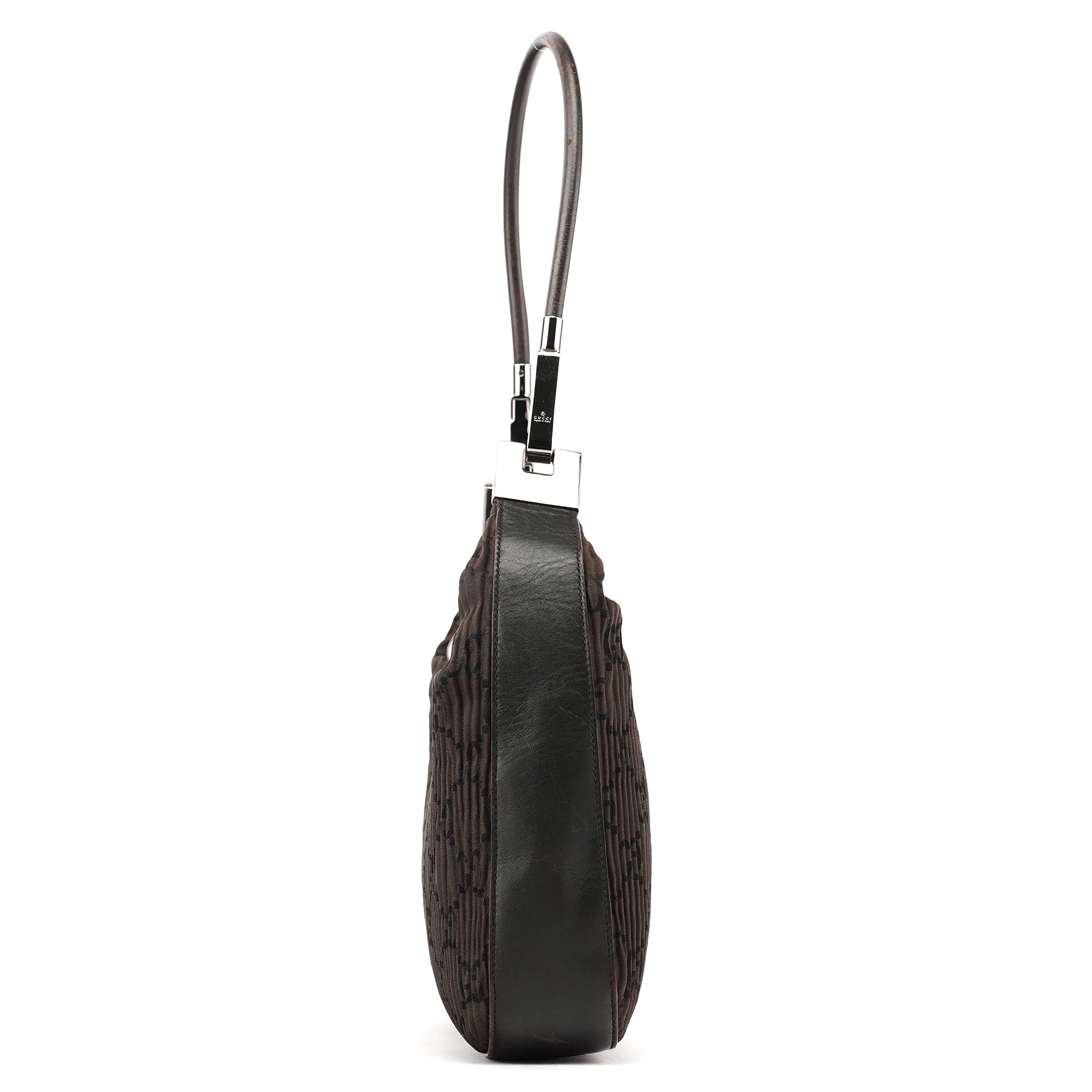 Designed in the late 1990s by Tom Ford, this Gucci GG quilted hobo shoulder bag comes in brown GG quilted canvas with smooth calfskin leather trim and silver-tone hardware. The slim silhouette, zip-top closure, and GG charm detail enhance its refined minimalist feel. The interior is lined in fabric with a zip pocket.