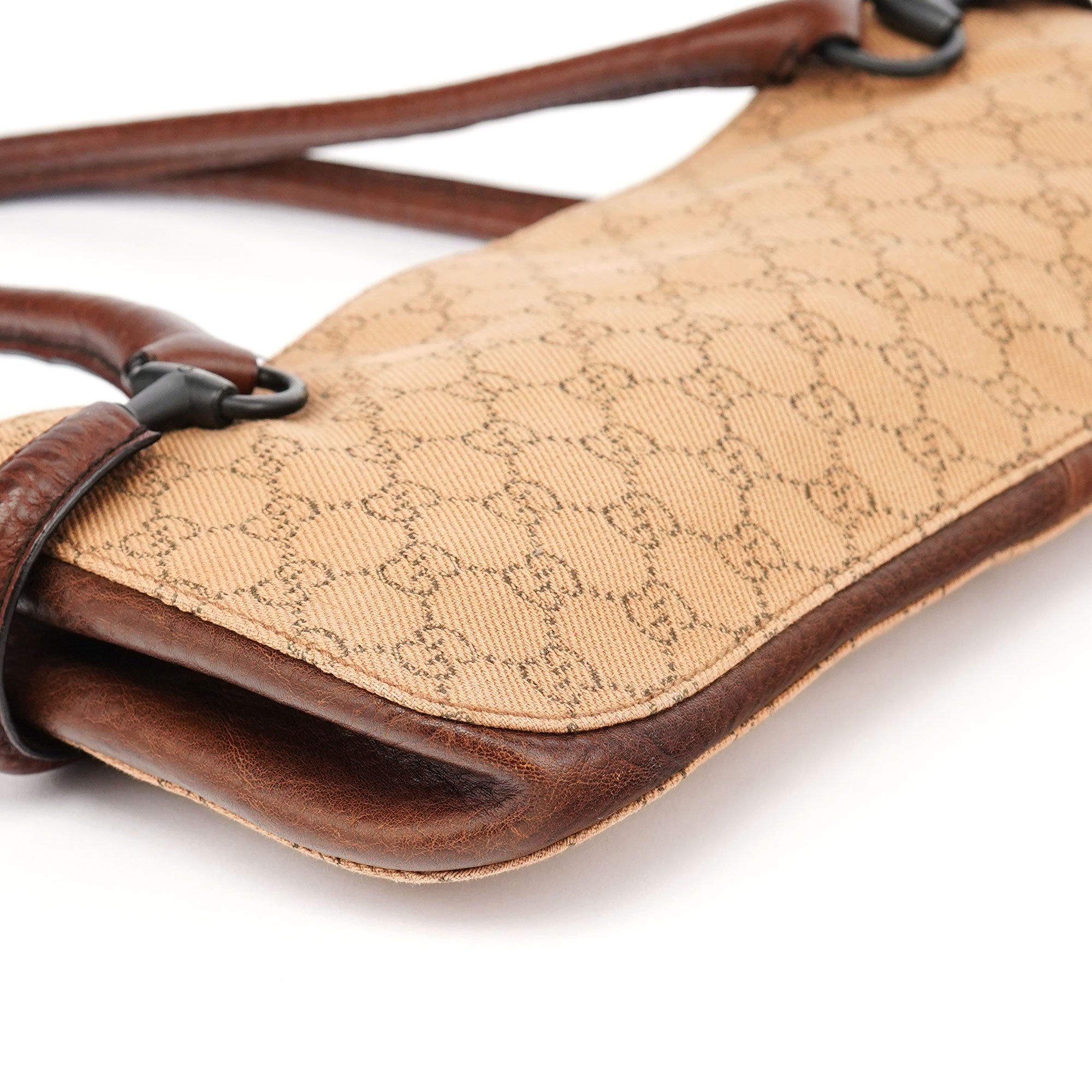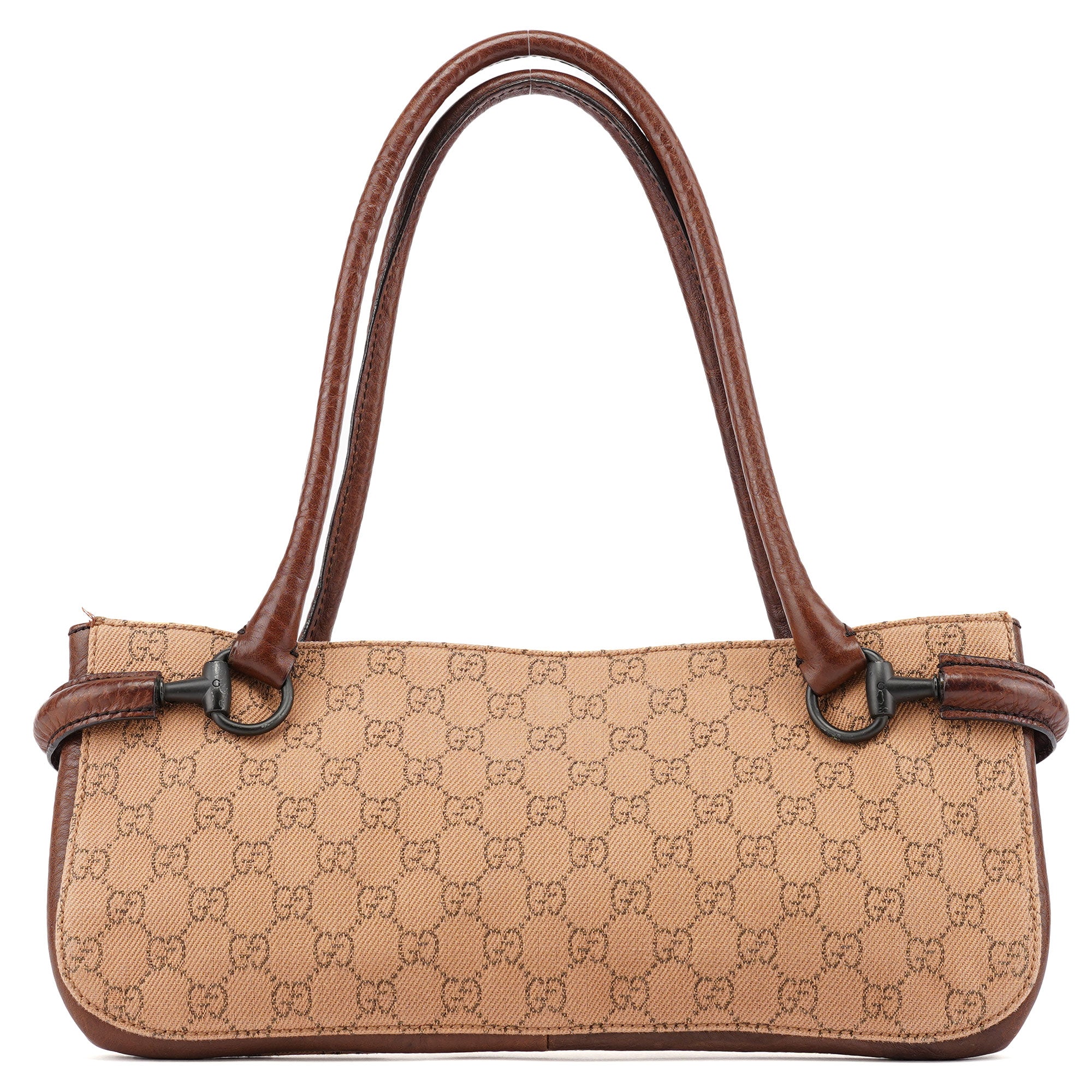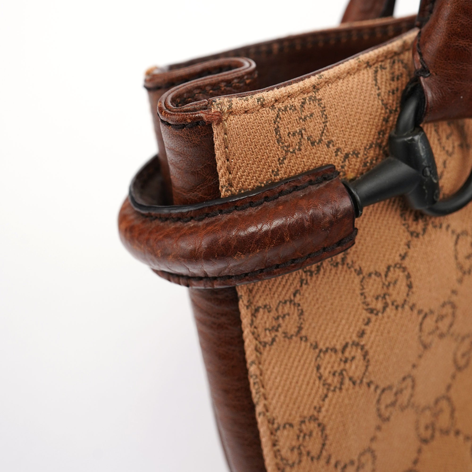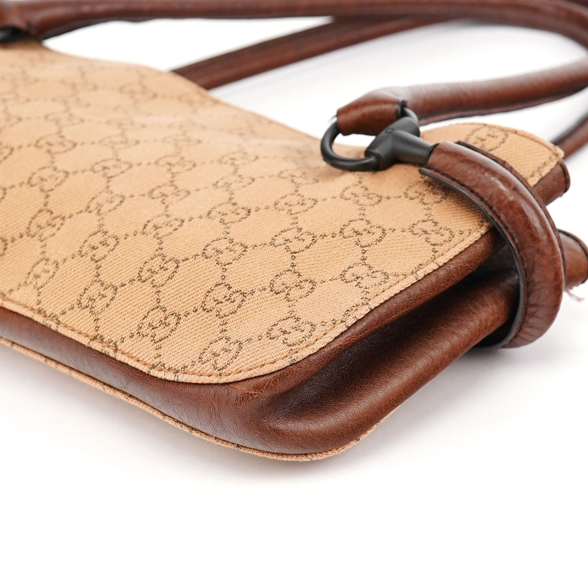Designed by Tom Ford in the late 1990s, the Gucci GG Horsebit tote bag is crafted from beige GG monogram canvas with textured brown leather trim and anthracite-tone hardware. Featuring signature Horsebit hardware engraved with the Gucci logo, it has a cotton-lined interior with a magnetic closure and an interior zipper pocket, combining timeless elegance with practical design.