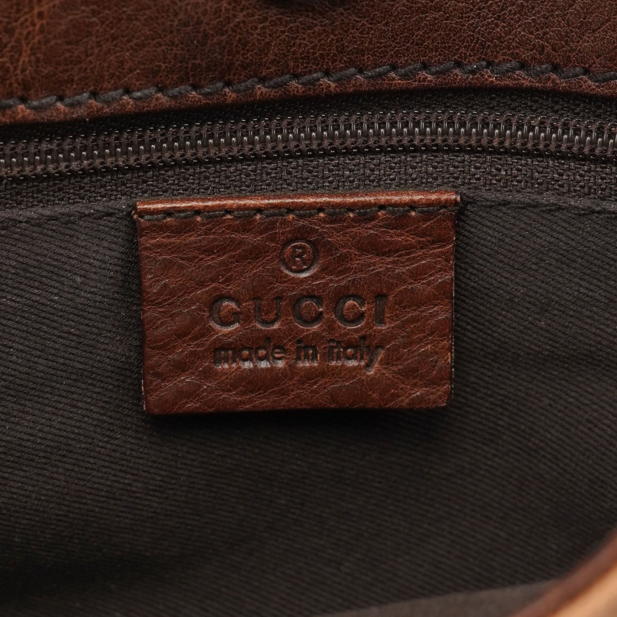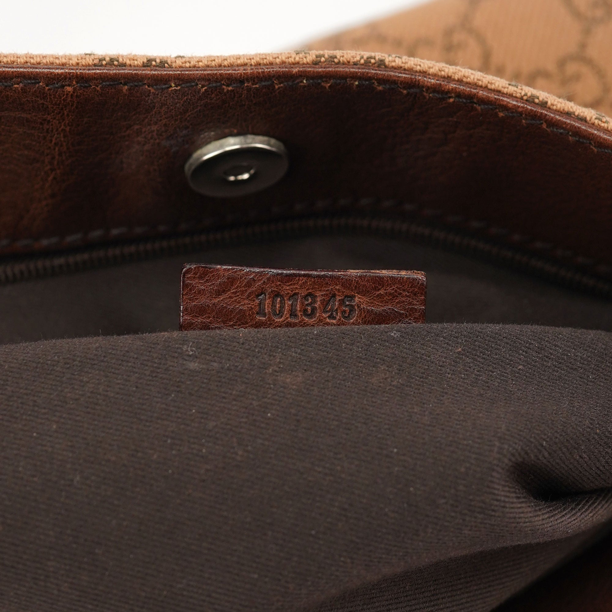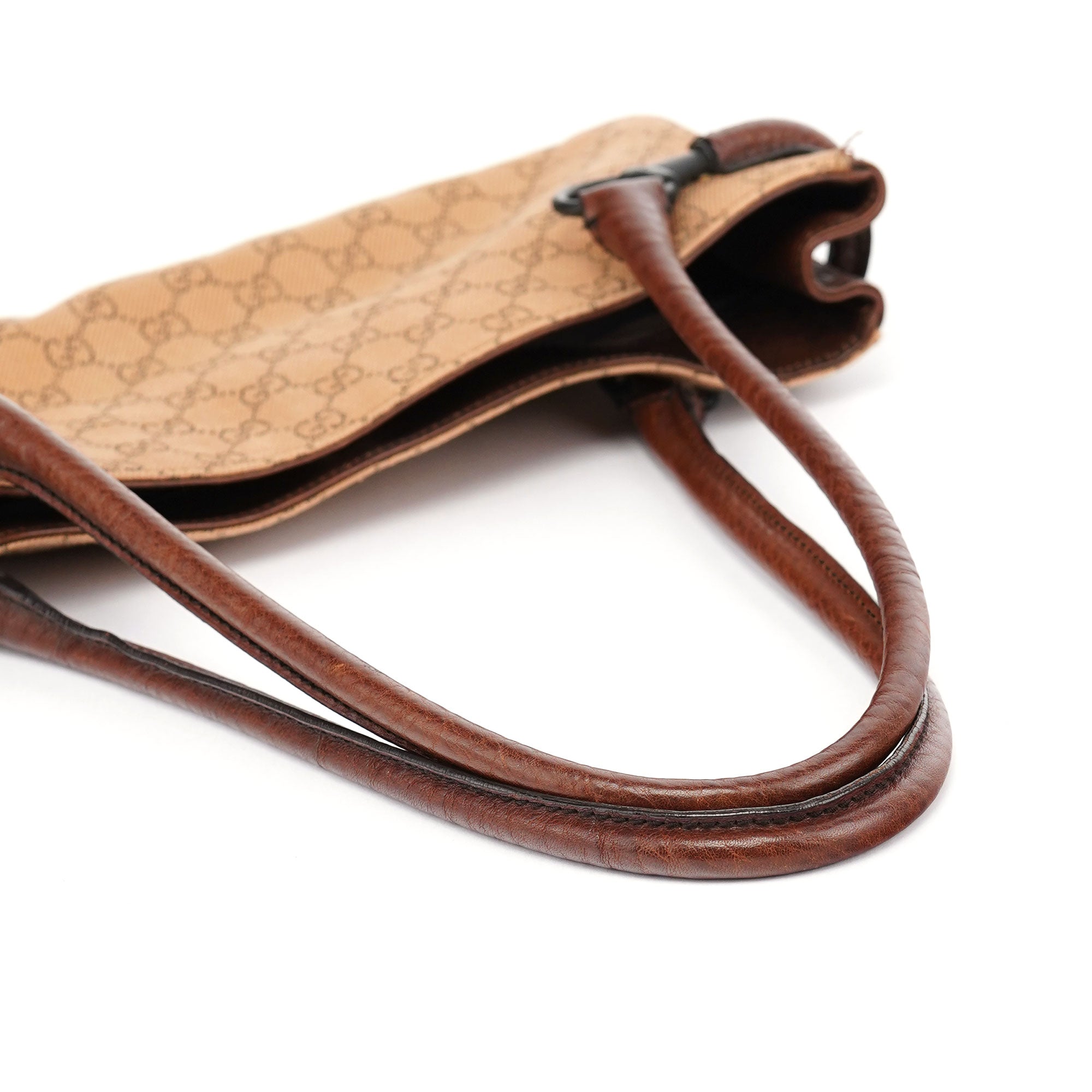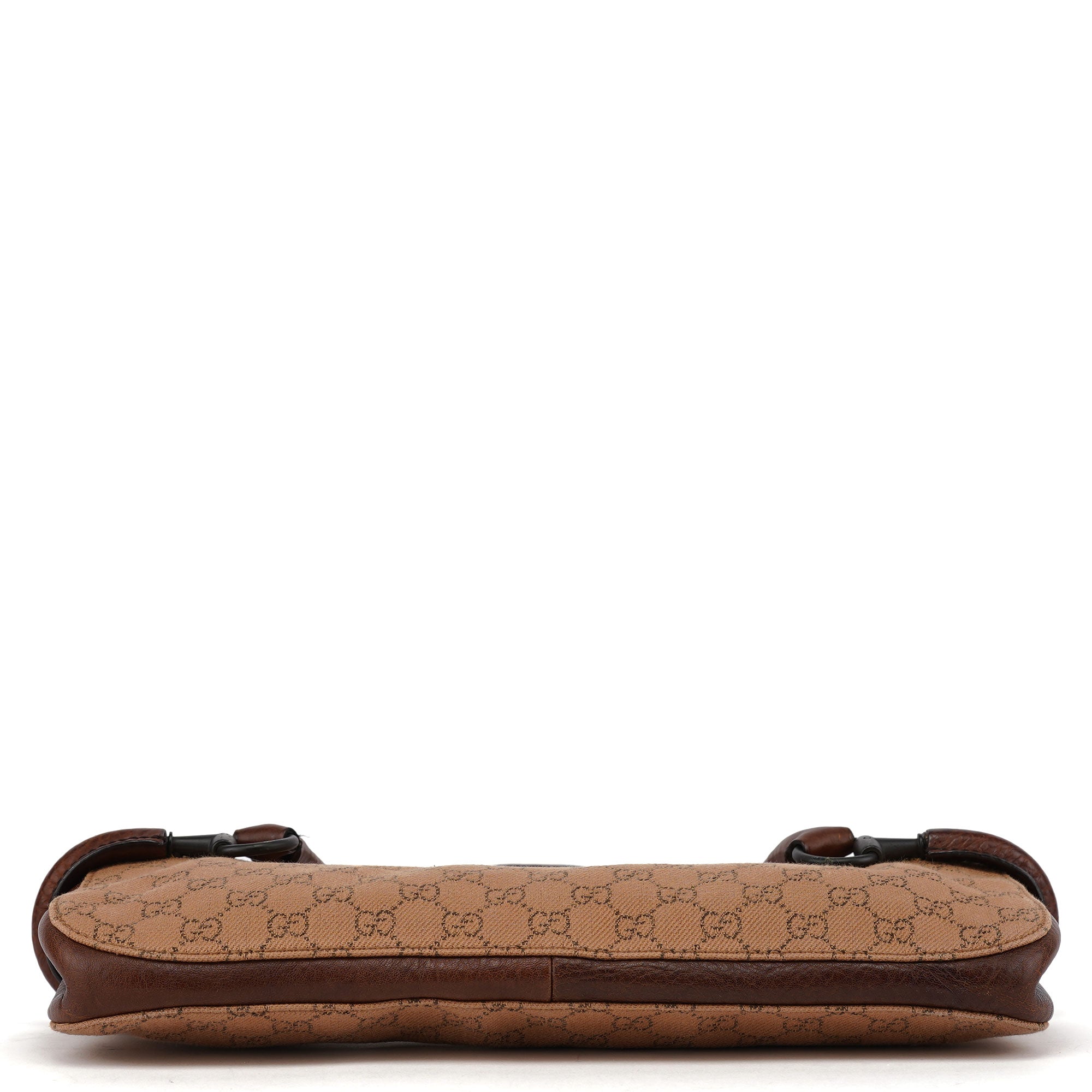 Designed by Tom Ford in the late 1990s, the Gucci GG Horsebit tote bag is crafted from beige GG monogram canvas with textured brown leather trim and anthracite-tone hardware. Featuring signature Horsebit hardware engraved with the Gucci logo, it has a cotton-lined interior with a magnetic closure and an interior zipper pocket, combining timeless elegance with practical design.