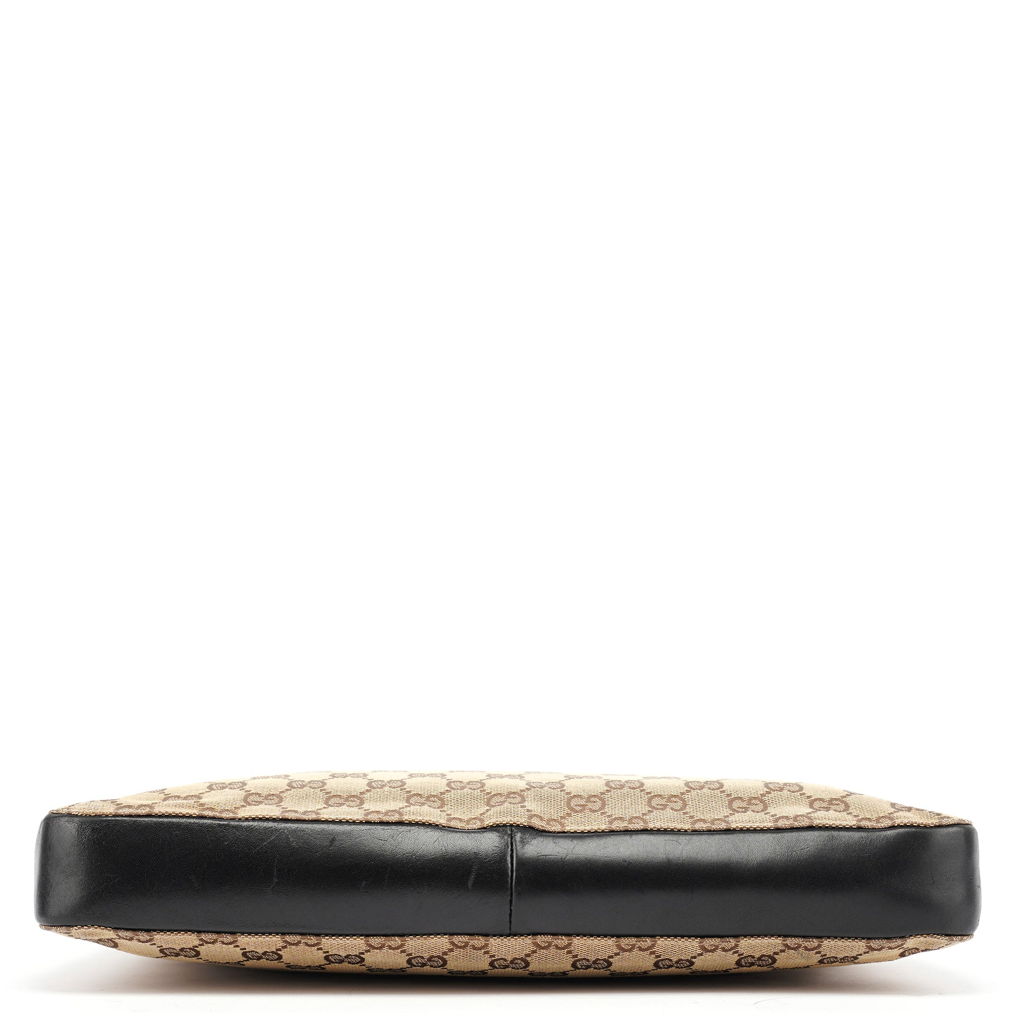 Designed in the late 1990s by Tom Ford, this vintage Gucci shoulder bag showcases a unique hybrid construction combining the classic GG monogram canvas with leather reinforcements. The slim rectangular silhouette features beige and brown GG canvas on the front and back panels, while leather sides and bottom provide durability. The bag includes combination metal and leather handles with a magnetic hook closure and one interior zipper pocket.