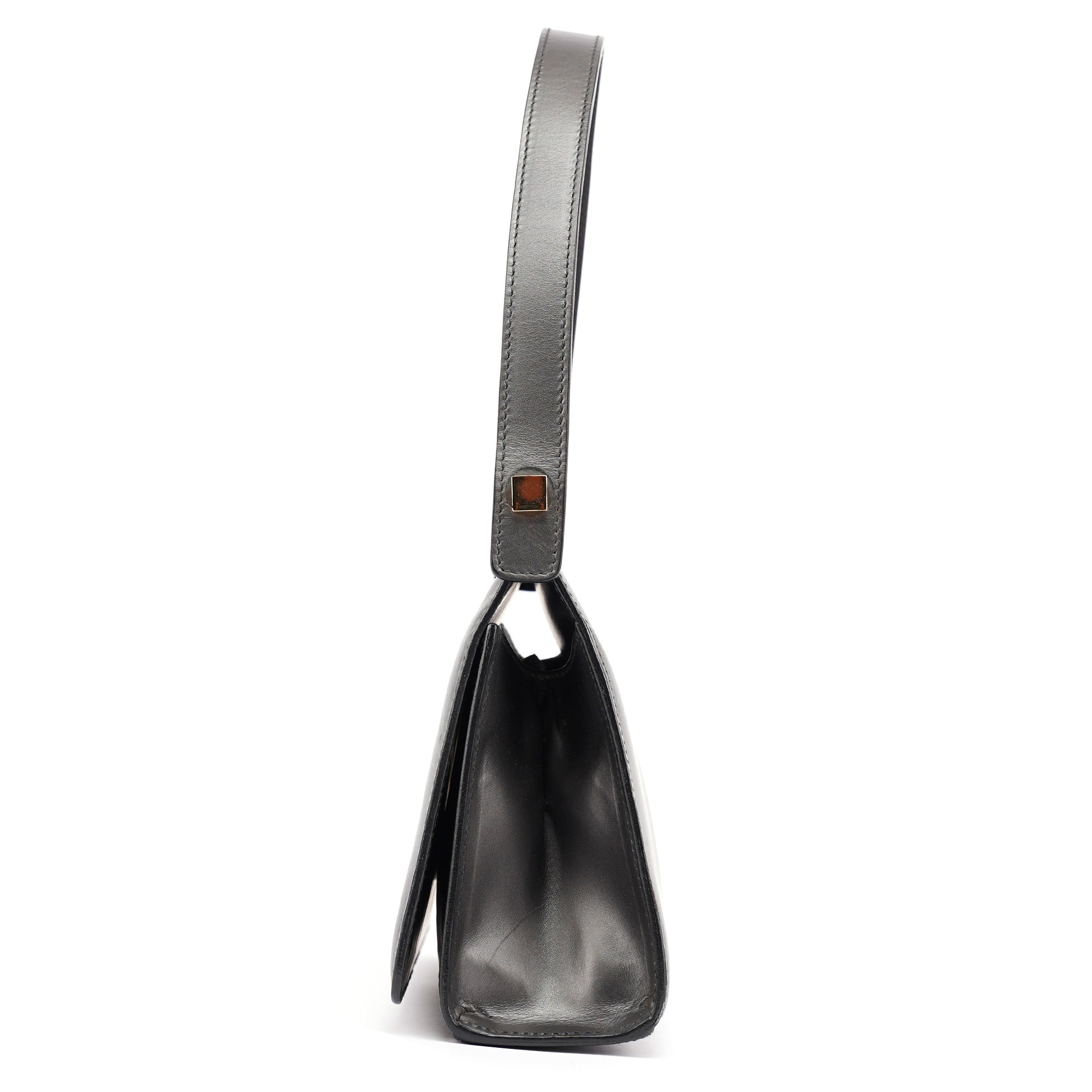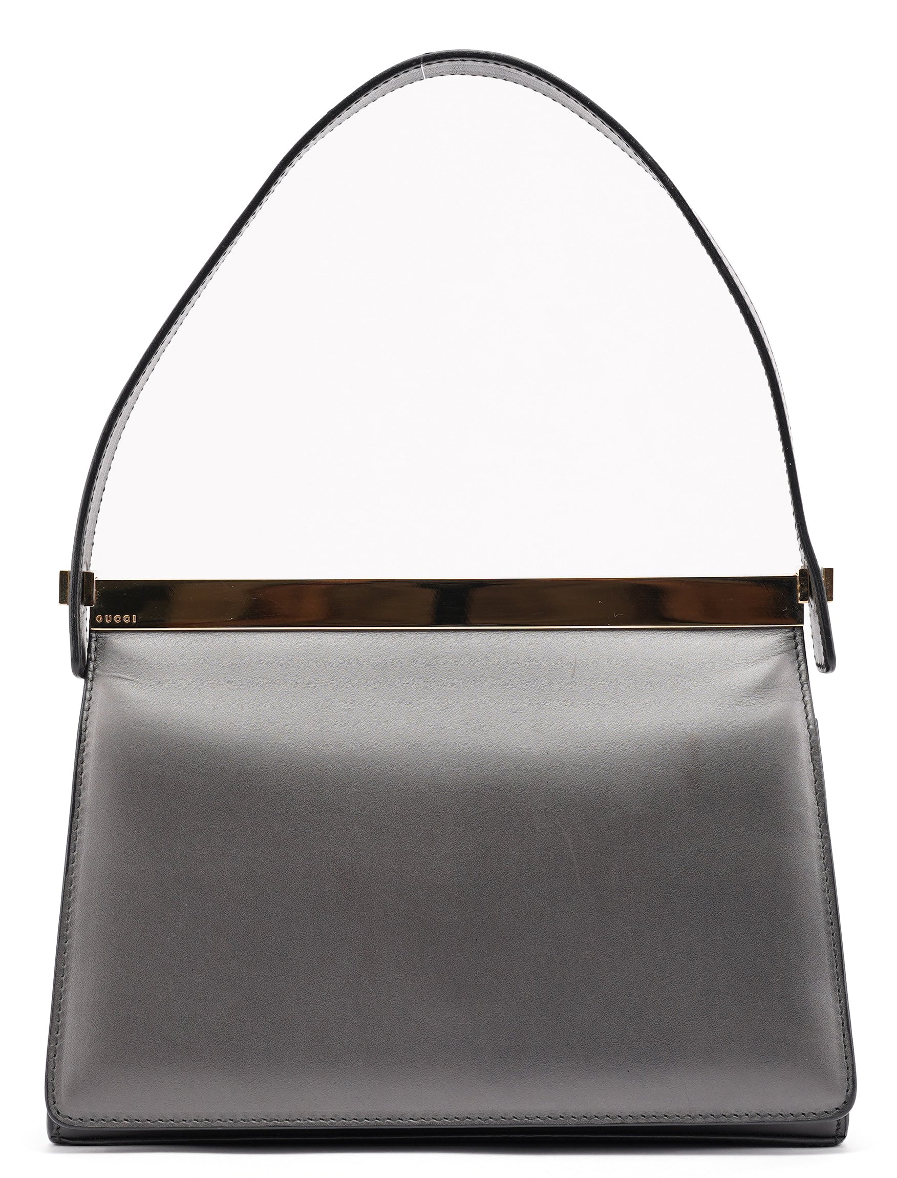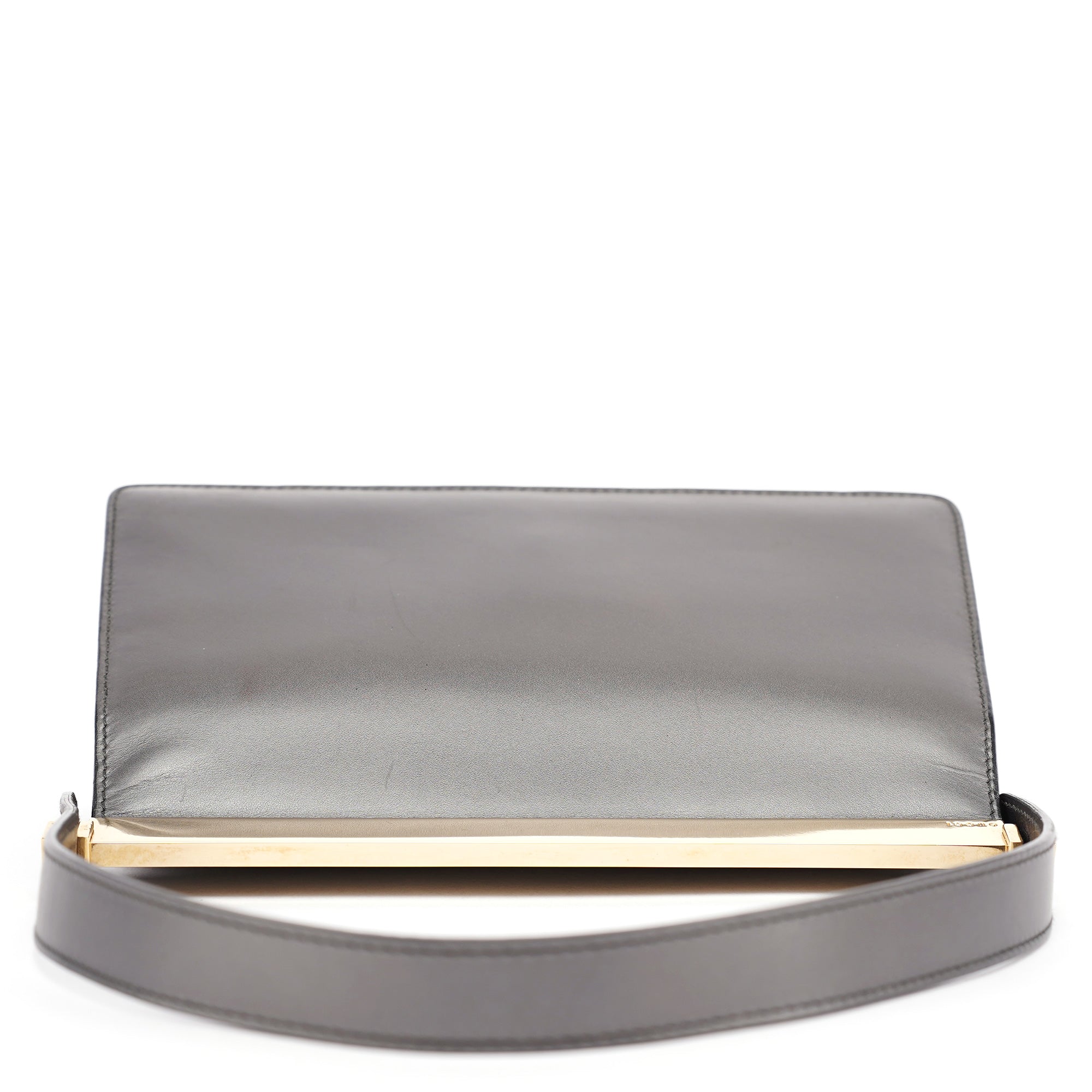 Designed in the late 1990s by Tom Ford, this Gucci shoulder bag is crafted in anthracite calfskin with a minimalist silhouette framed by gold-tone hardware engraved with the Gucci logo. It features a structured top bar, magnetic closure, and a single flat strap. The interior is lined in tonal leather with one slip pocket.