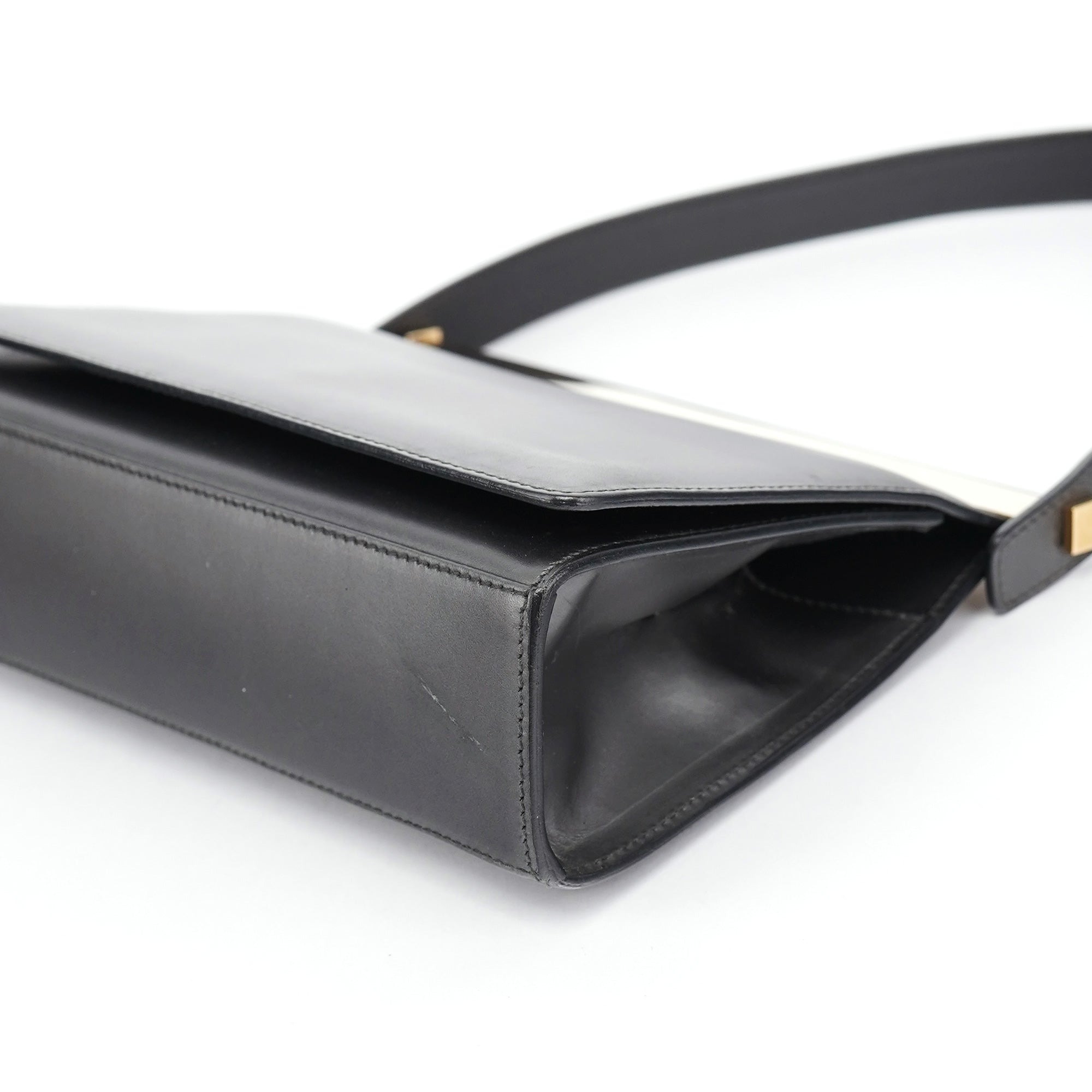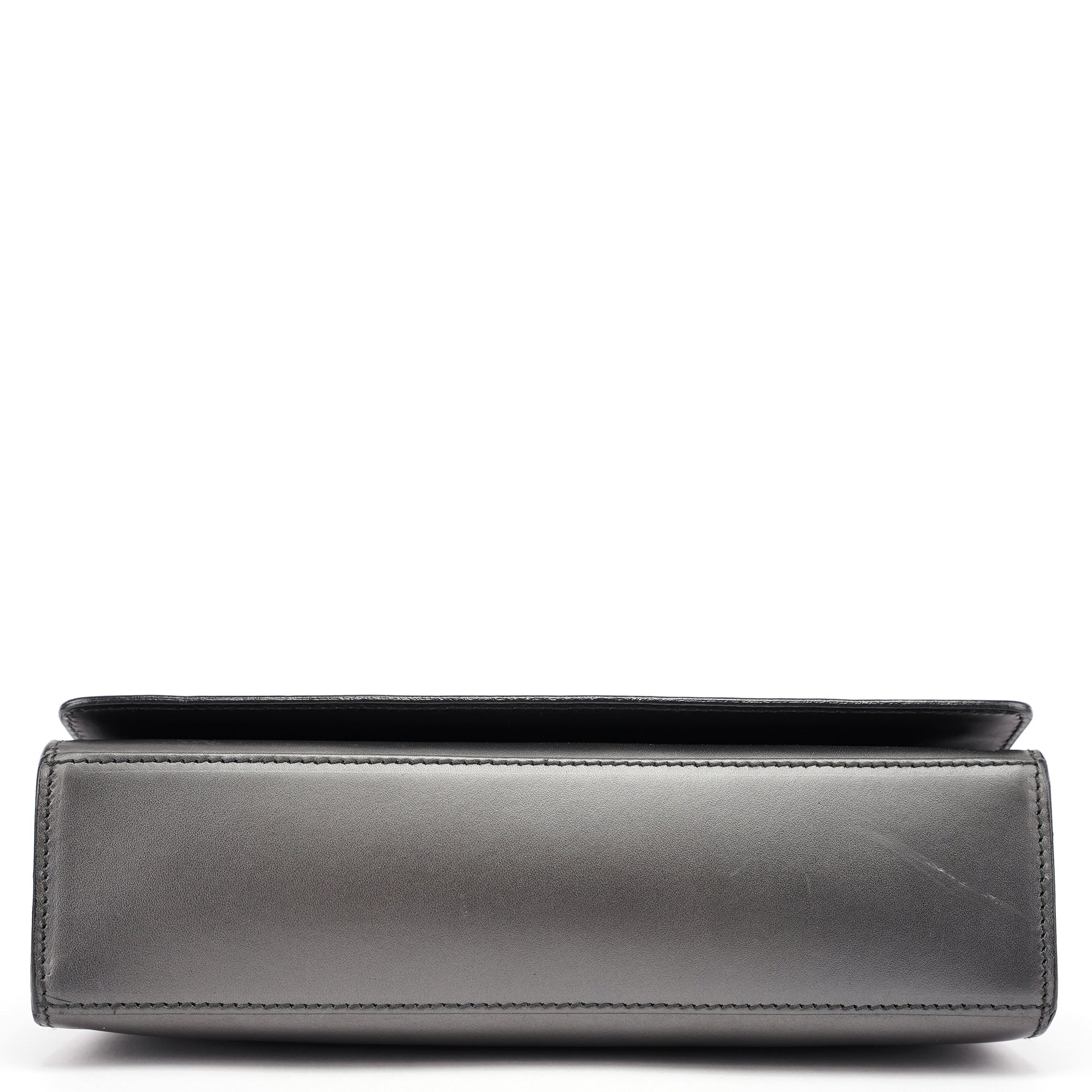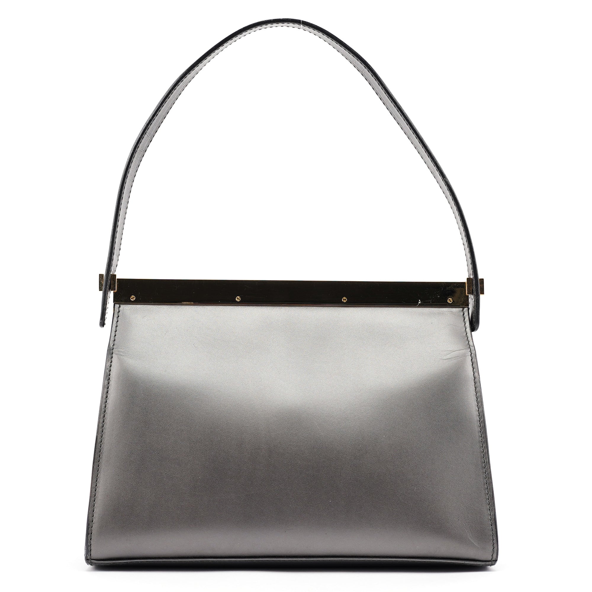 Designed in the late 1990s by Tom Ford, this Gucci shoulder bag is crafted in anthracite calfskin with a minimalist silhouette framed by gold-tone hardware engraved with the Gucci logo. It features a structured top bar, magnetic closure, and a single flat strap. The interior is lined in tonal leather with one slip pocket.